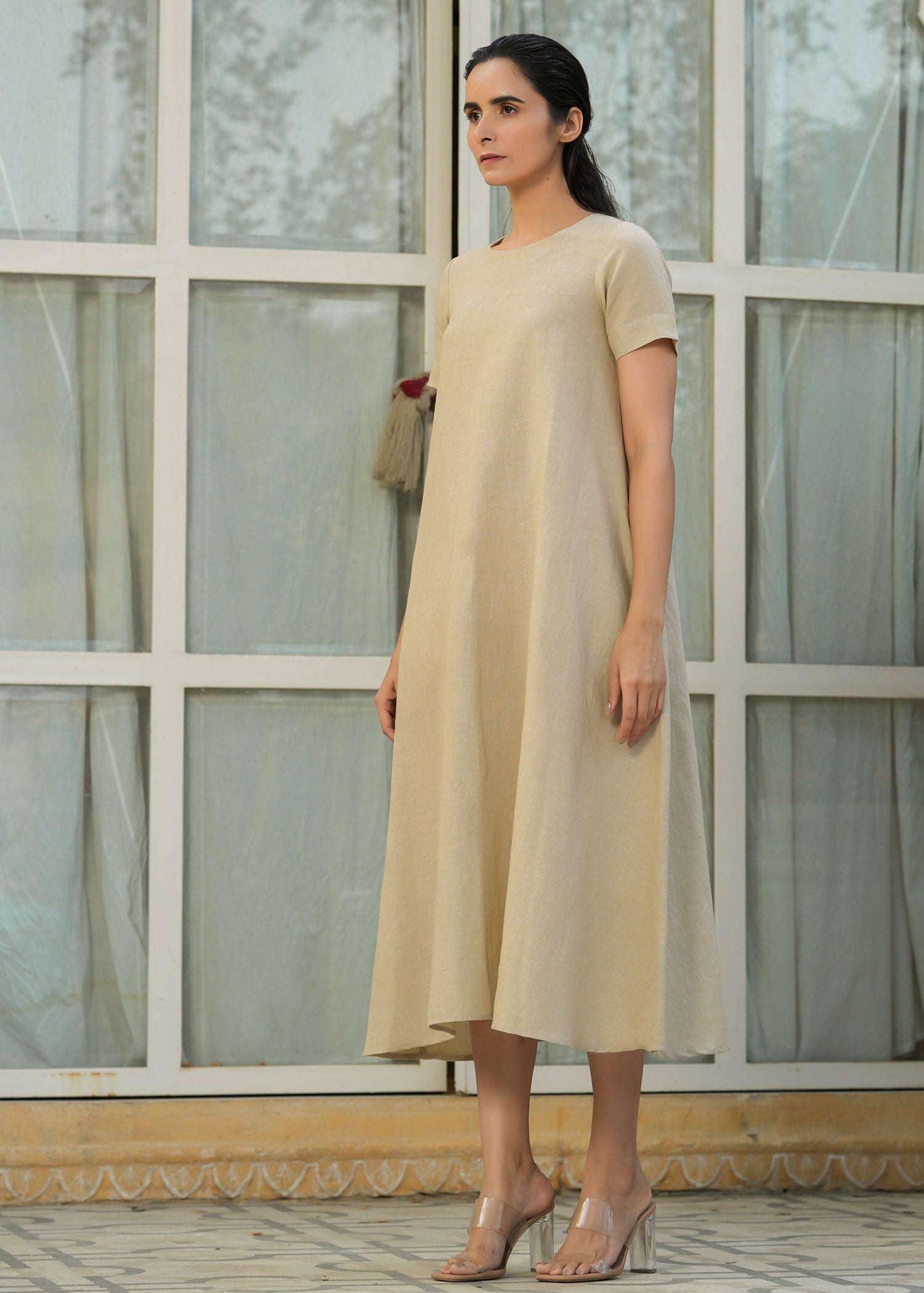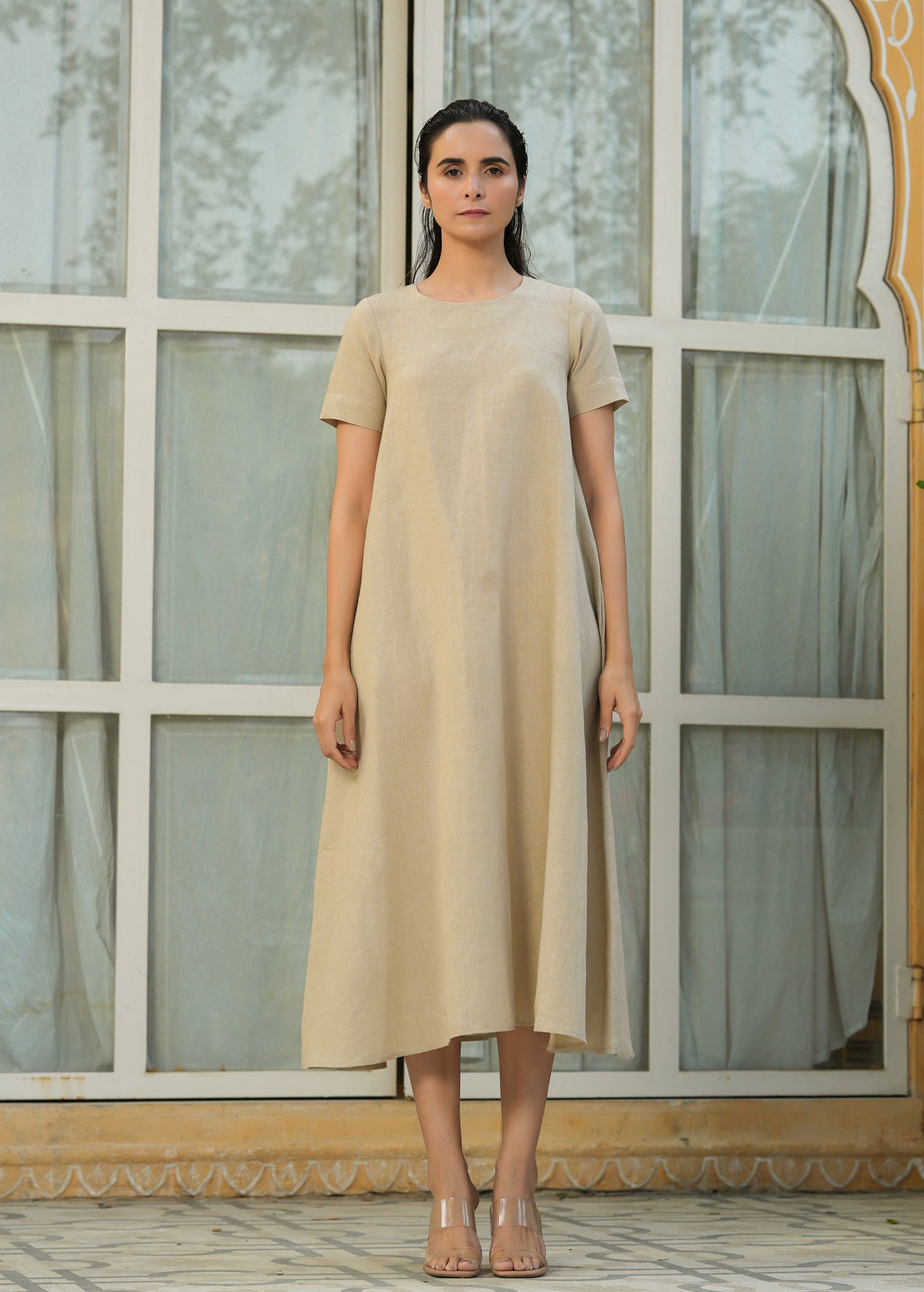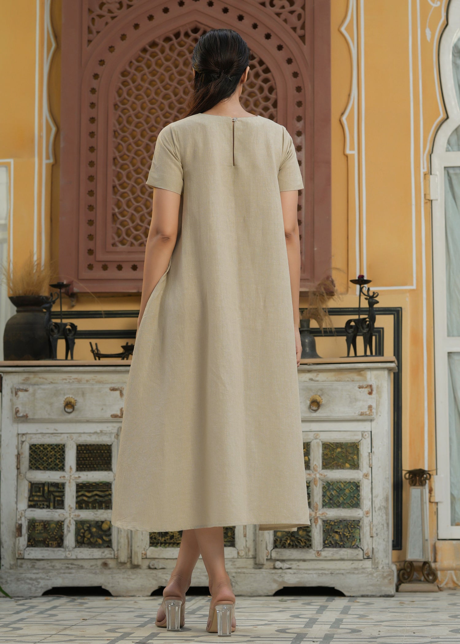 This A-line dress has short sleeves, pockets on both sides and back button fastening.