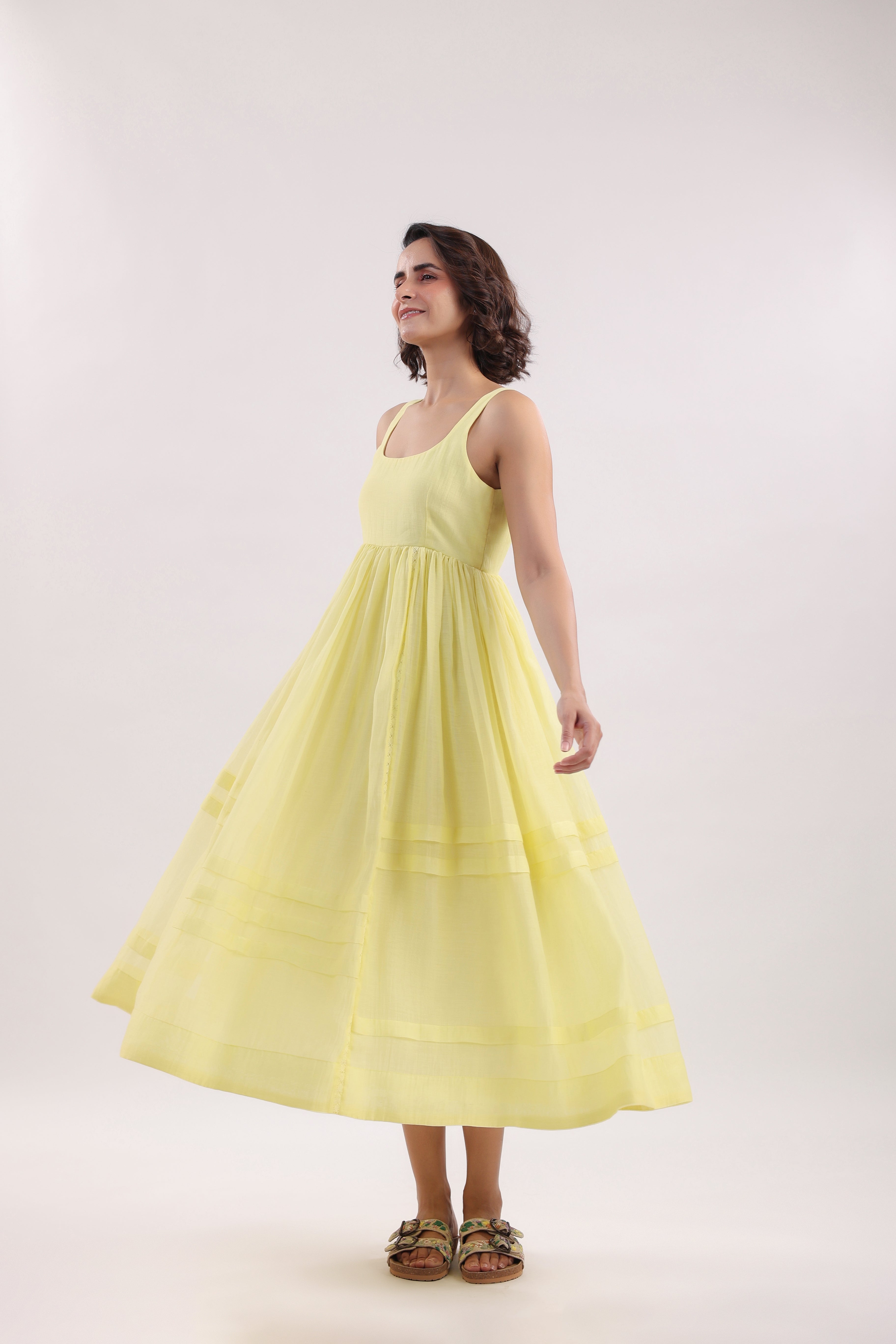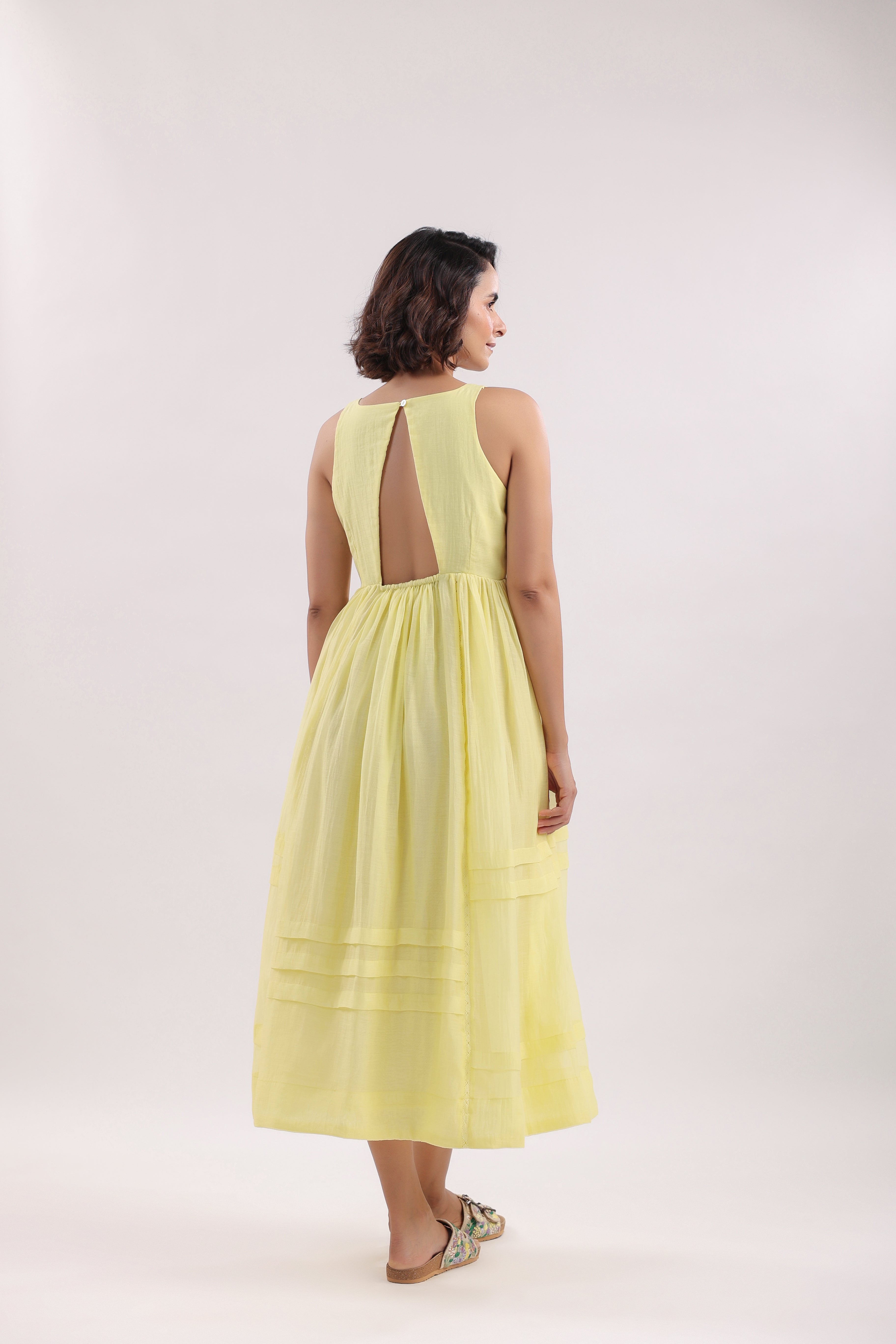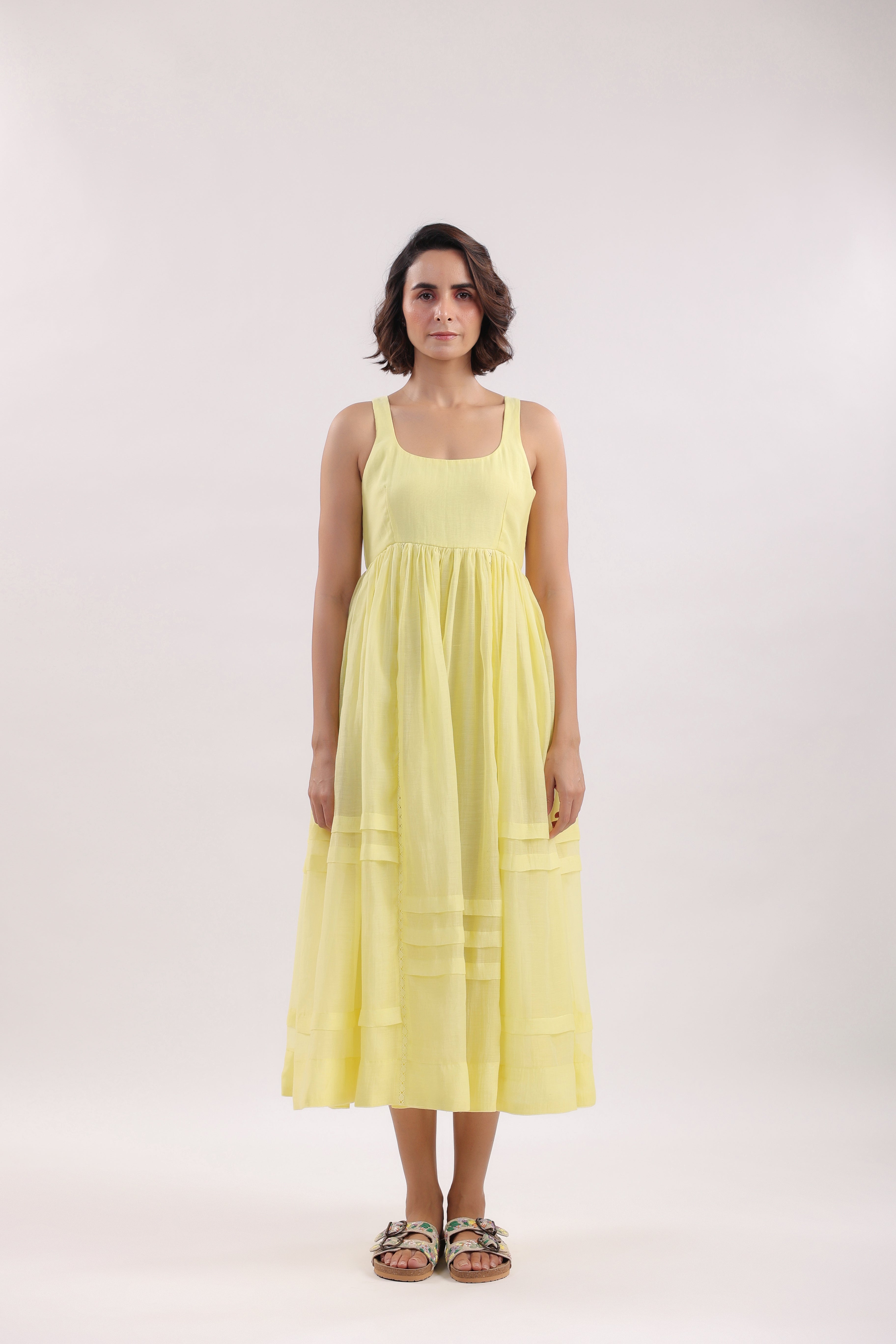 This sleeveless, mid calf length dress has round neckline, back button fastening and pockets on both sides. It is finished with pintucks and lace detailing on flare.