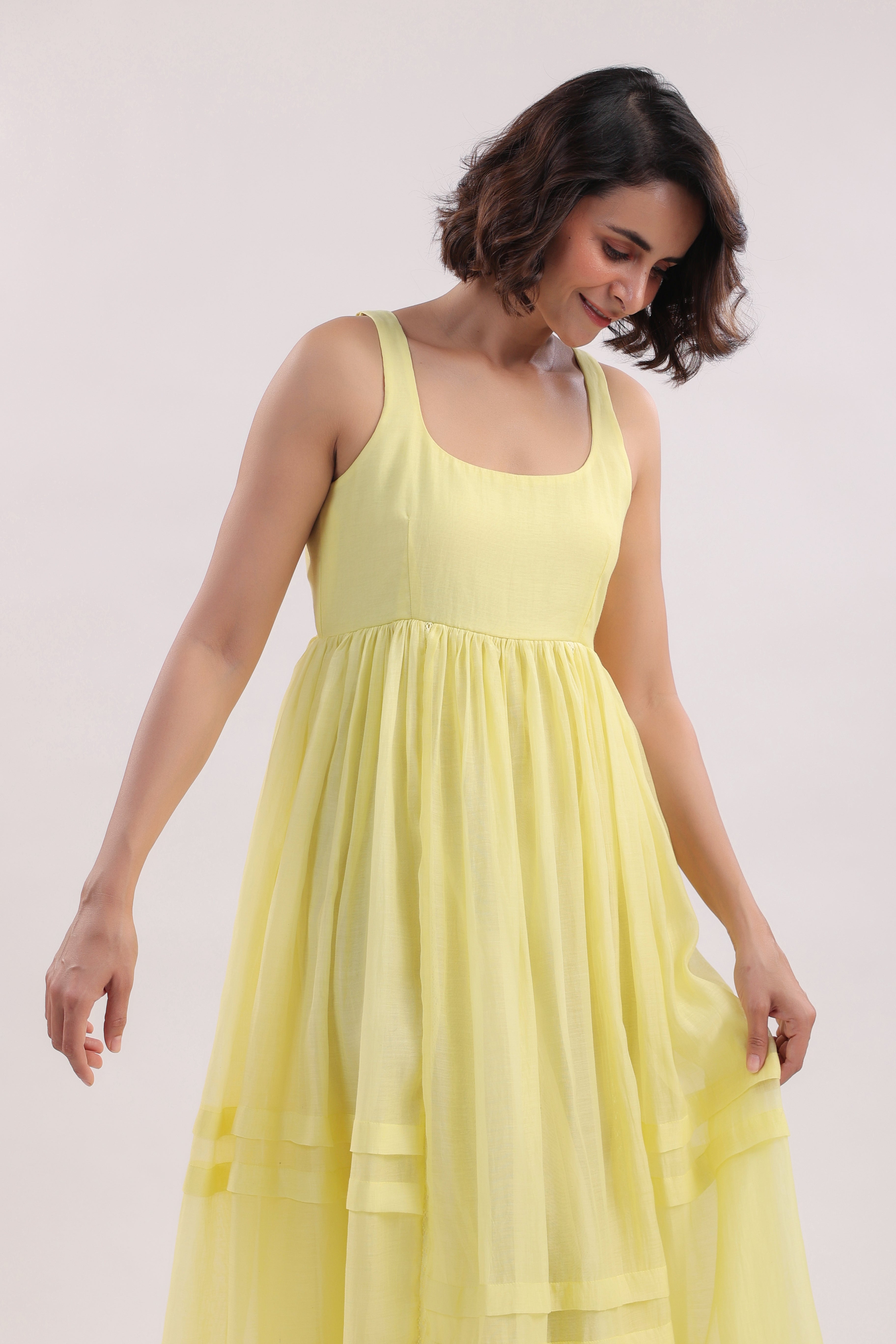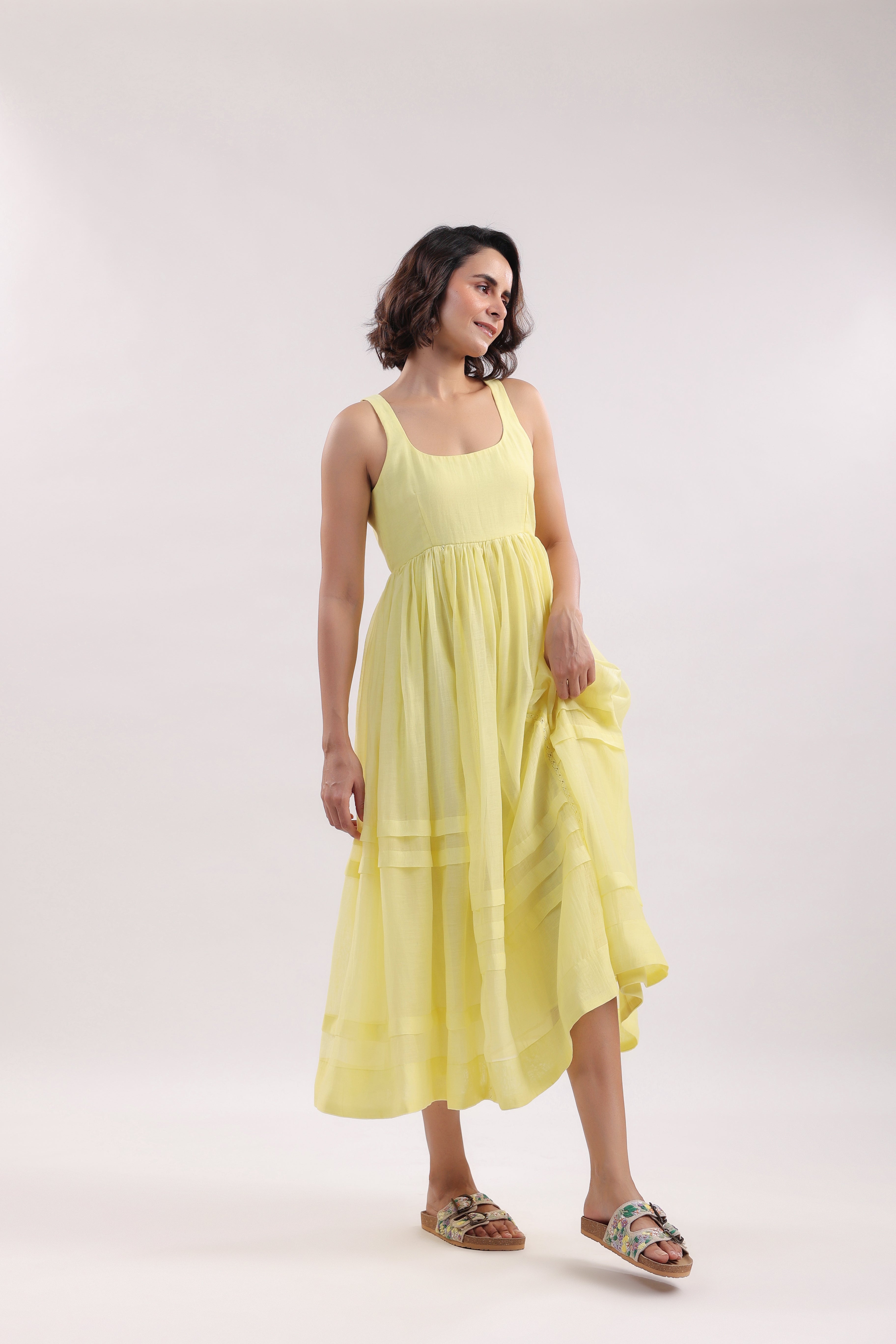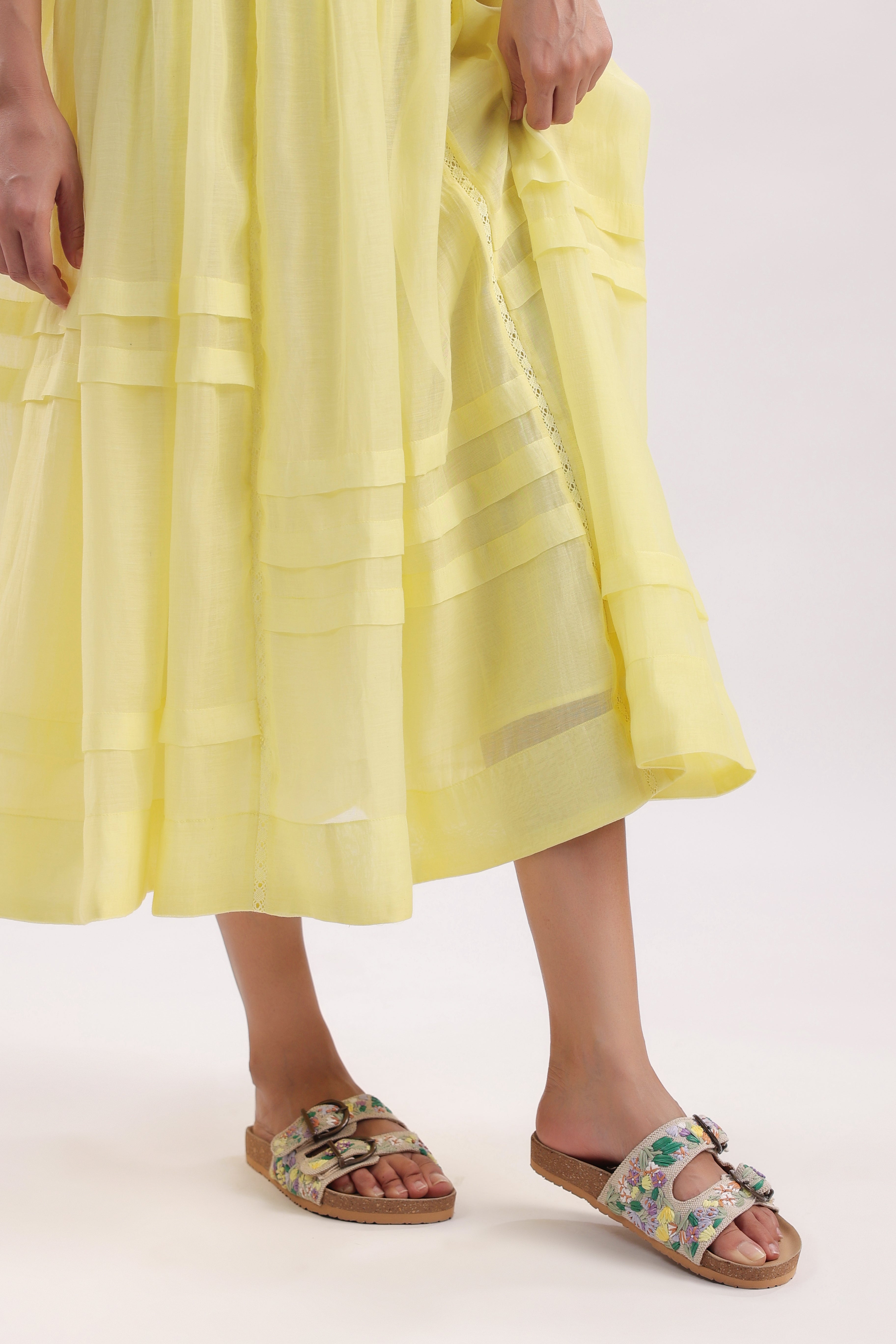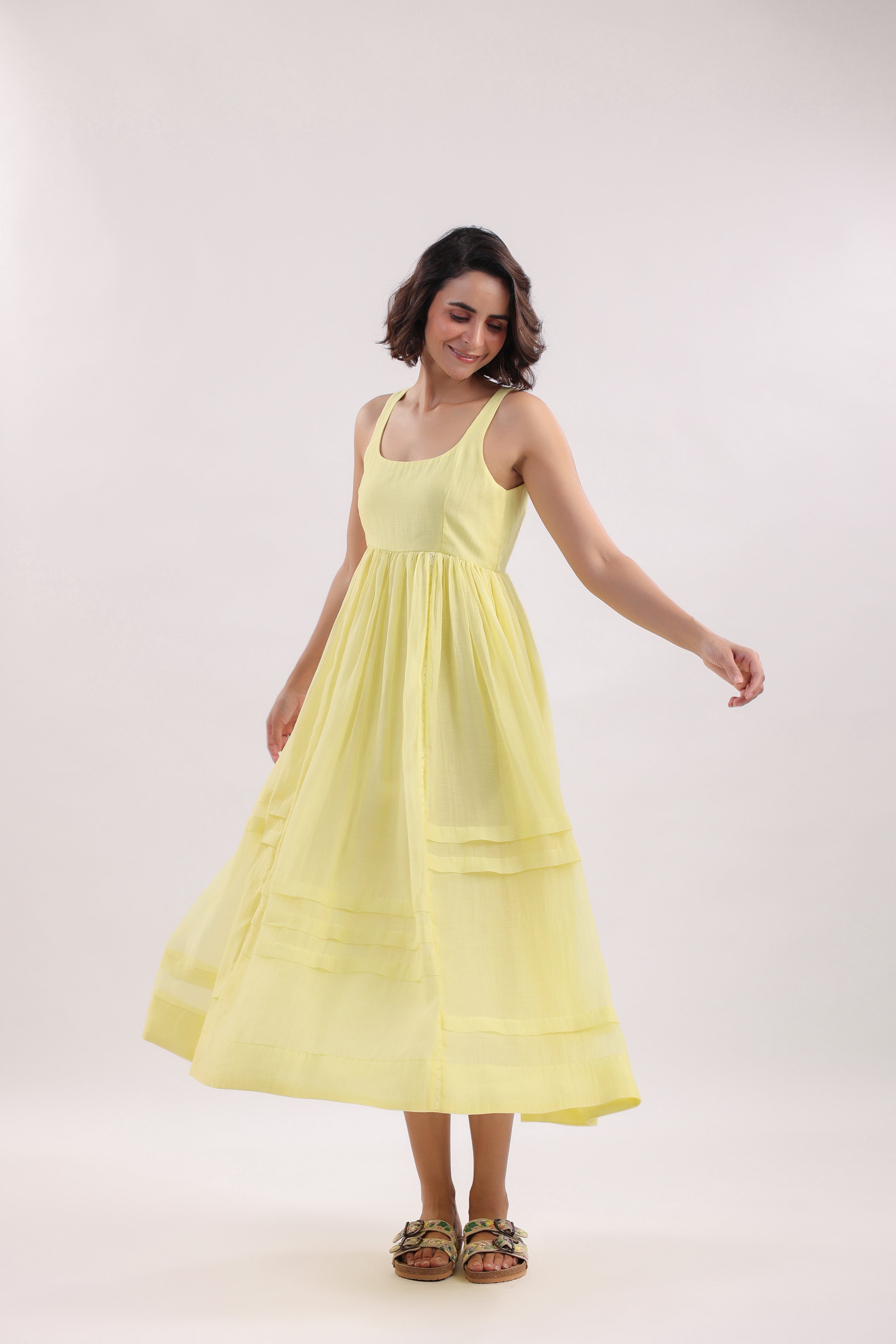 This sleeveless, mid calf length dress has round neckline, back button fastening and pockets on both sides. It is finished with pintucks and lace detailing on flare.