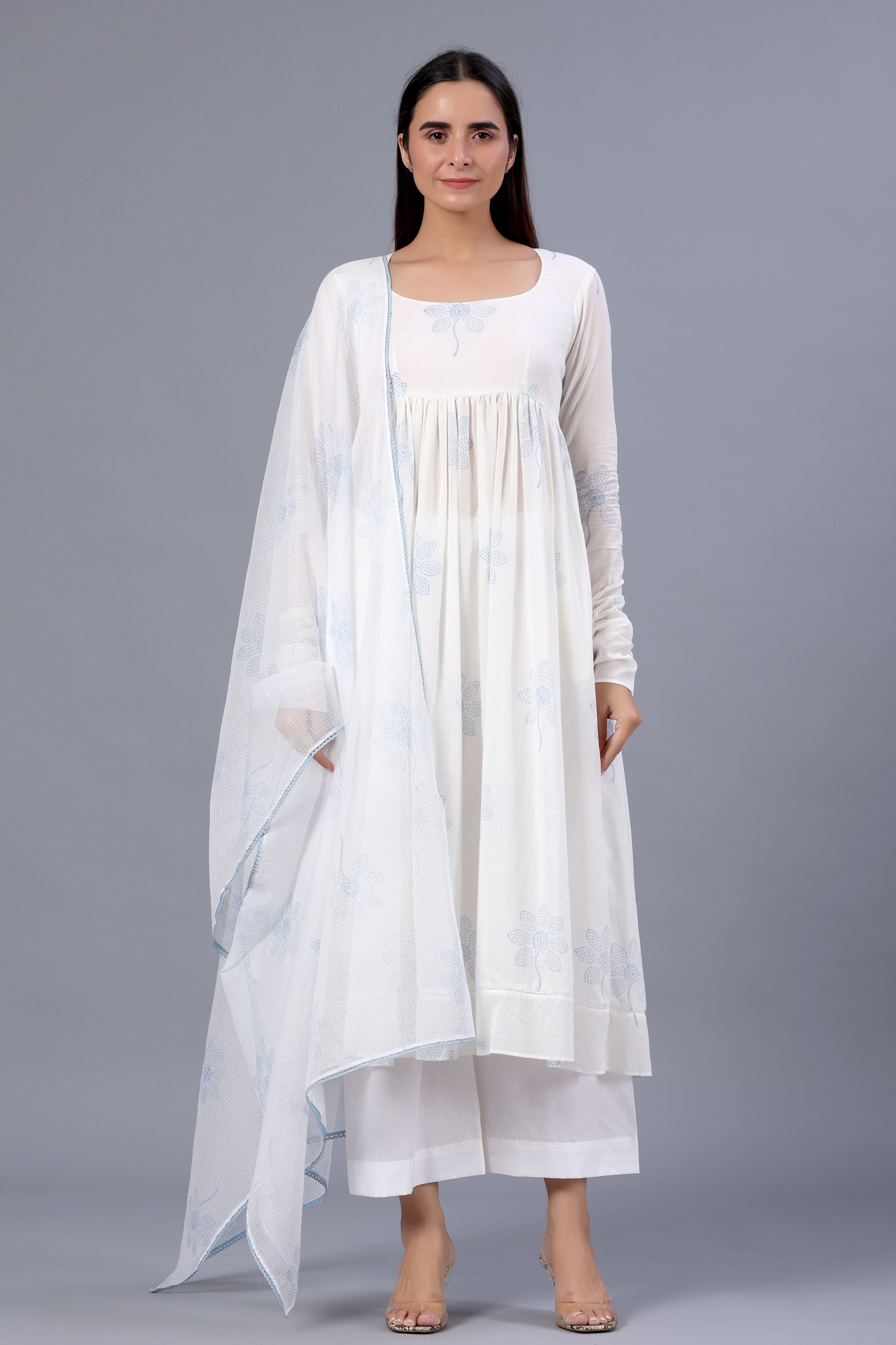 White Block Printed Full Sleeves Suit Set with Doria Dupatta