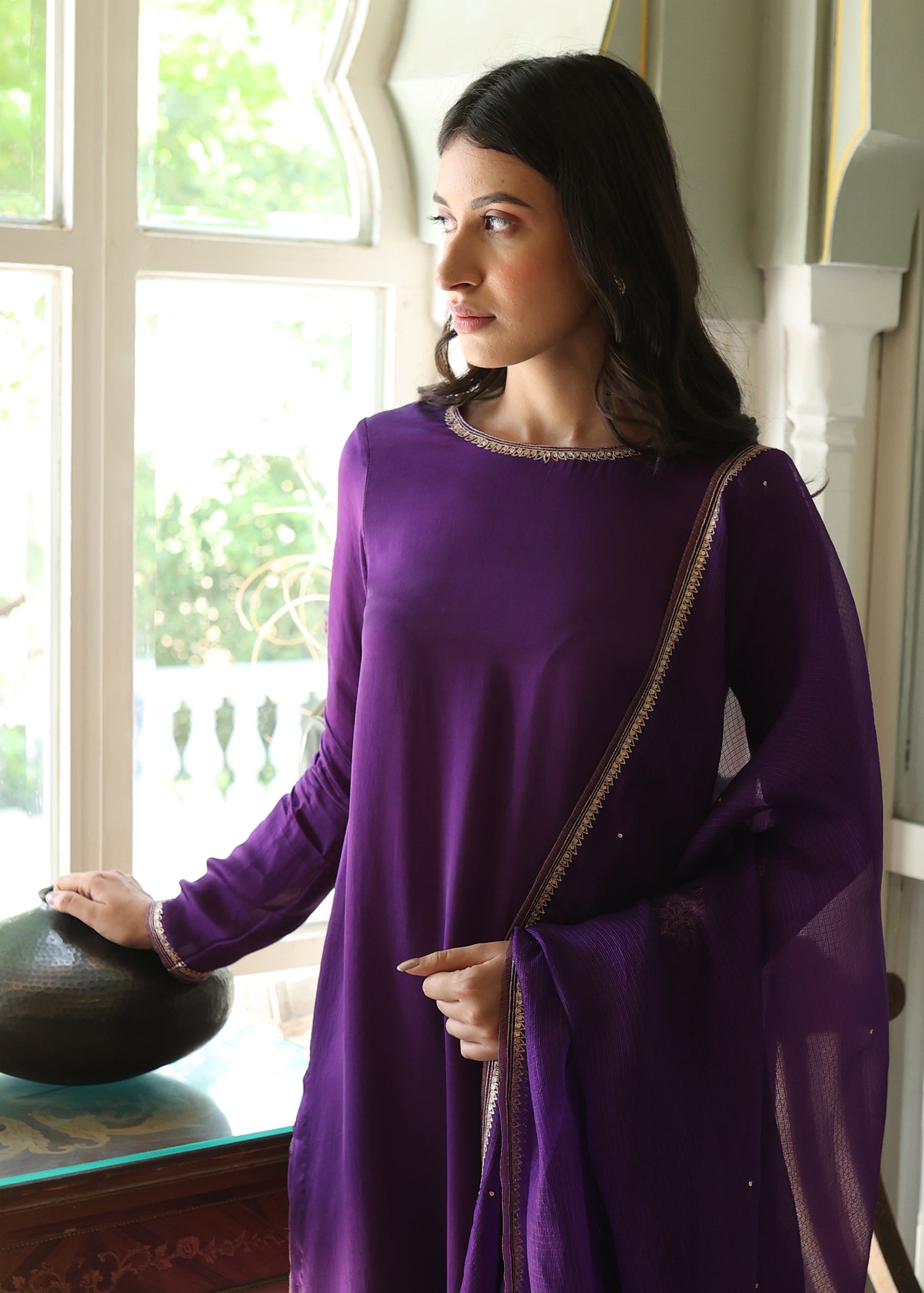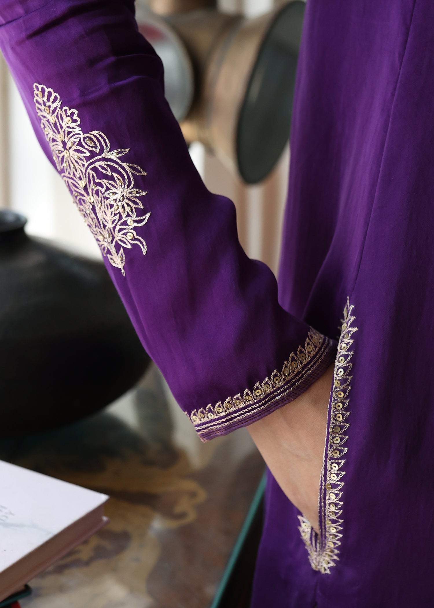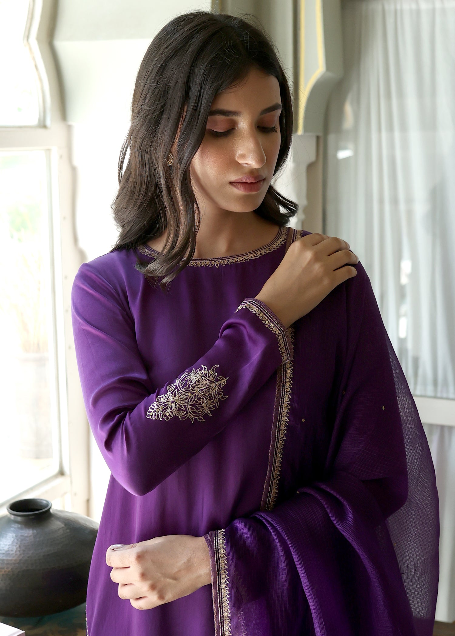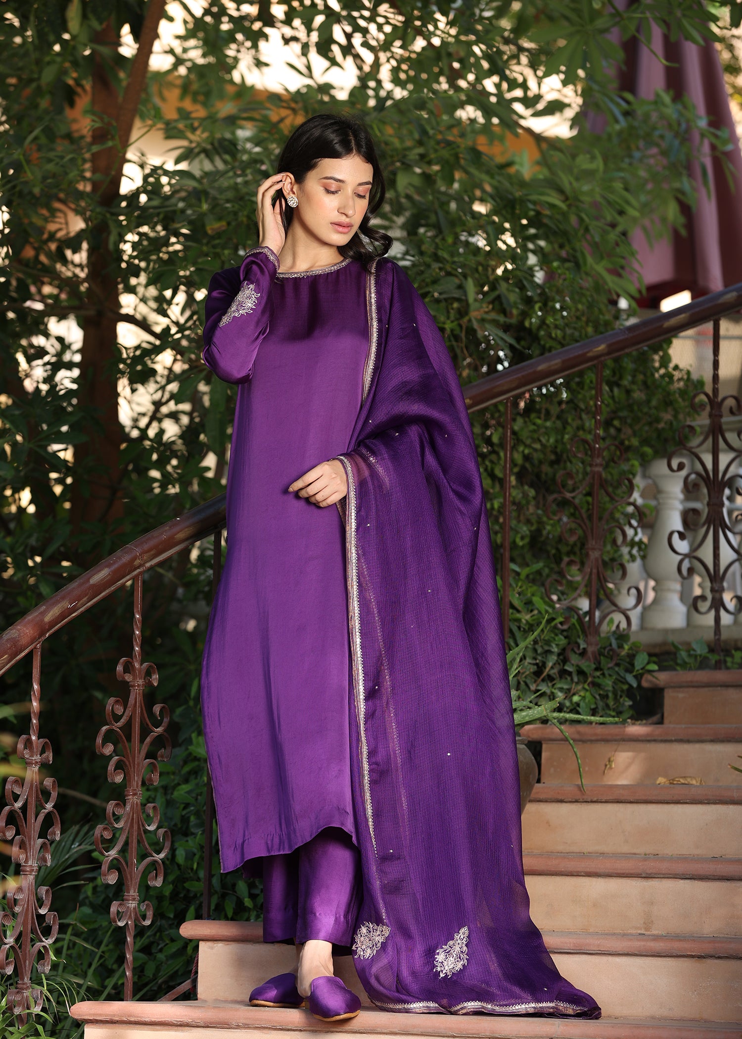 - Straight Cut Full Sleeve Kurta featuring round neckline with exquisite motif detailing on the back and sleeves. The neckline and sleeves are beautifully enhanced with border embellishments.