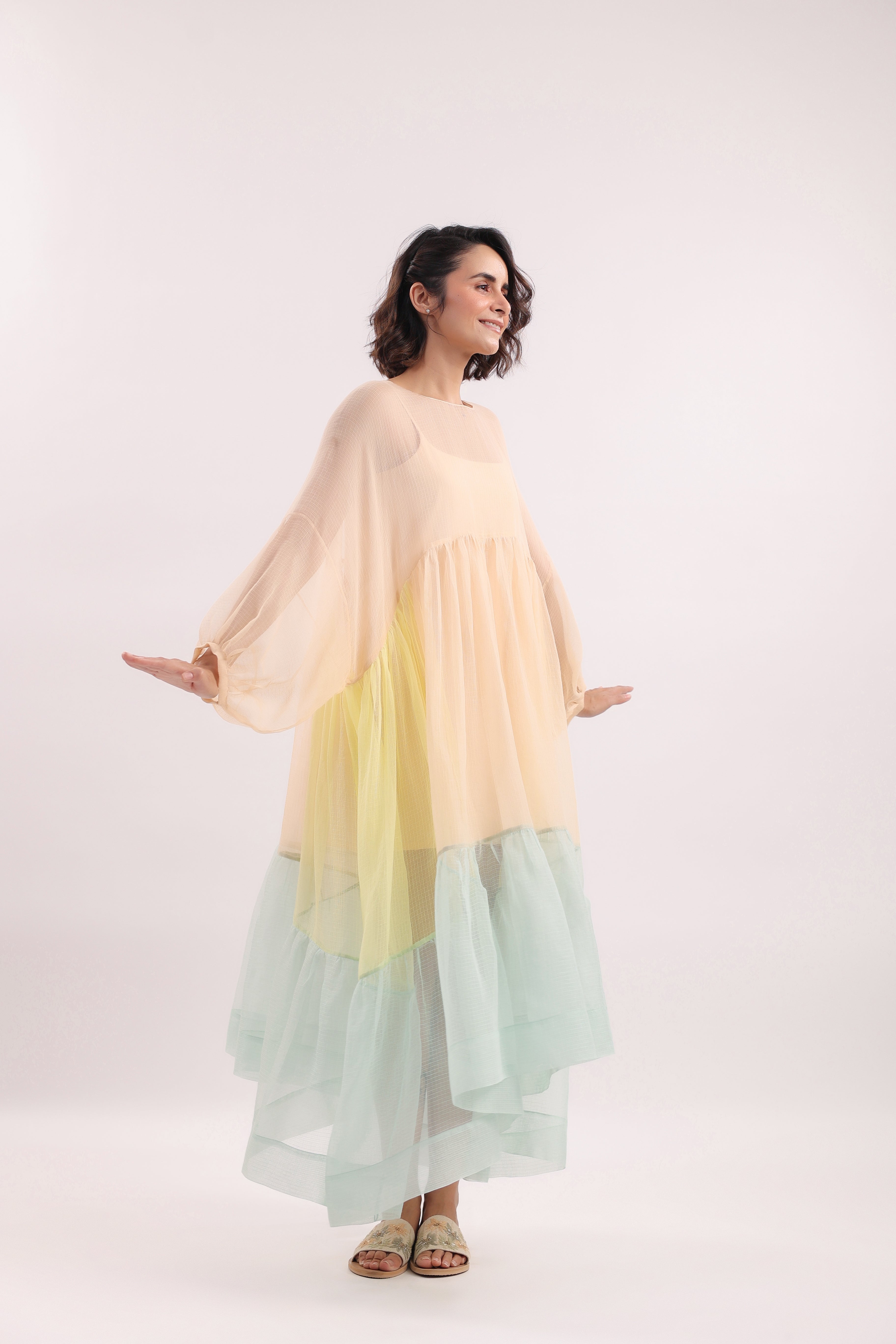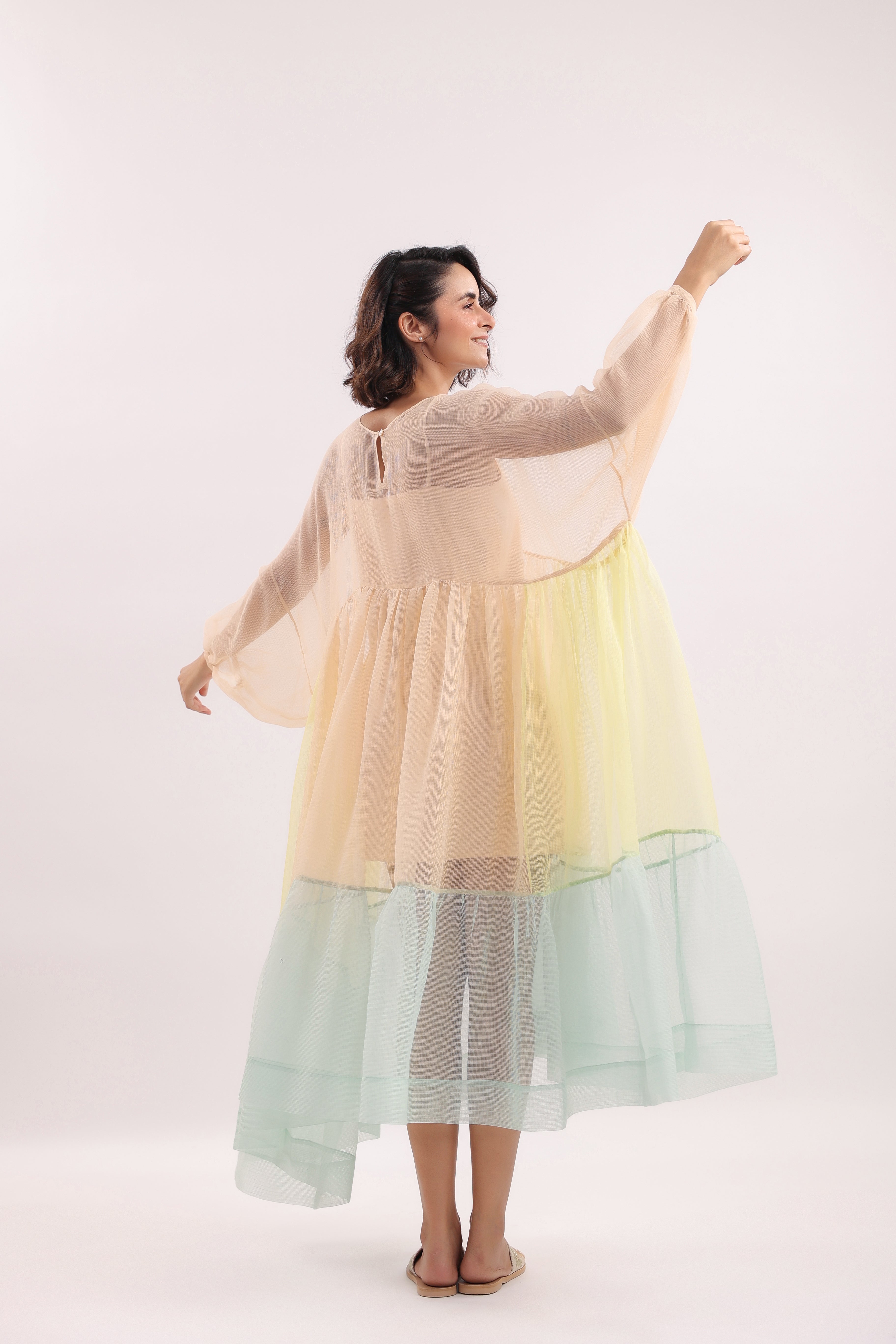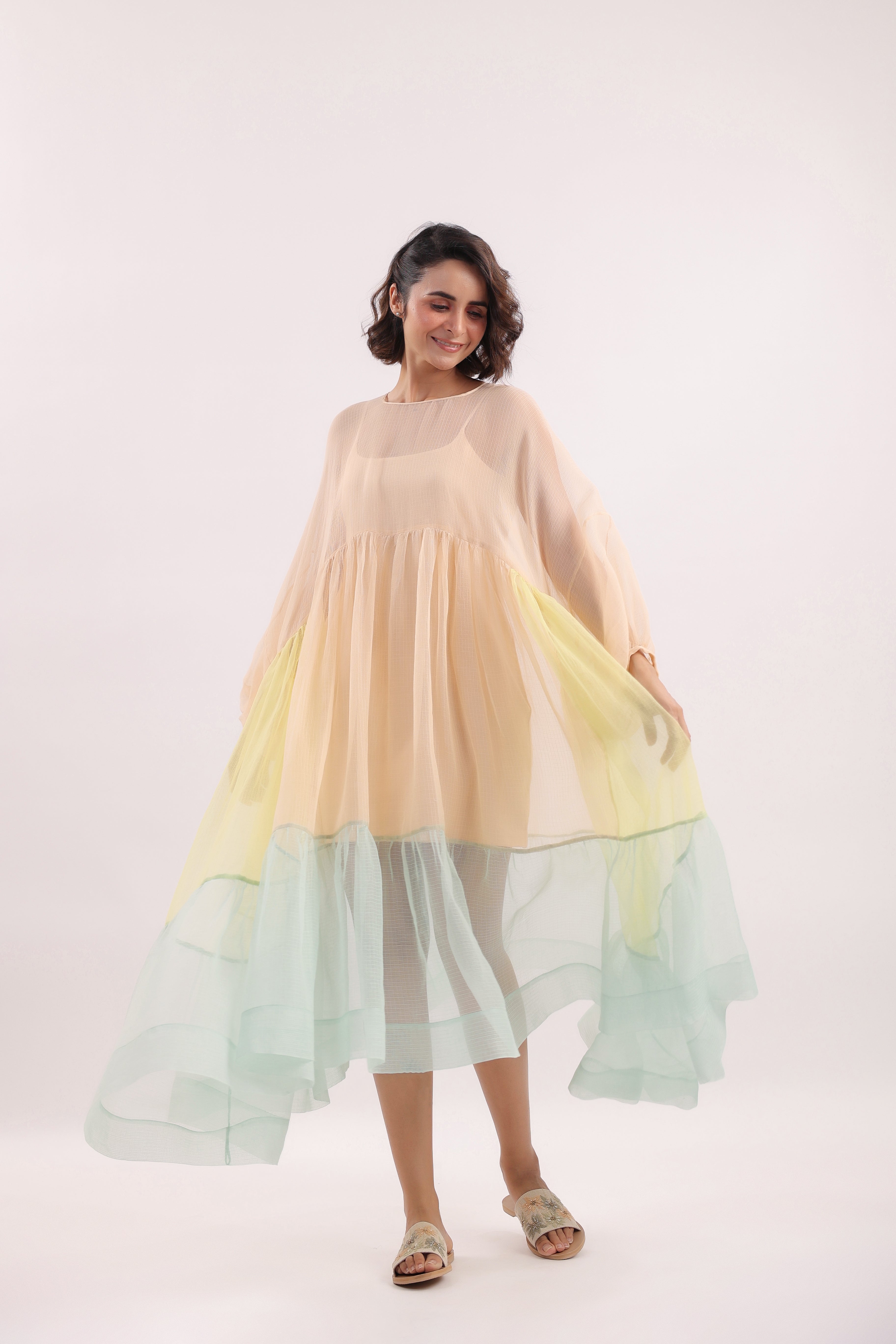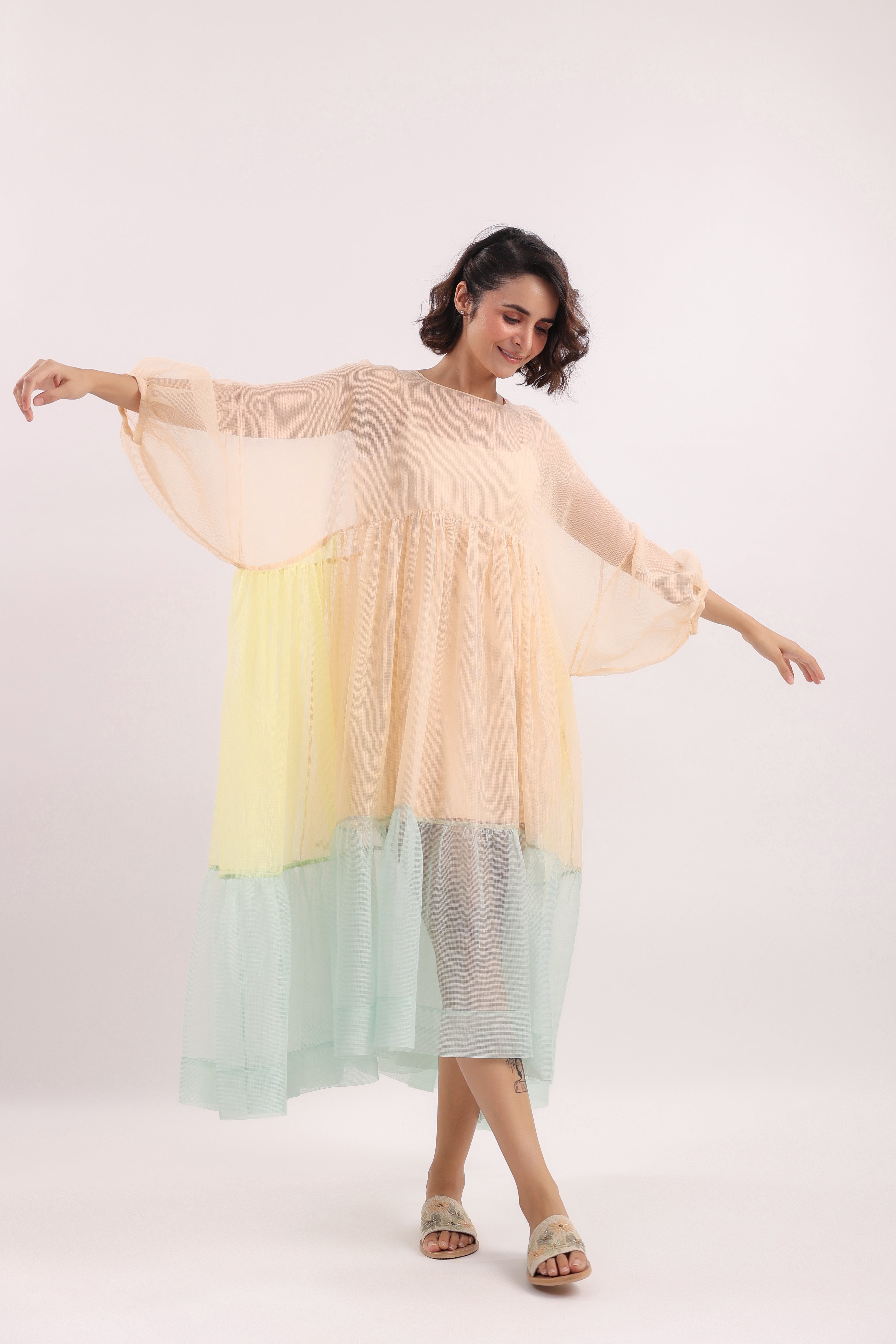 - Panelled, free-size, Kota Doriya Dress with round neckline and back button fastening.