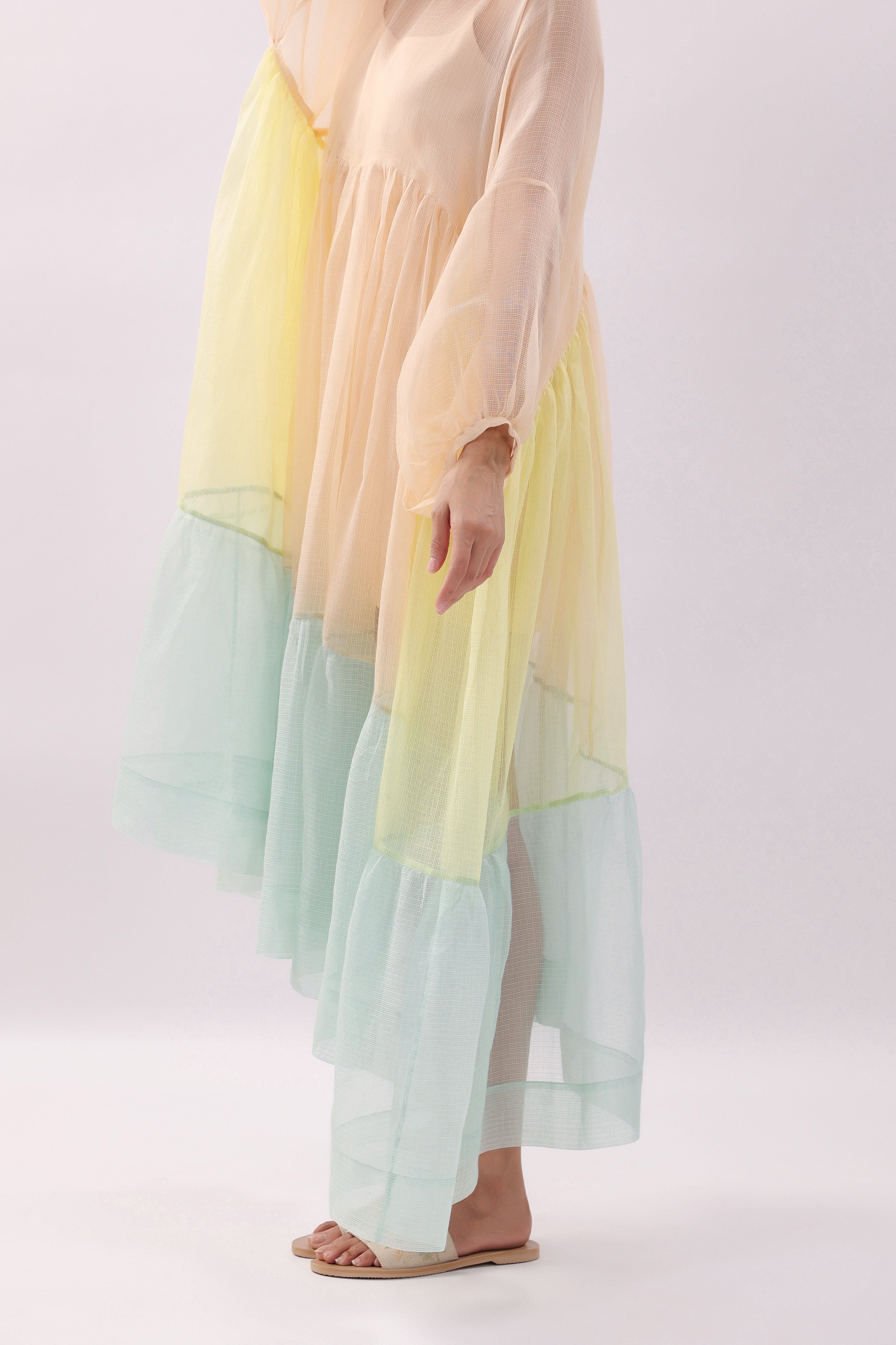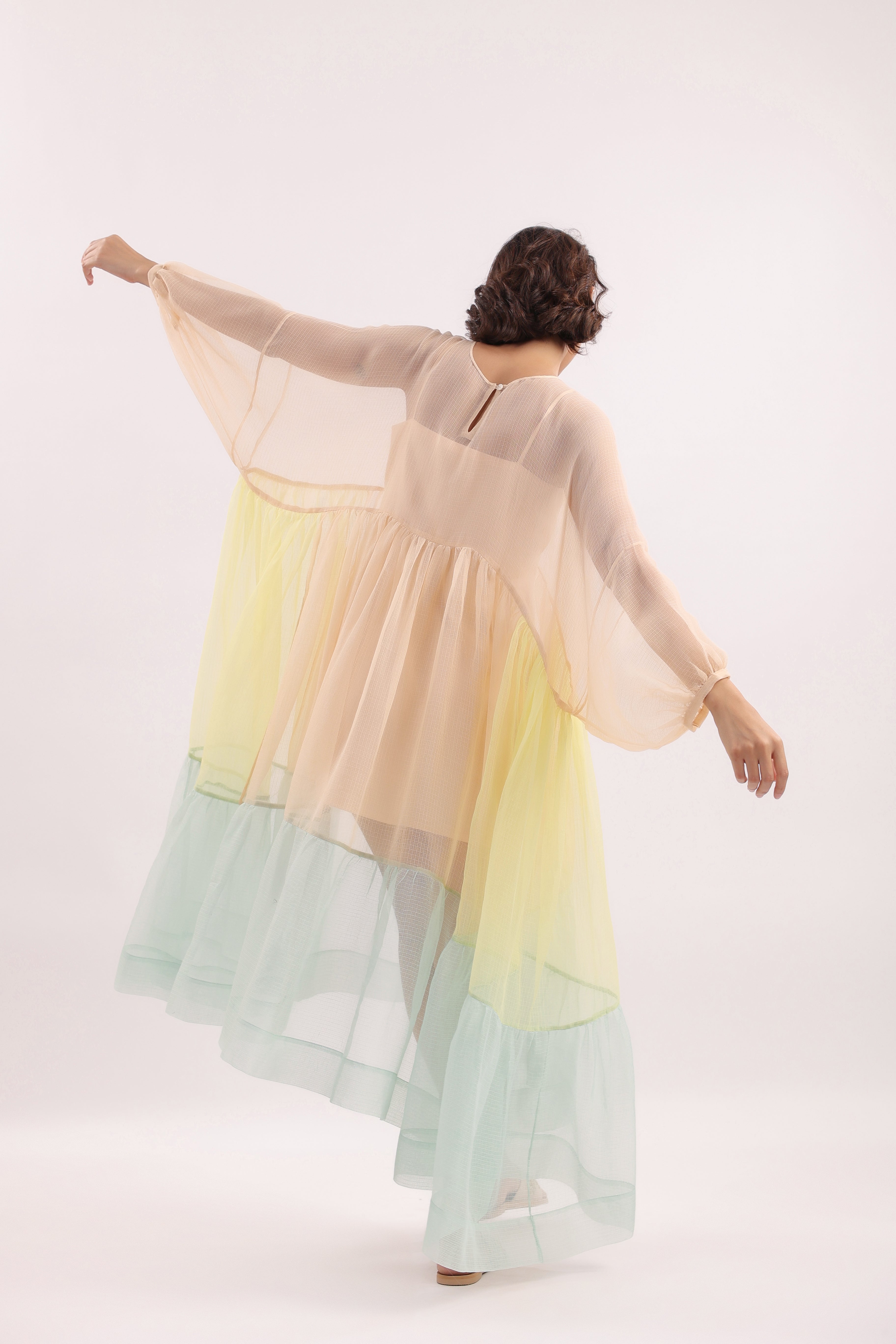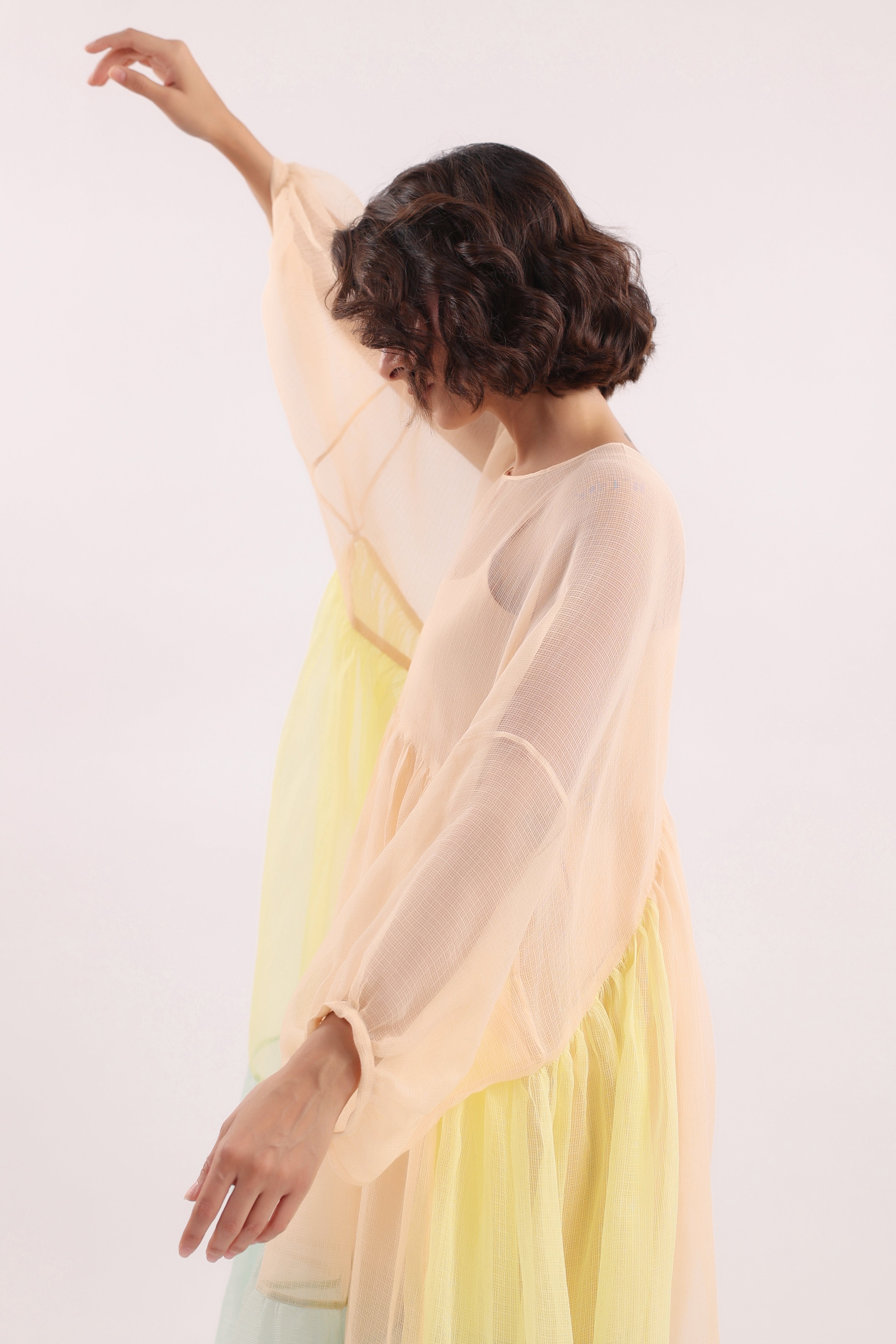 - Panelled, free-size, Kota Doriya Dress with round neckline and back button fastening.