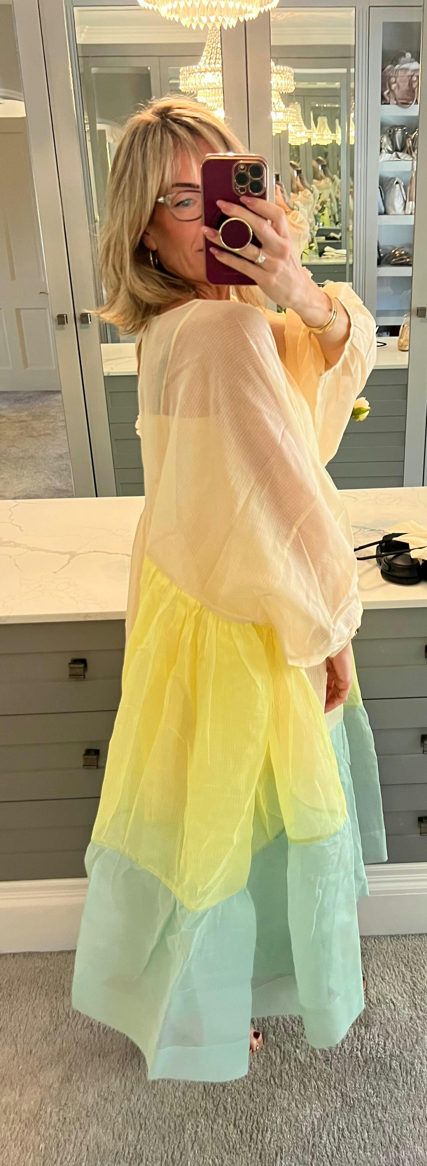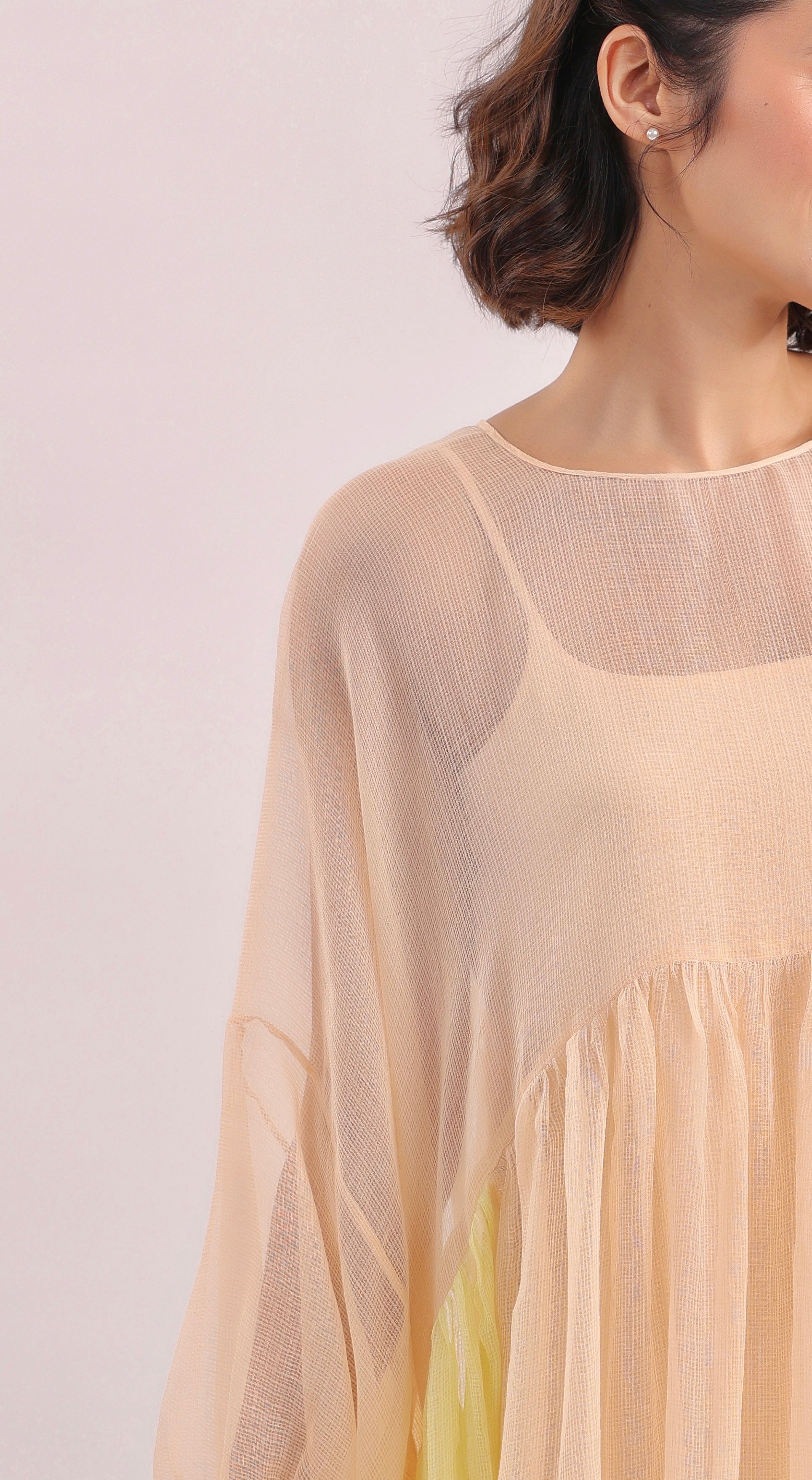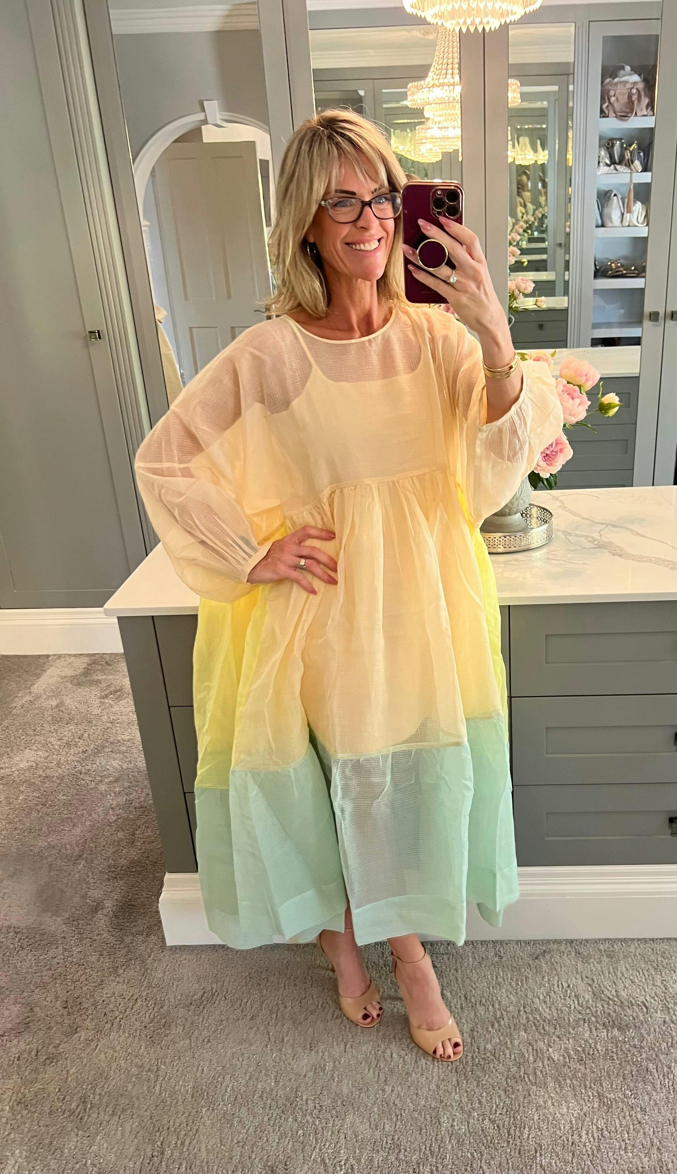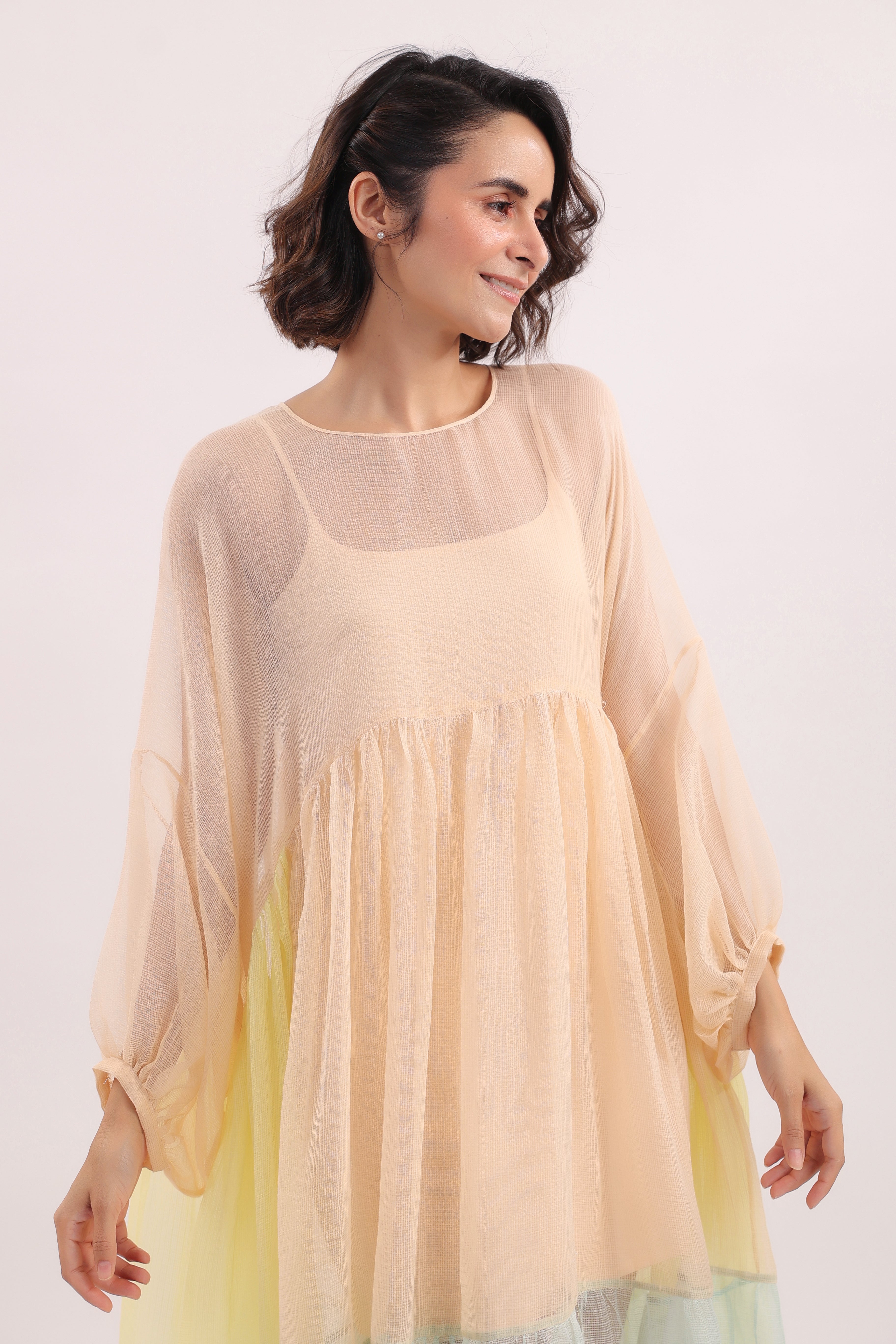 - Panelled, free-size, Kota Doriya Dress with round neckline and back button fastening.