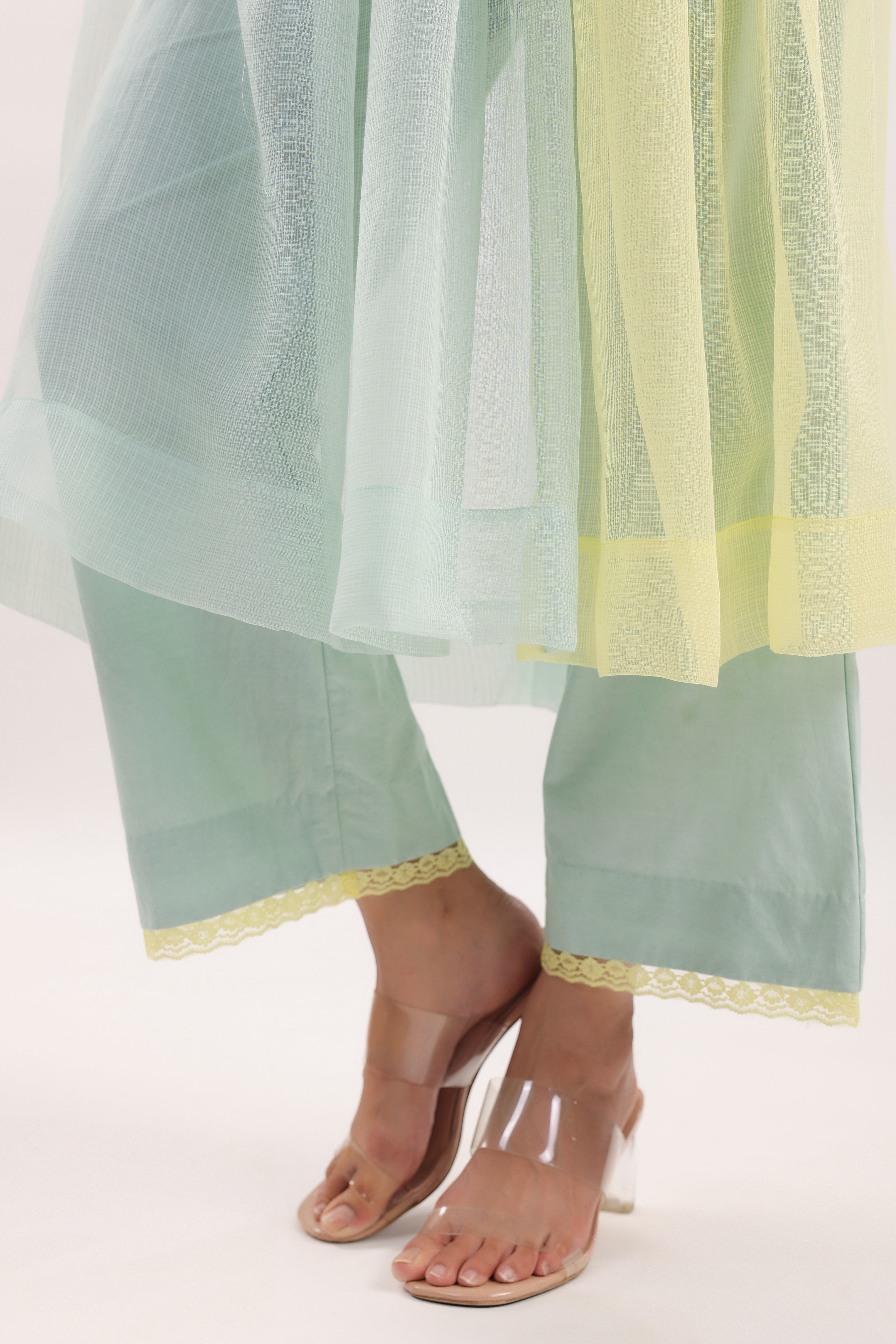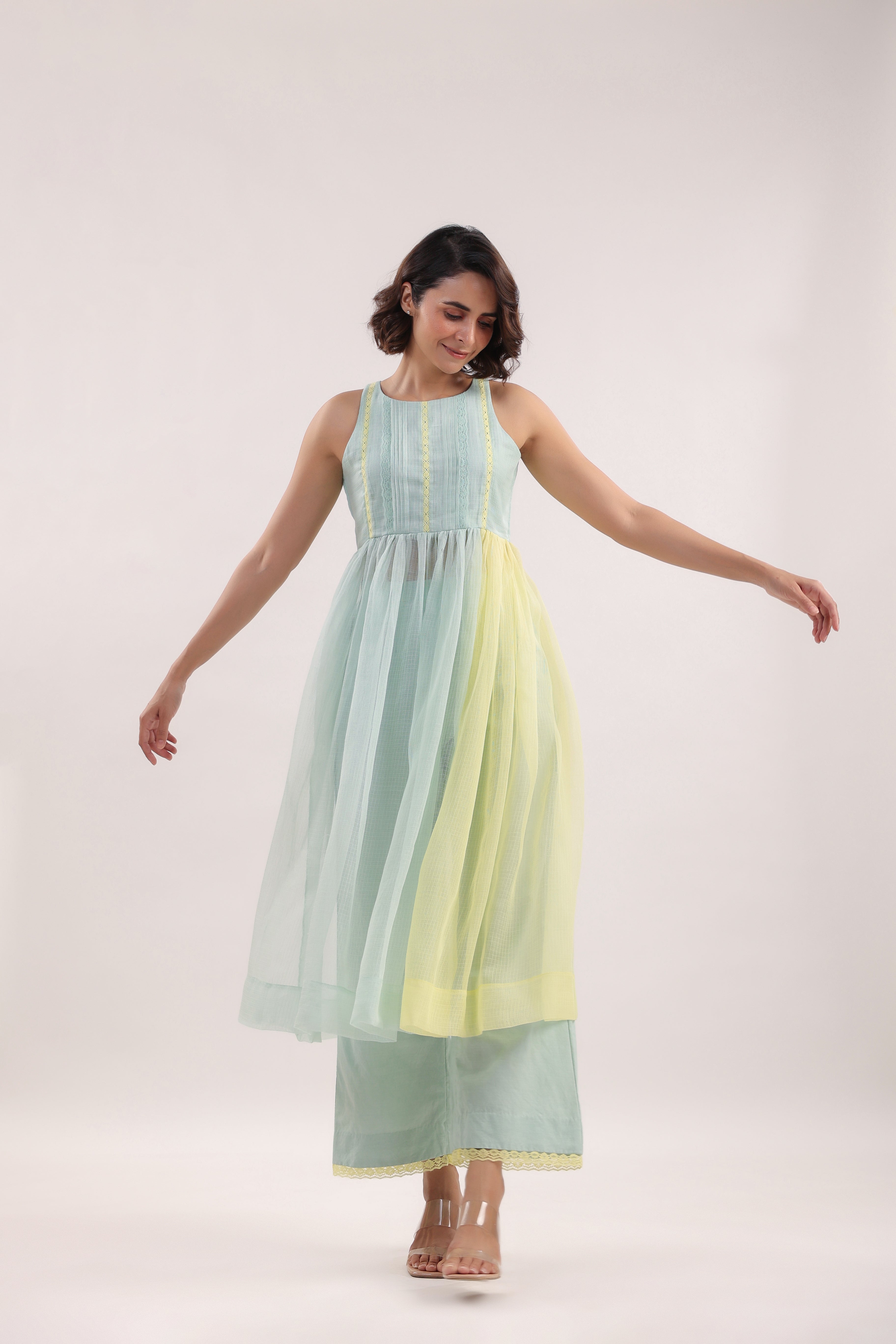 This Co-ord Set includes Wide Legged Pants and flared kurta.