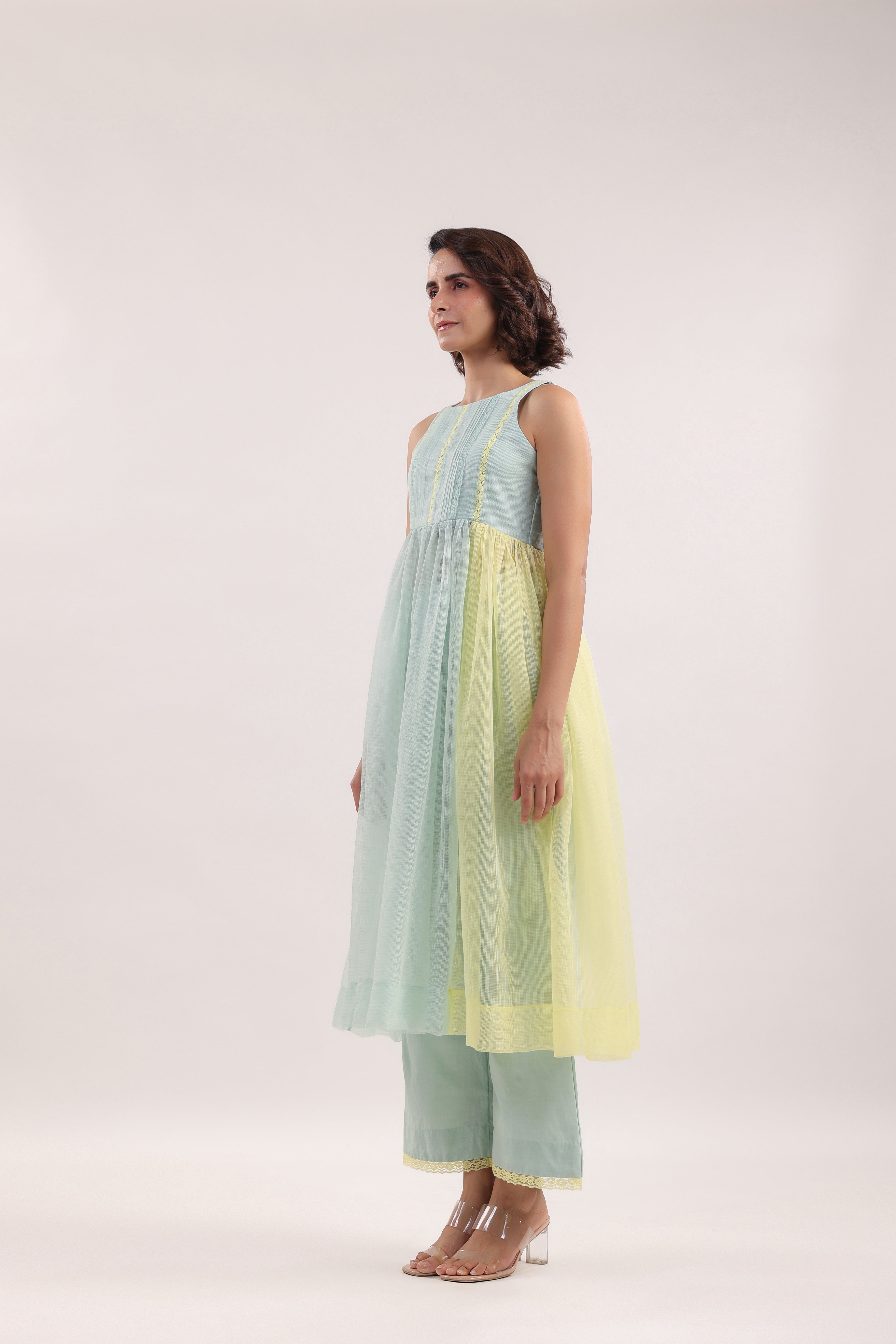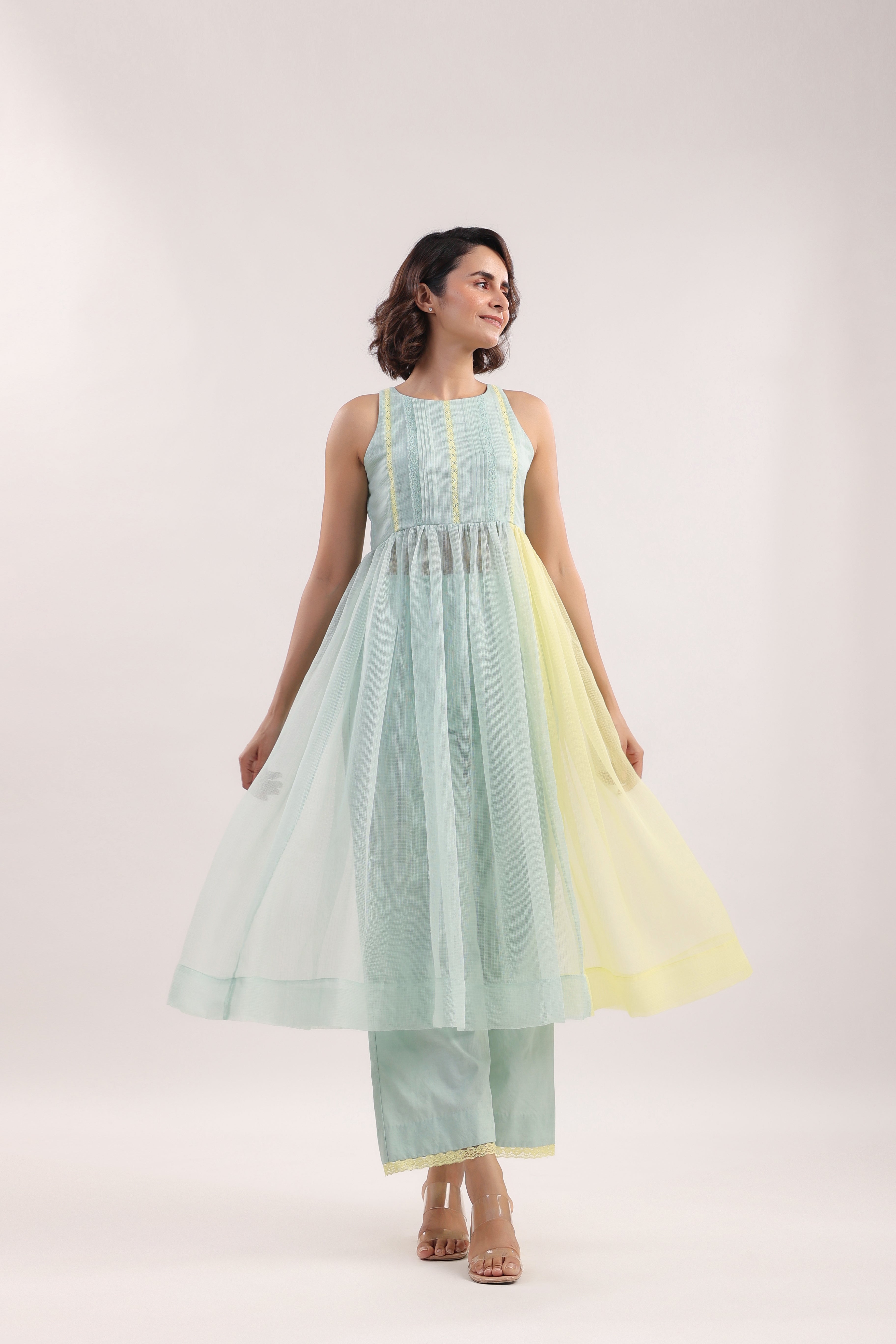 • Sleeveless, round neck kurta has sheer flare and pintucks/lace detailing on yoke.
