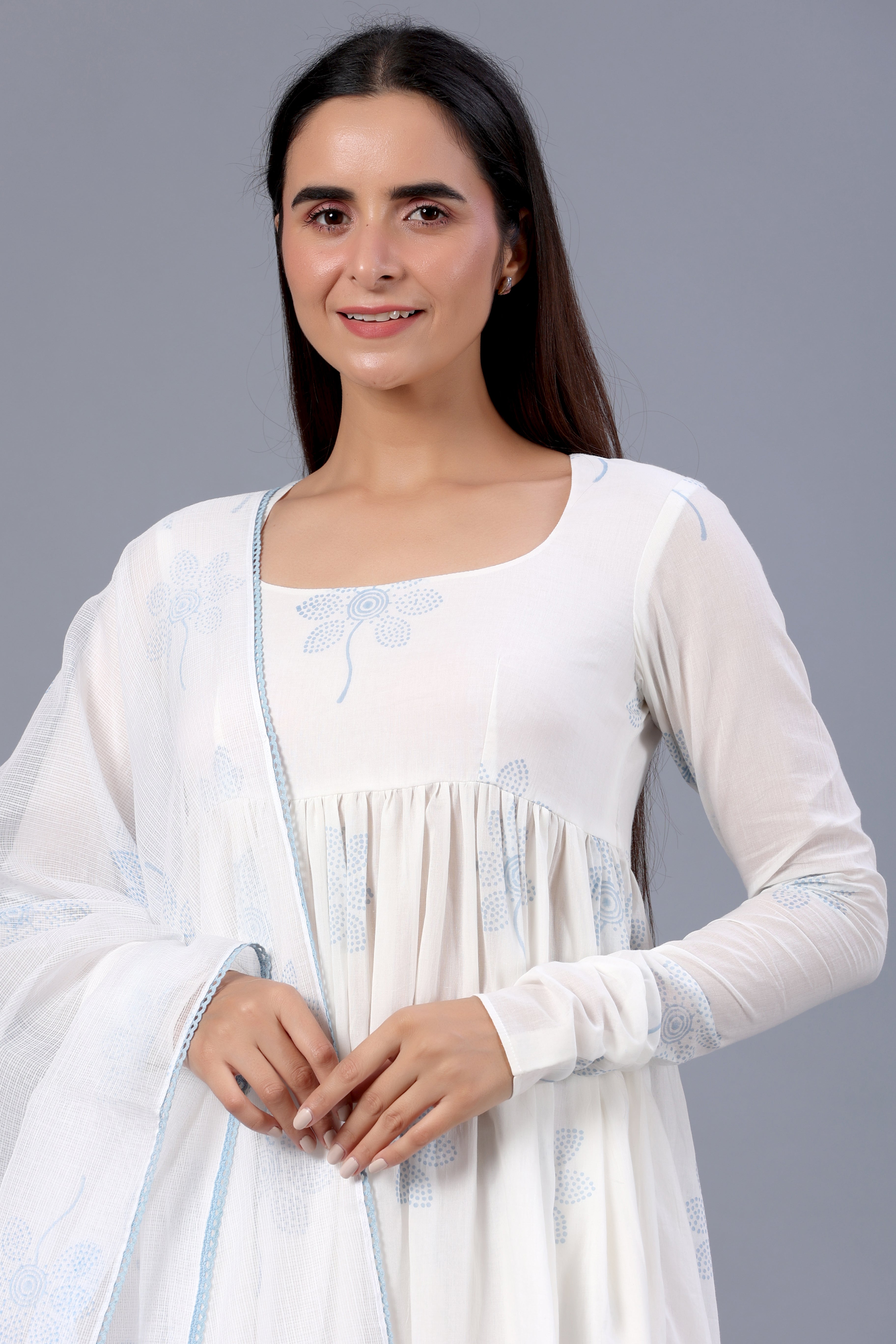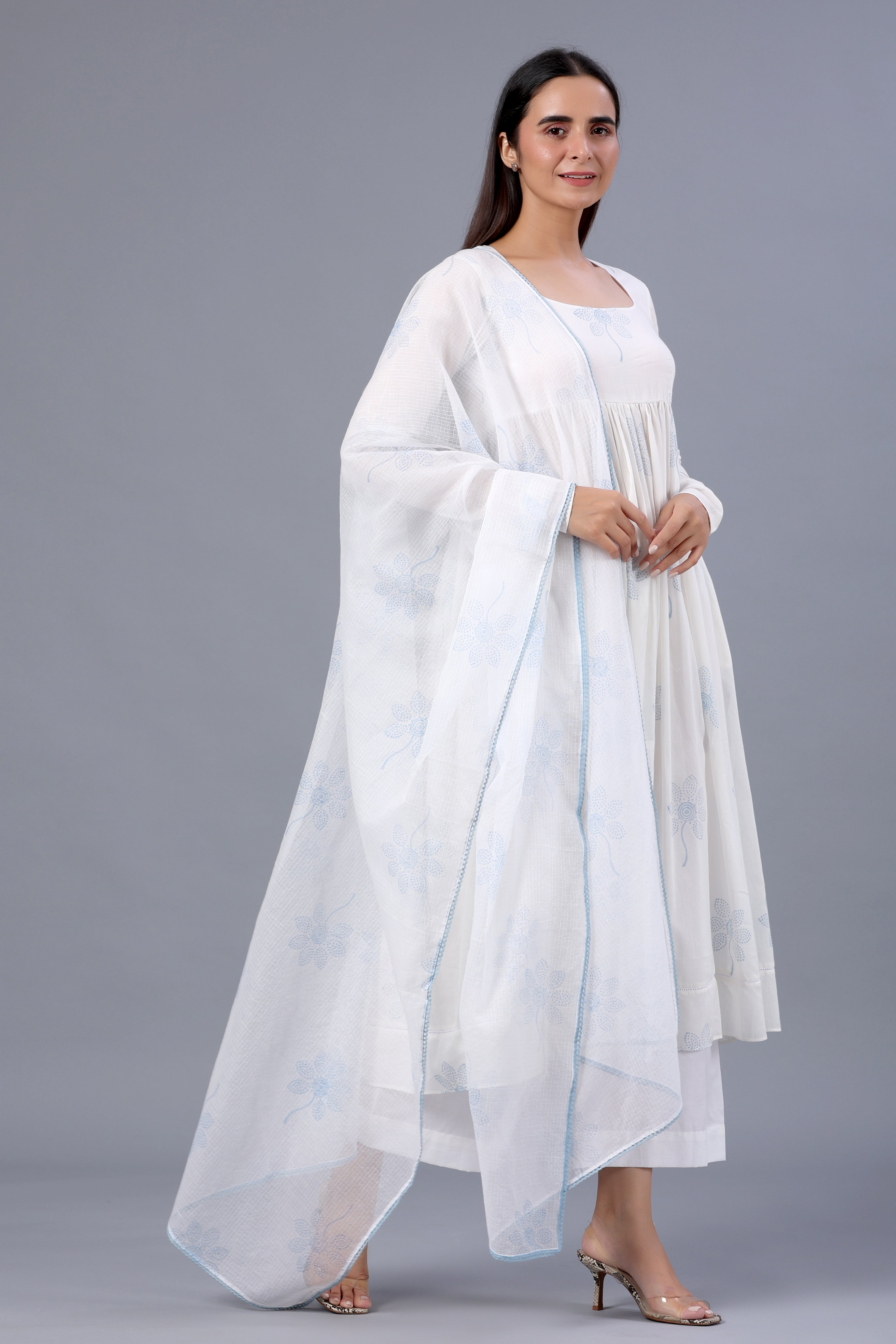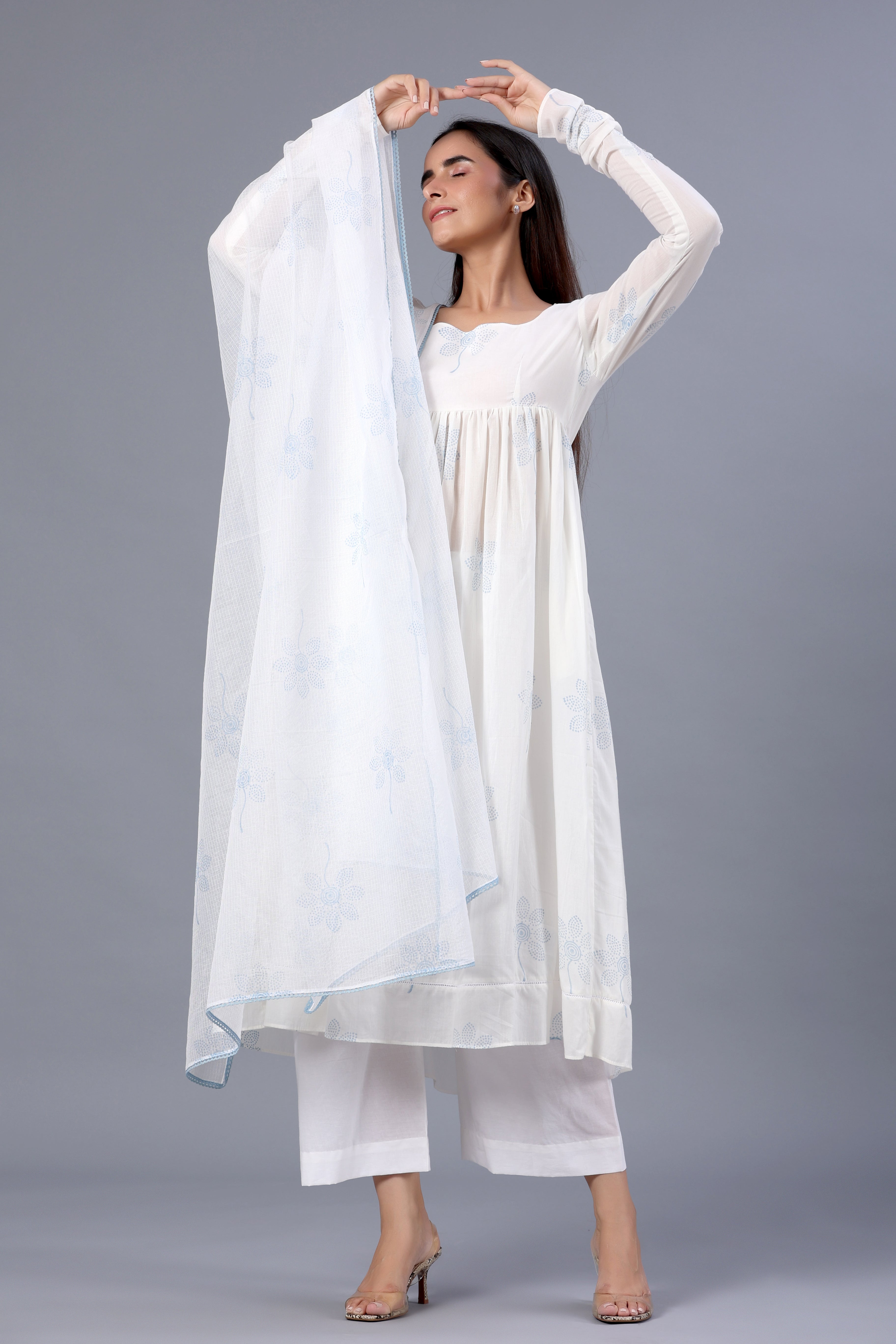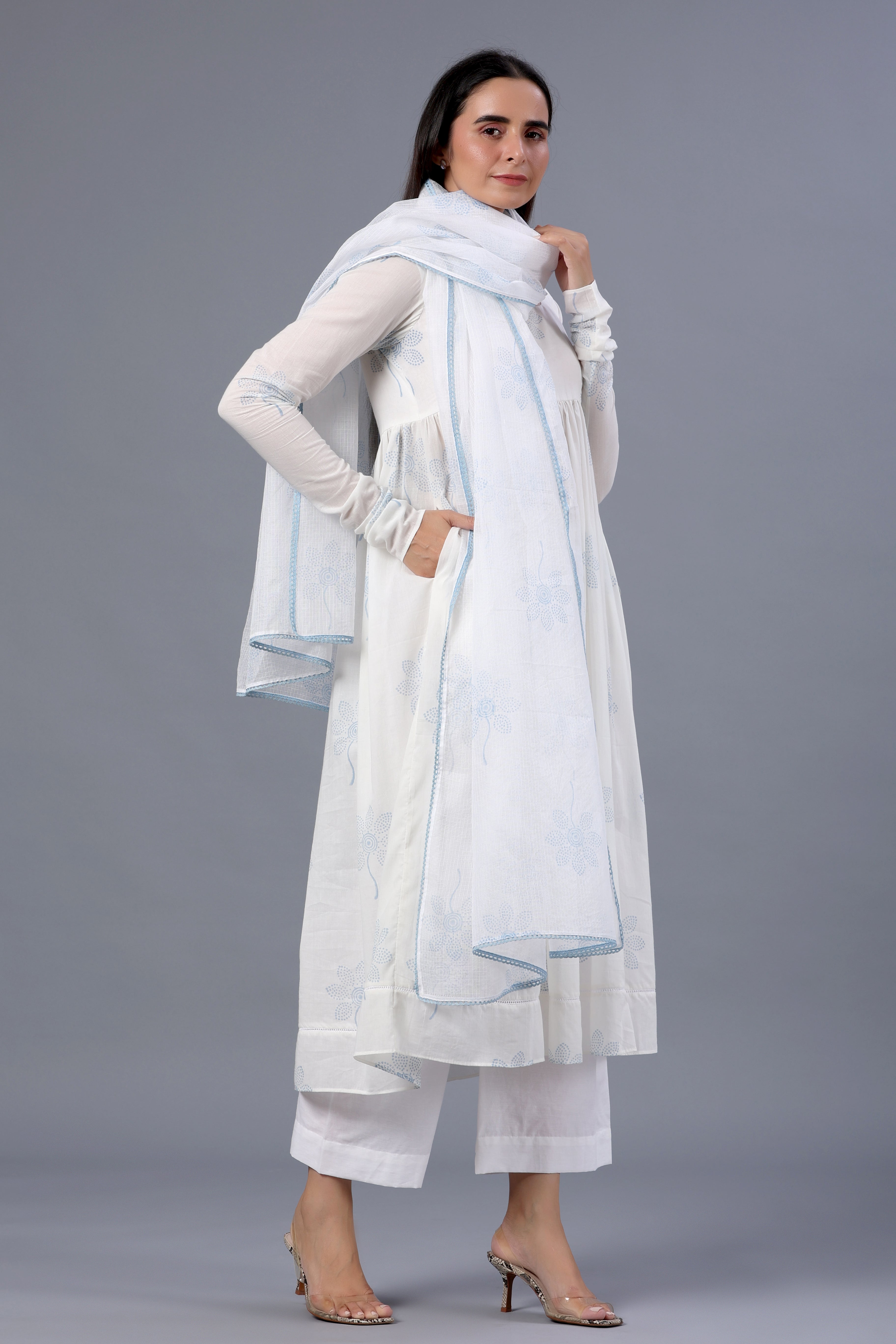 White Block Printed Full Sleeves Suit Set with Doria Dupatta