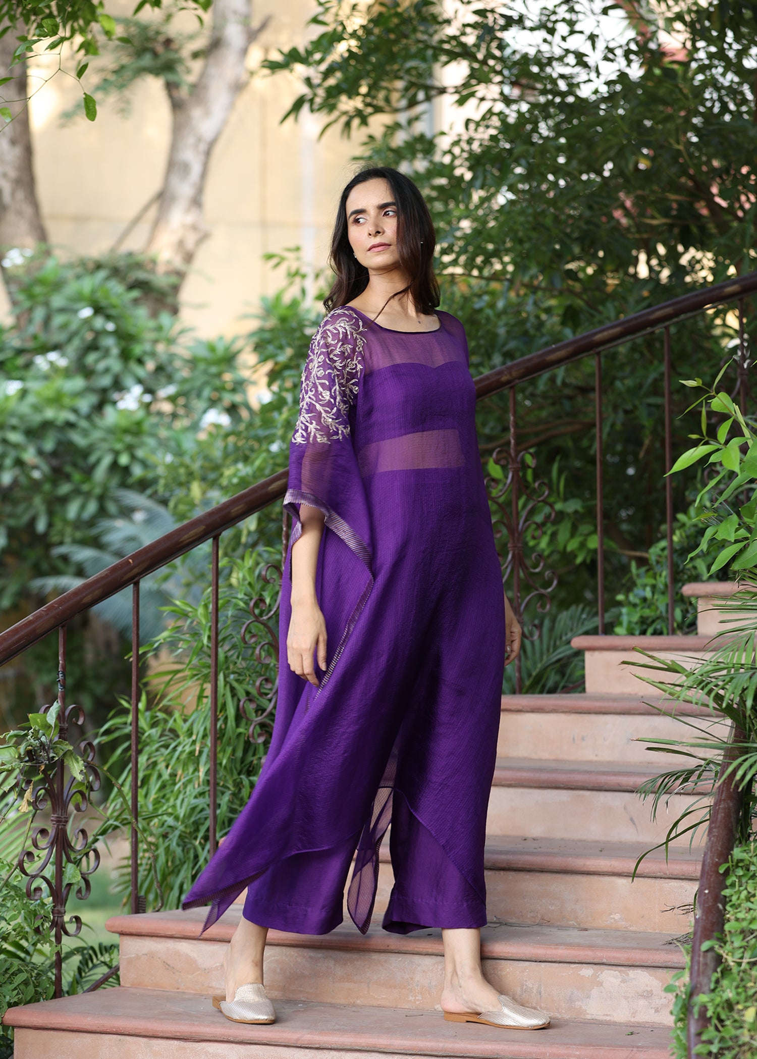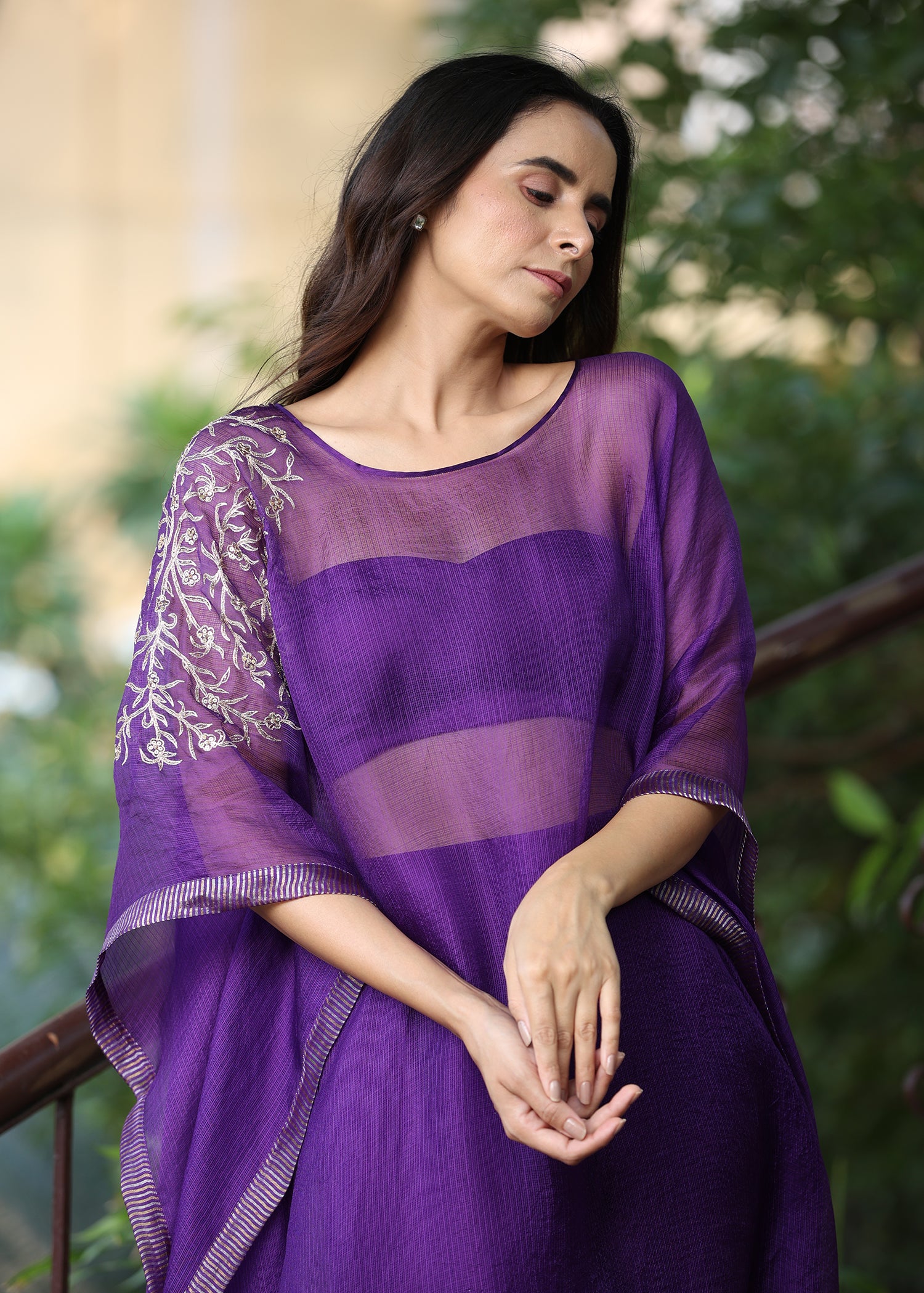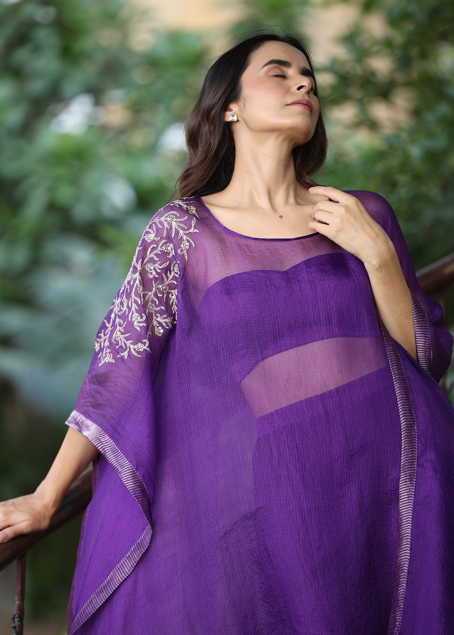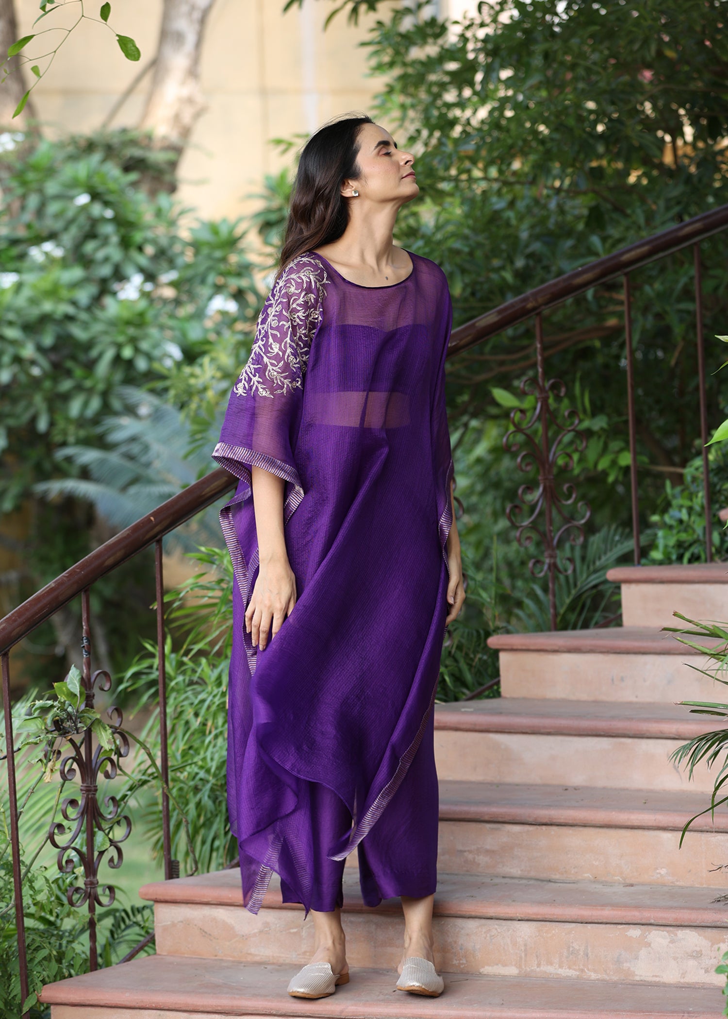 - Doriya Kaftan showcasing round neckline, adorned with one-side shoulder embellishment and finished with Chanderi facing on both sides.