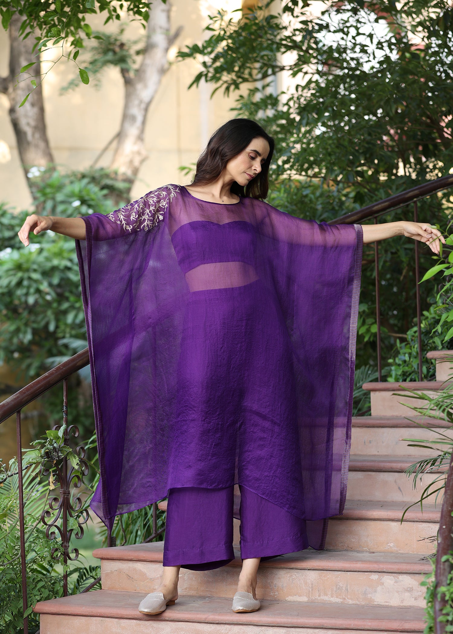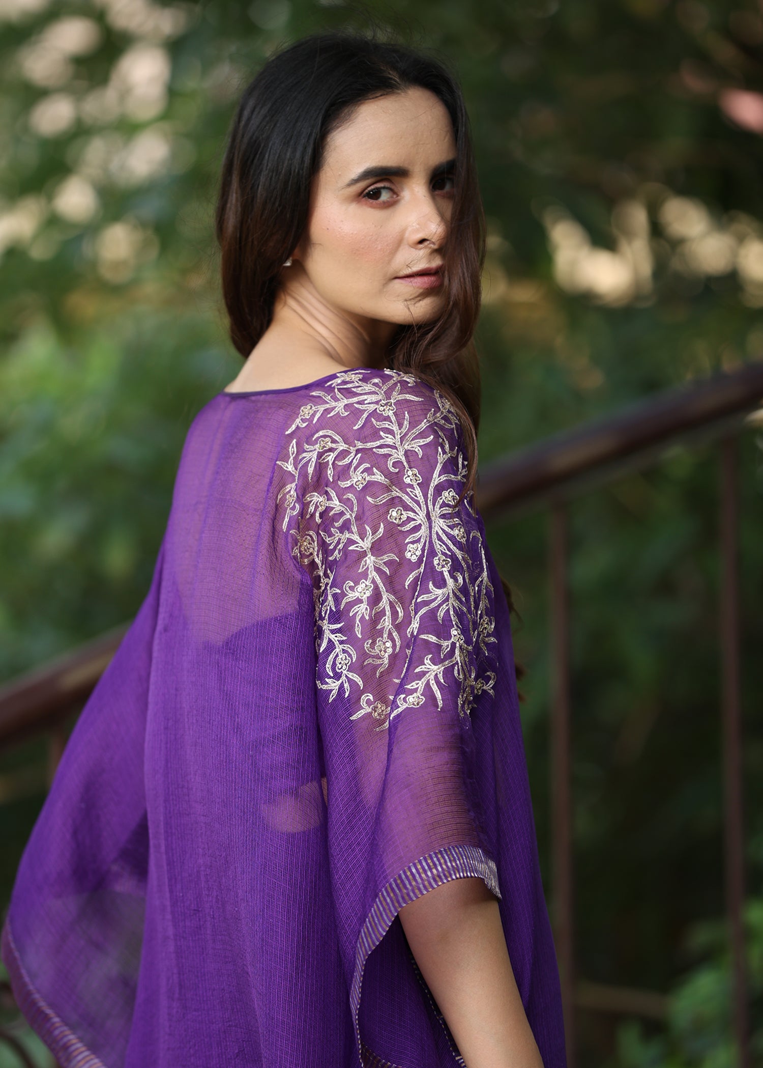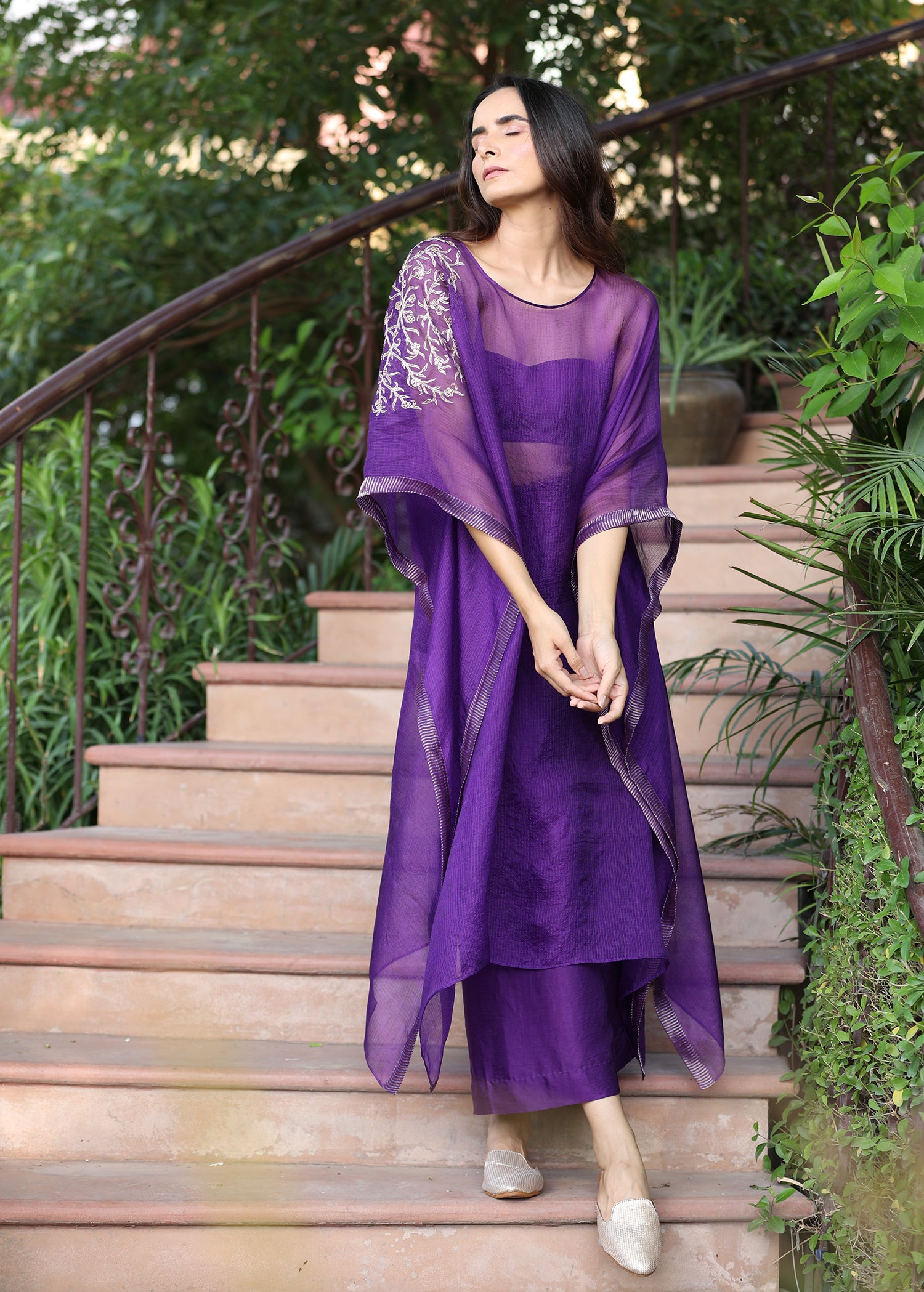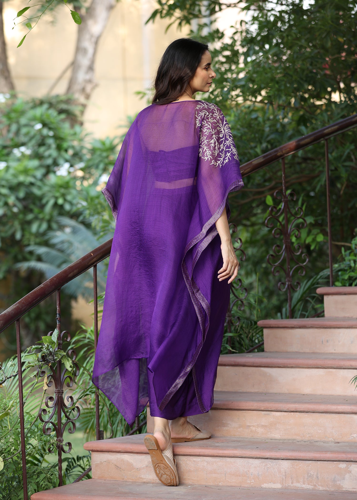 - Doriya Kaftan showcasing round neckline, adorned with one-side shoulder embellishment and finished with Chanderi facing on both sides.