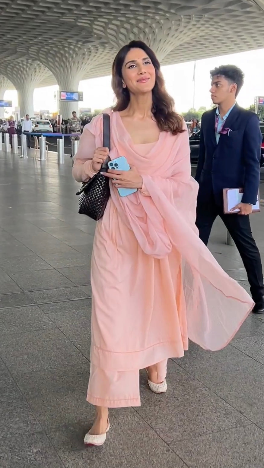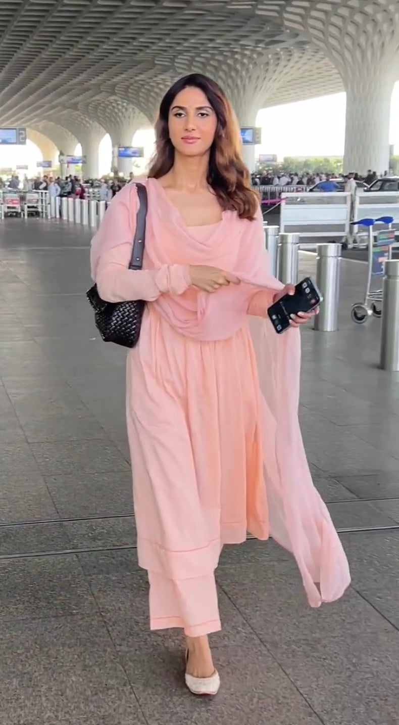 Vaani Kapoor in Peach Full Sleeves Suit Set with Doria Dupatta