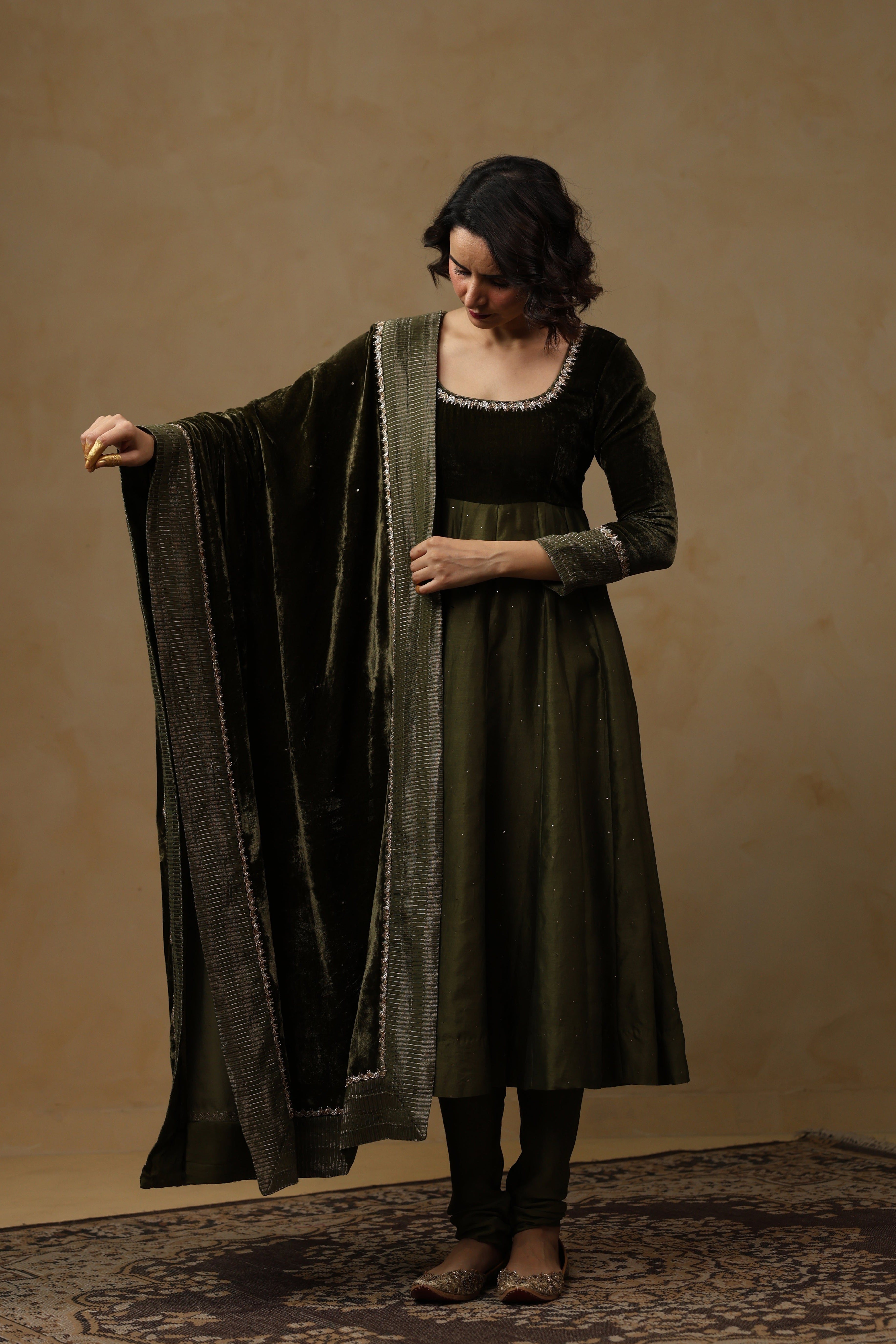 - Velvet Dupatta featuring intricate hand embellishment and finished with a tissue Chanderi facing along the border.
