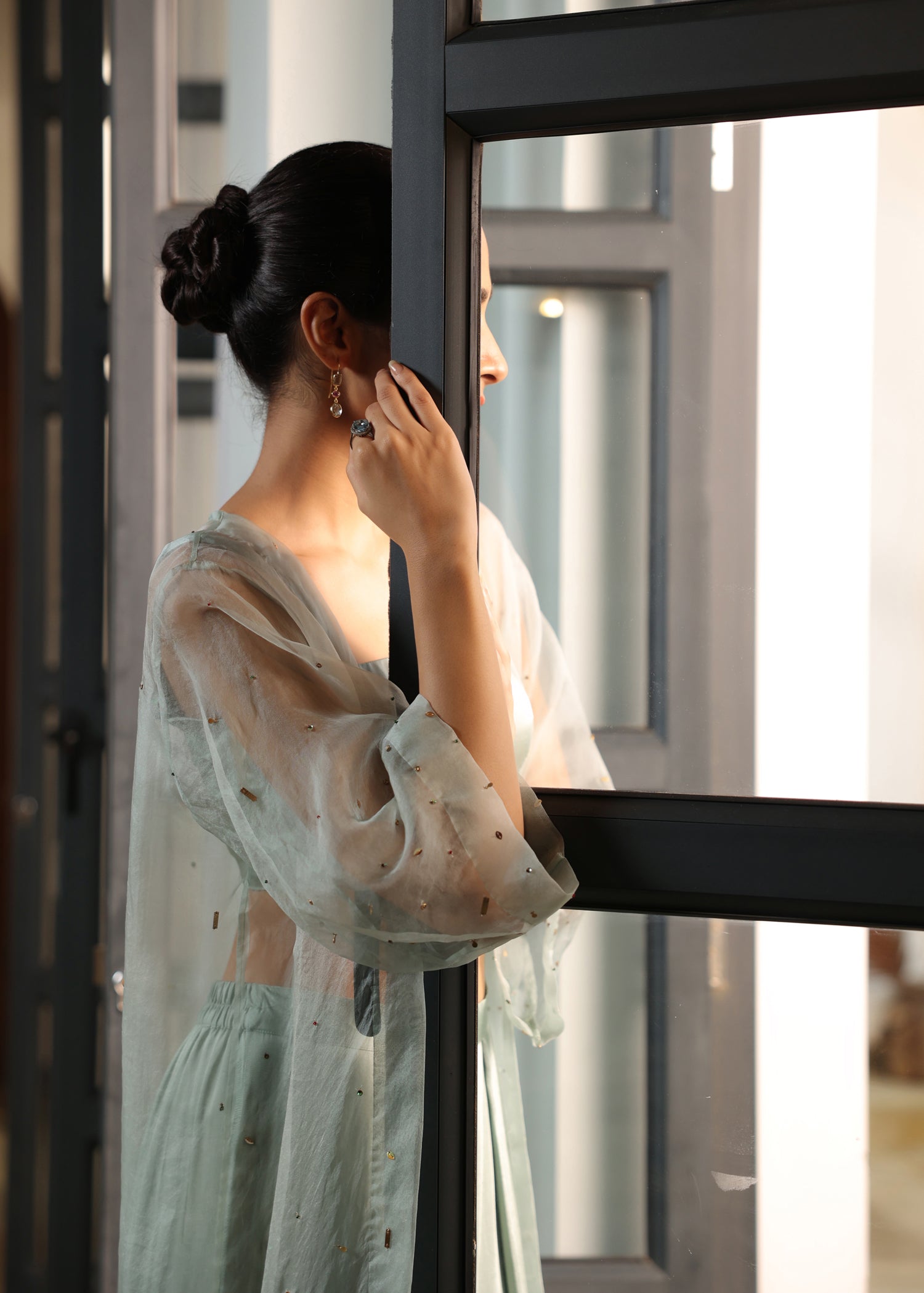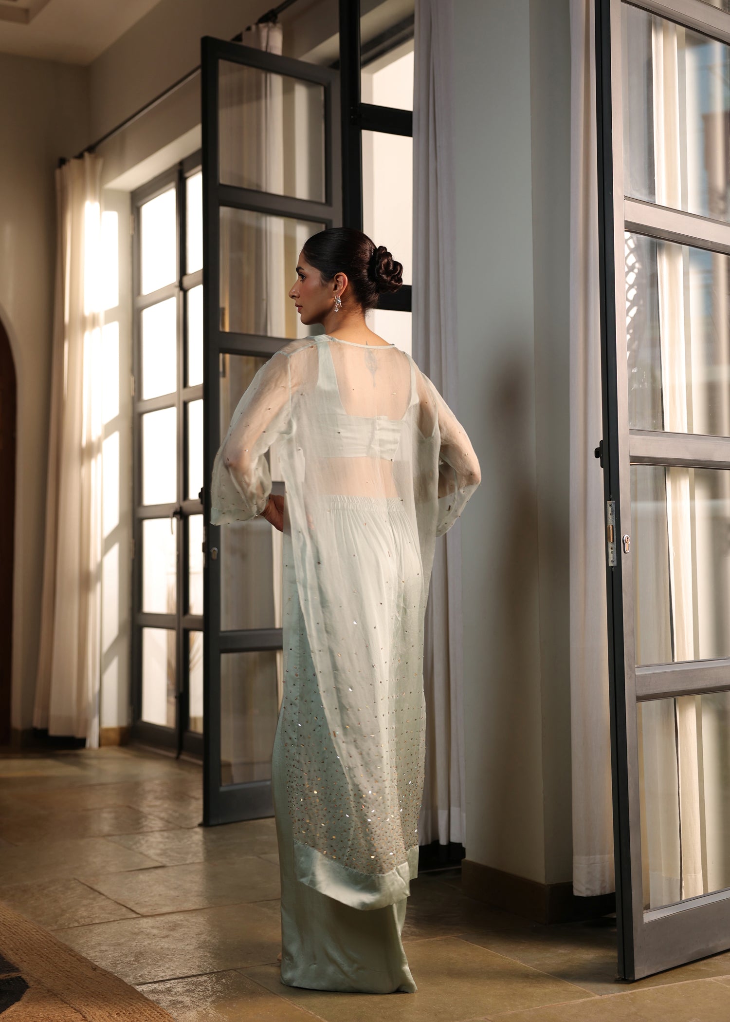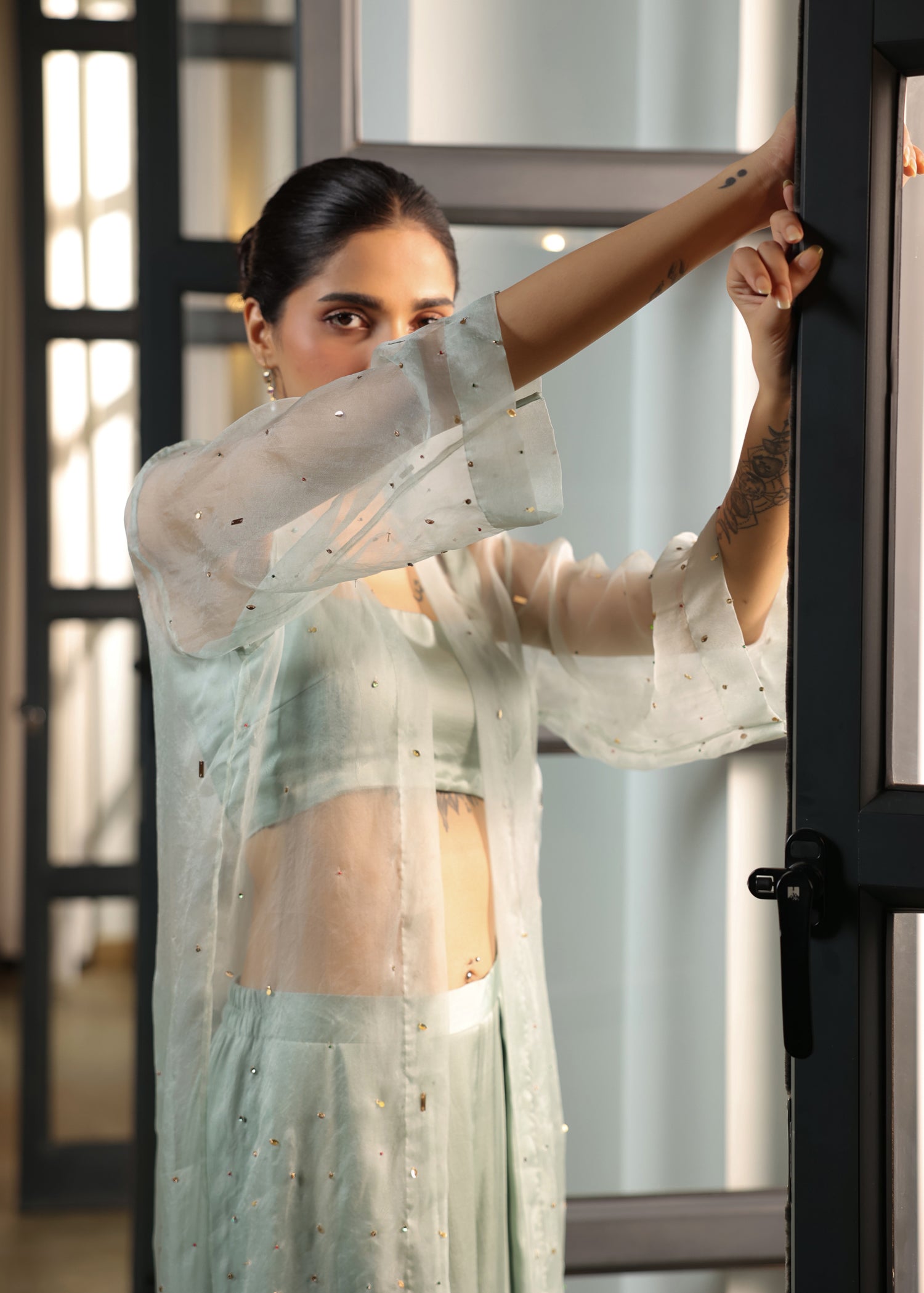 - Relaxed Fit Shrug with scattered handwork all over and modal satin facing on the hemline.