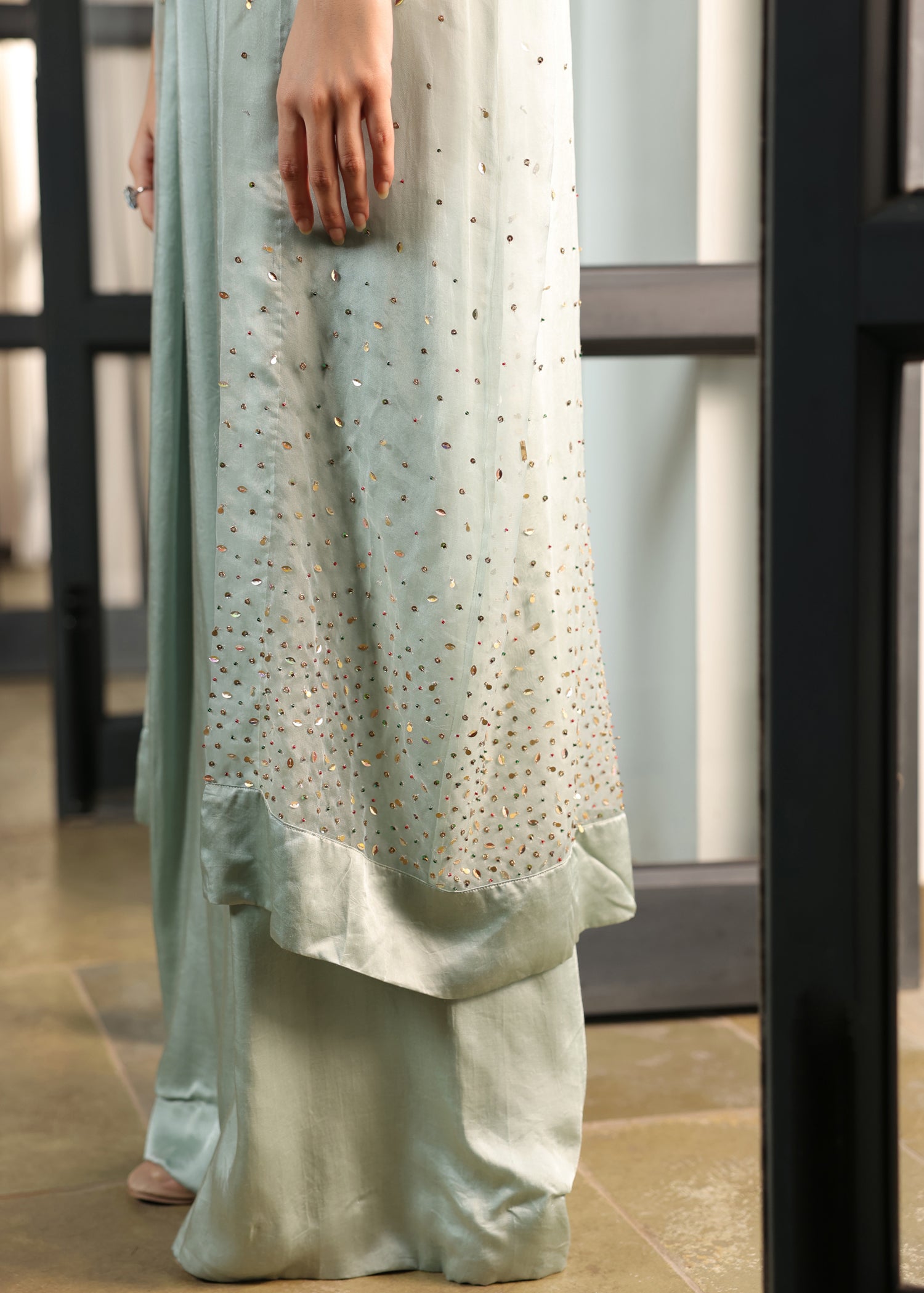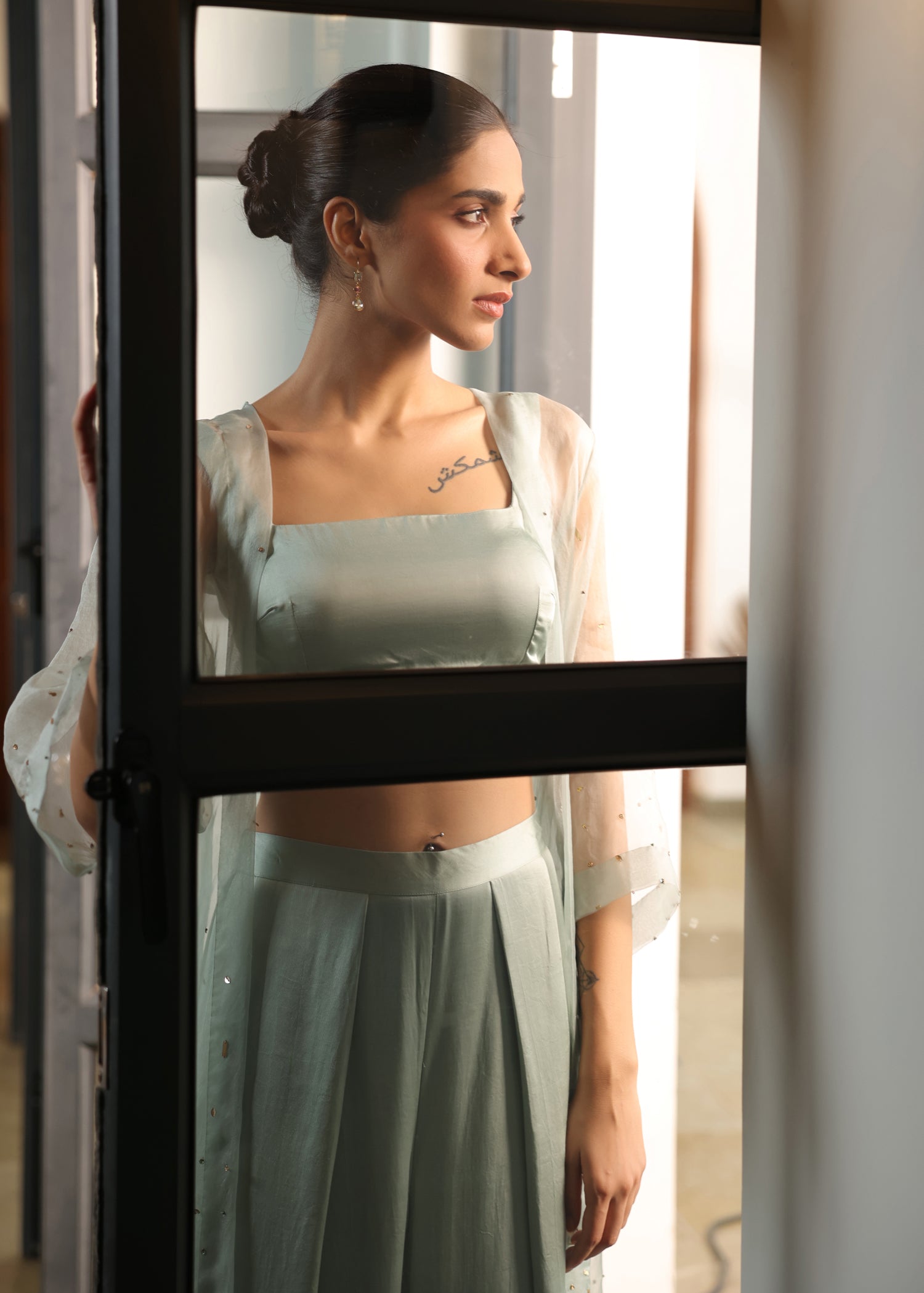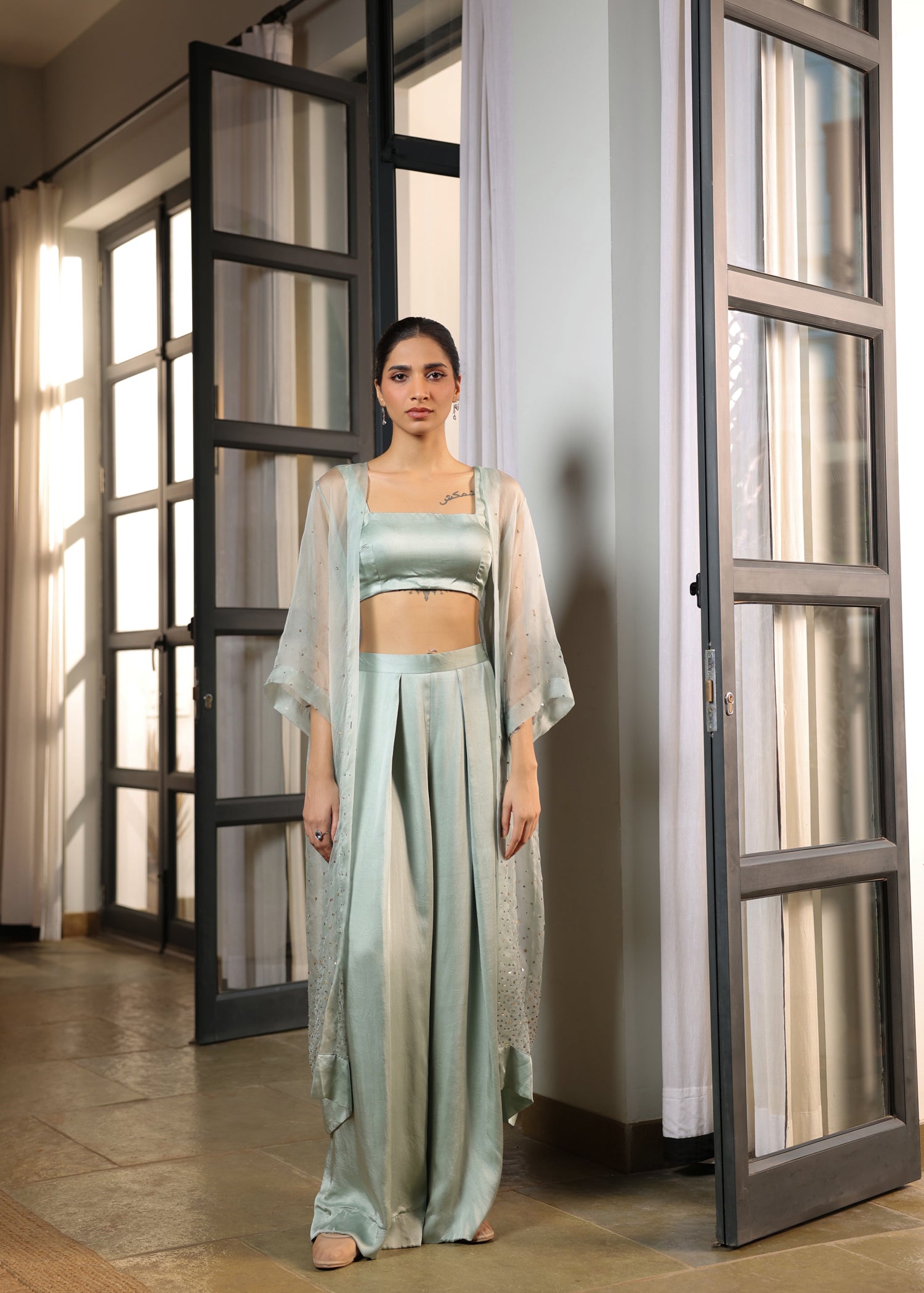 - Relaxed Fit Shrug with scattered handwork all over and modal satin facing on the hemline.