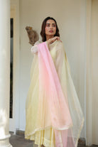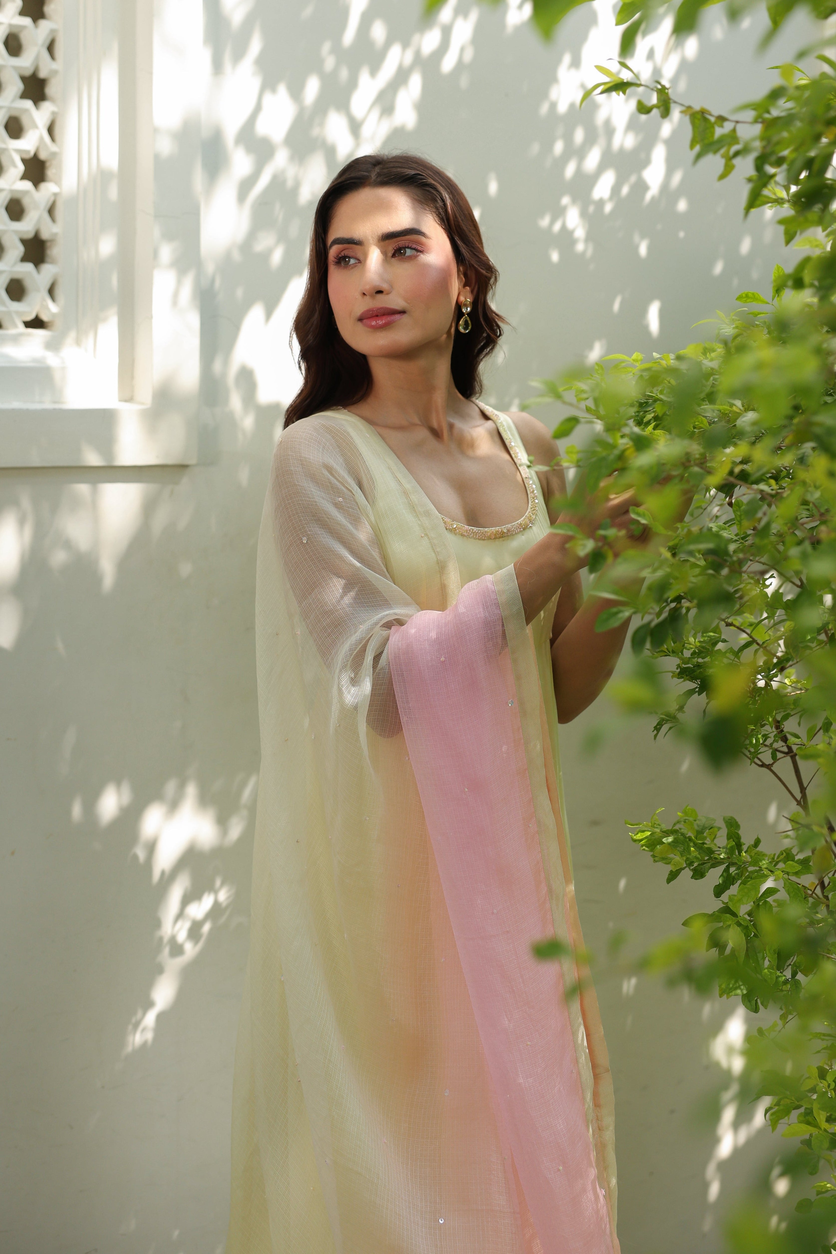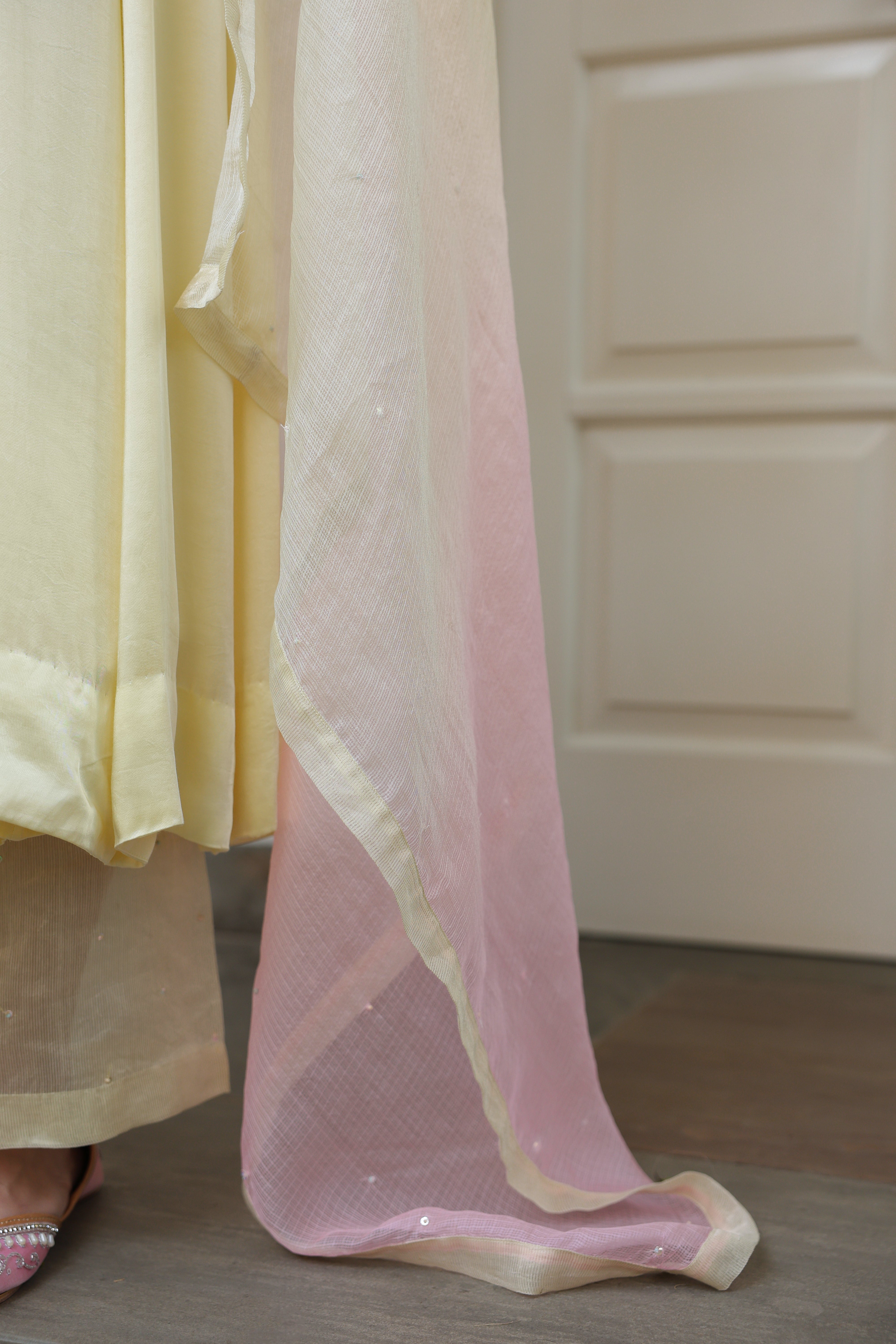 - Ombre Silk Doriya Dupatta with Chanderi facing and scattered embellishment all over.