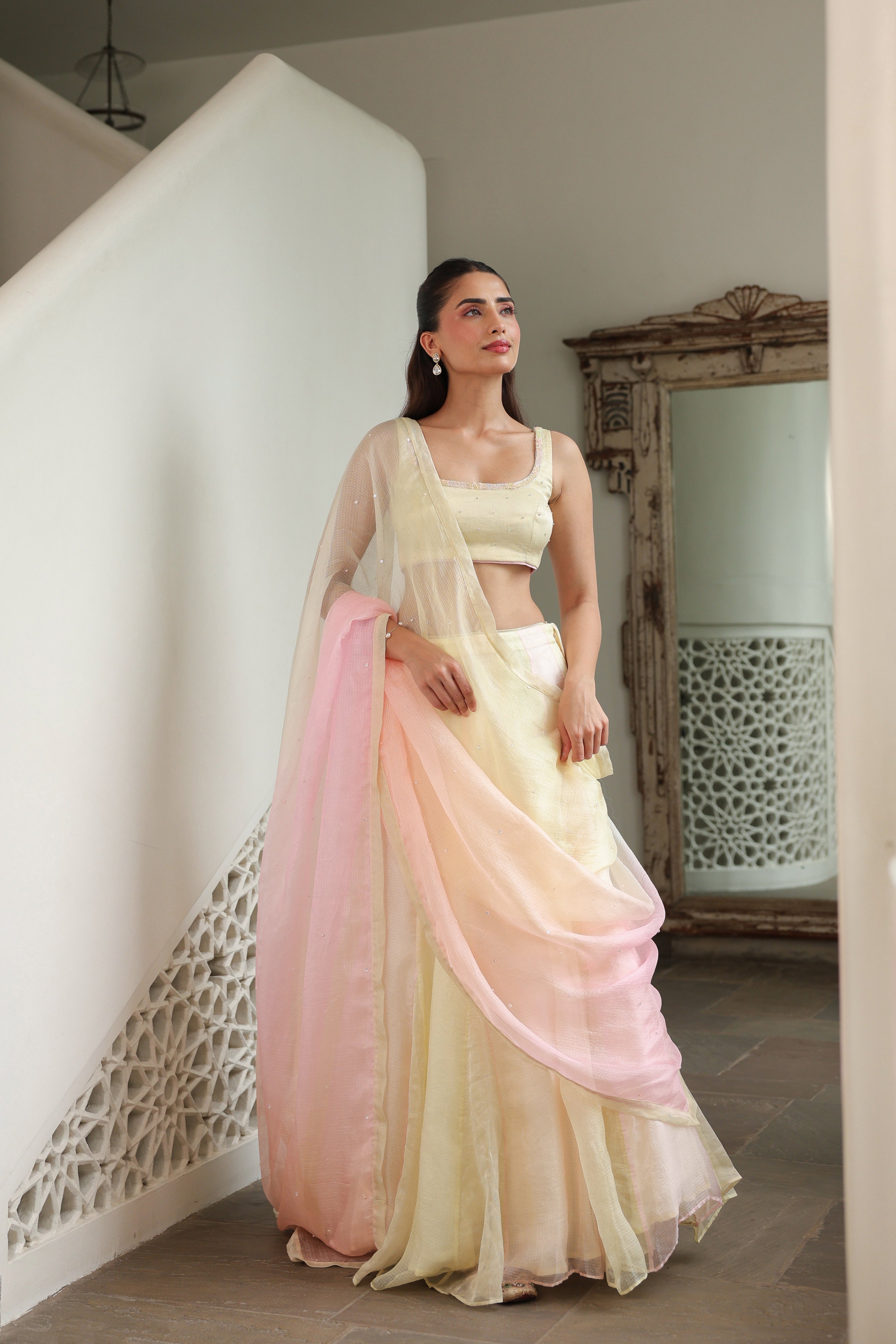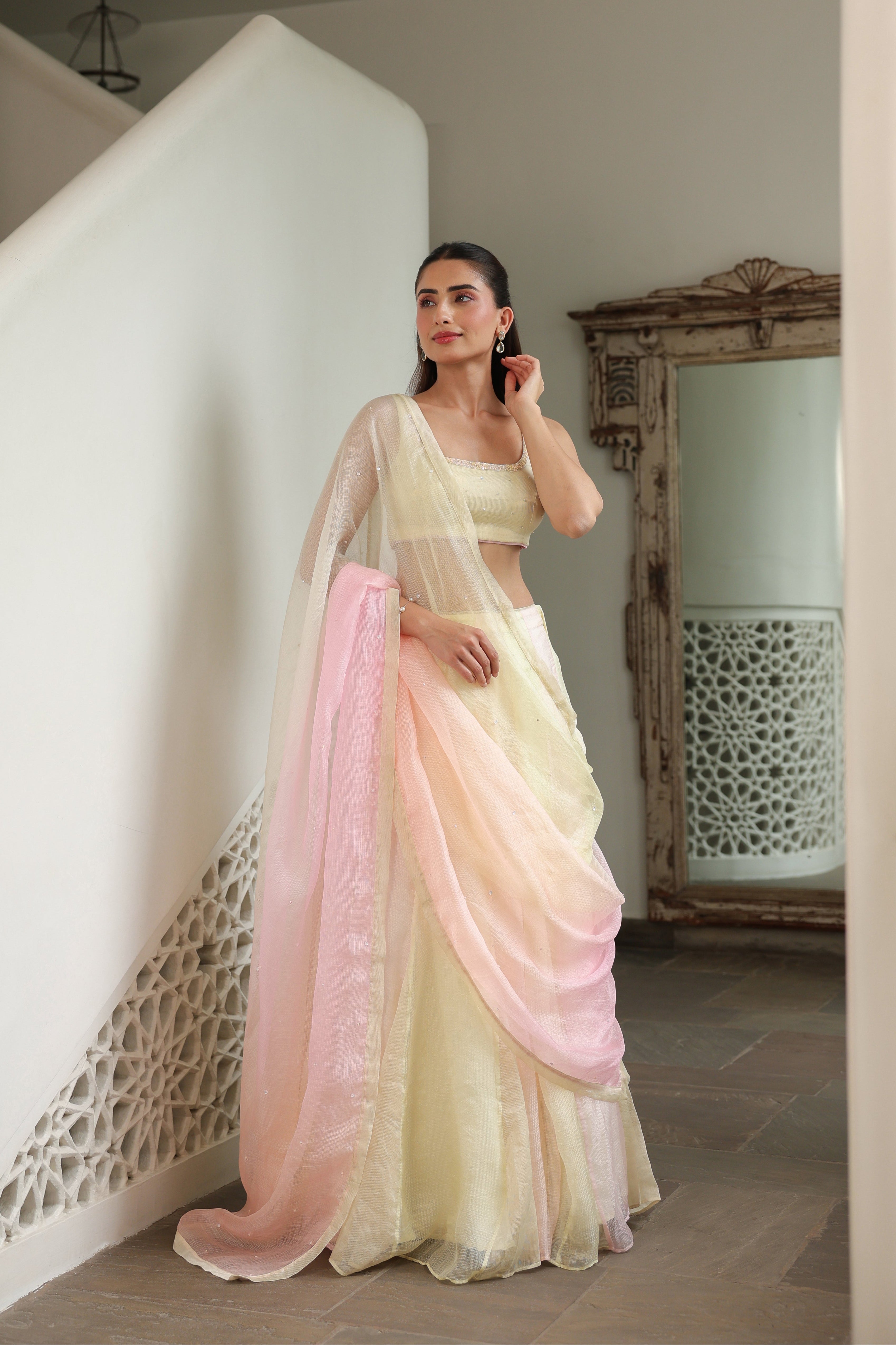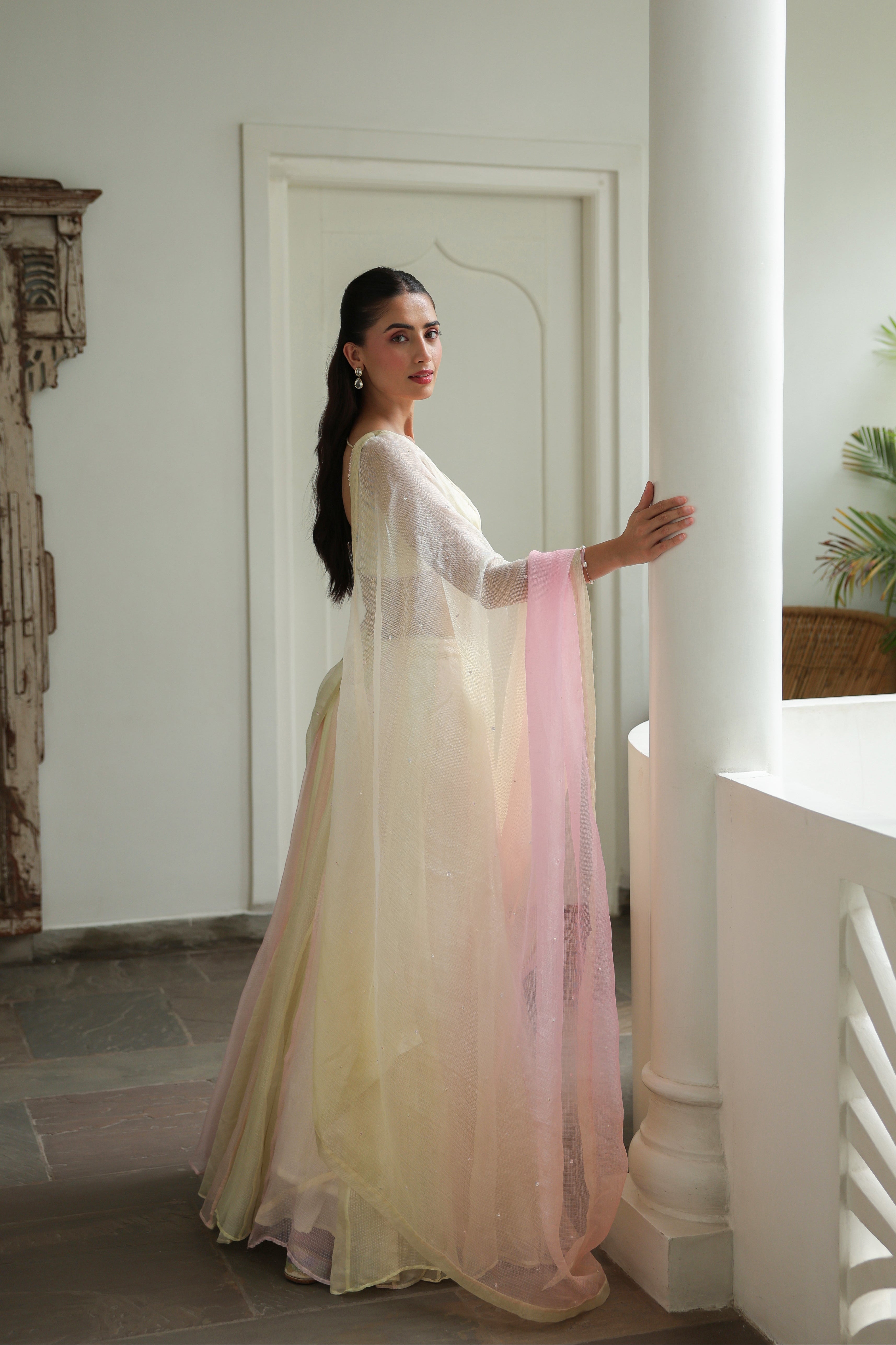 - Ombre Silk Doriya Dupatta featuring delicate scattered handwork throughout, finished with a refined chanderi facing along the borders.