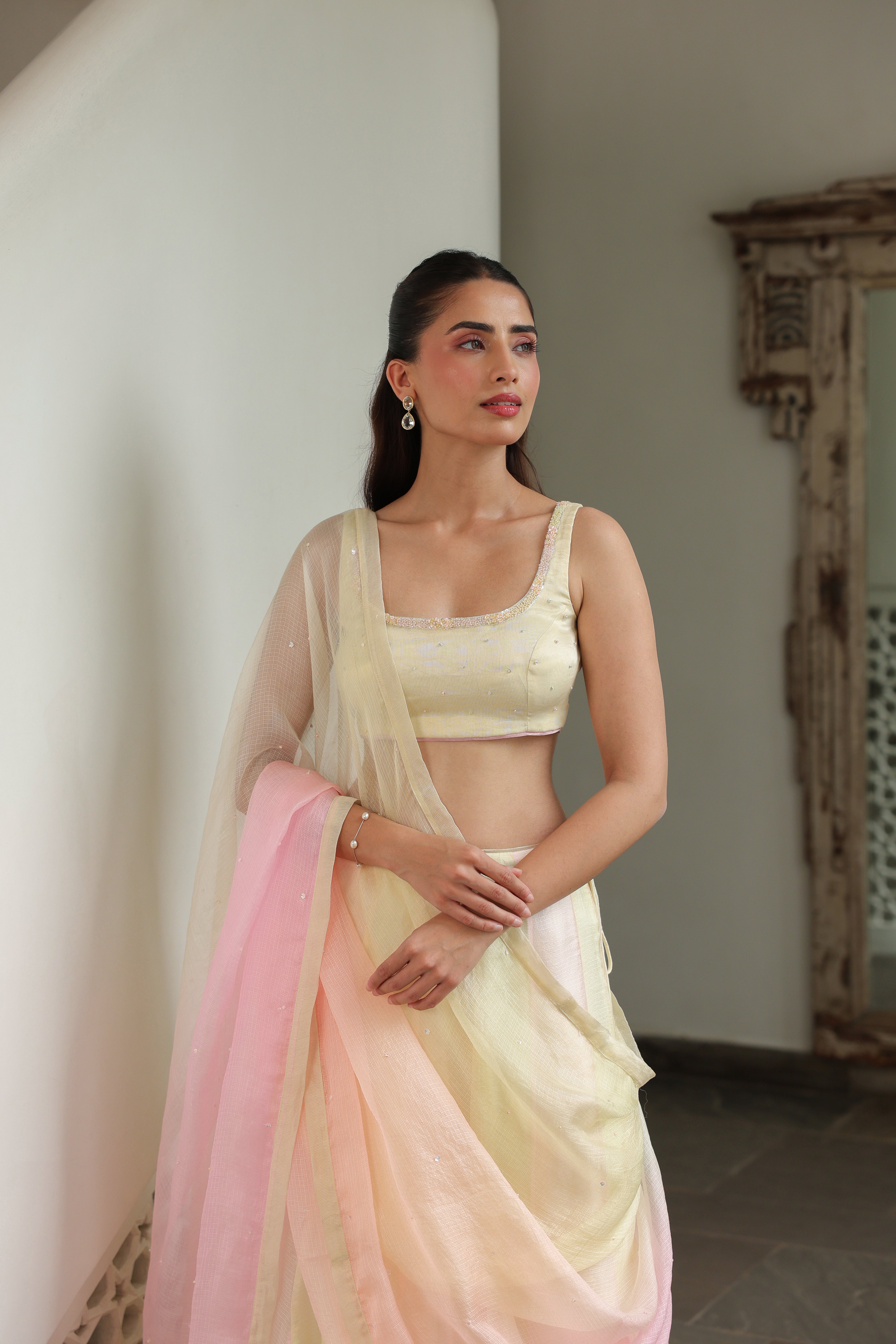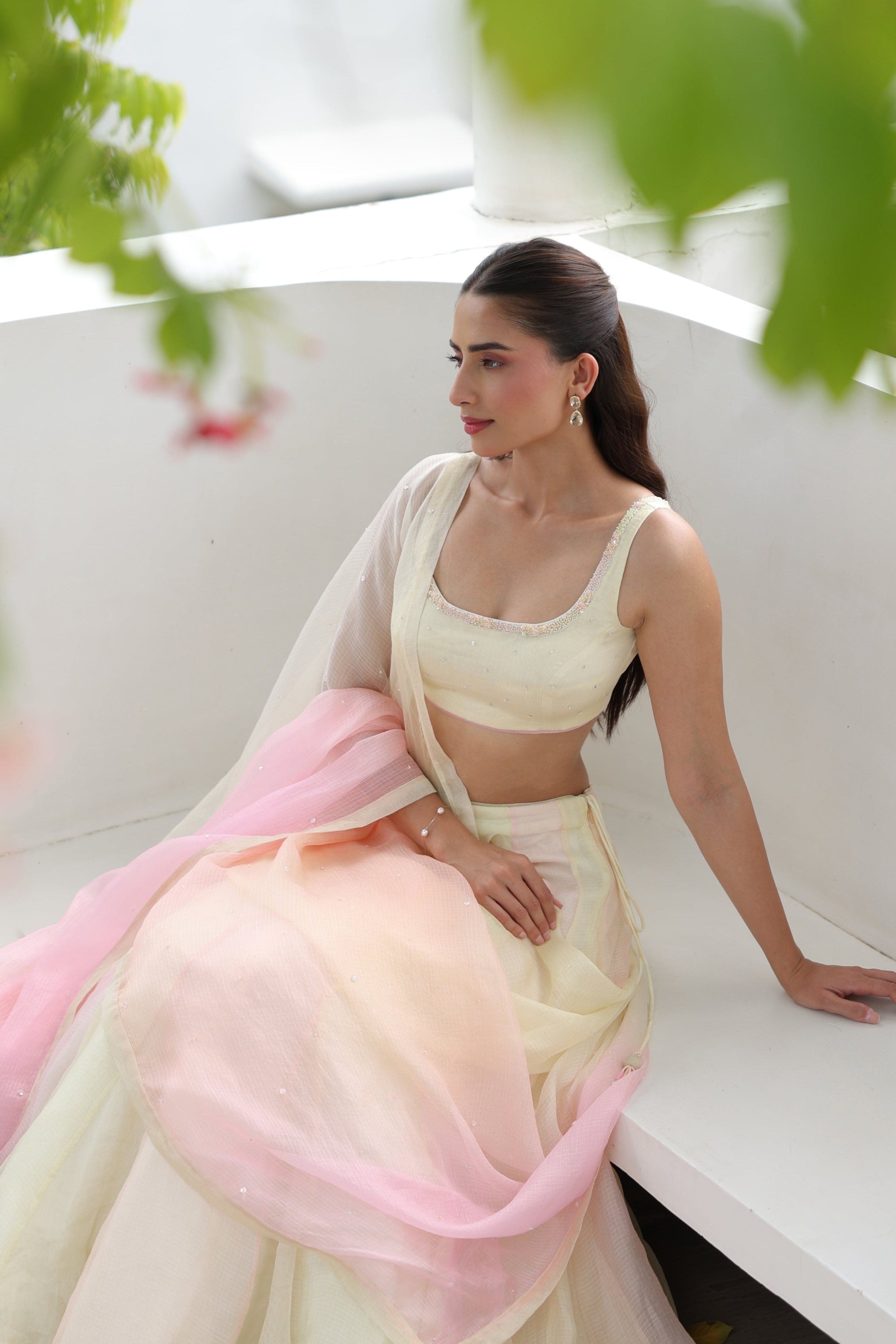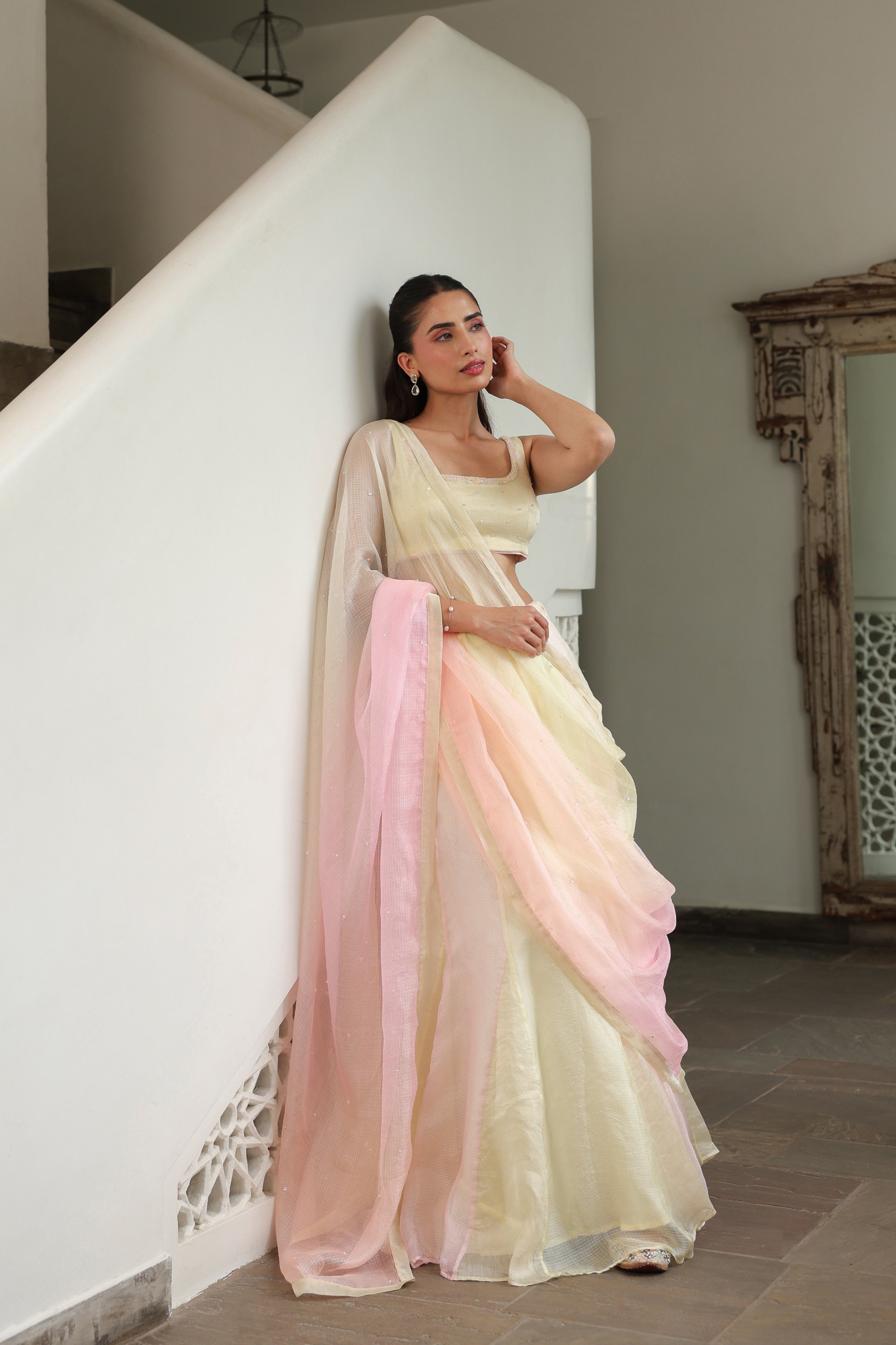 - Ombre Silk Doriya Dupatta featuring delicate scattered handwork throughout, finished with a refined chanderi facing along the borders.