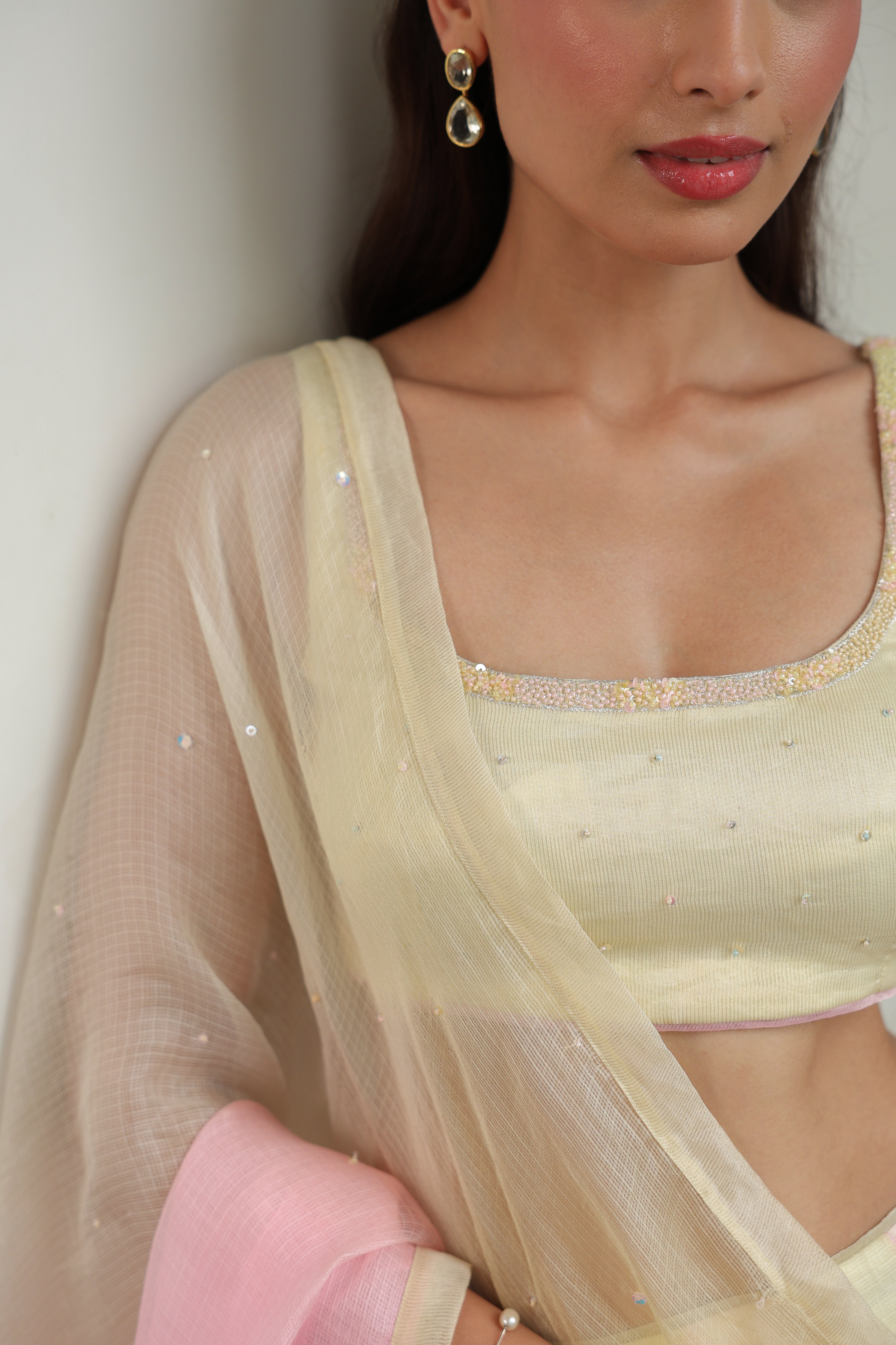 - Unstitched Blouse Fabric (1 meter) with hand embellishment on the neckline (front and back).
