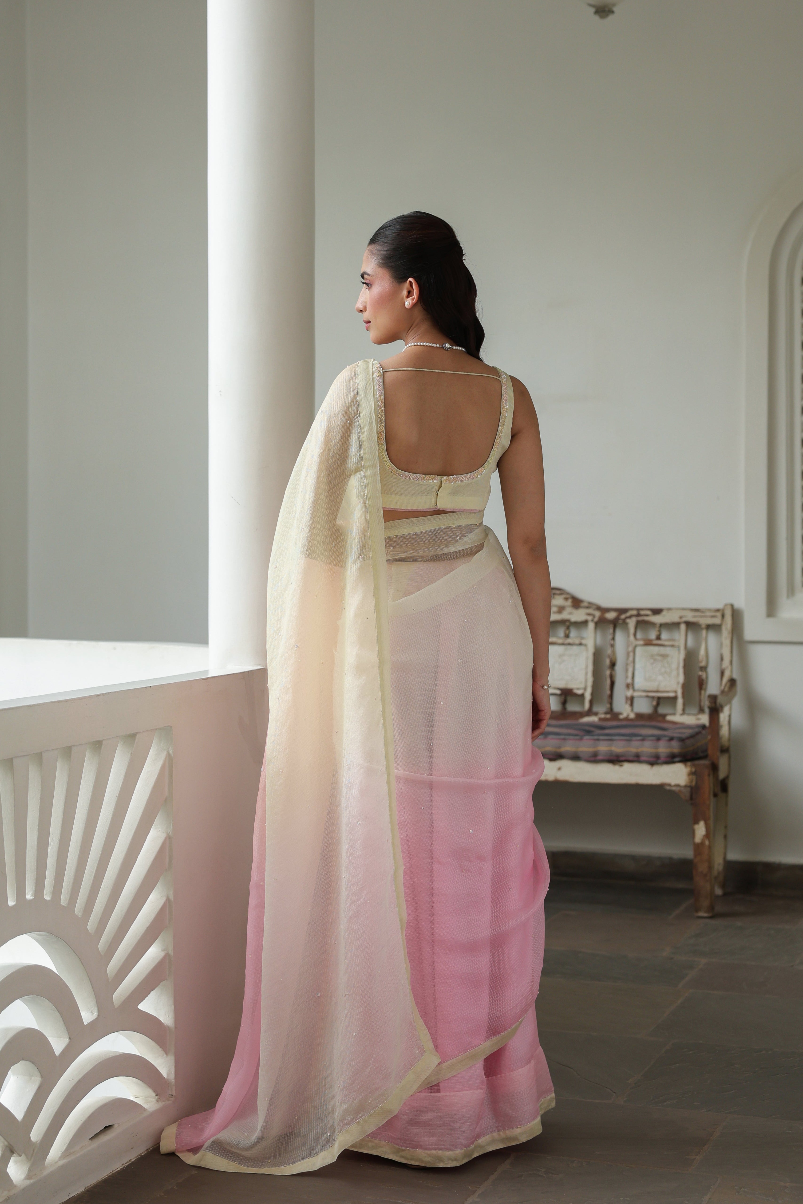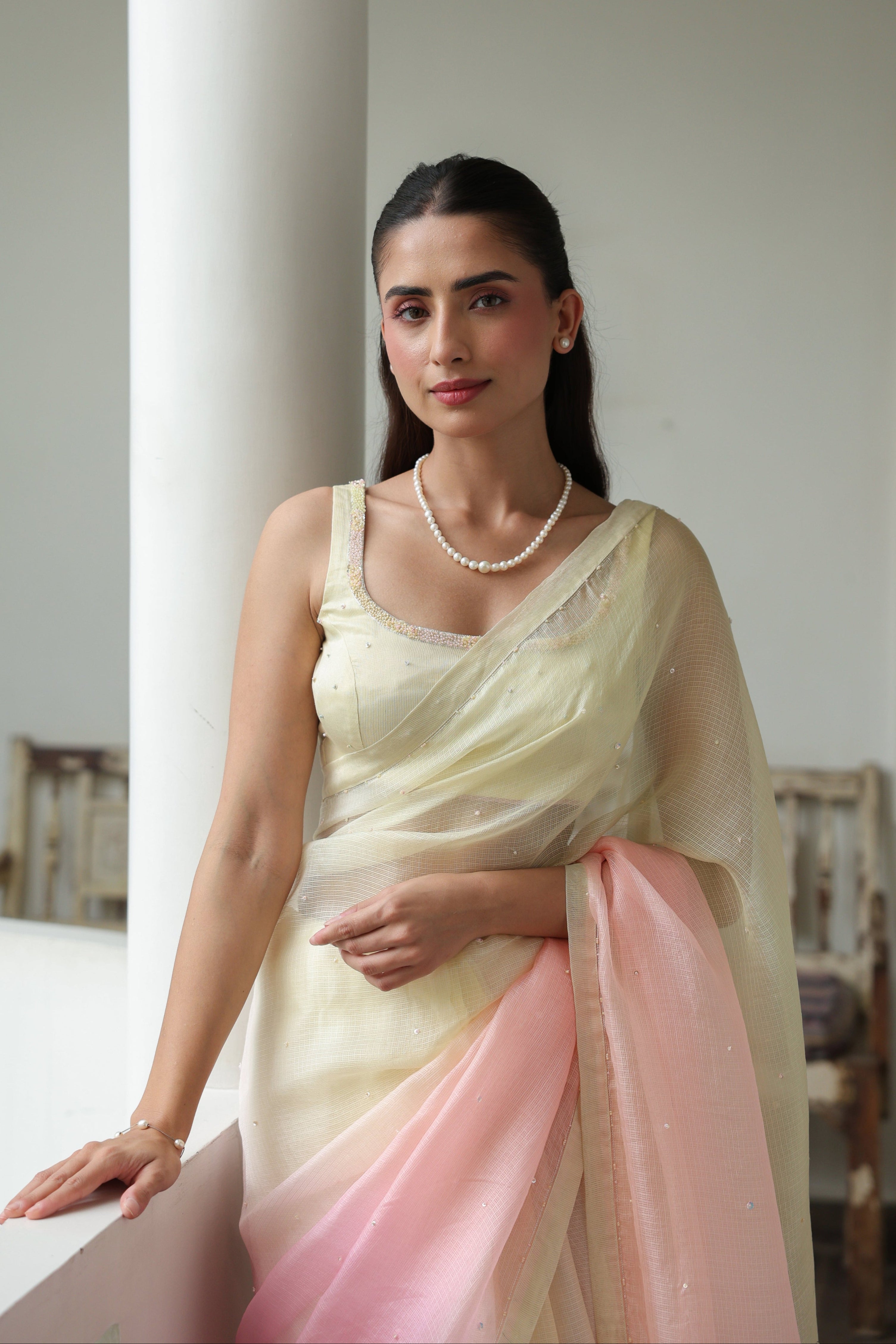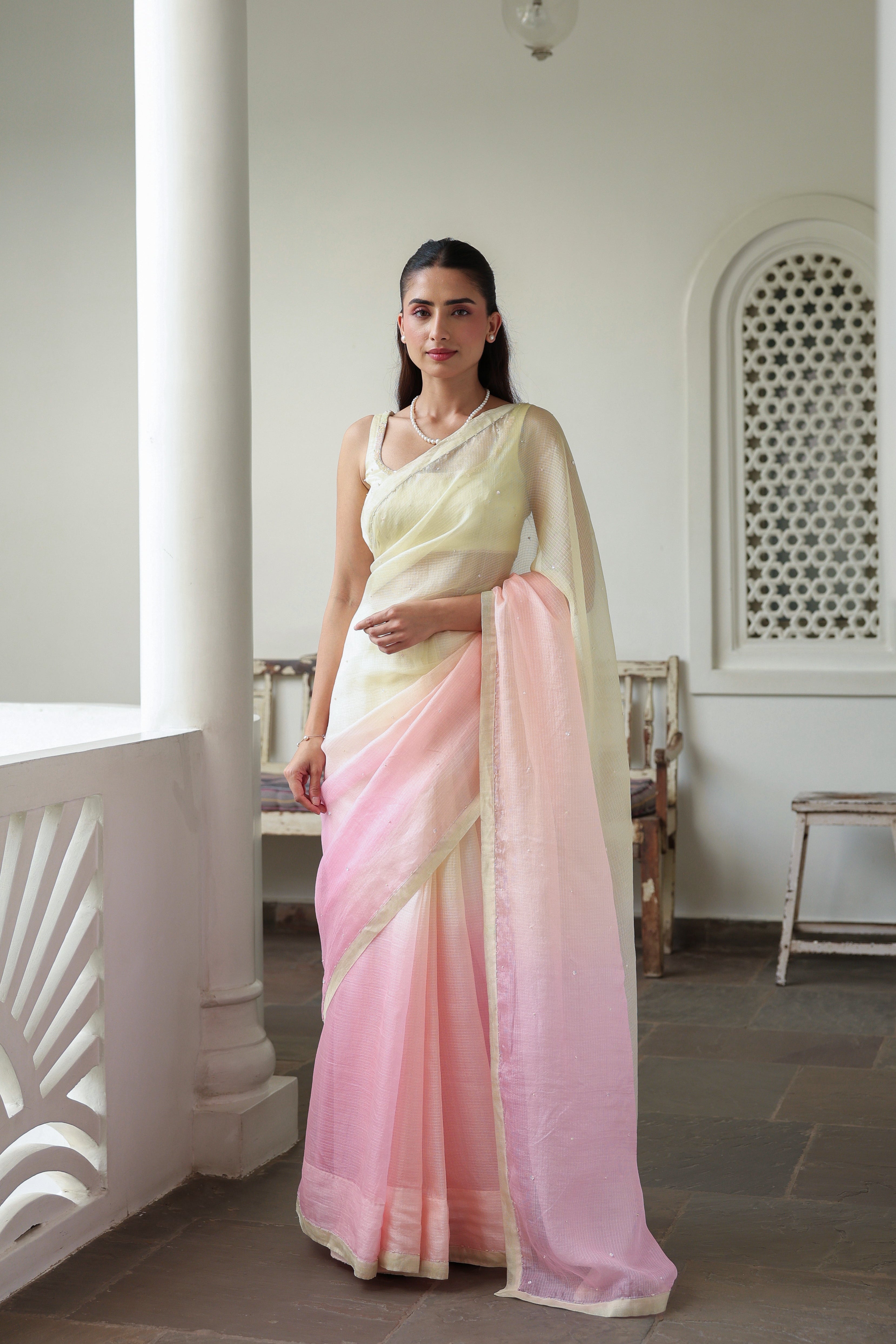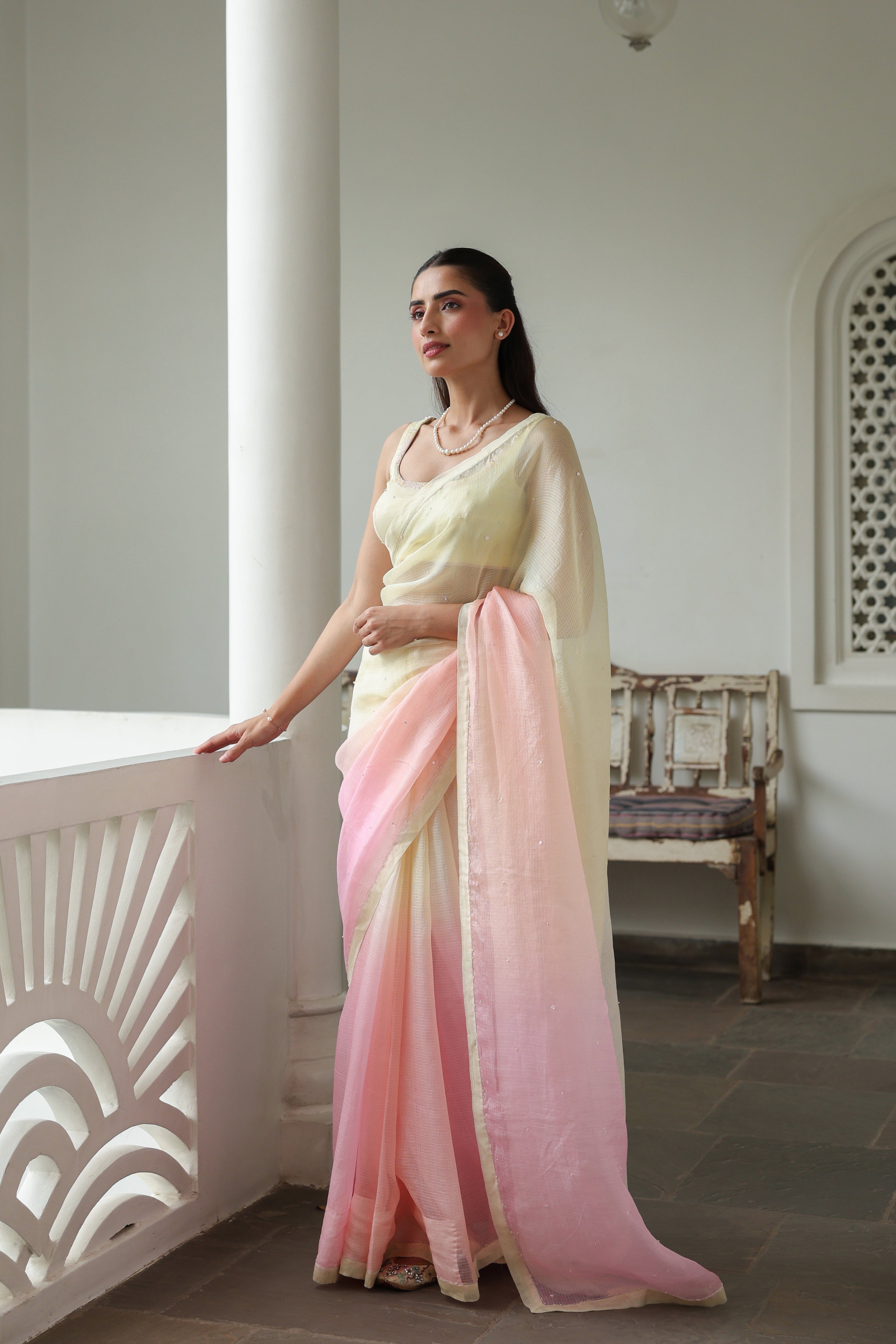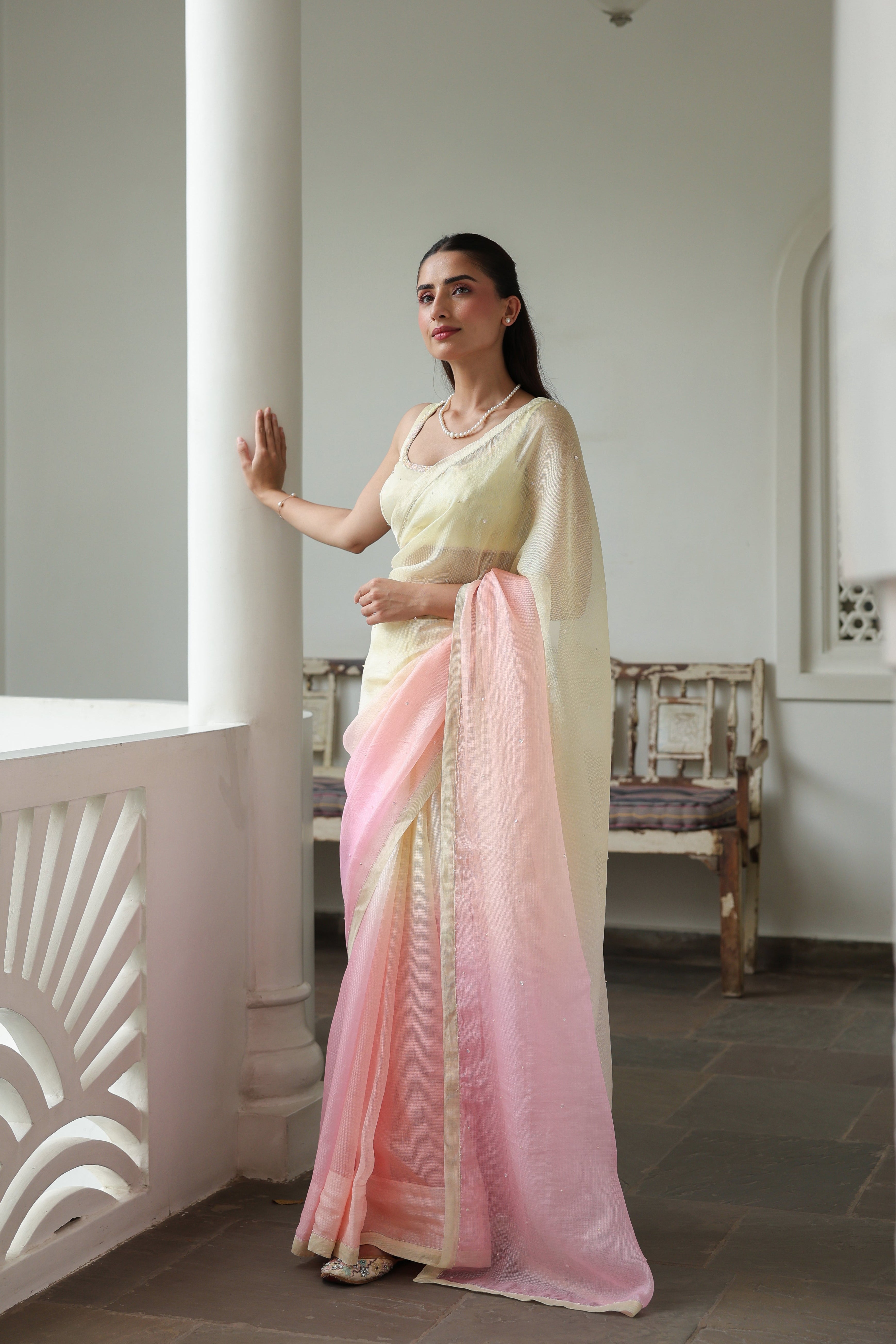 - Ombre Silk Kota Saree has scattered handwork all over and delicate border with chanderi facing on saree border.