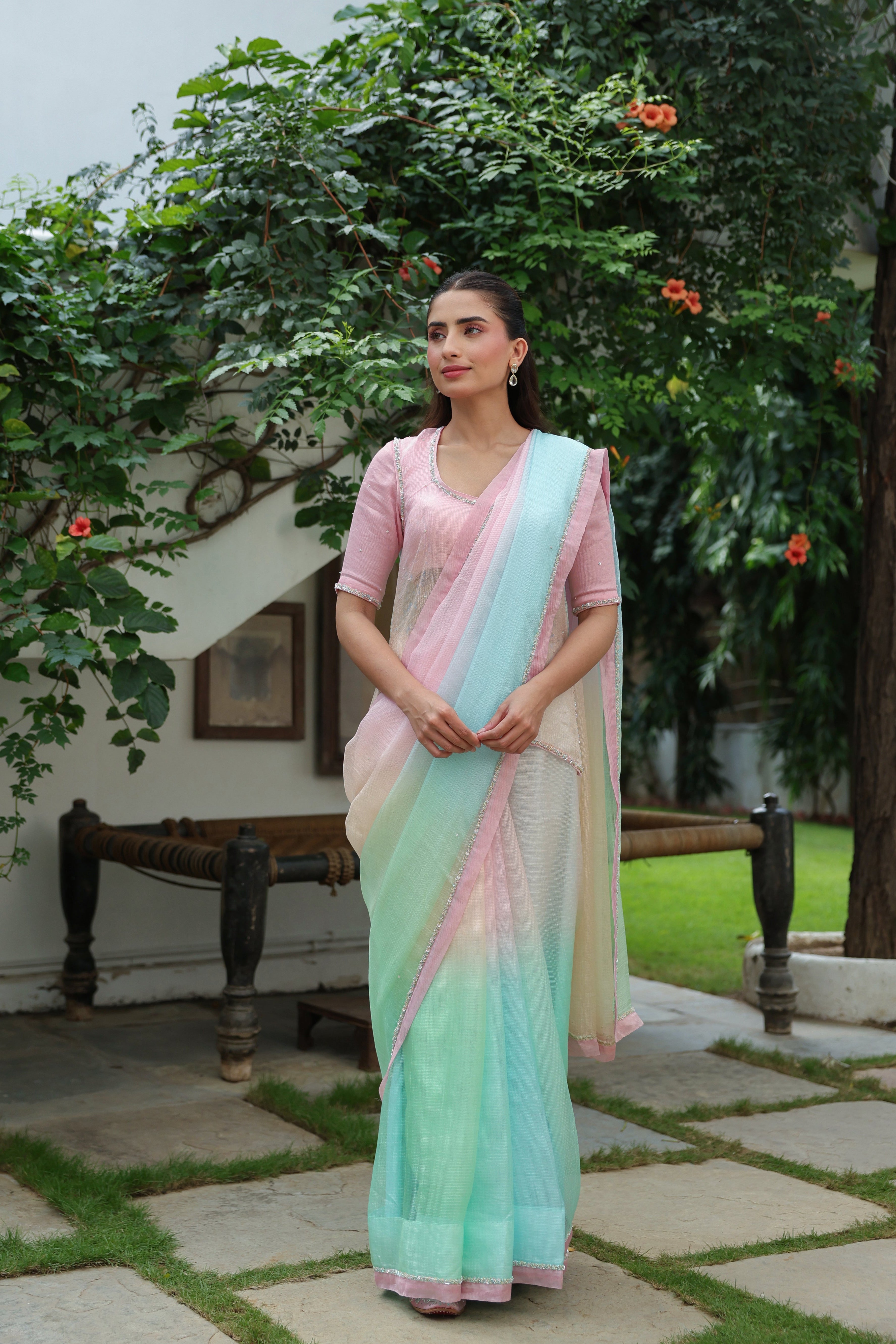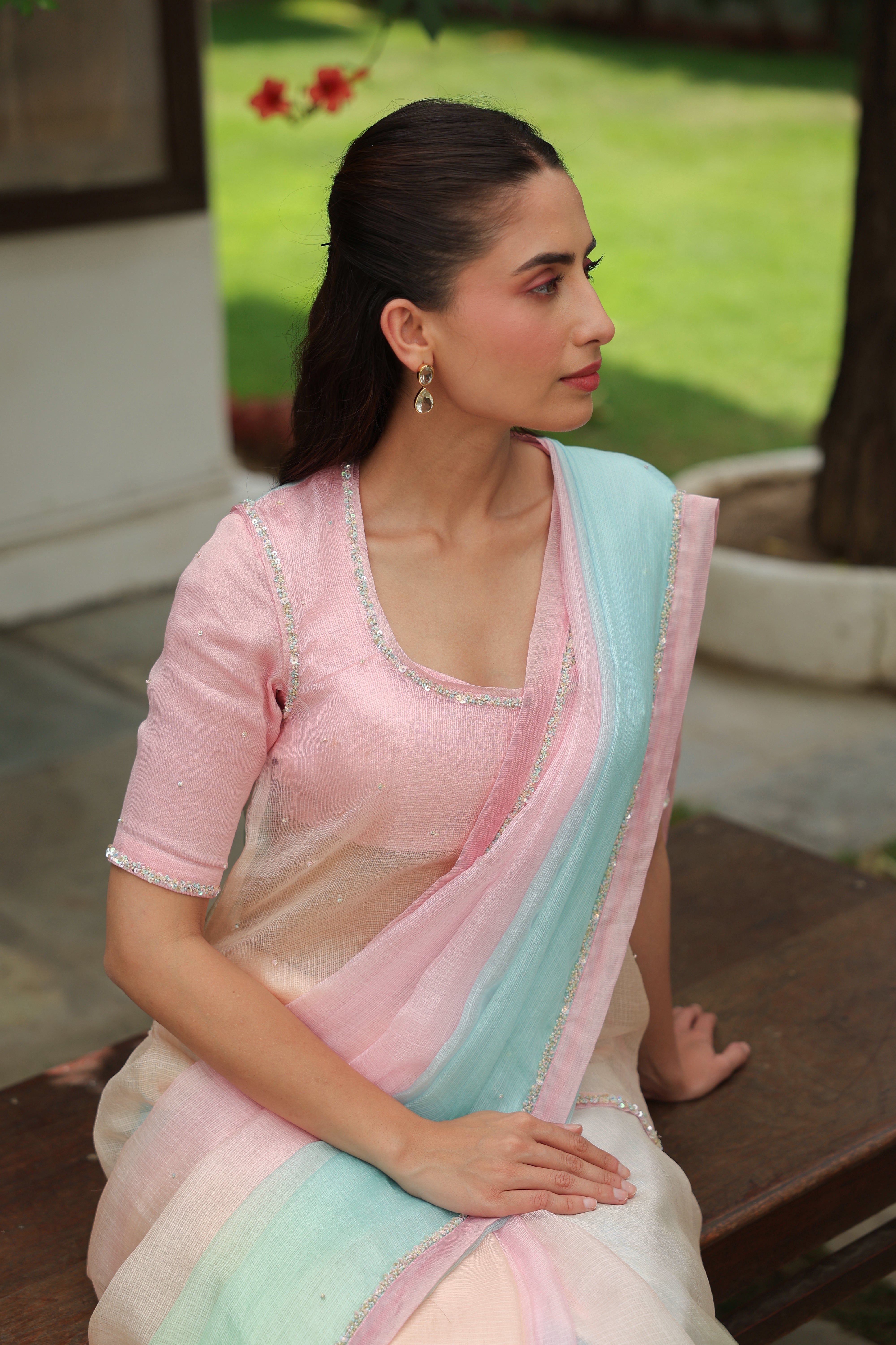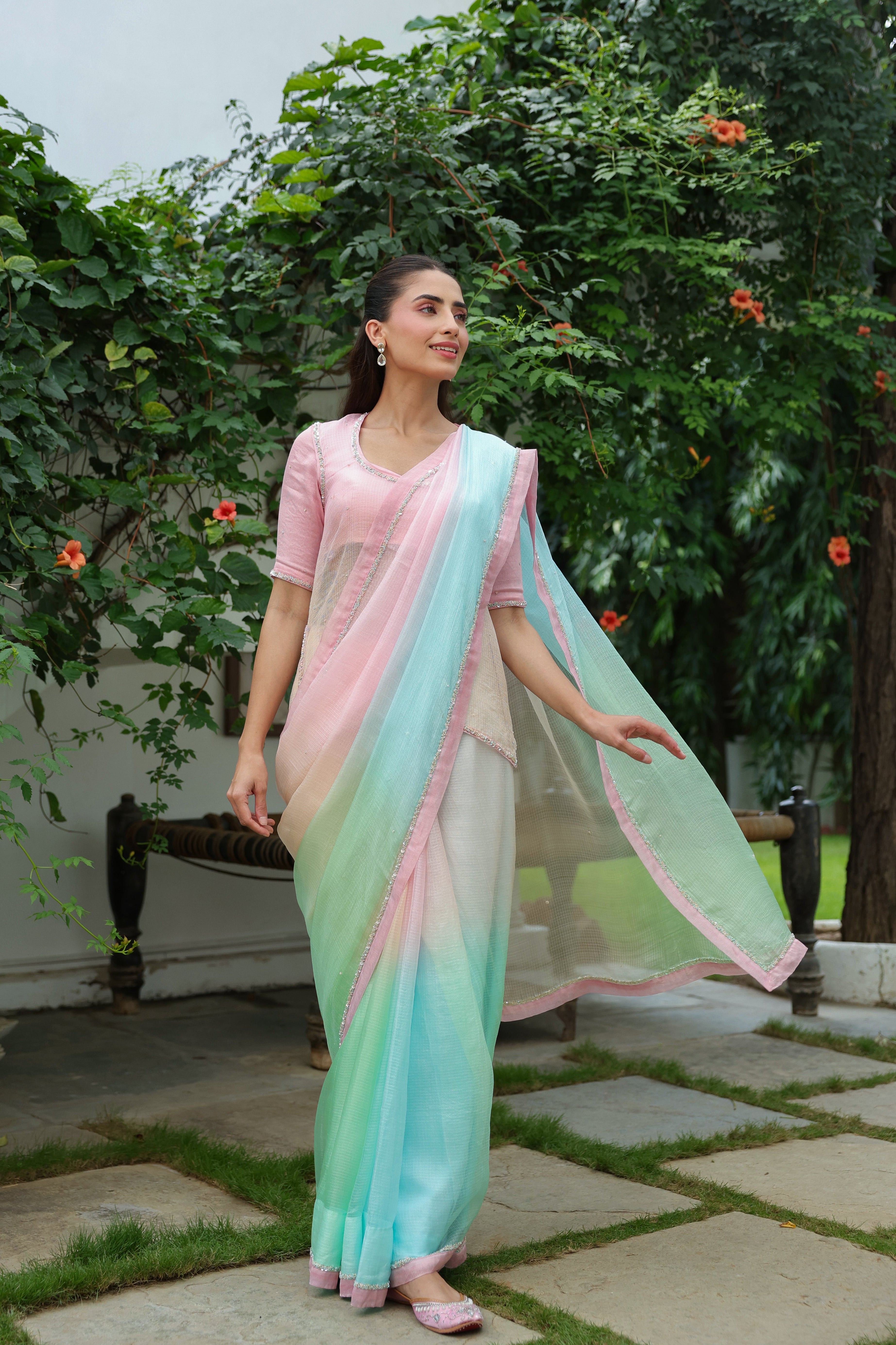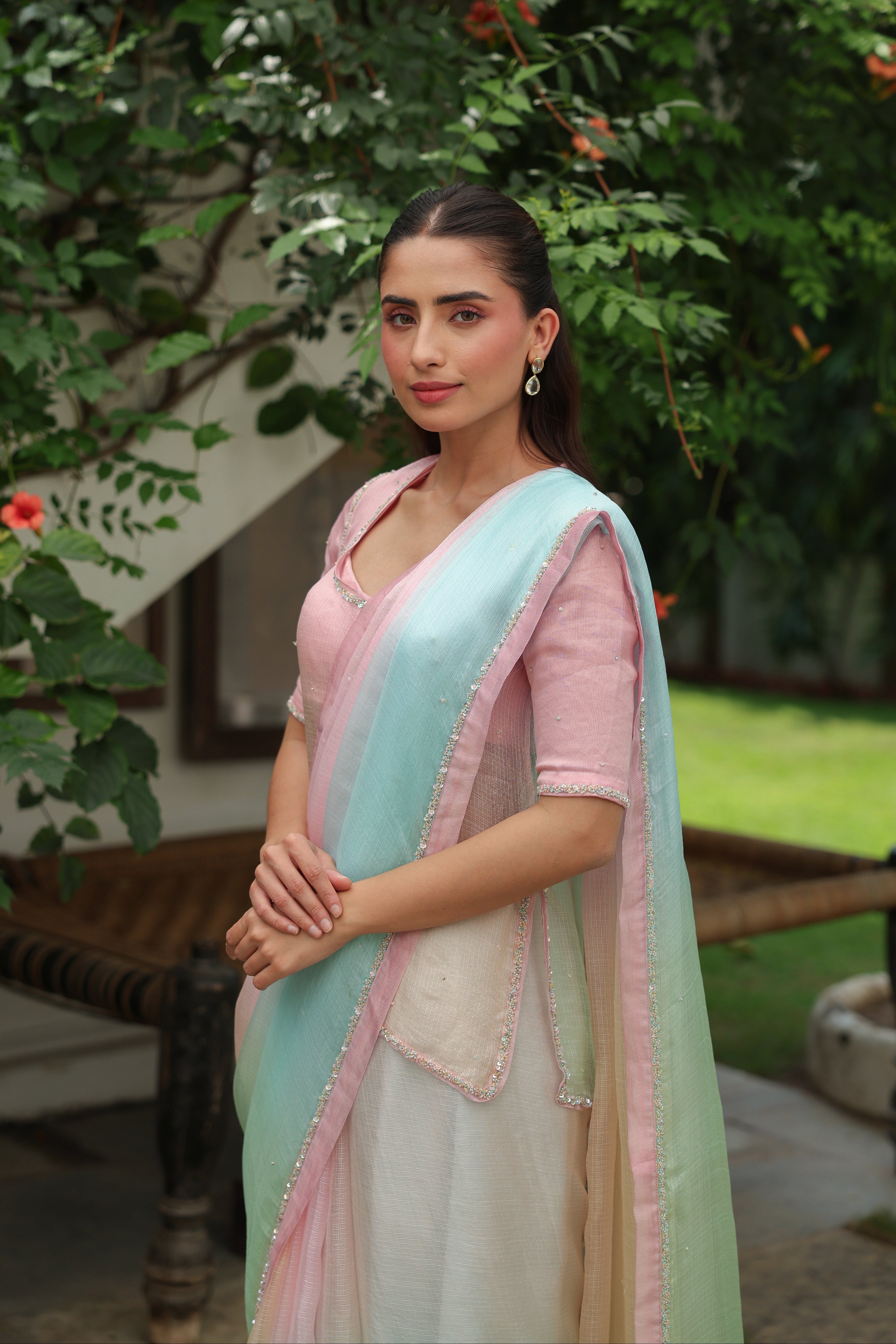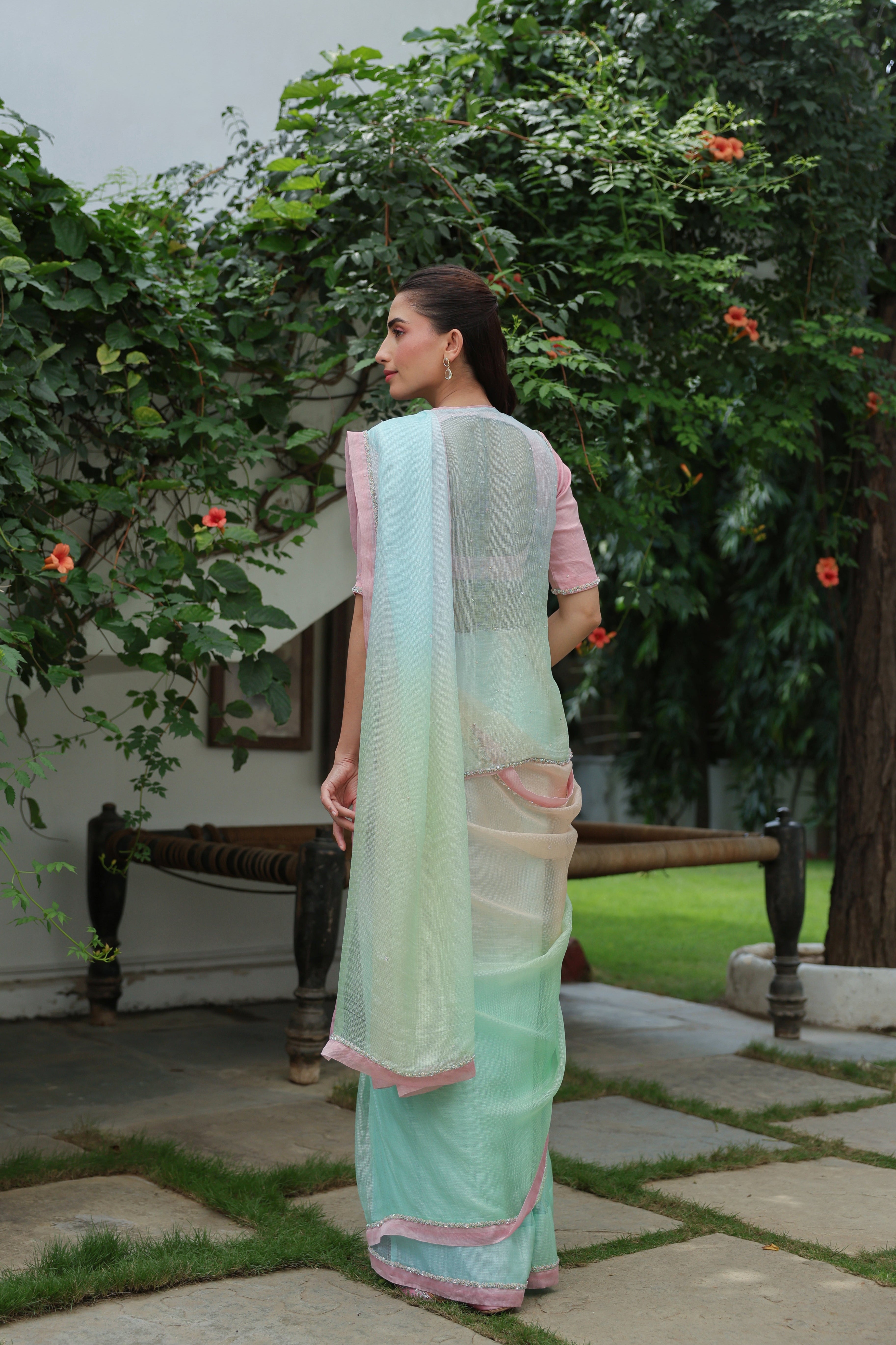 - Ombre Silk Kota Saree has scattered handwork all over and delicate sequins-beads border with chanderi facing on saree border.
