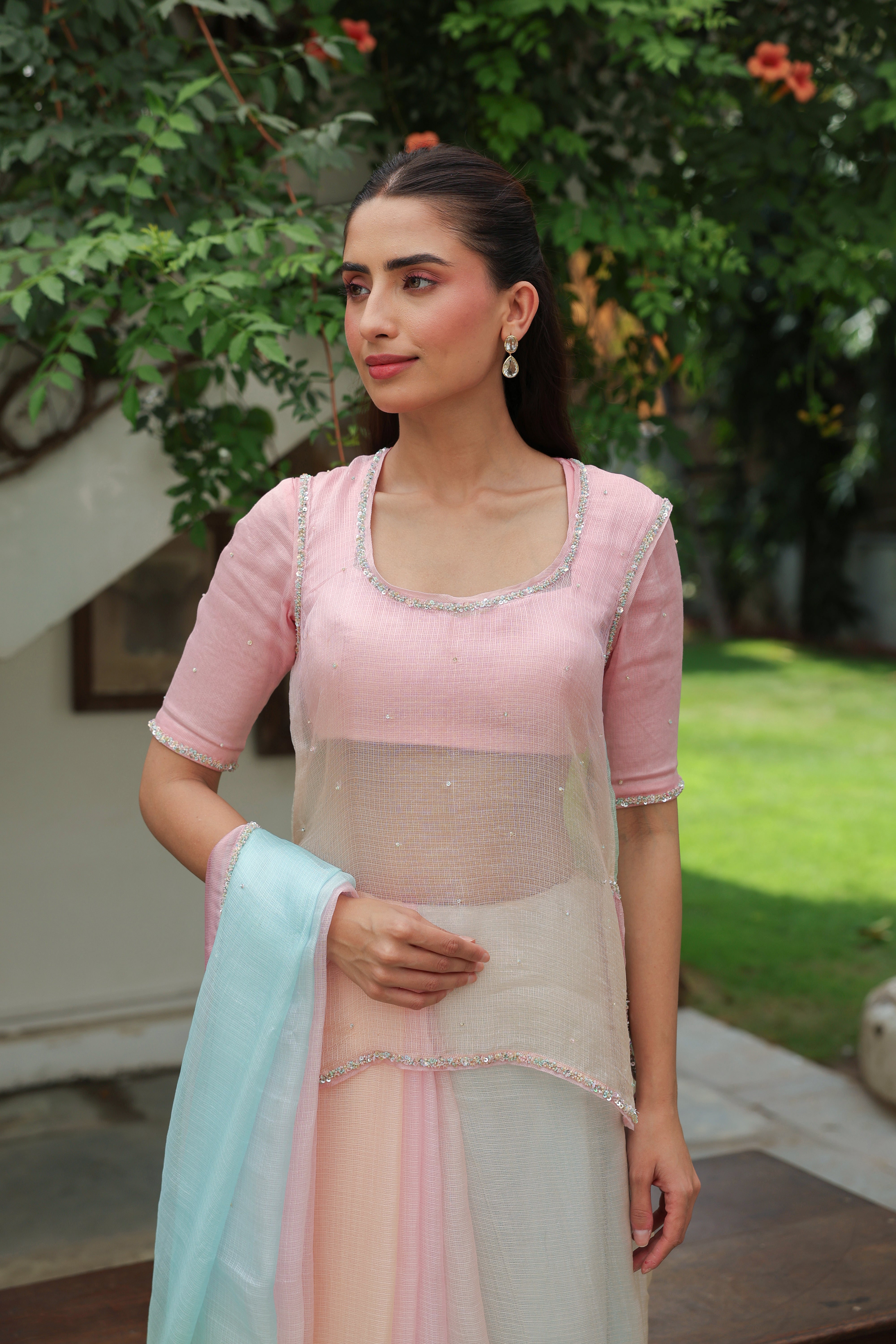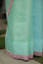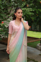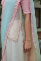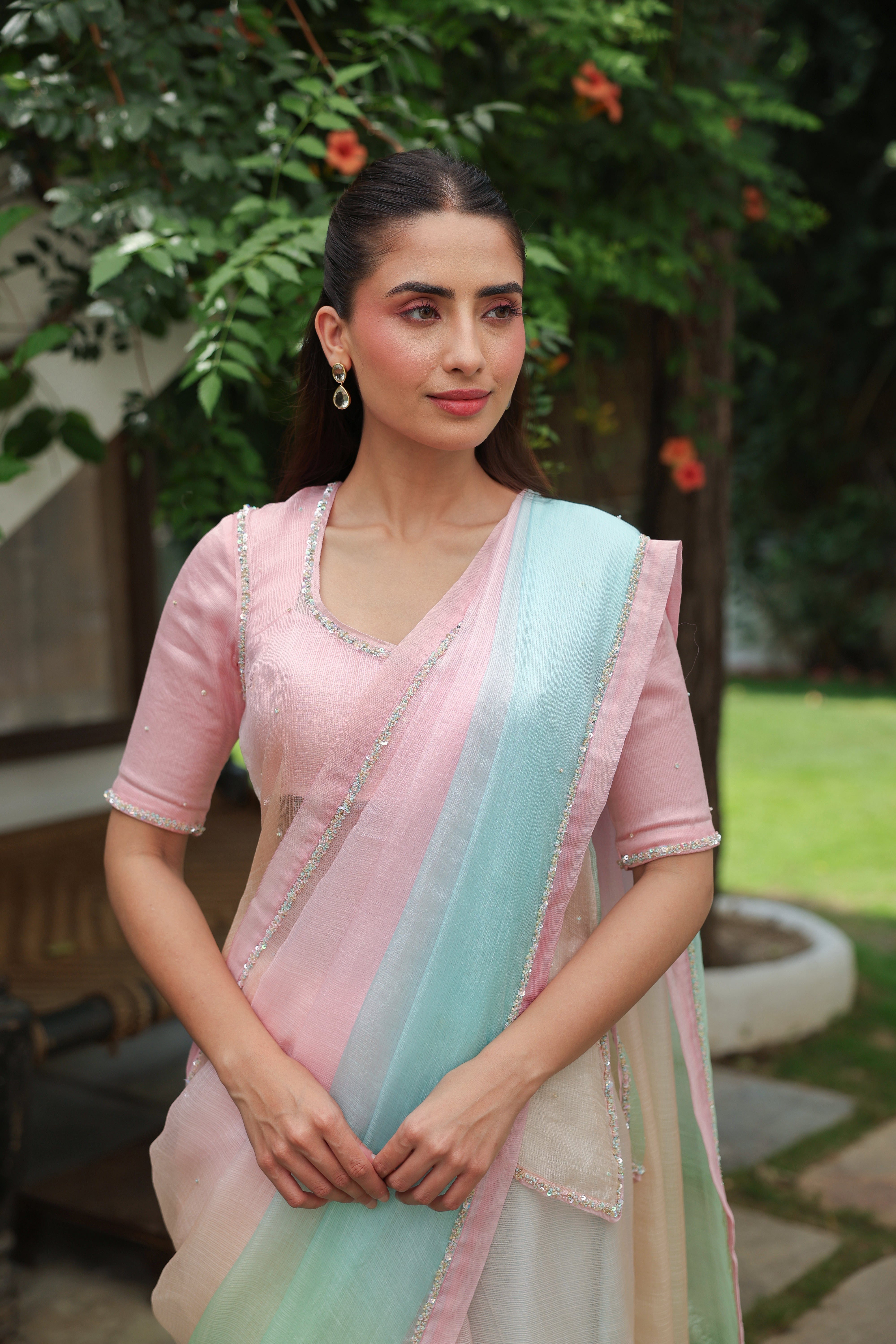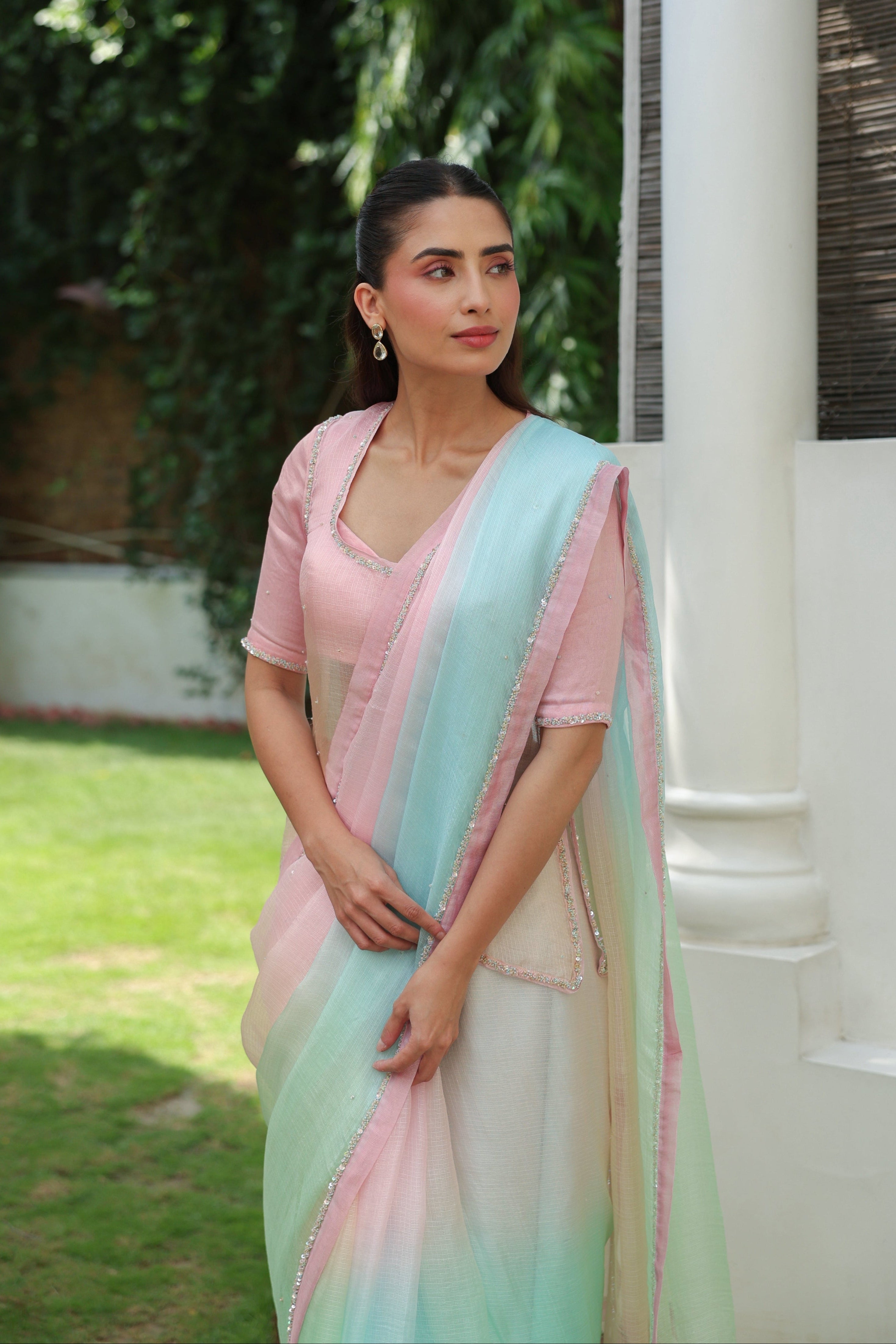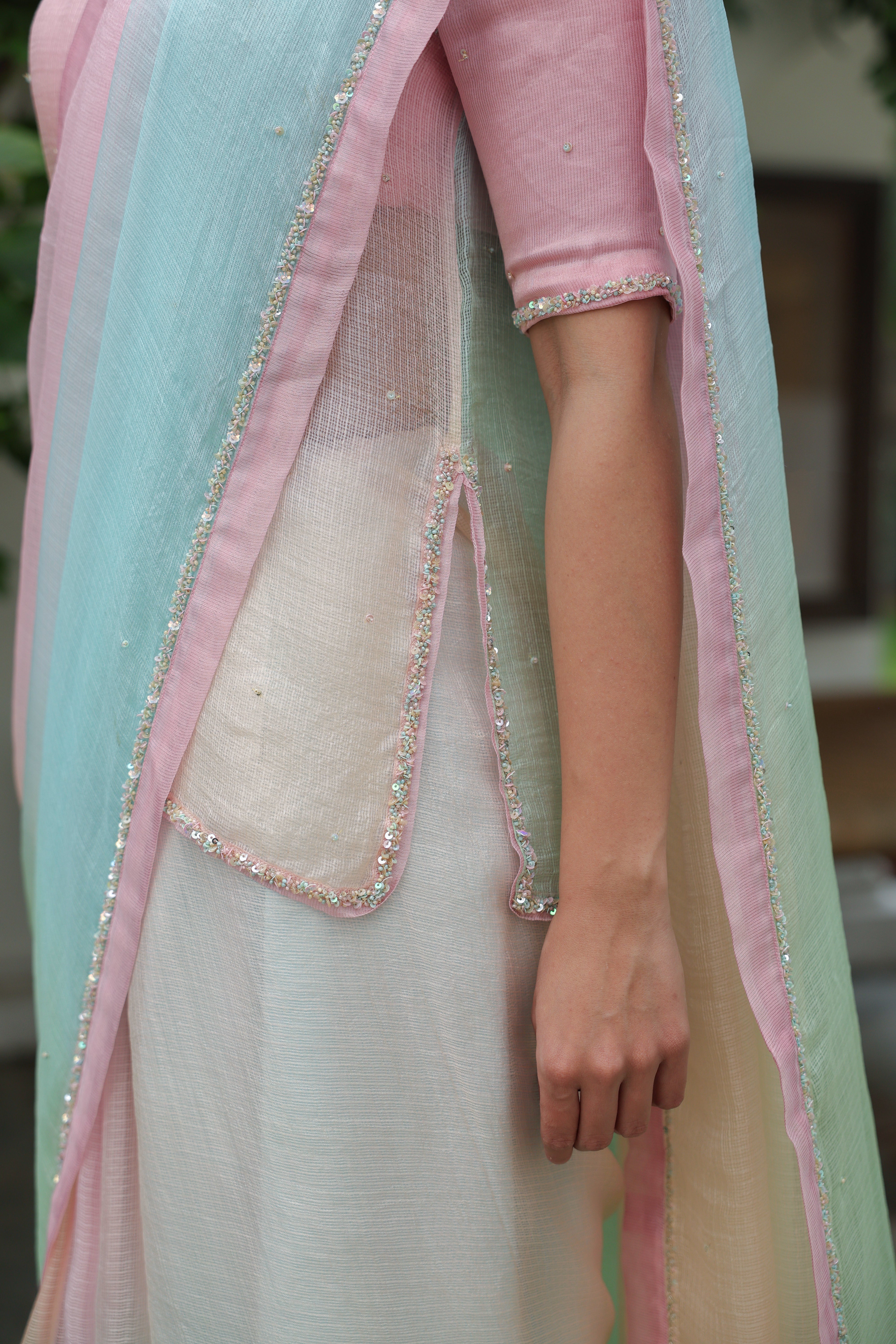 - Ombre Silk Kota Saree has scattered handwork all over and delicate sequins-beads border with chanderi facing on saree border.