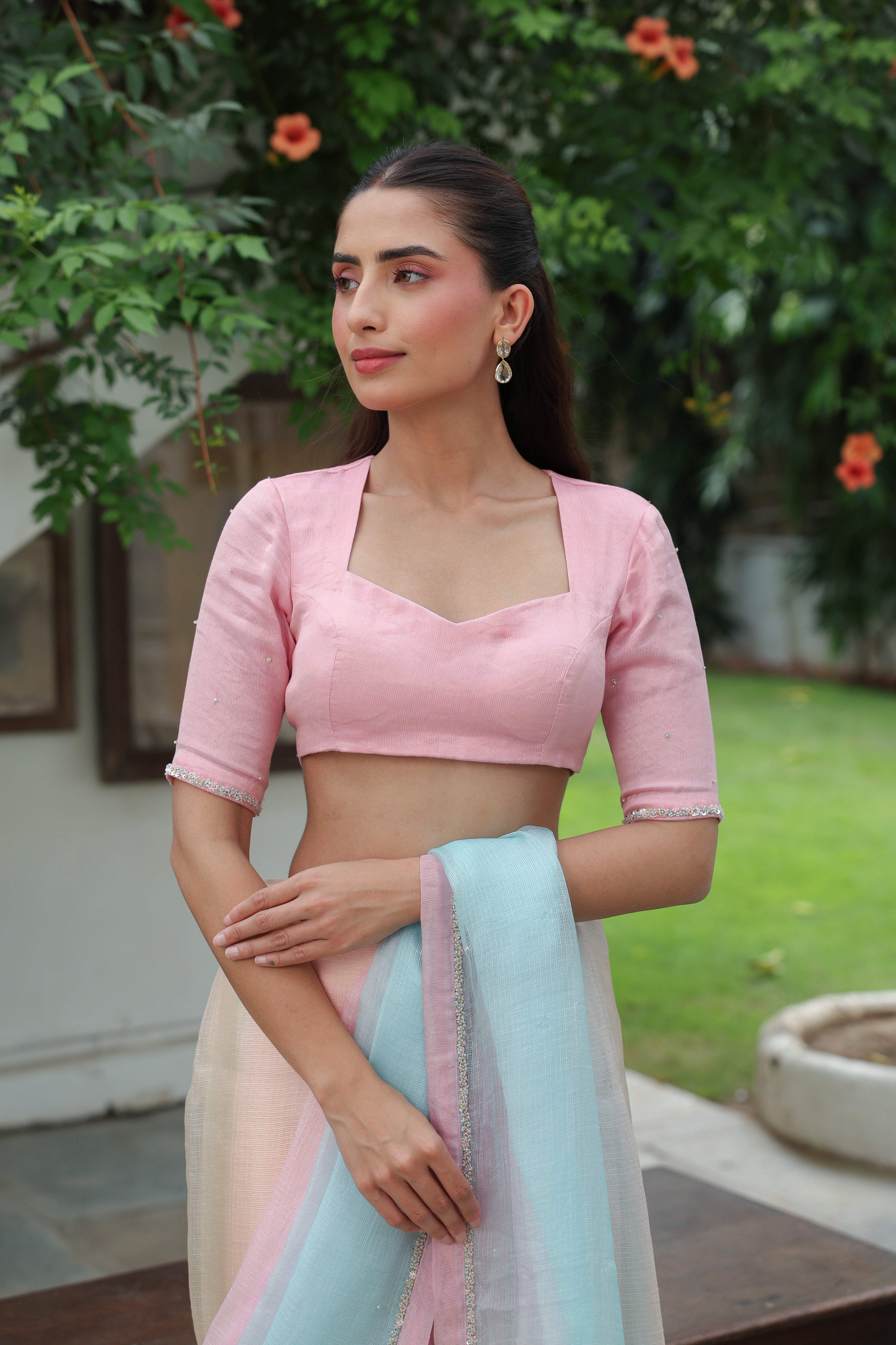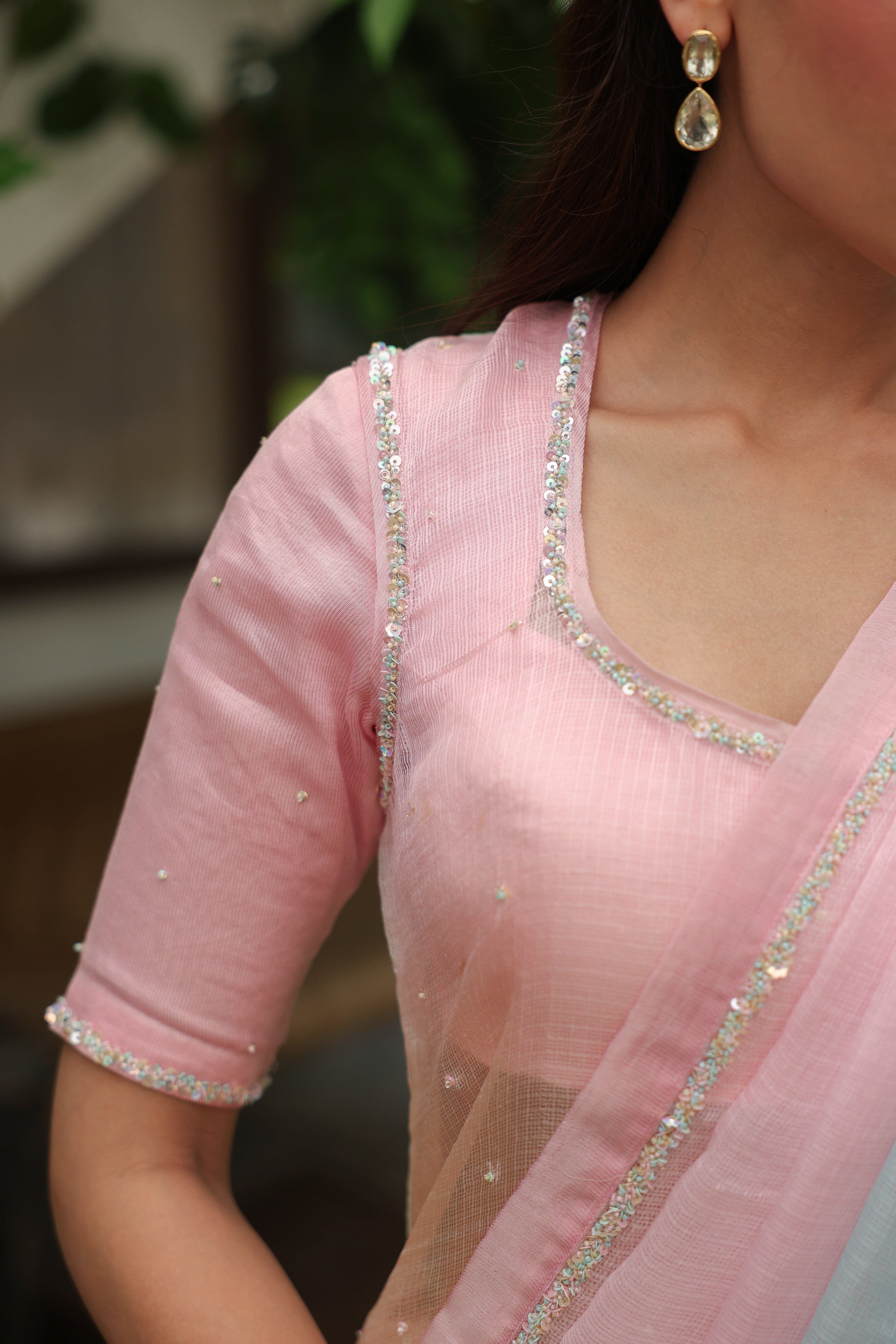- Unstitched Chanderi Blouse fabric (1 Meters) with hand embellishment on sleeves.