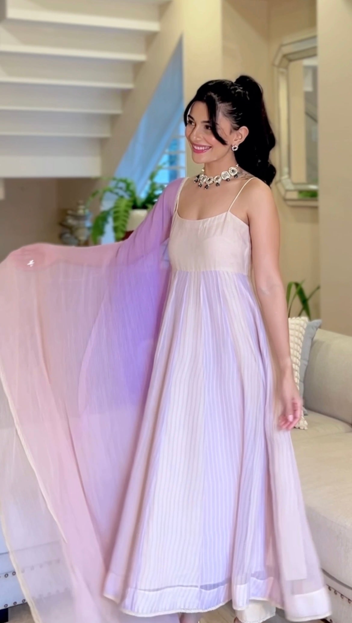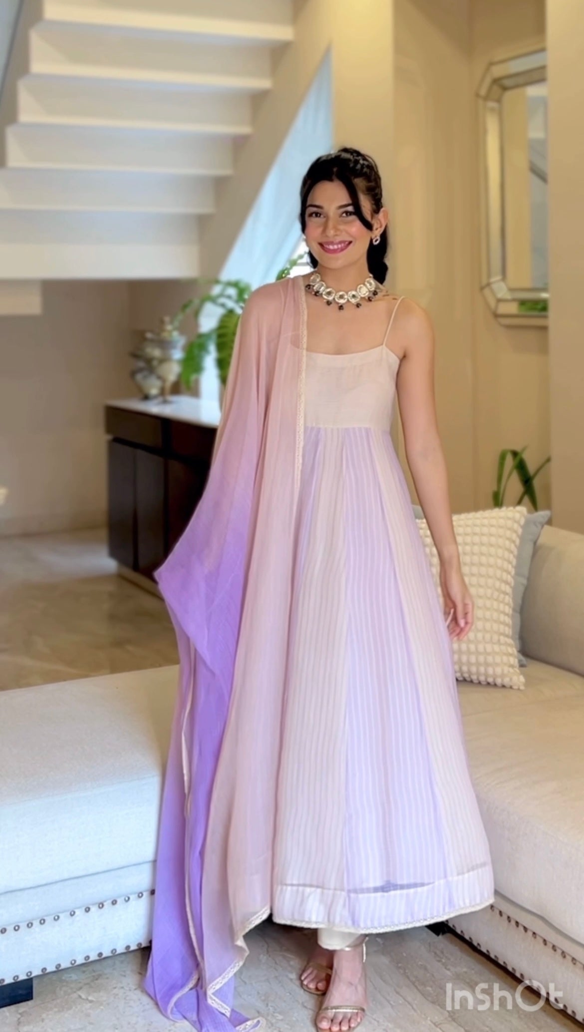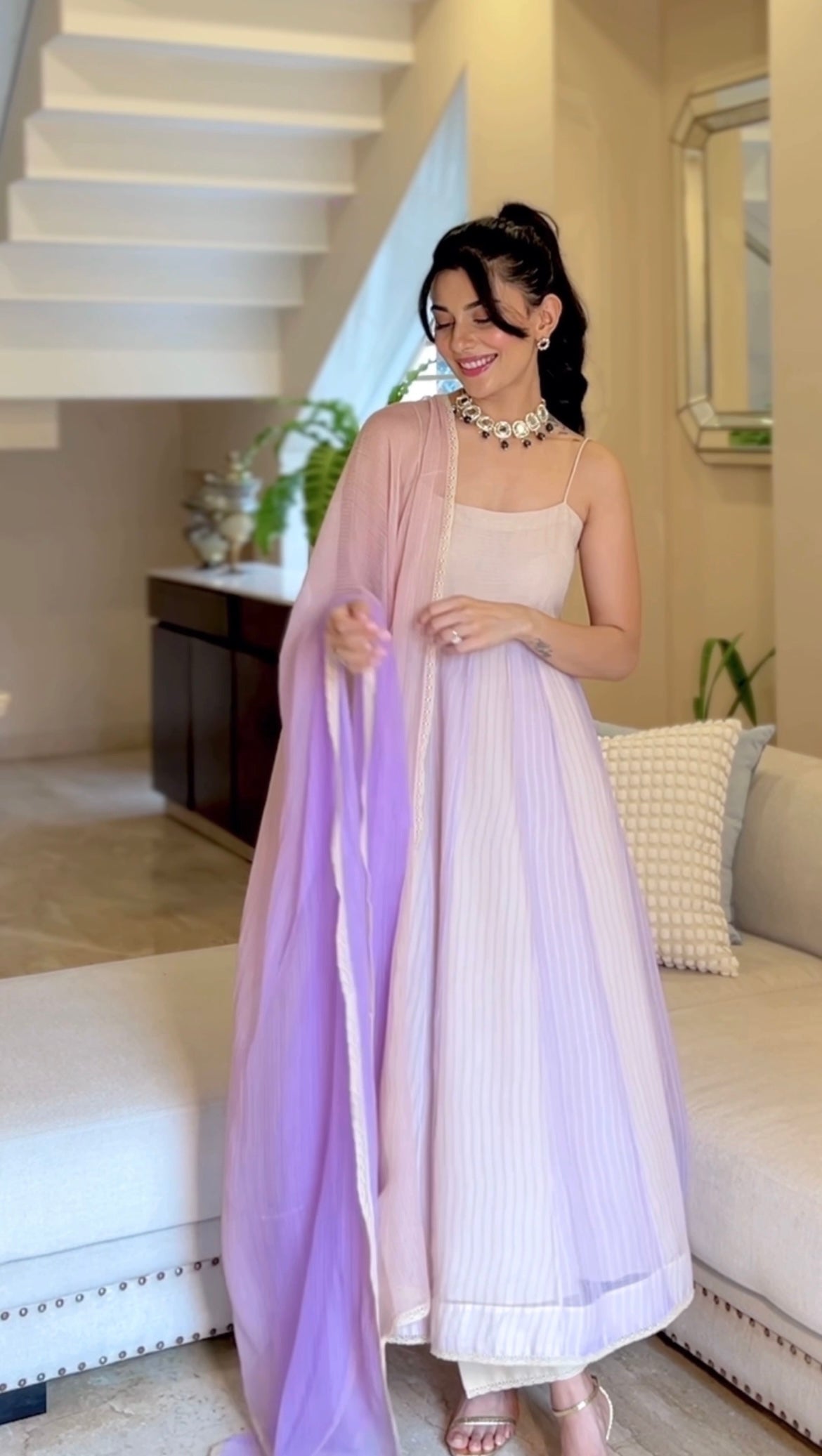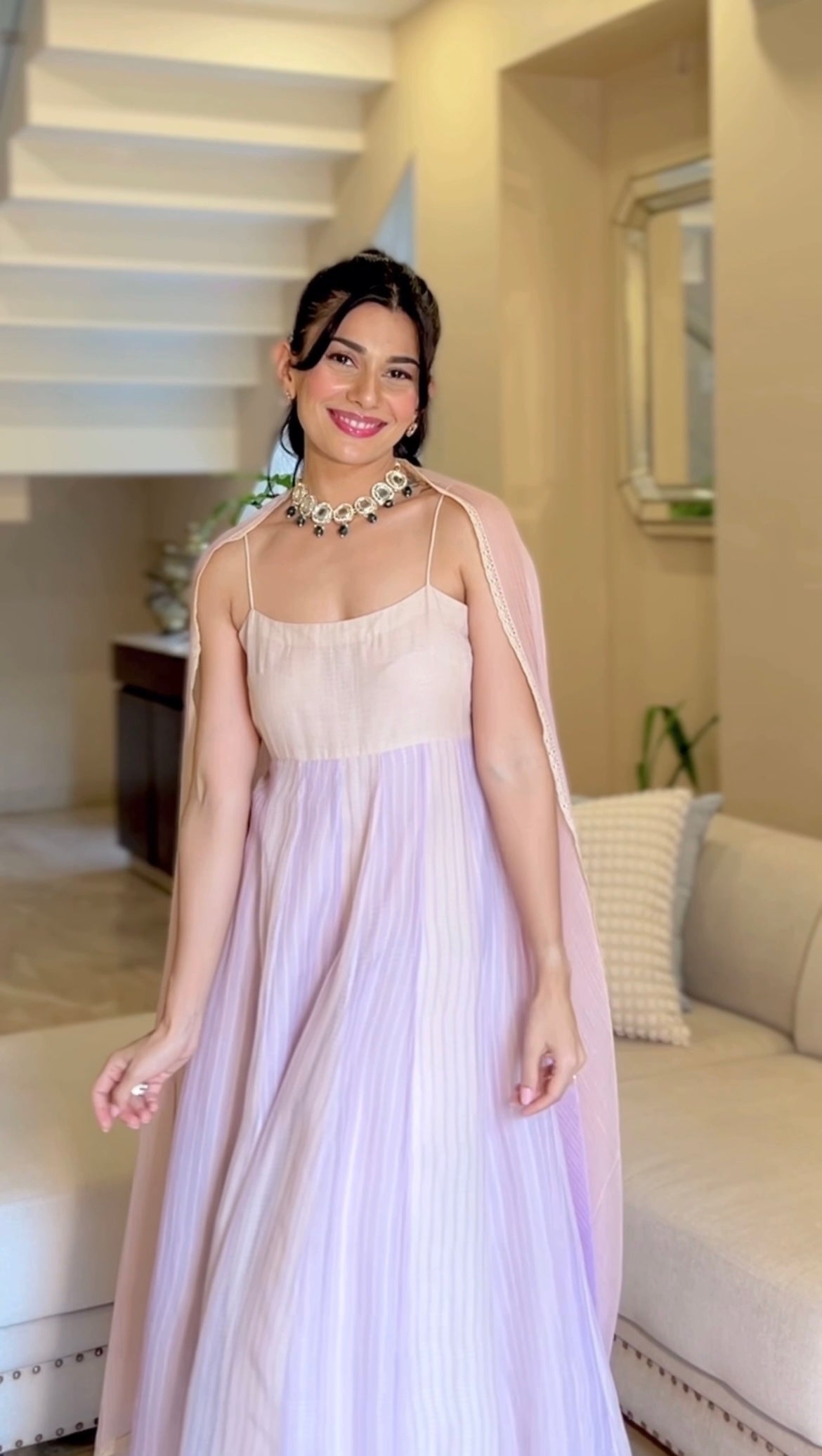 Radhika is wearing size Small and Light Purple + Nude Colour