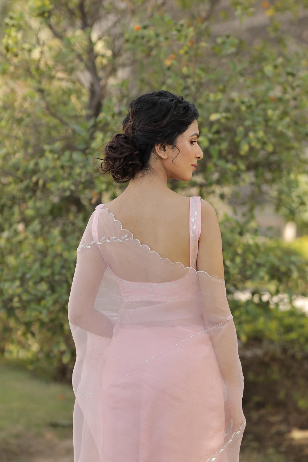 - Organza Saree with scalloped border and striped handwork all over.