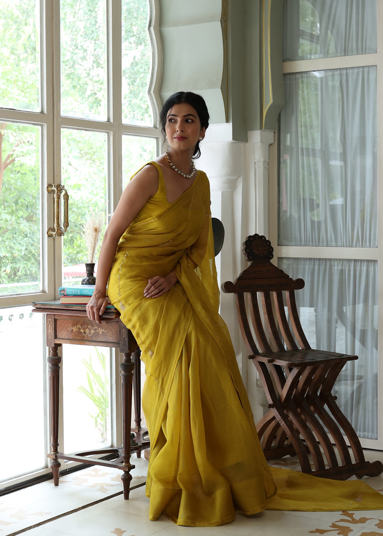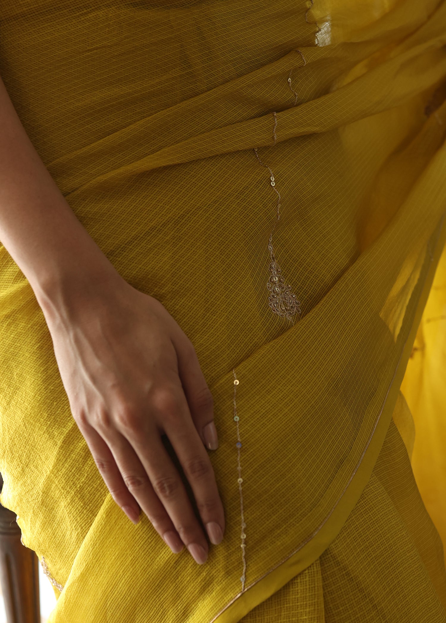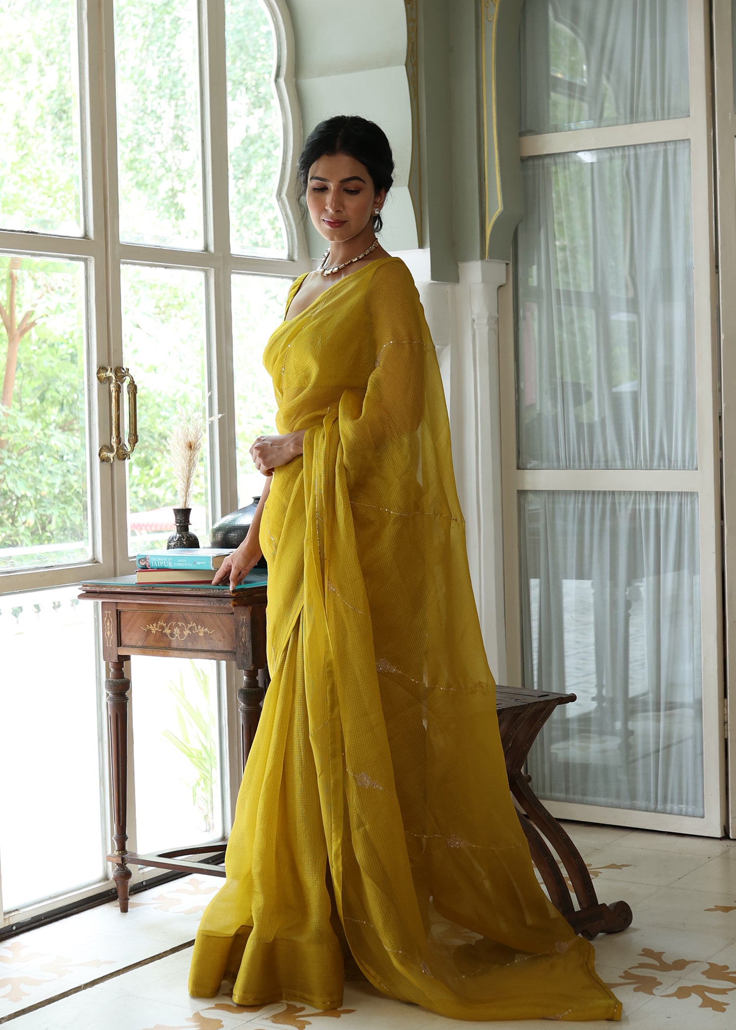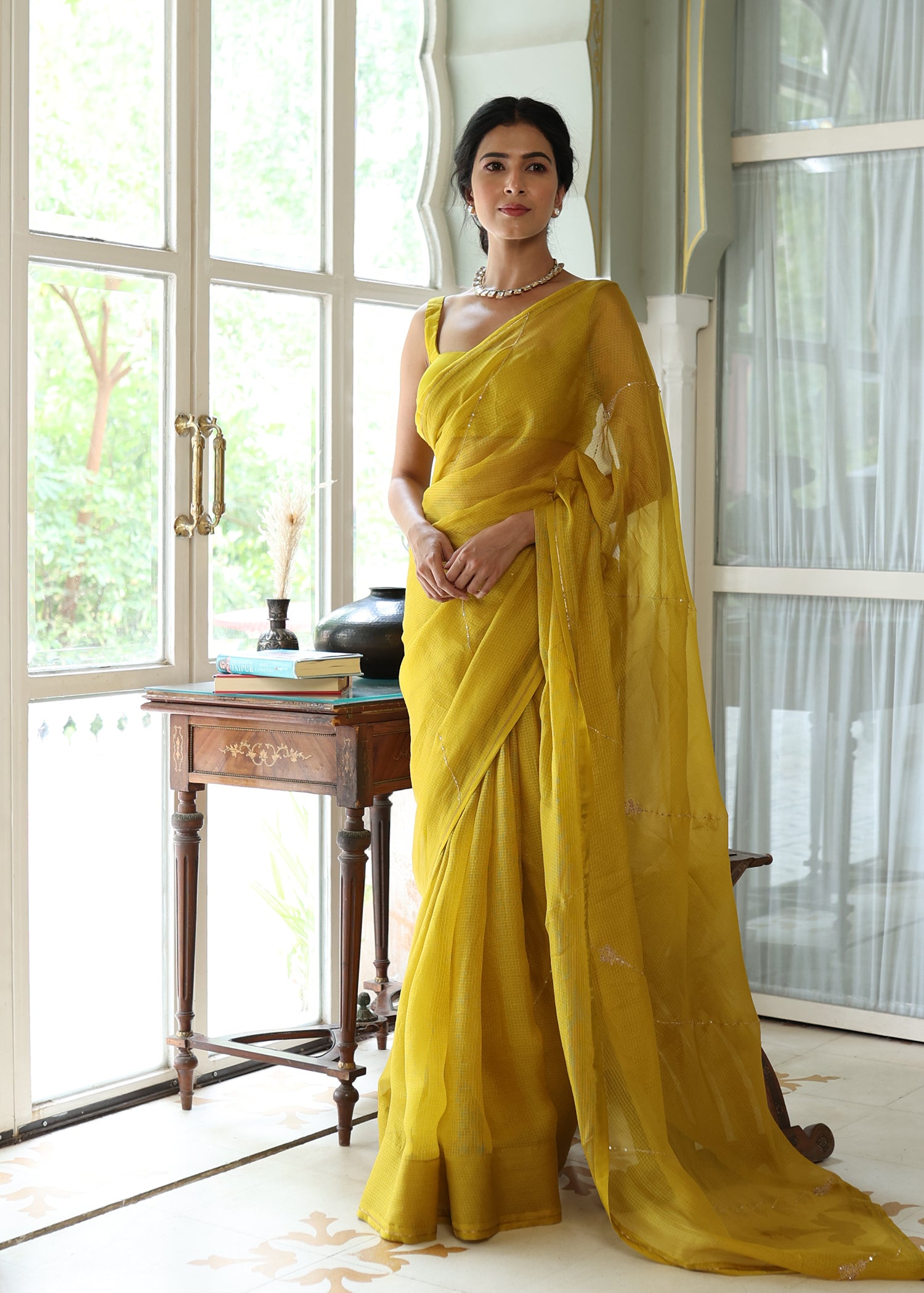 - Kota Doriya Saree featuring striped embellishments throughout, finished with a sleek Modal Satin facing for an elegant edge.