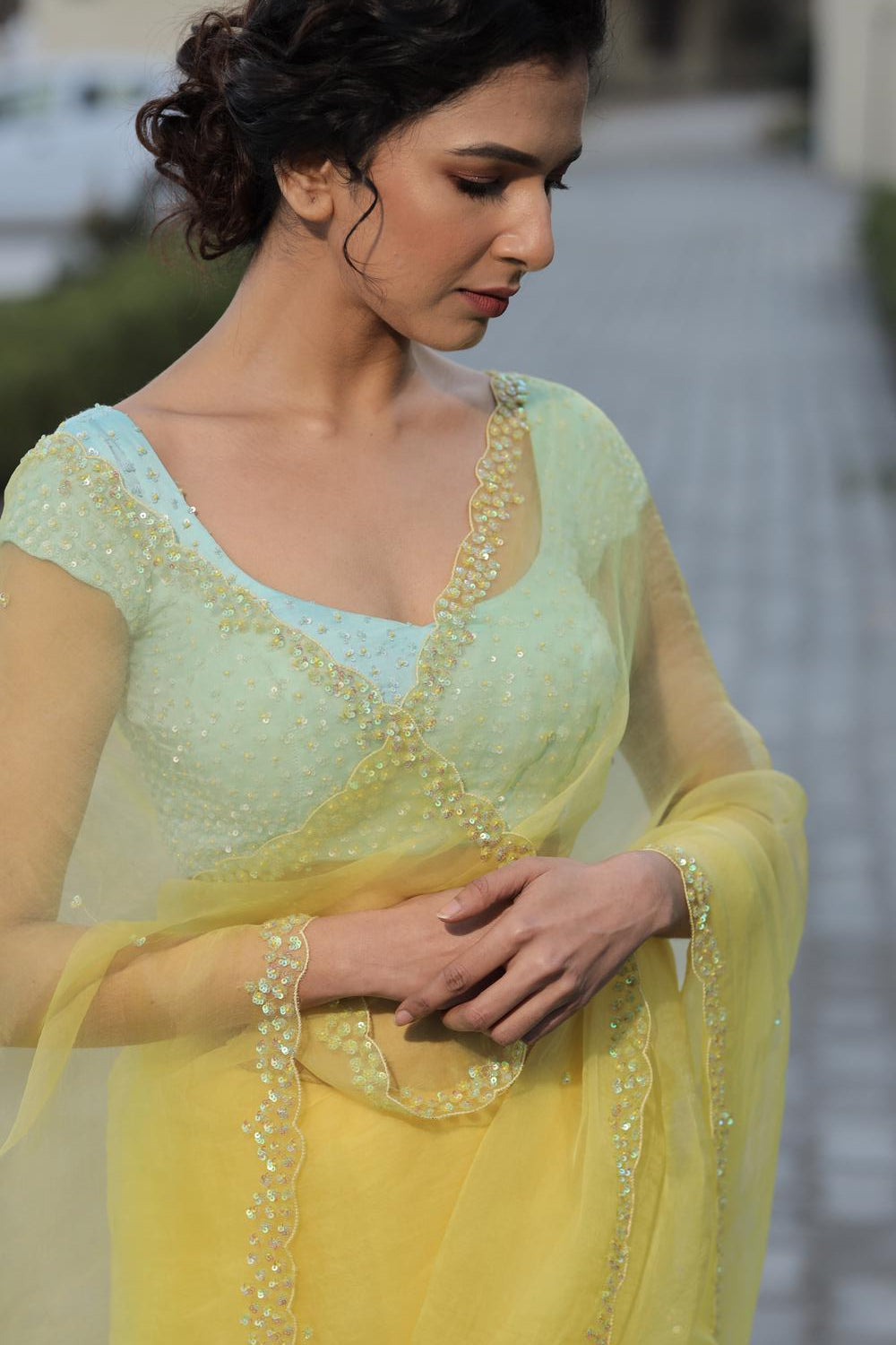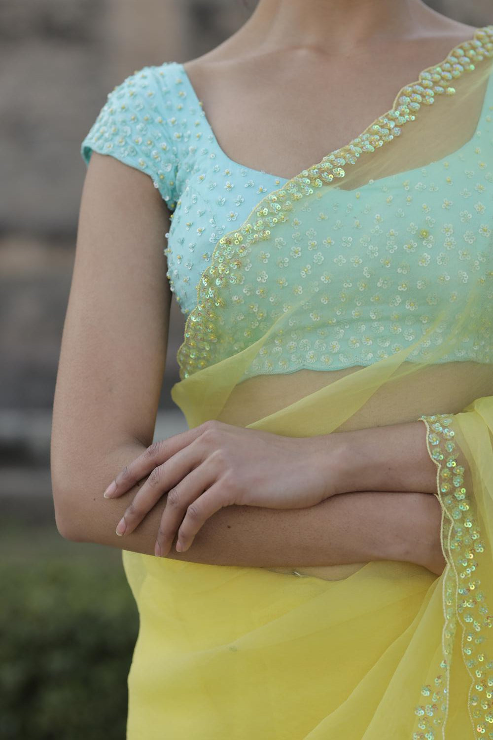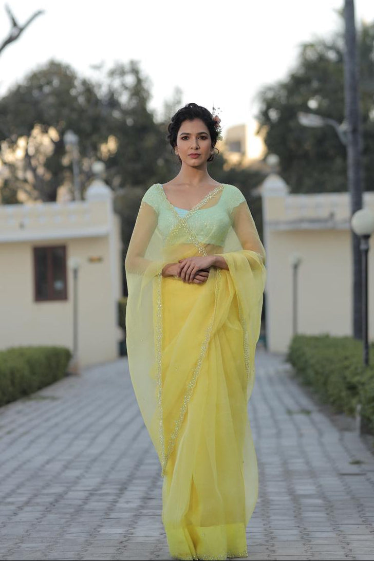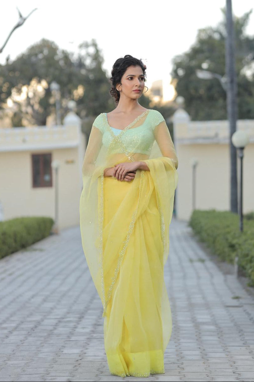 - Organza Saree featuring a hand-embellished sequin border with intricate cutwork, and scattered sequins all over for a subtle shimmer.