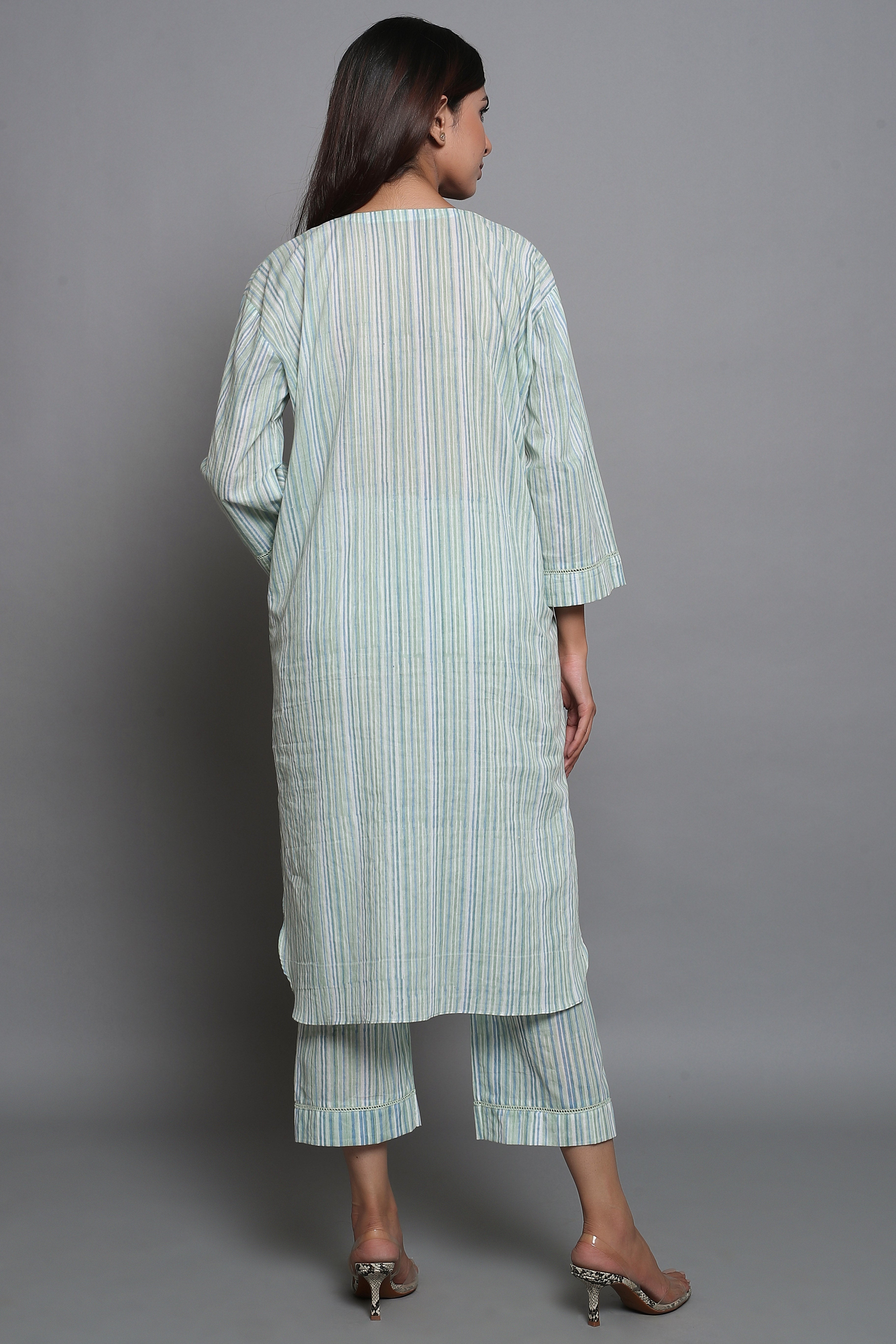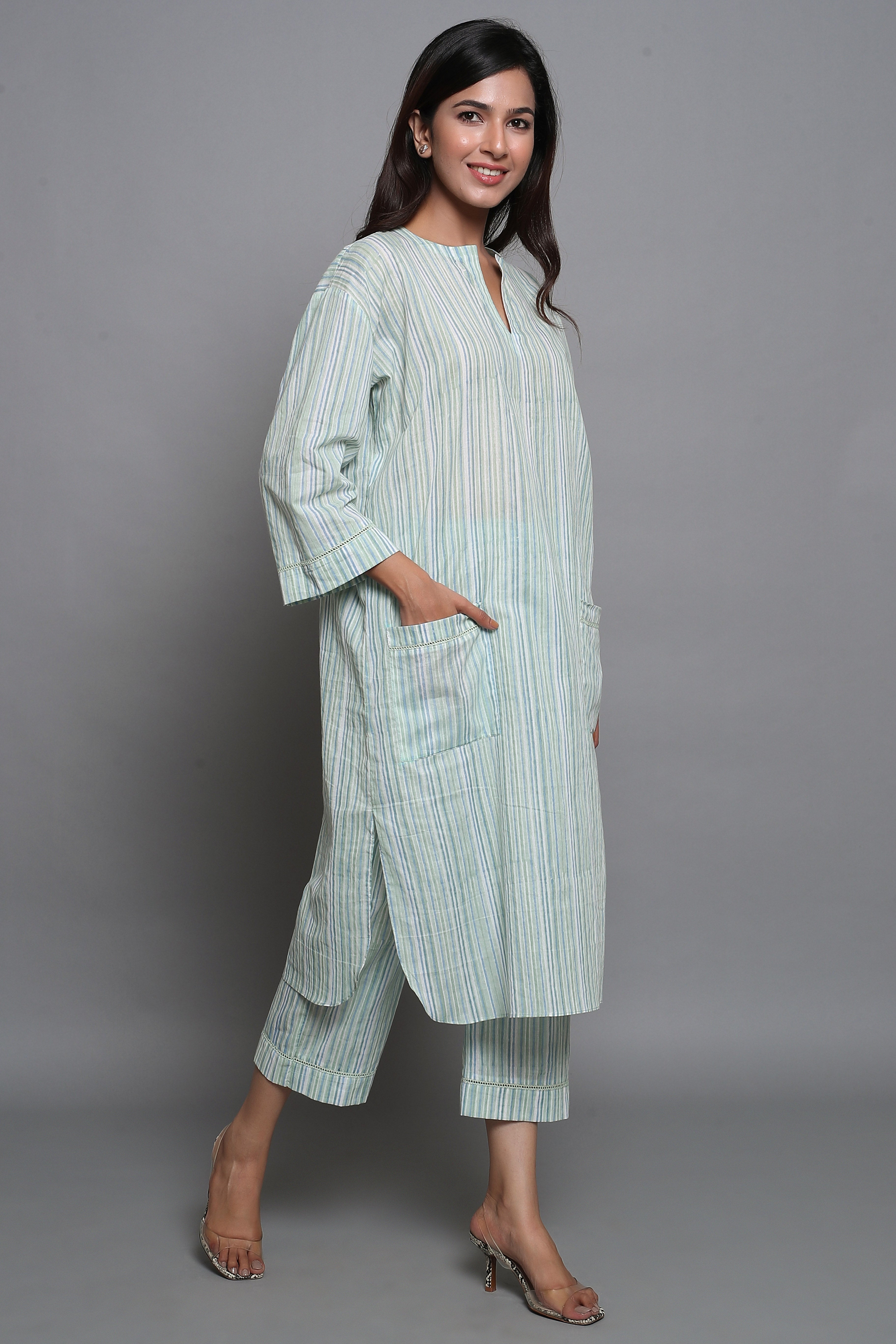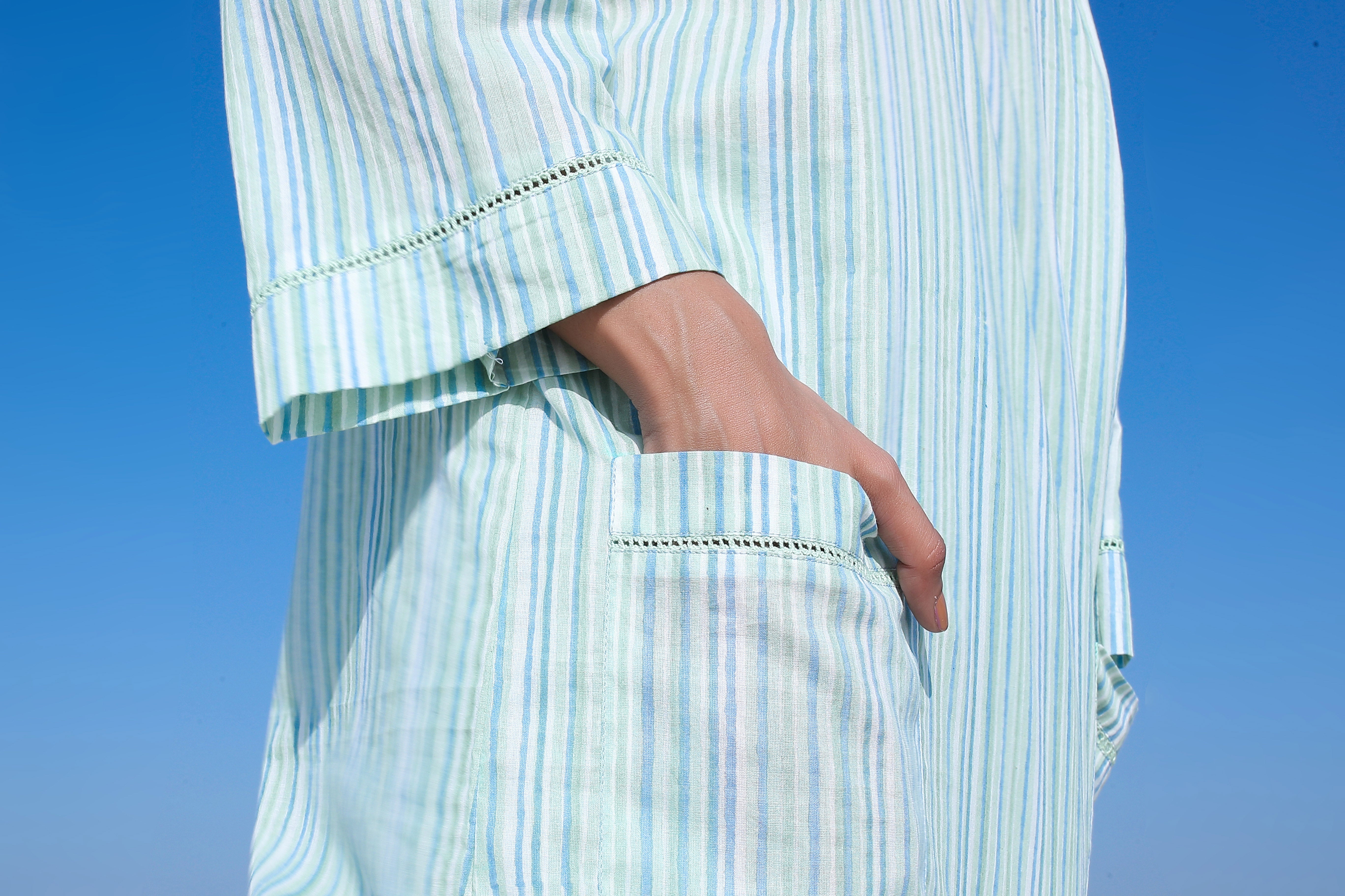 Green Striped Suit Set with Front Pockets