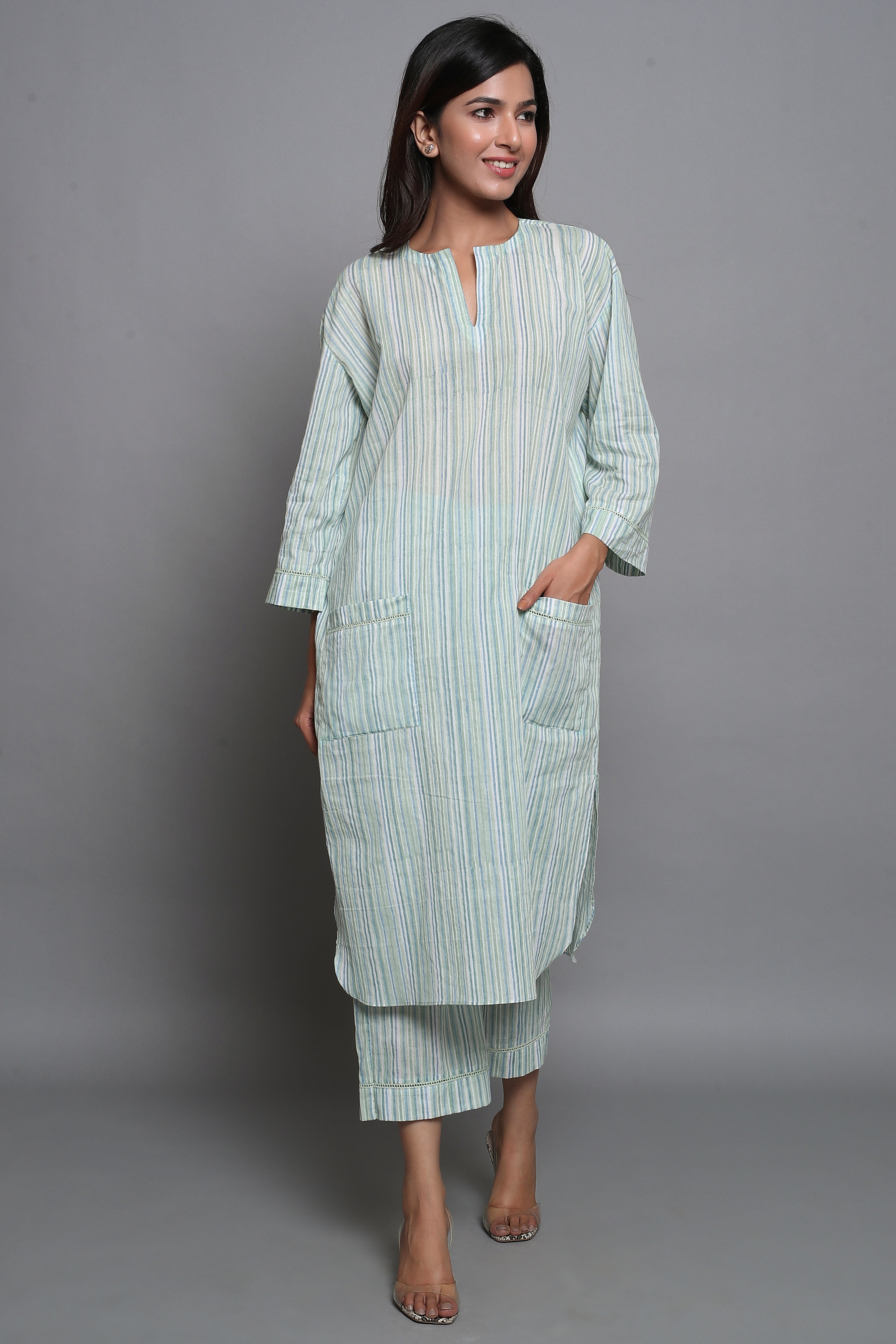 - Relaxed Fit Kurta has round neckline with straight cut and front pockets with lace detailing.