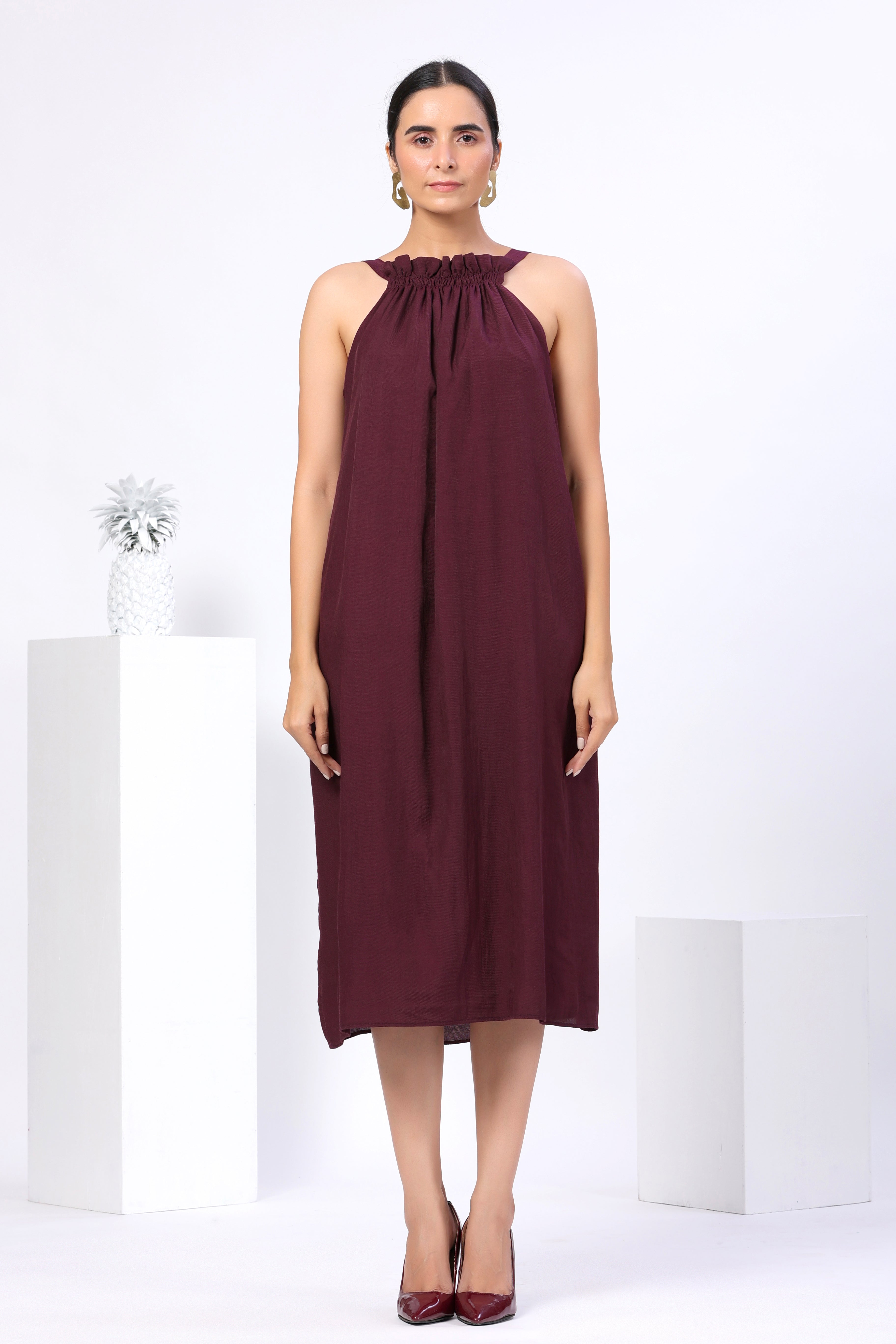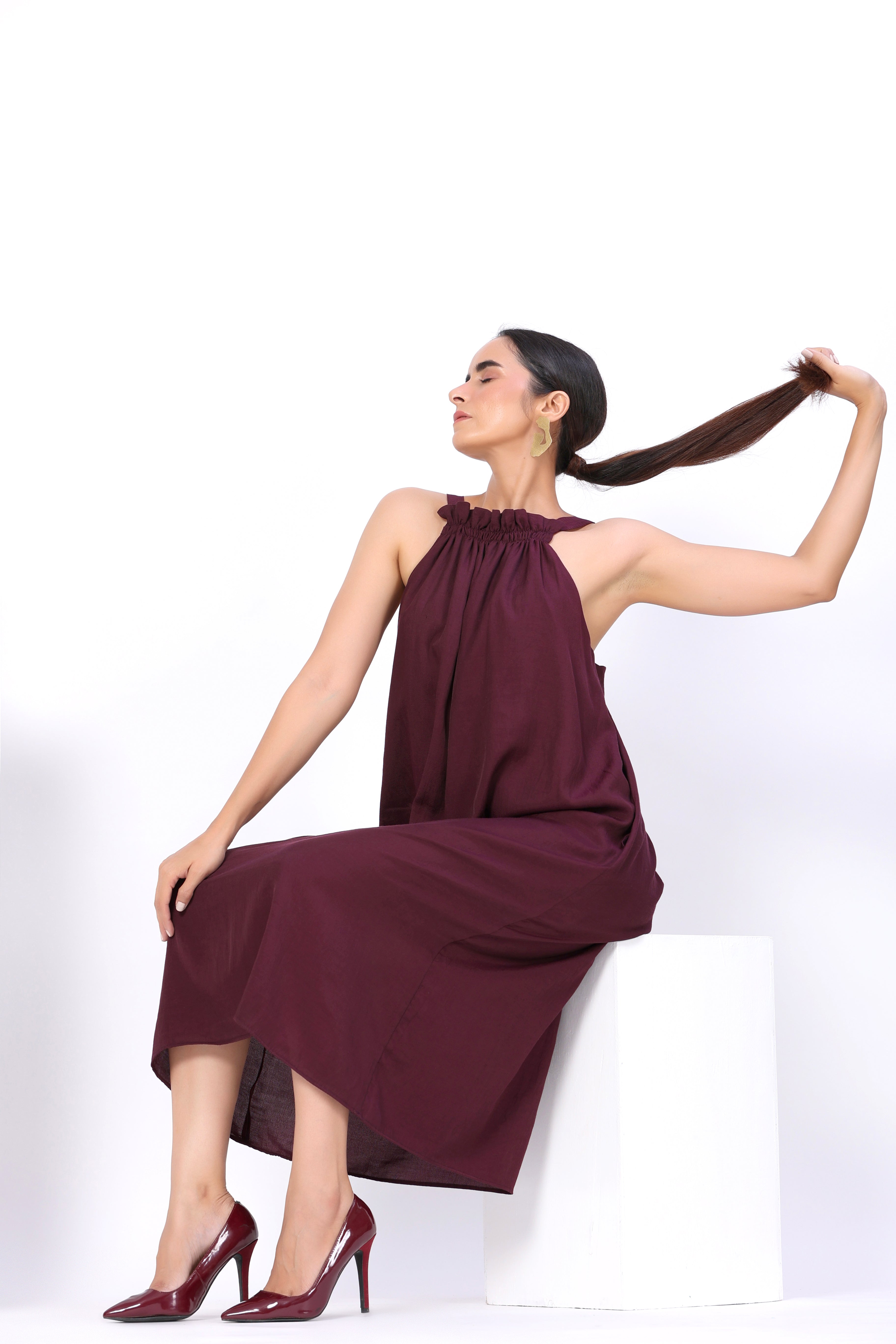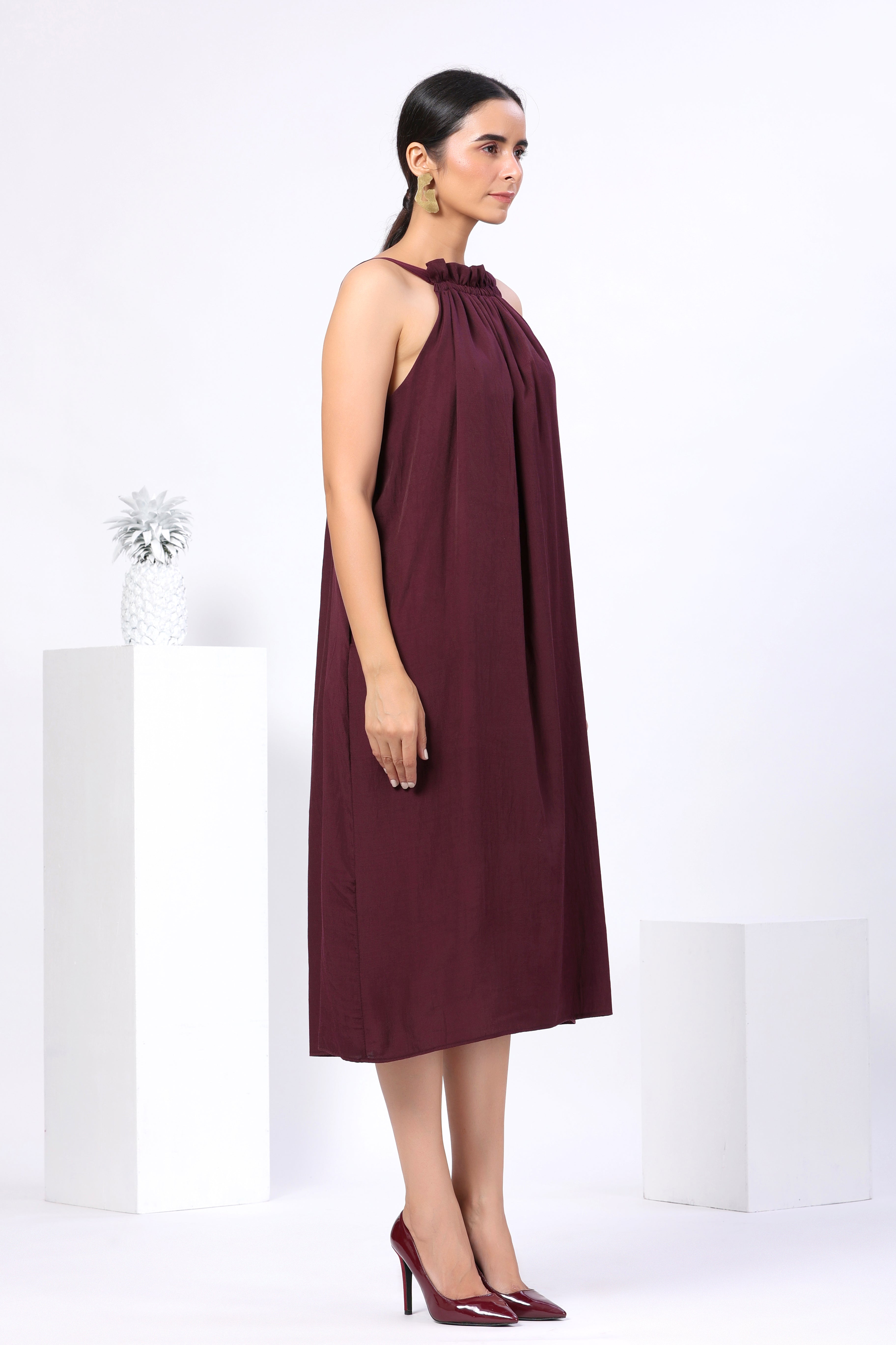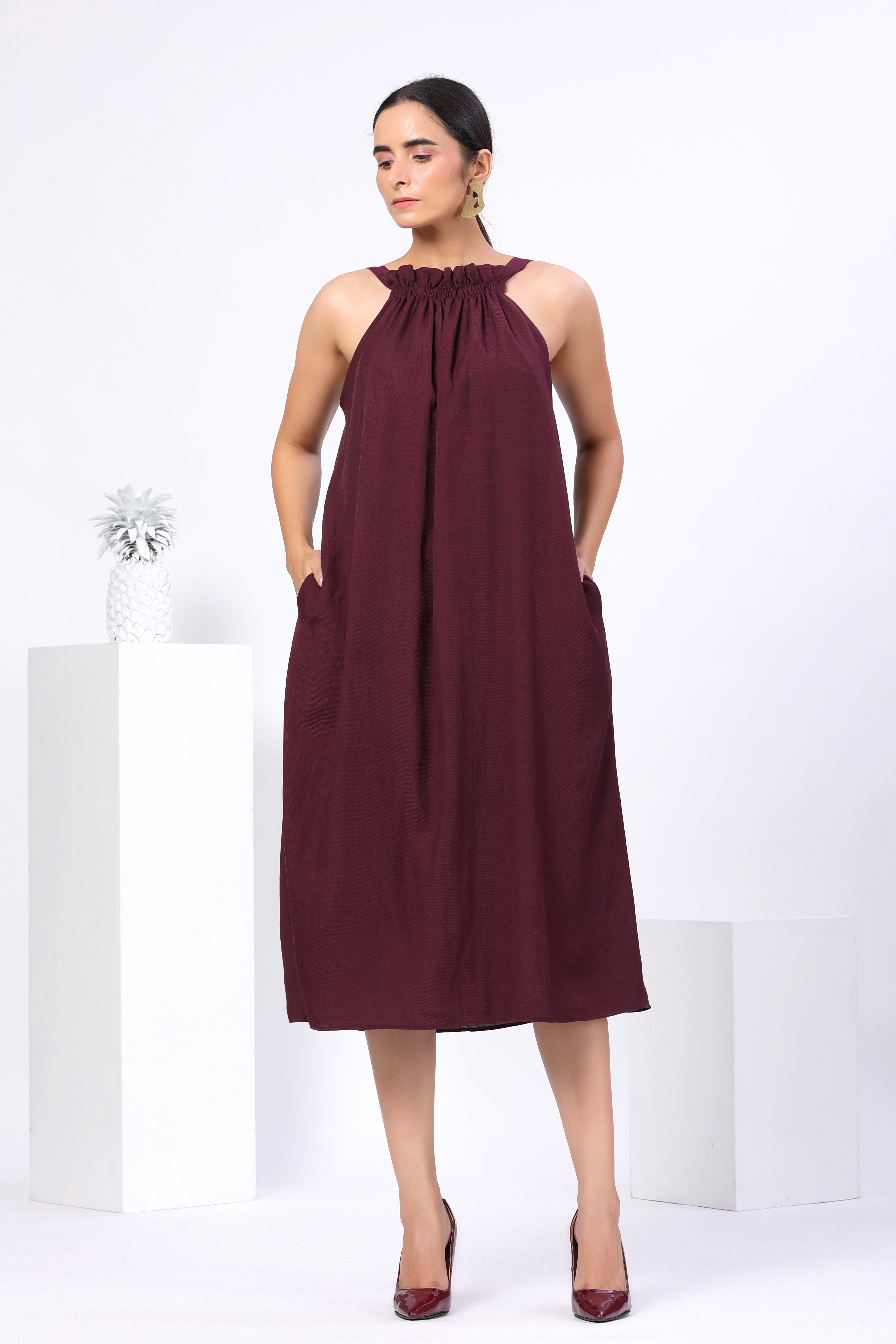 This Mid Calf Length Dress has Grecian neckline, Doriya straps, Ruched detailing in front and pockets on both sides.