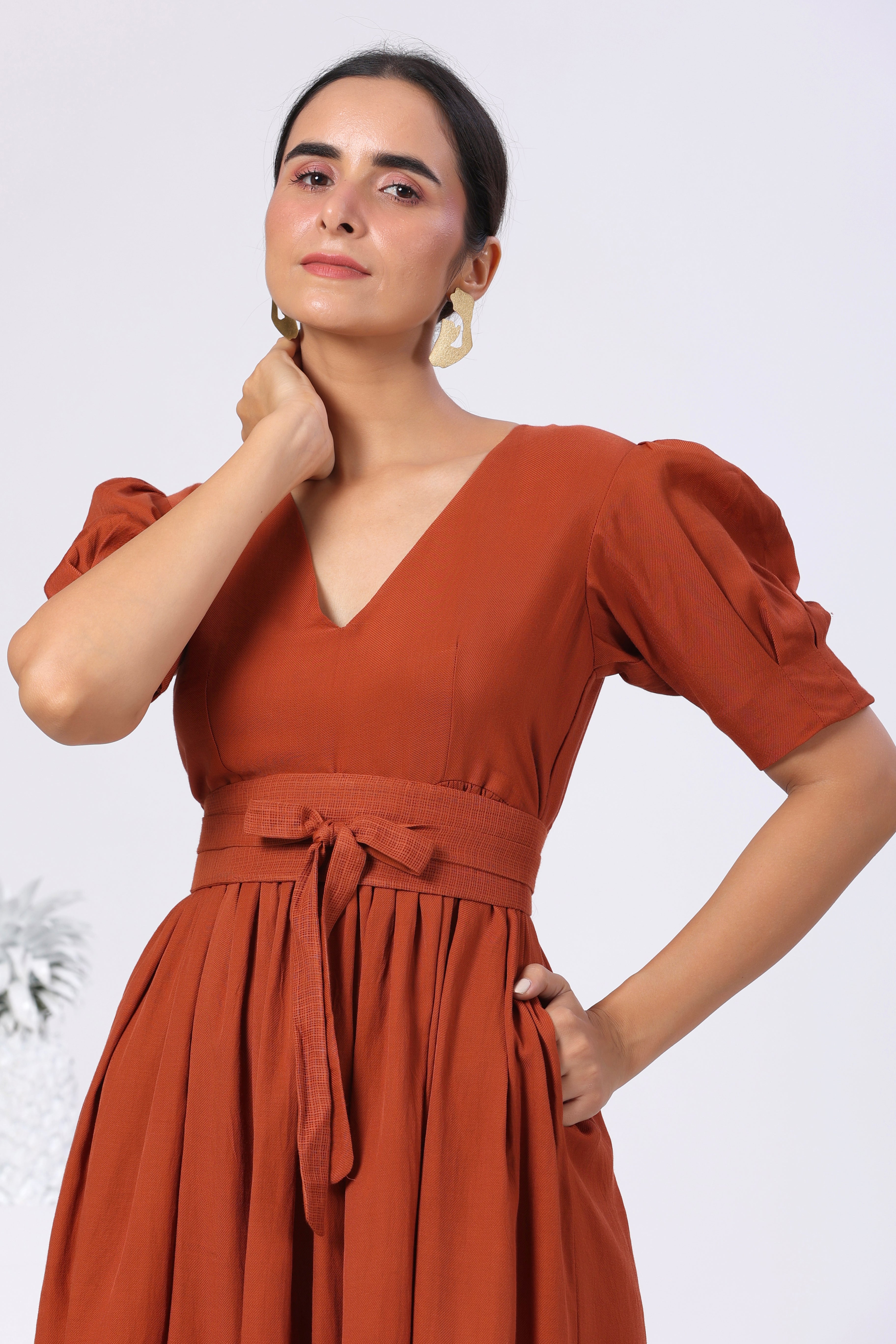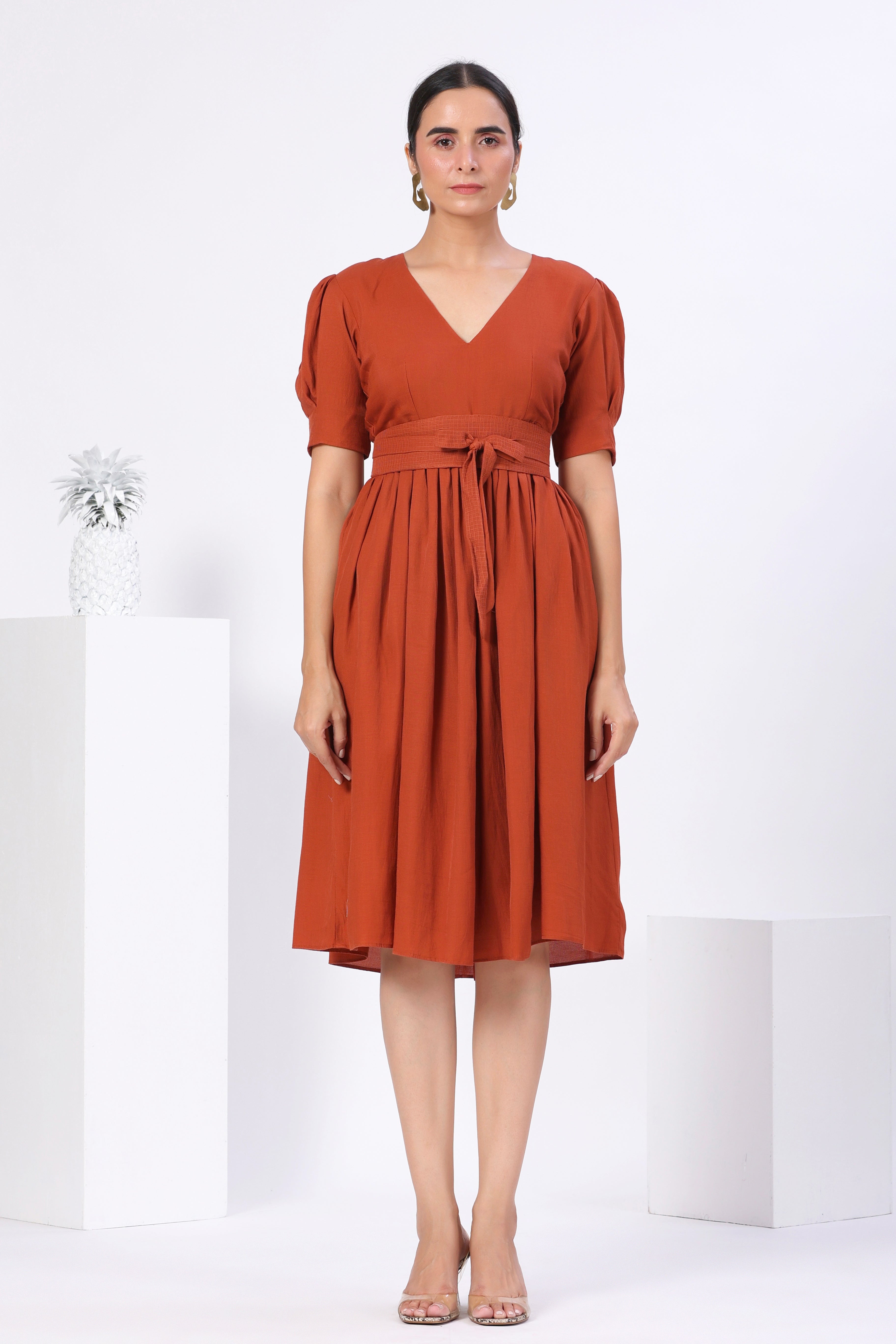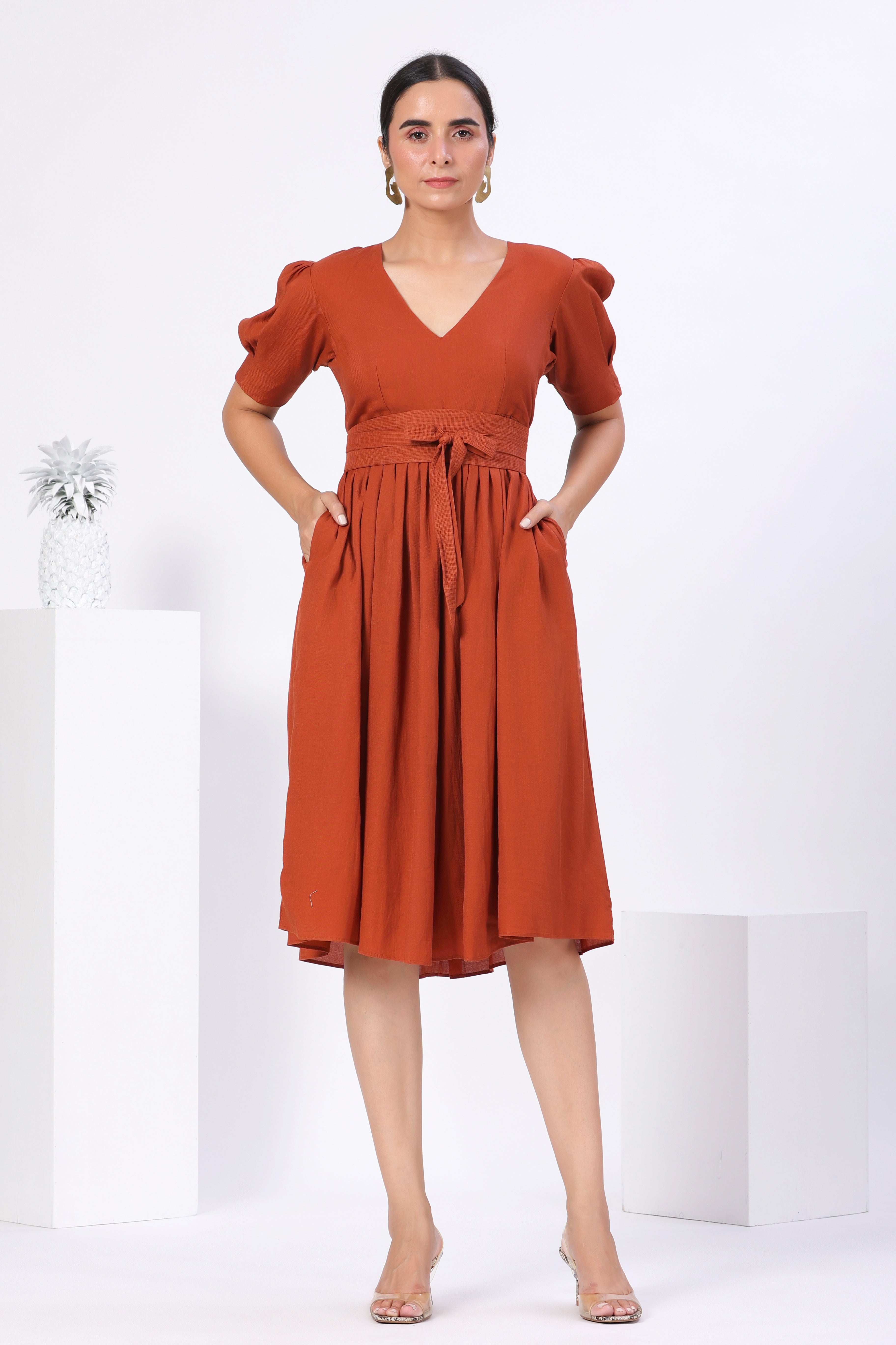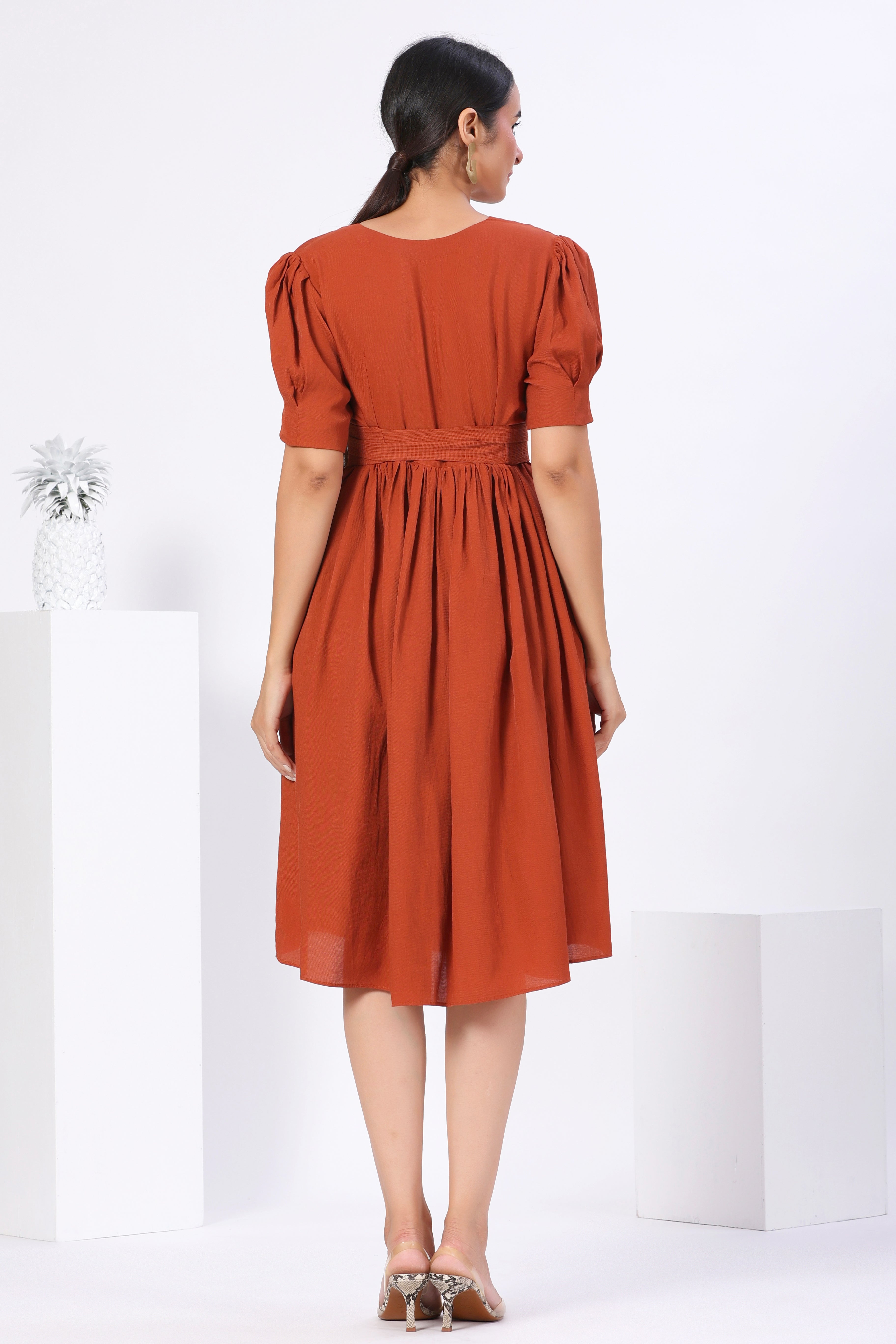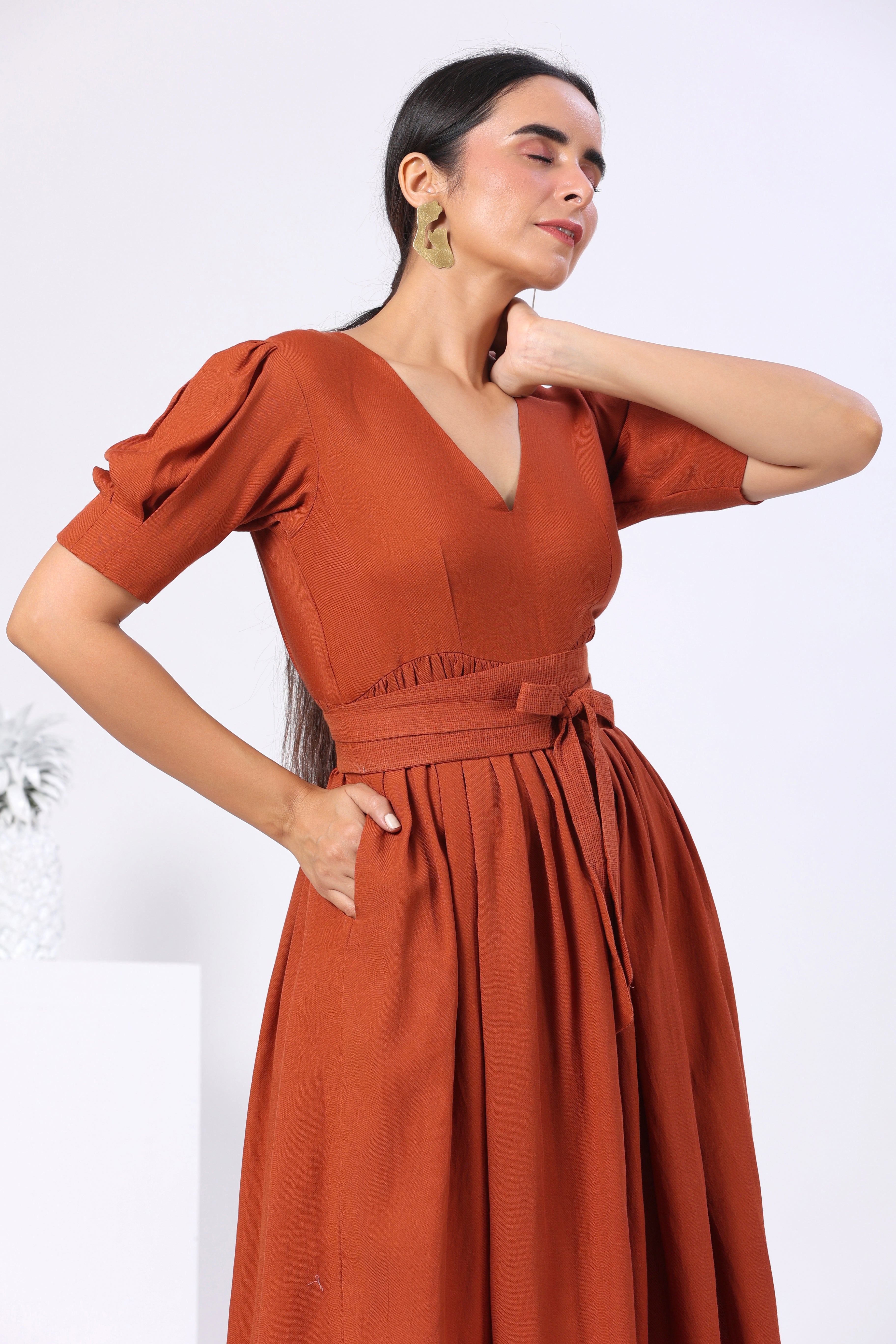 This Midi Length Dress has V-neckline, puffed half sleeves and pockets on both sides. It comes with a Doriya adjustable belt.
