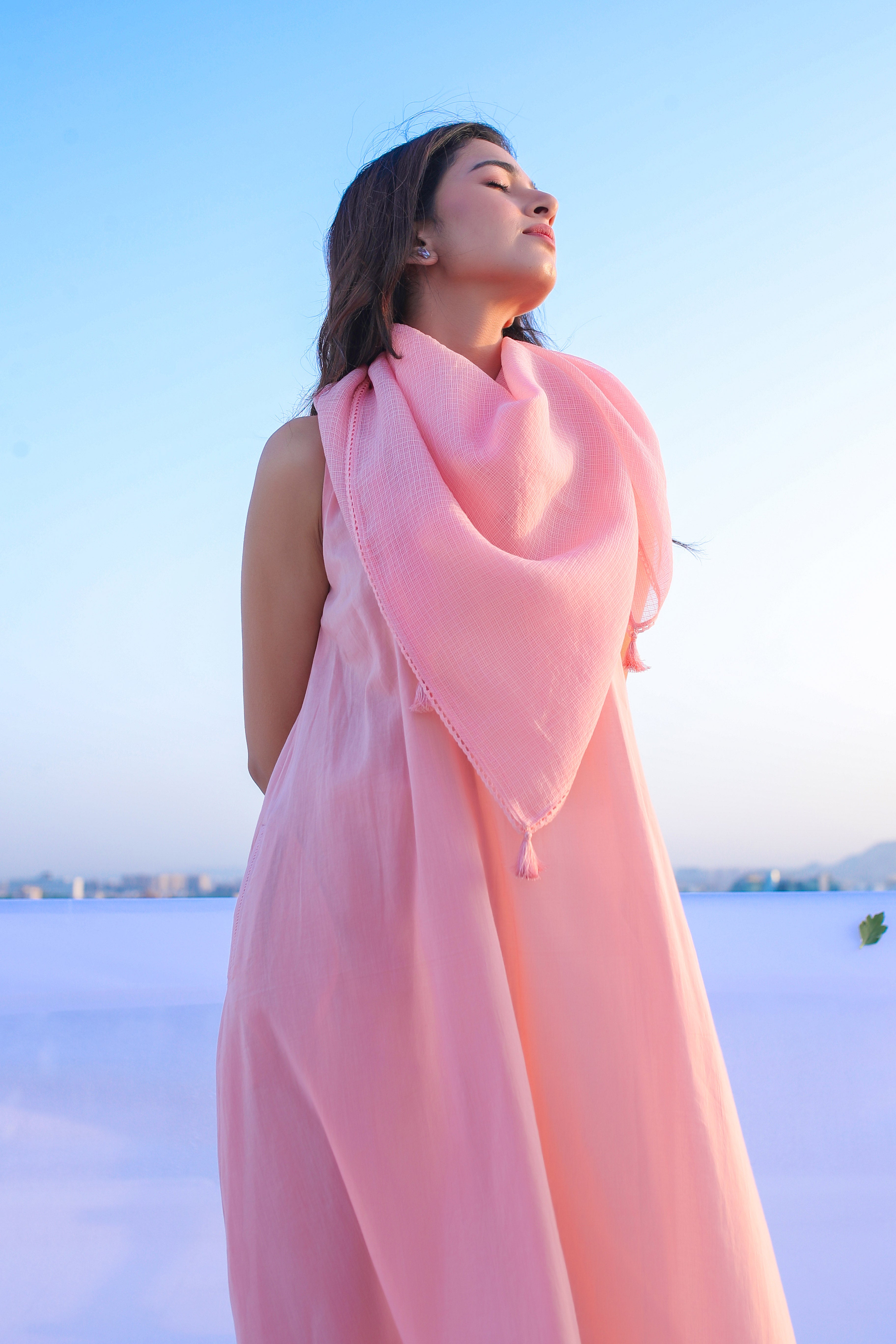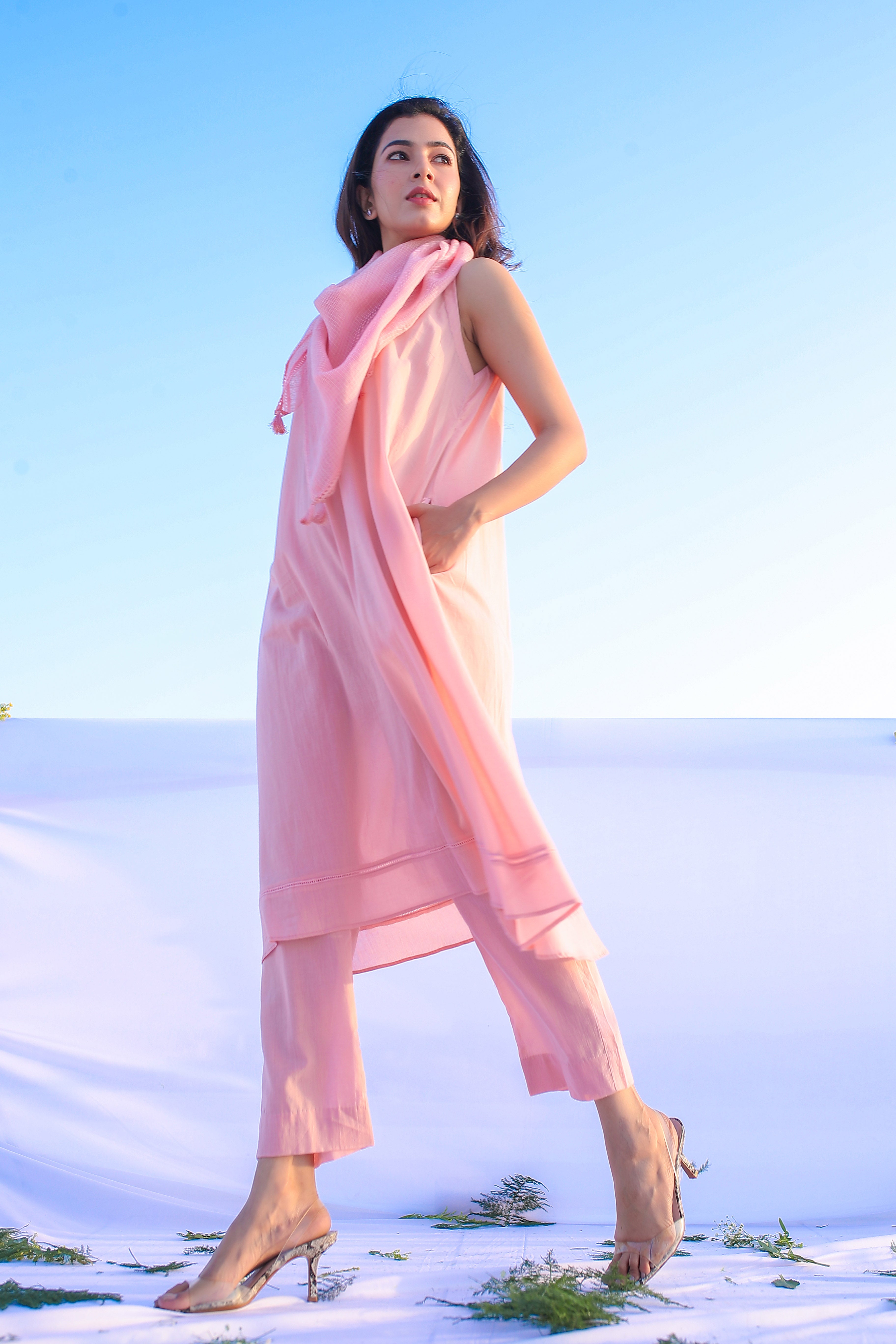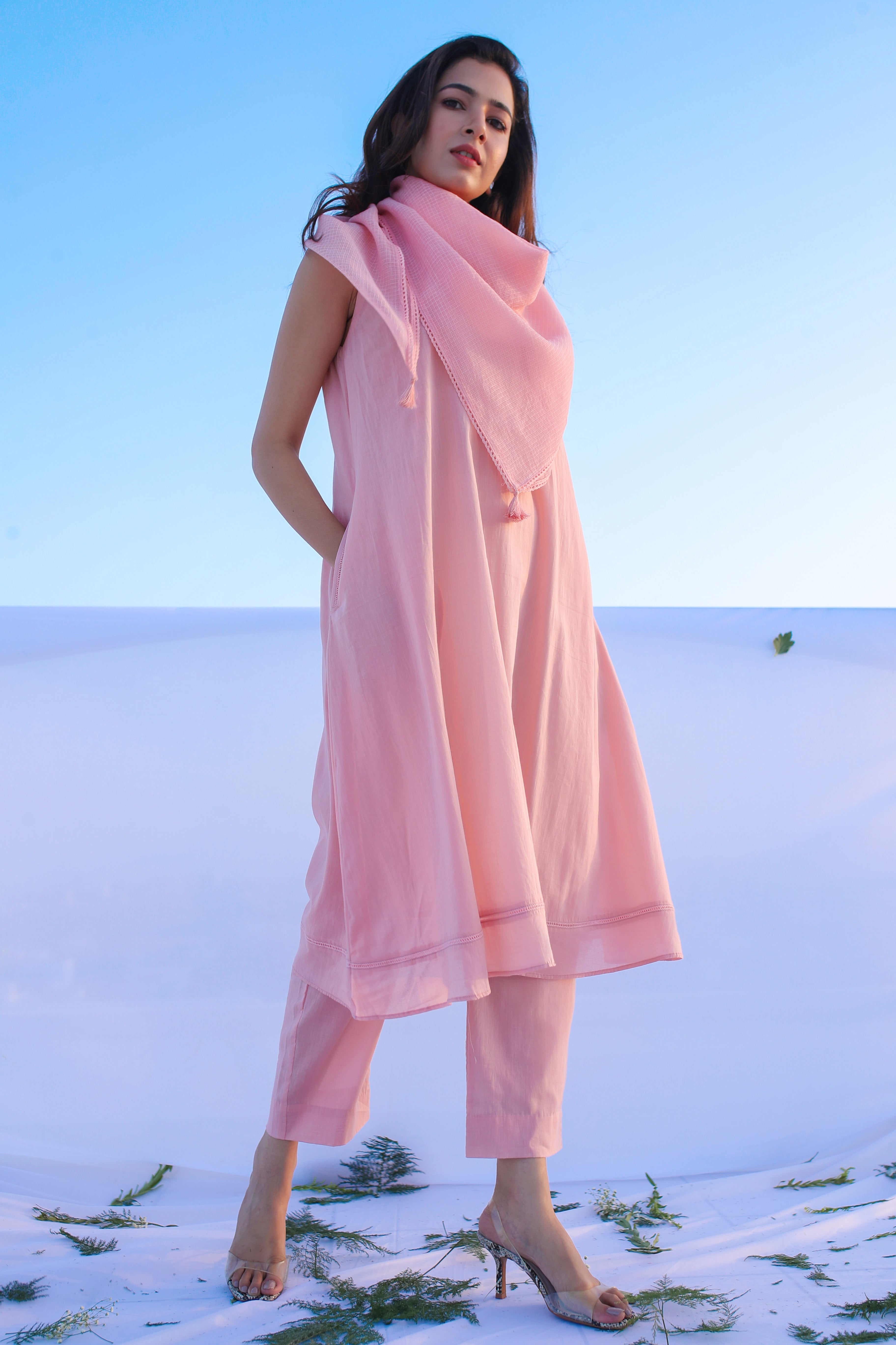 - A line kurta that has round neckline, pockets on both sides with lace detailing and back button fastening.