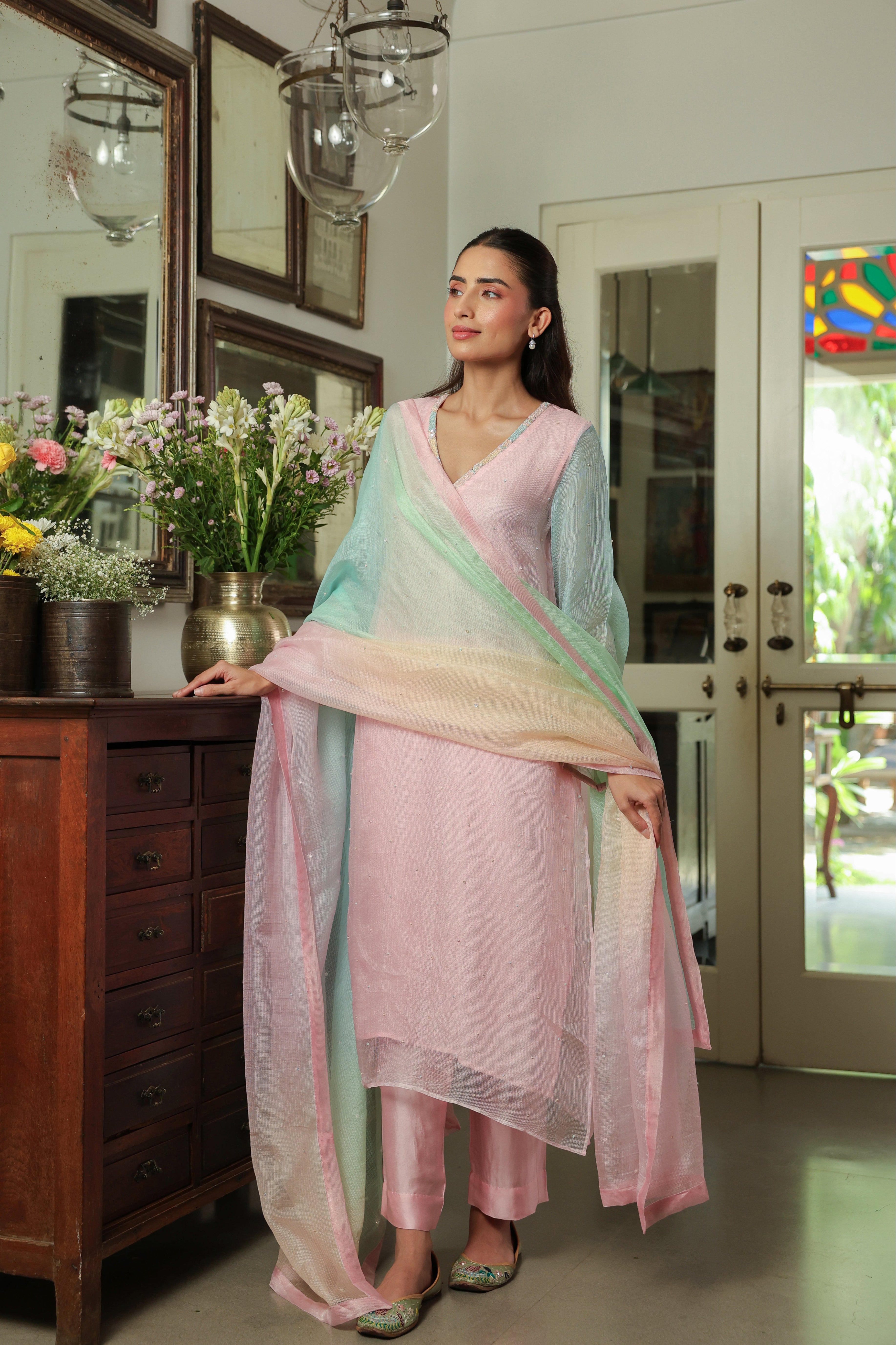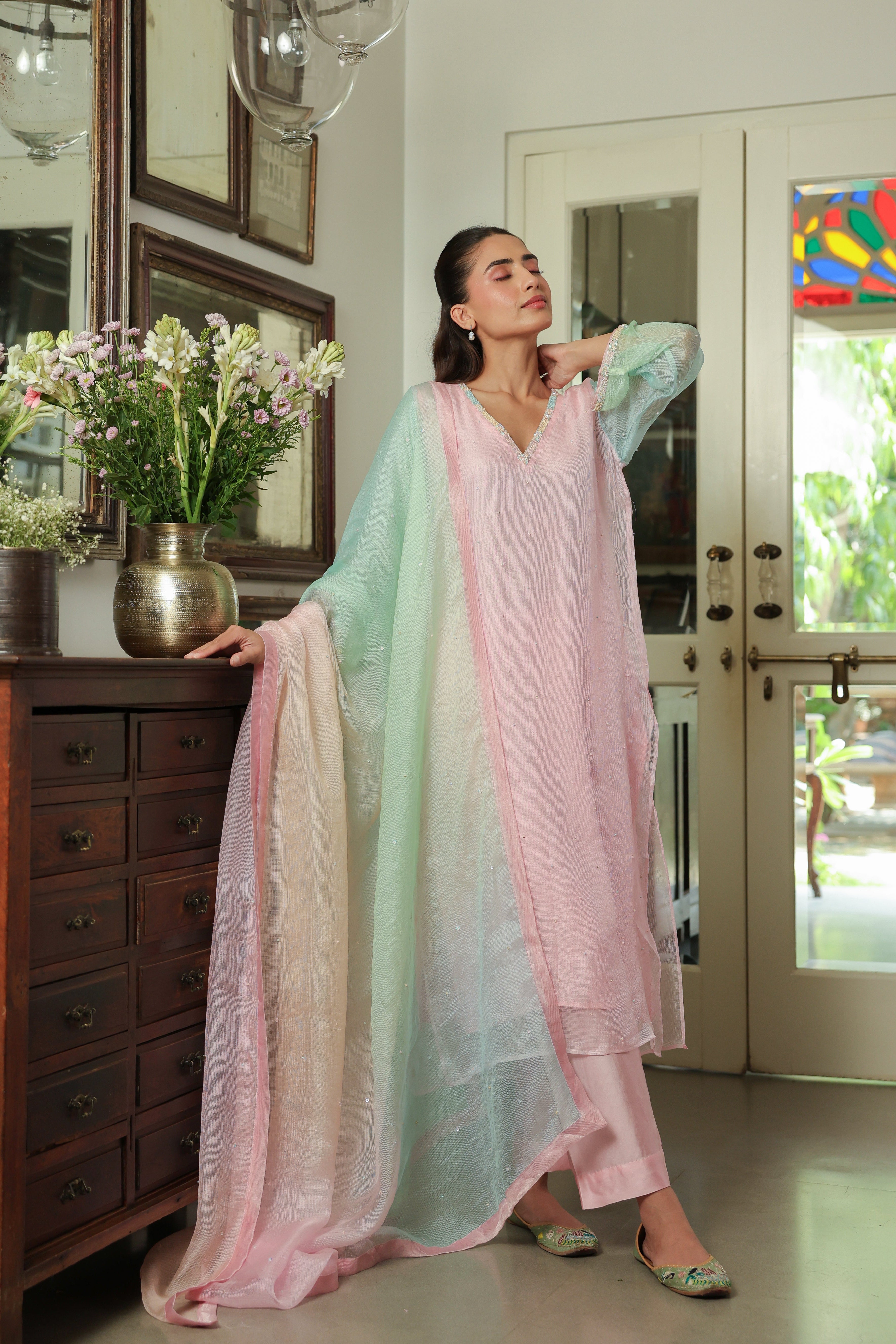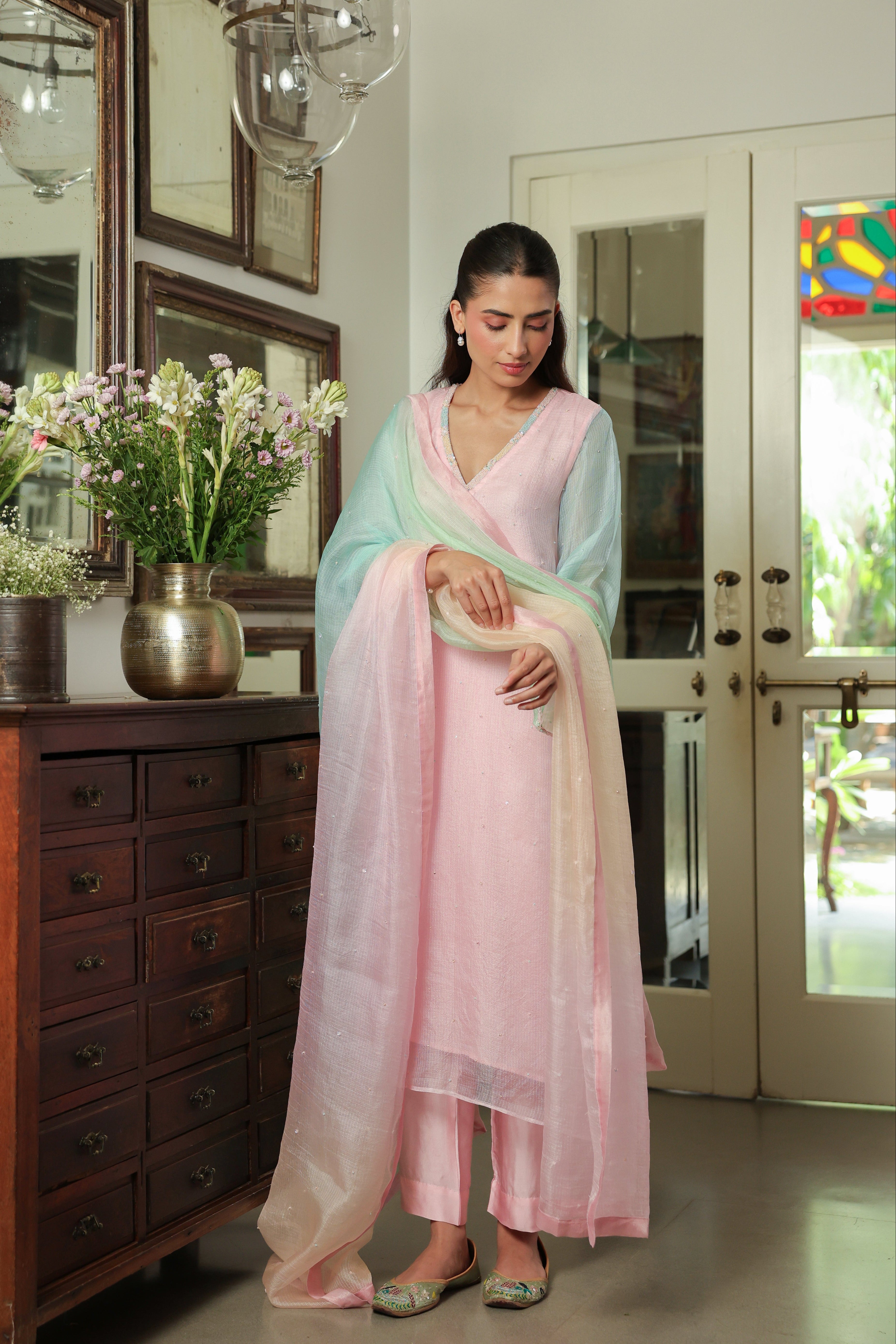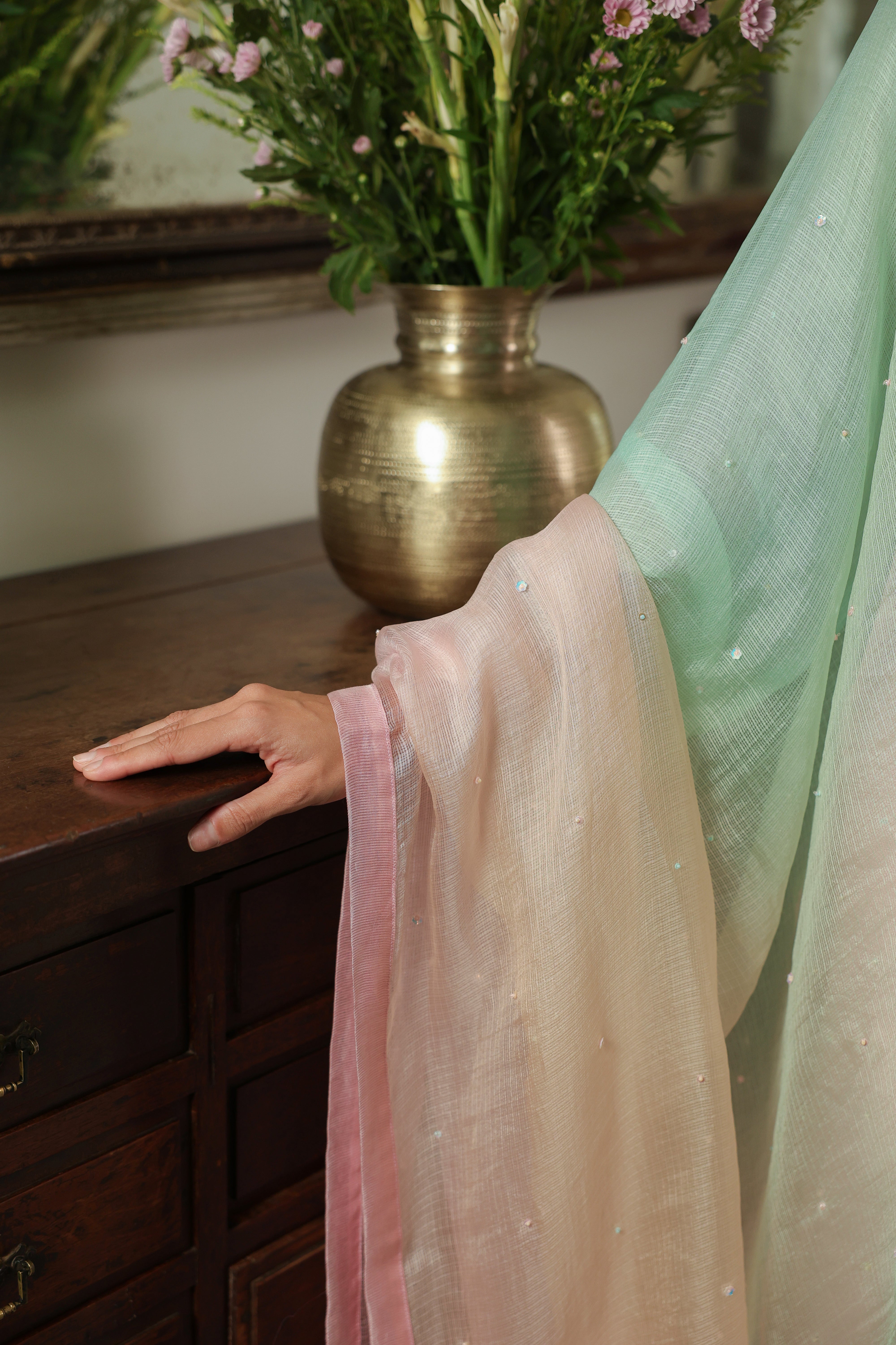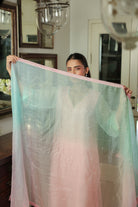 - Ombre Silk Doriya Dupatta with Chanderi facing and scattered embellishment all over.