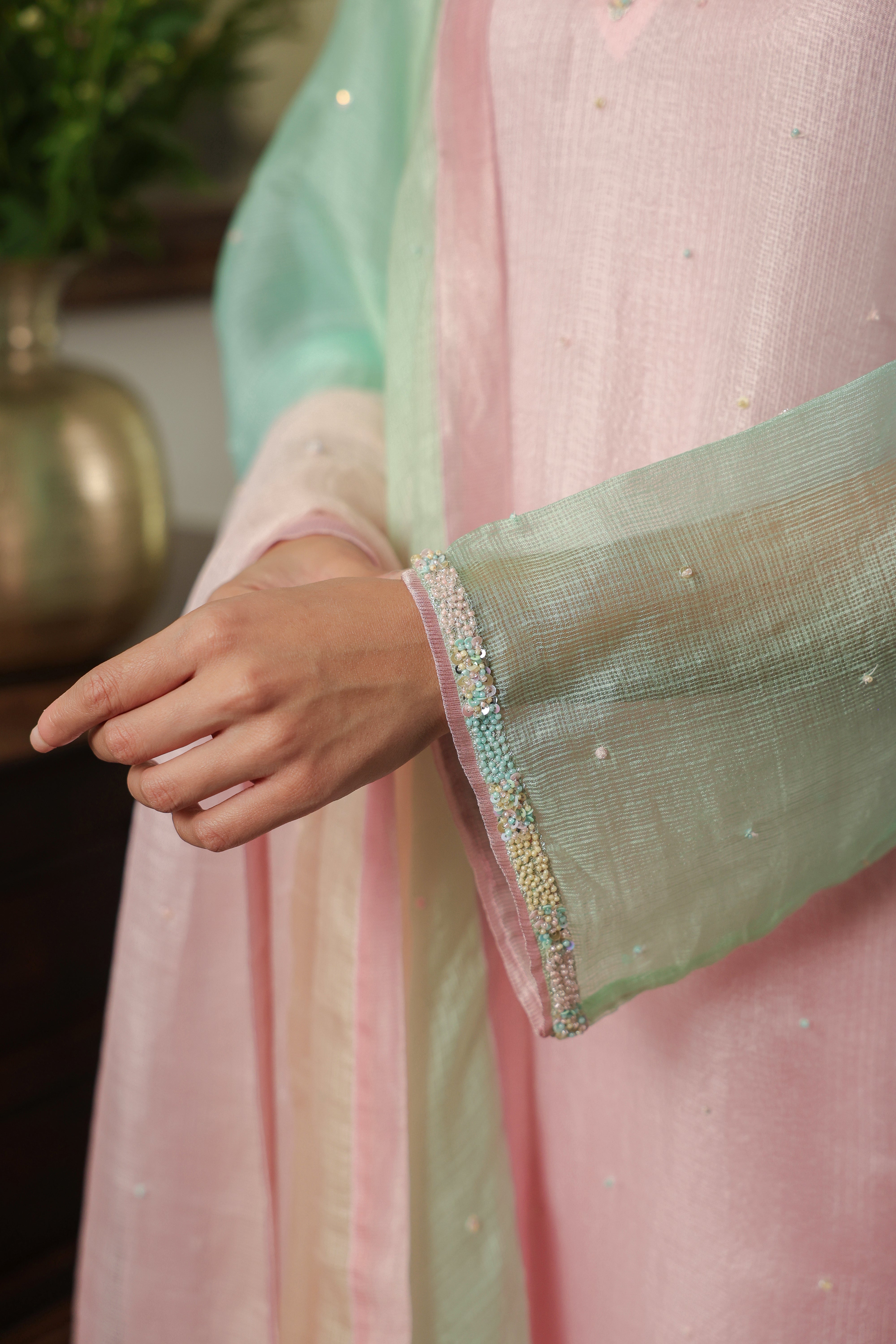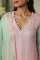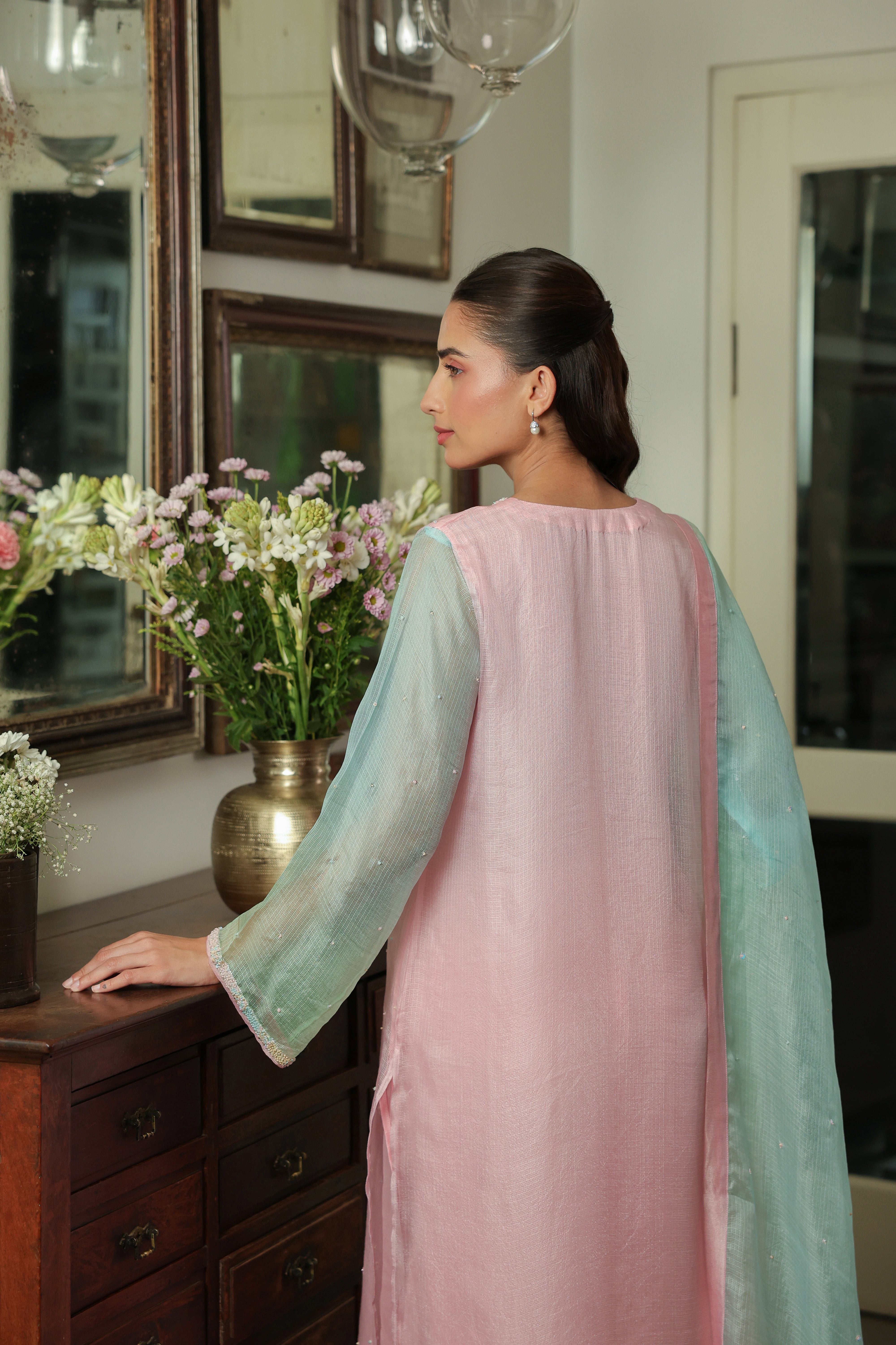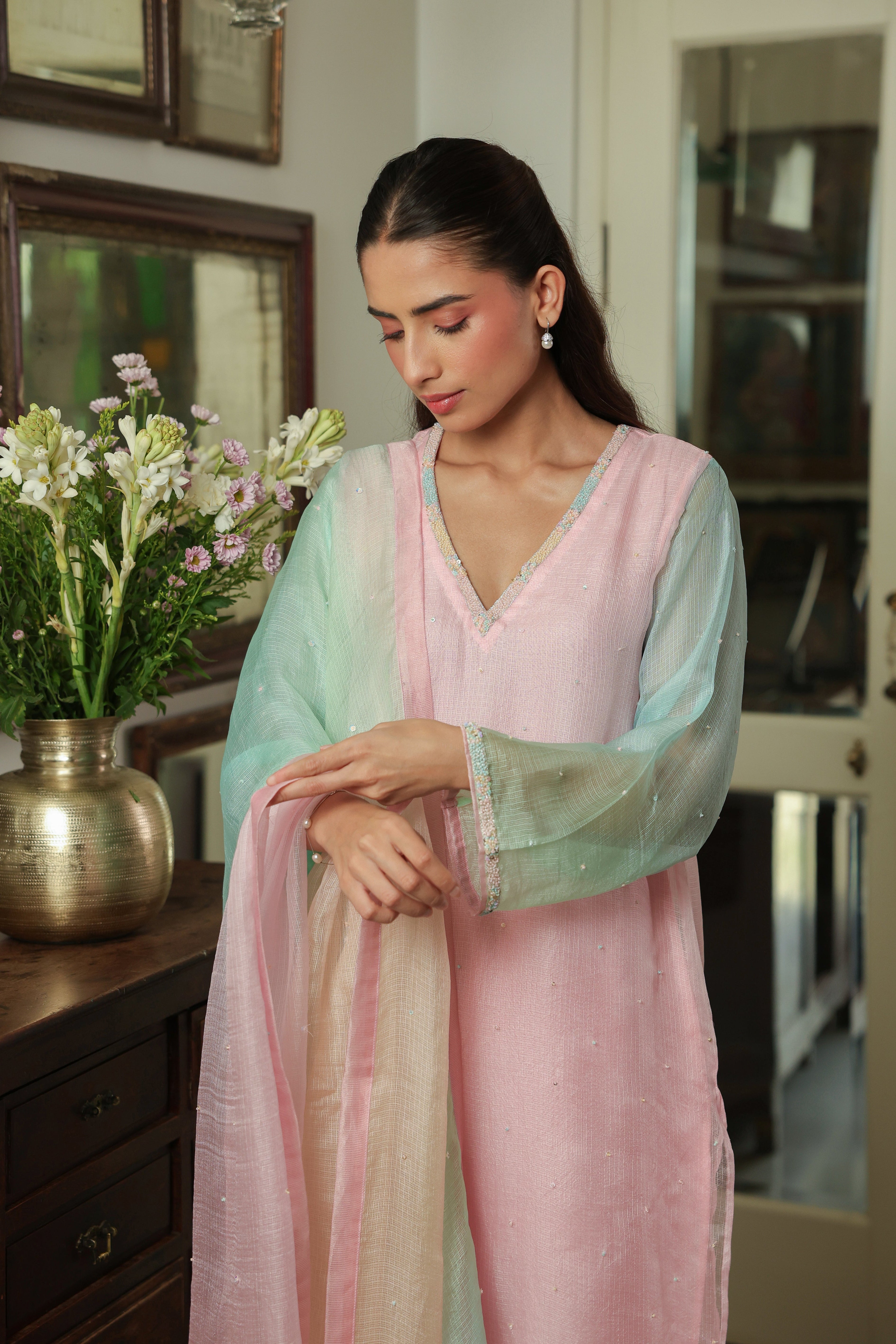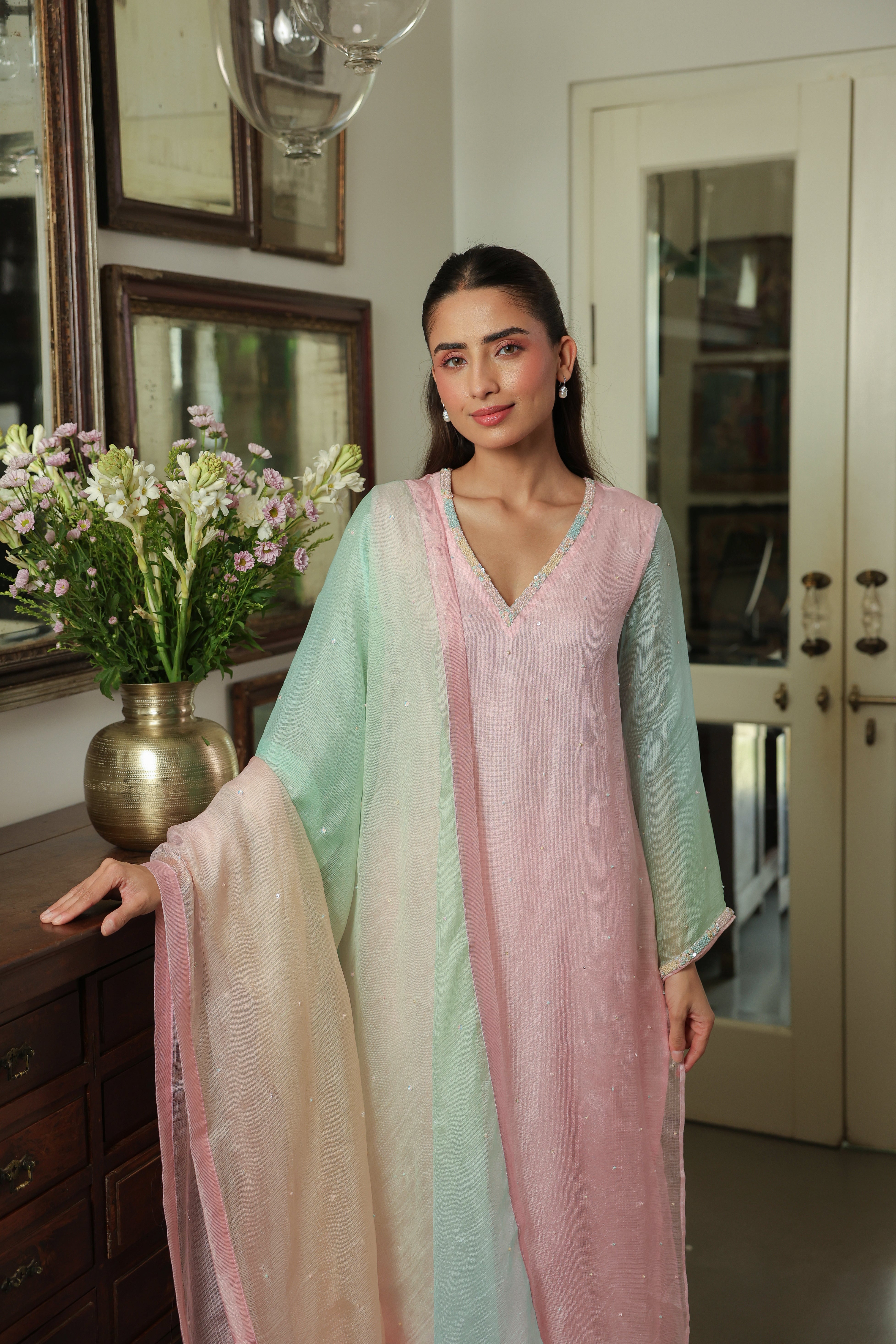 - Ombre Silk Doriya Dupatta with Chanderi facing and scattered embellishment all over.