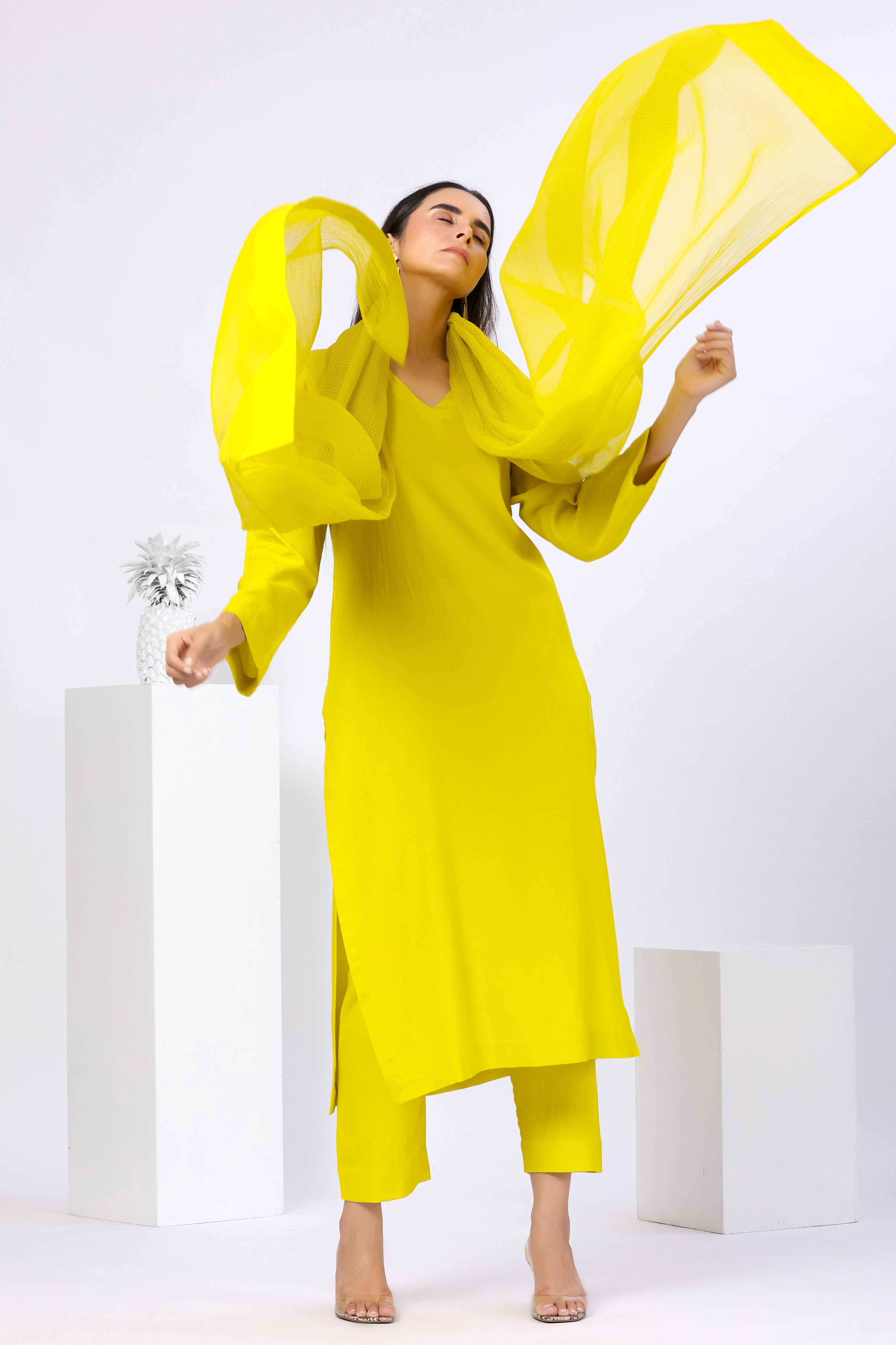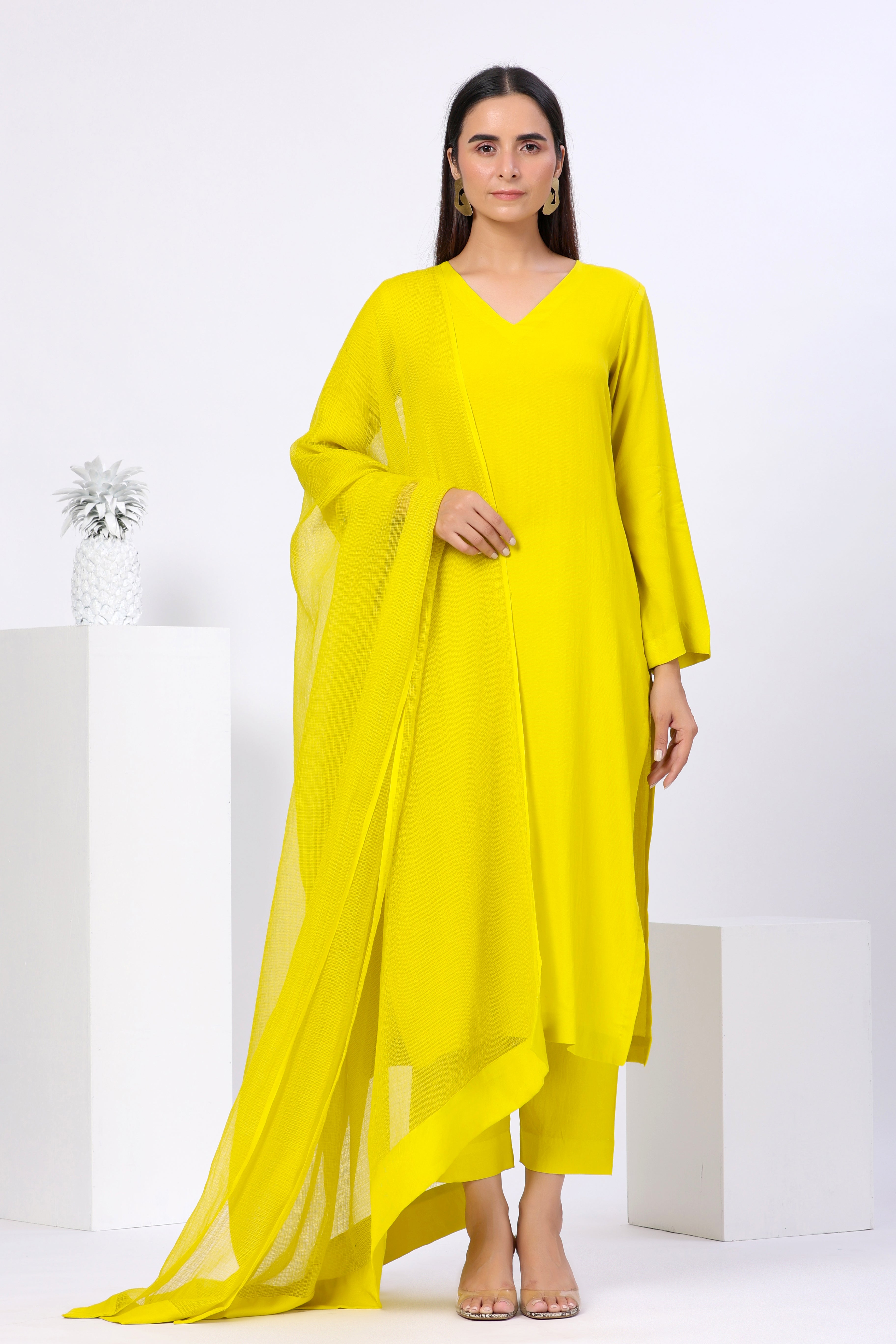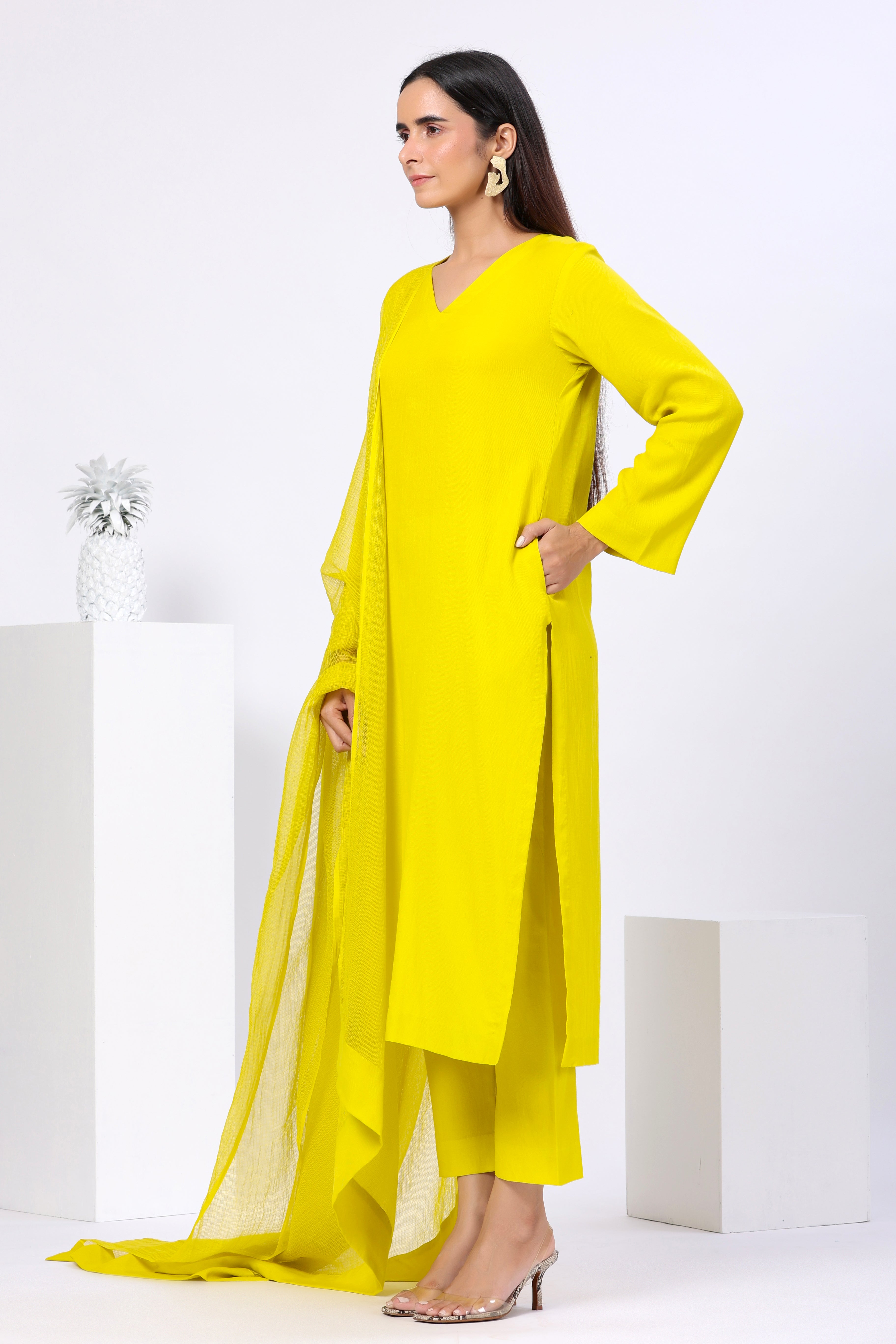 - Straight Fit Kurta with V Neckline, full sleeves and pockets on both sides.
