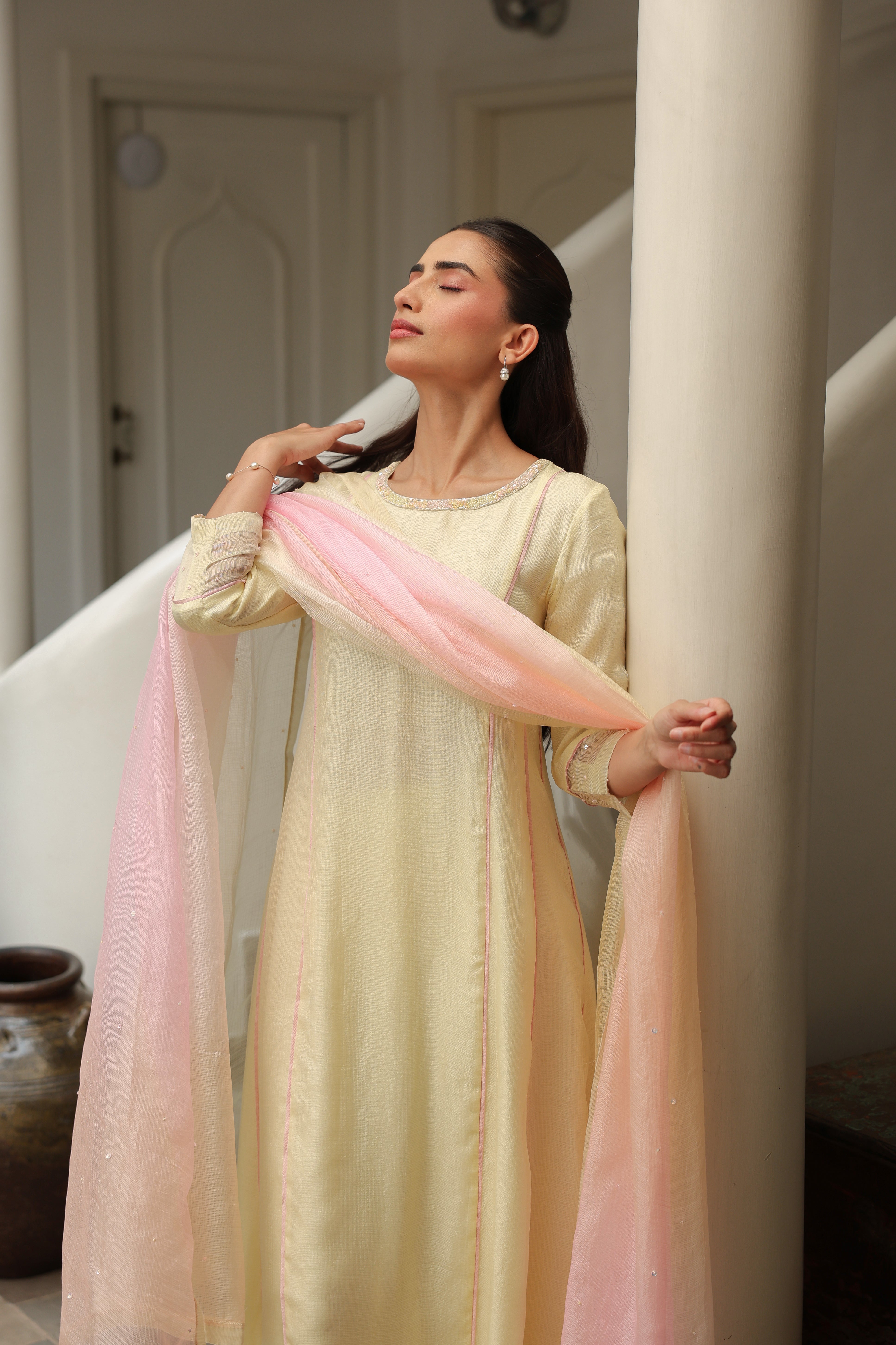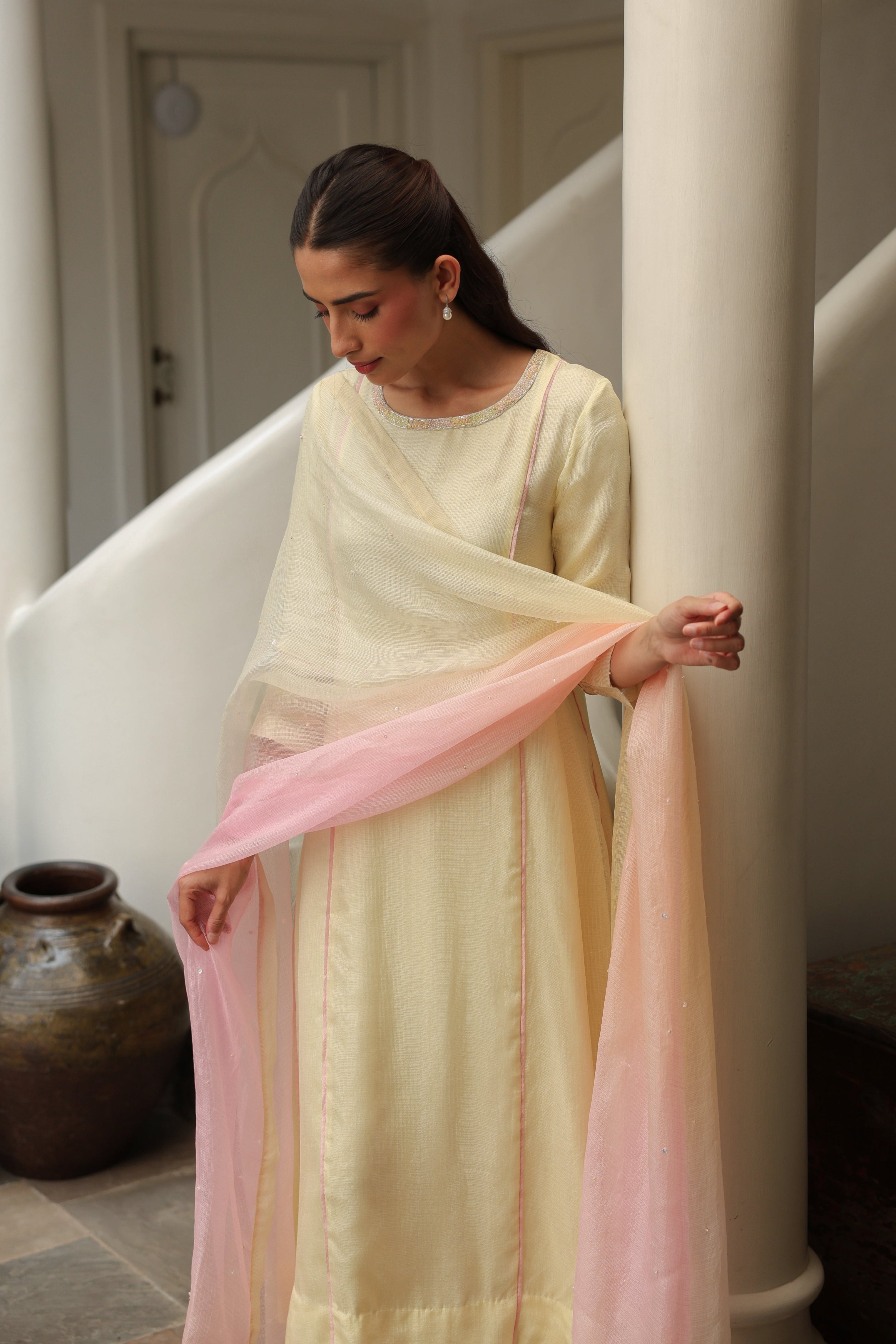 - Ombre Silk Doriya Dupatta with Chanderi facing and scattered embellishment all over.