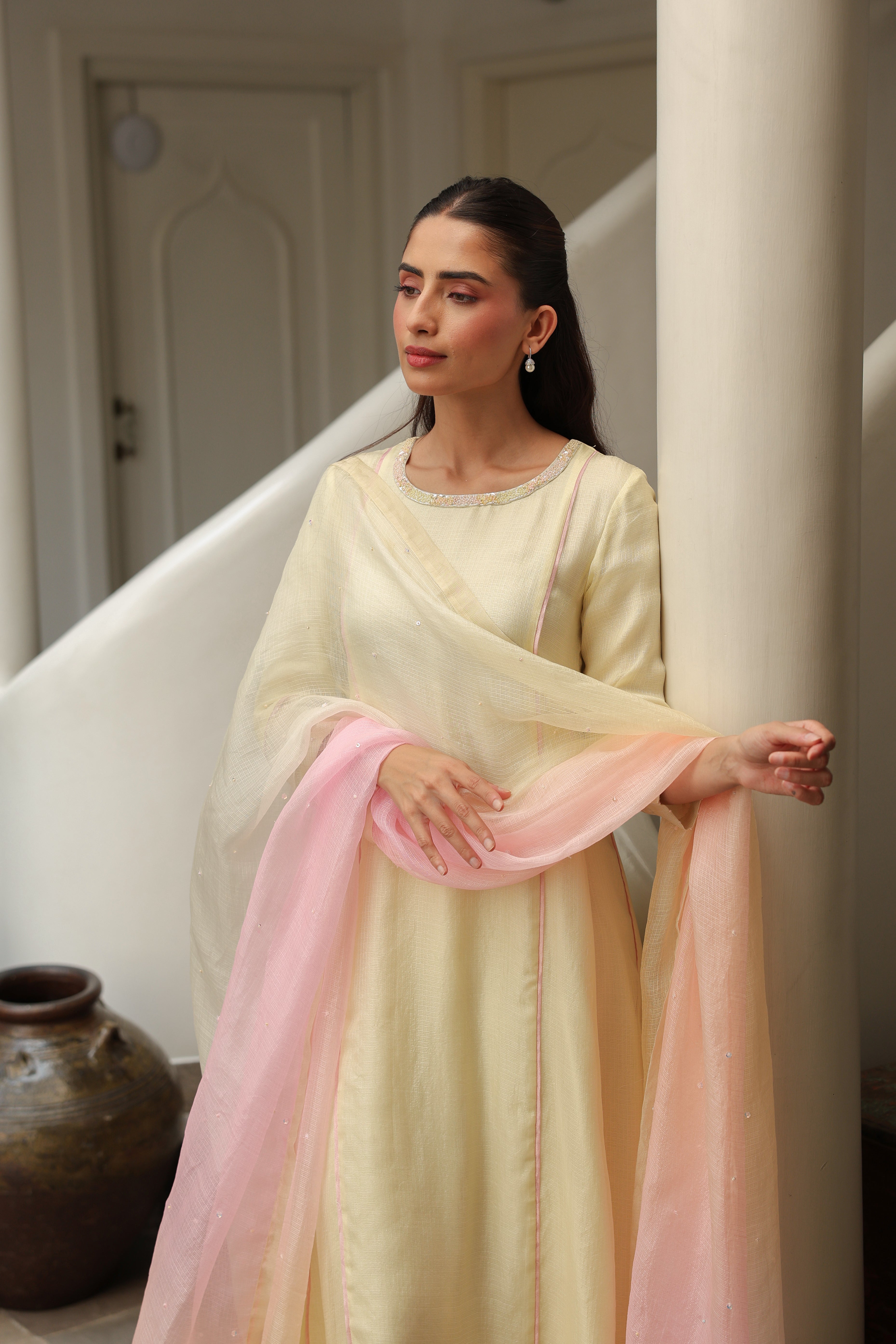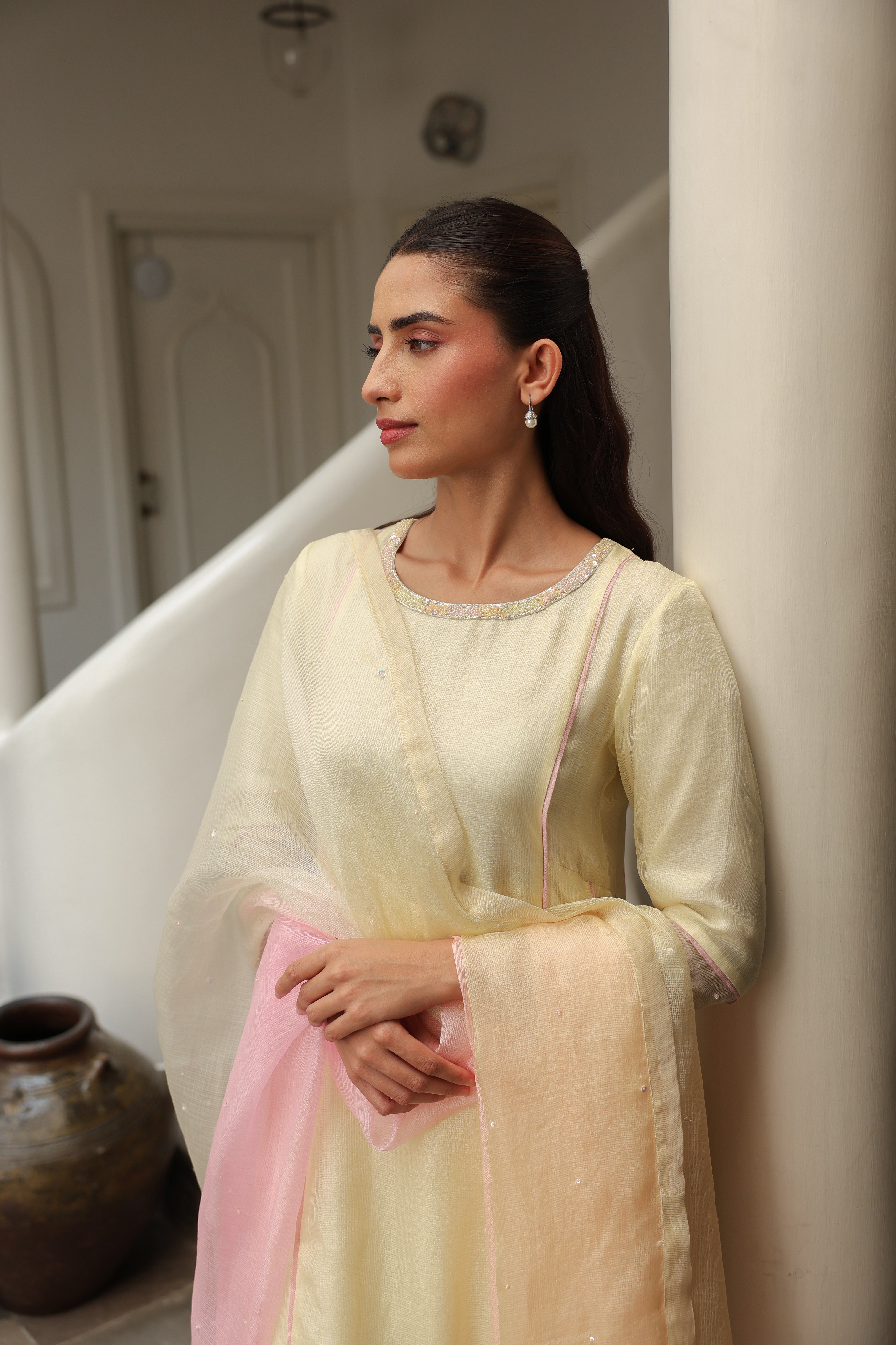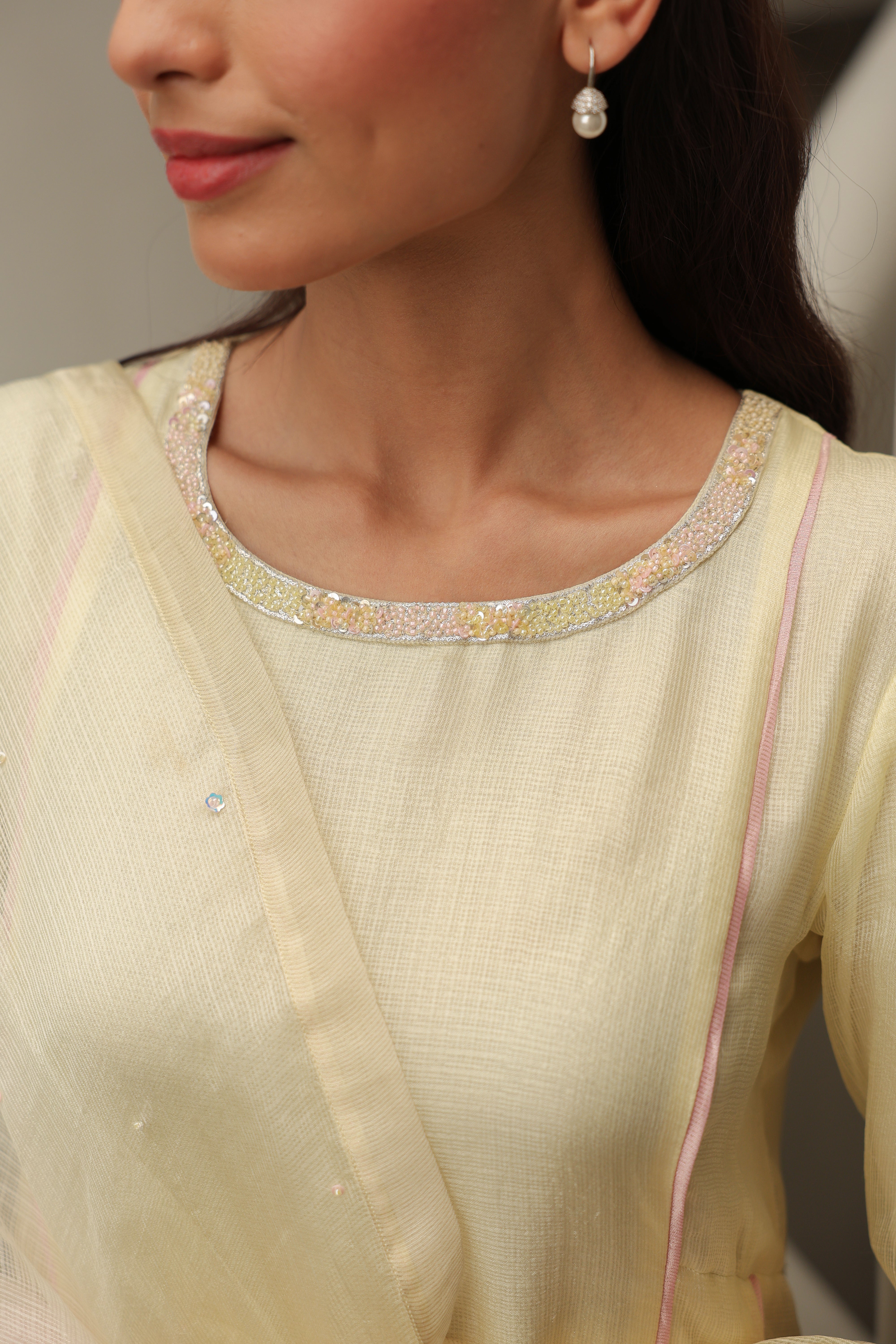 - Full A line Kurta with round neckline that has border handwork on neckline.