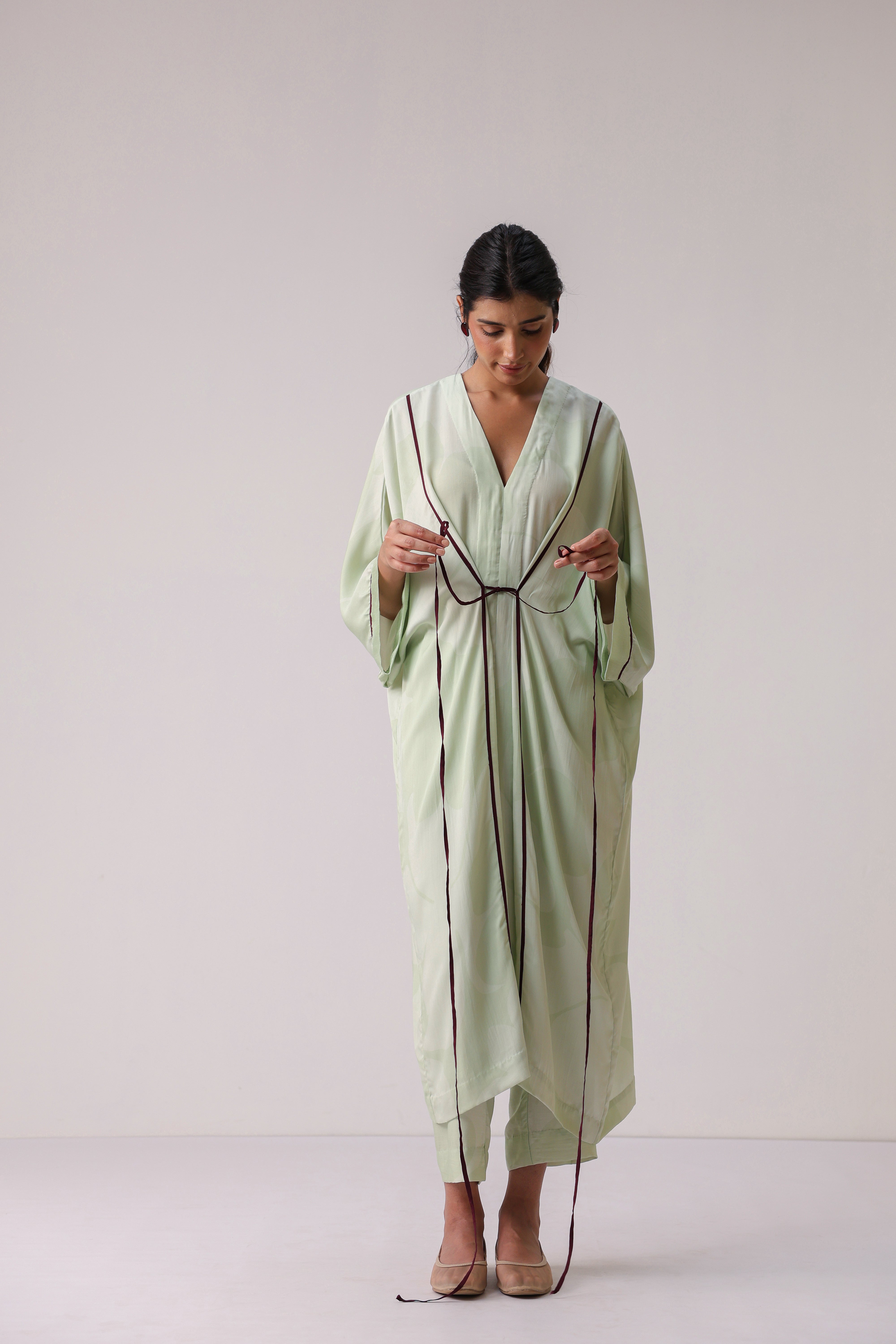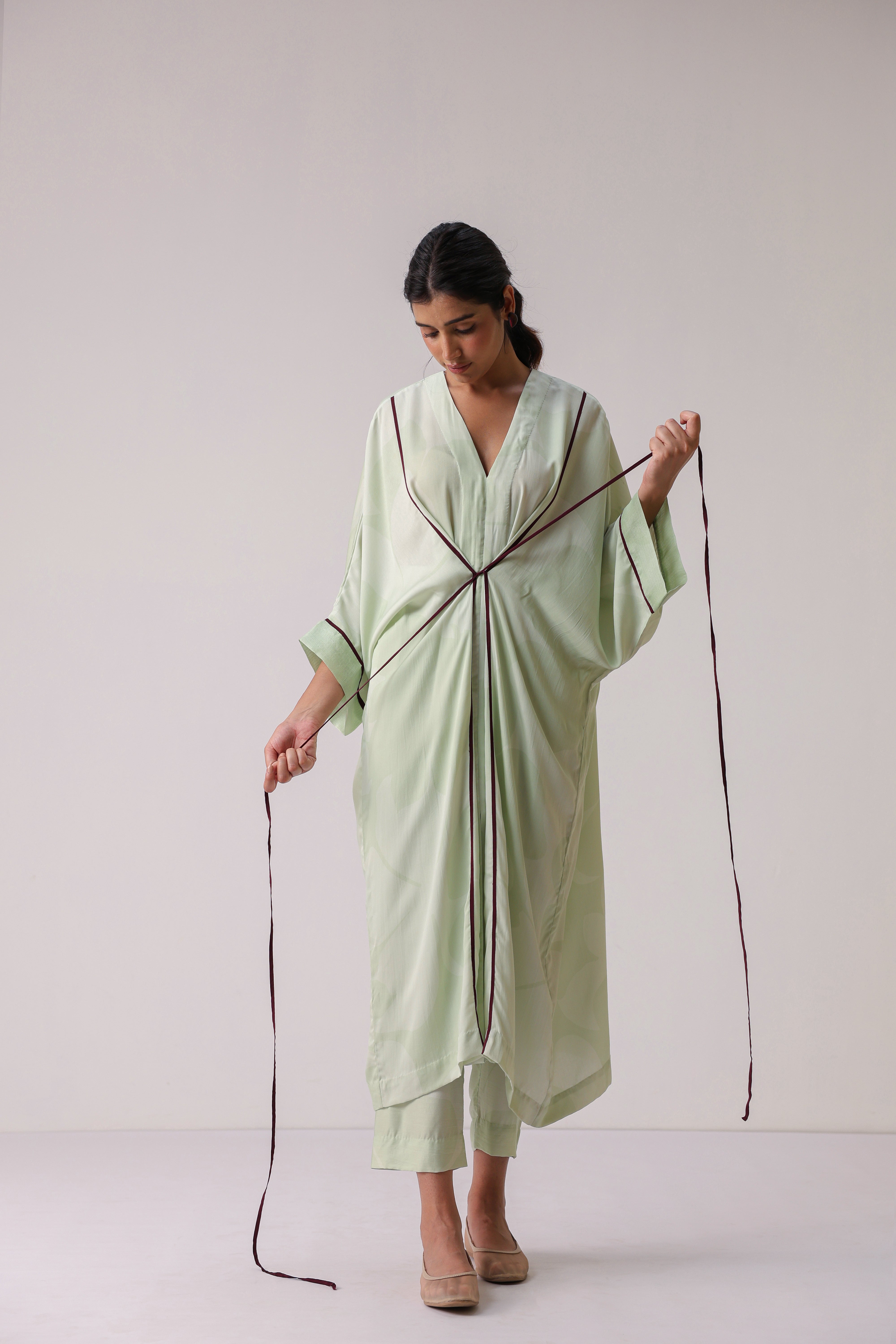 - Half sleeves free size Kaftan with contrast tie ups in front.