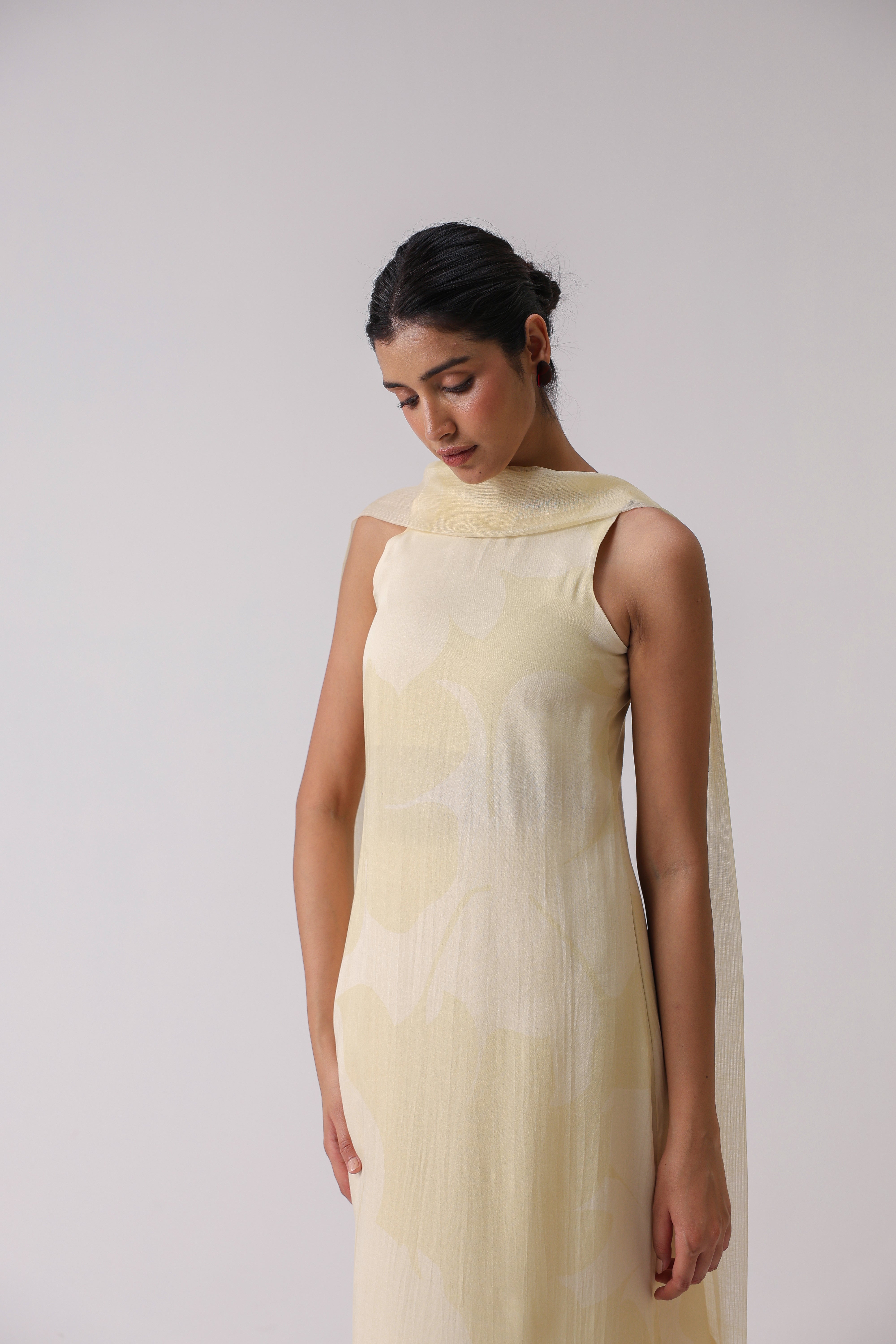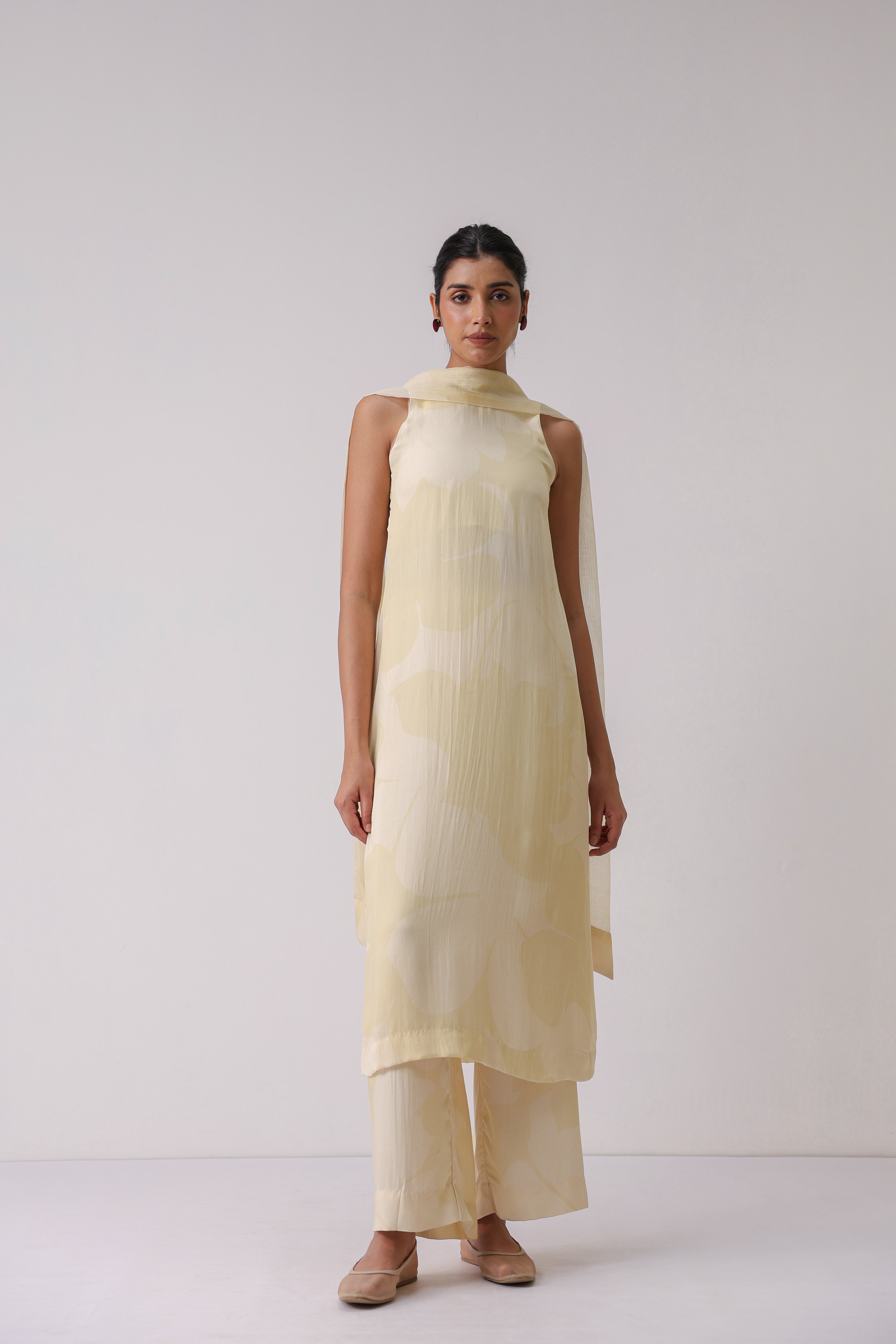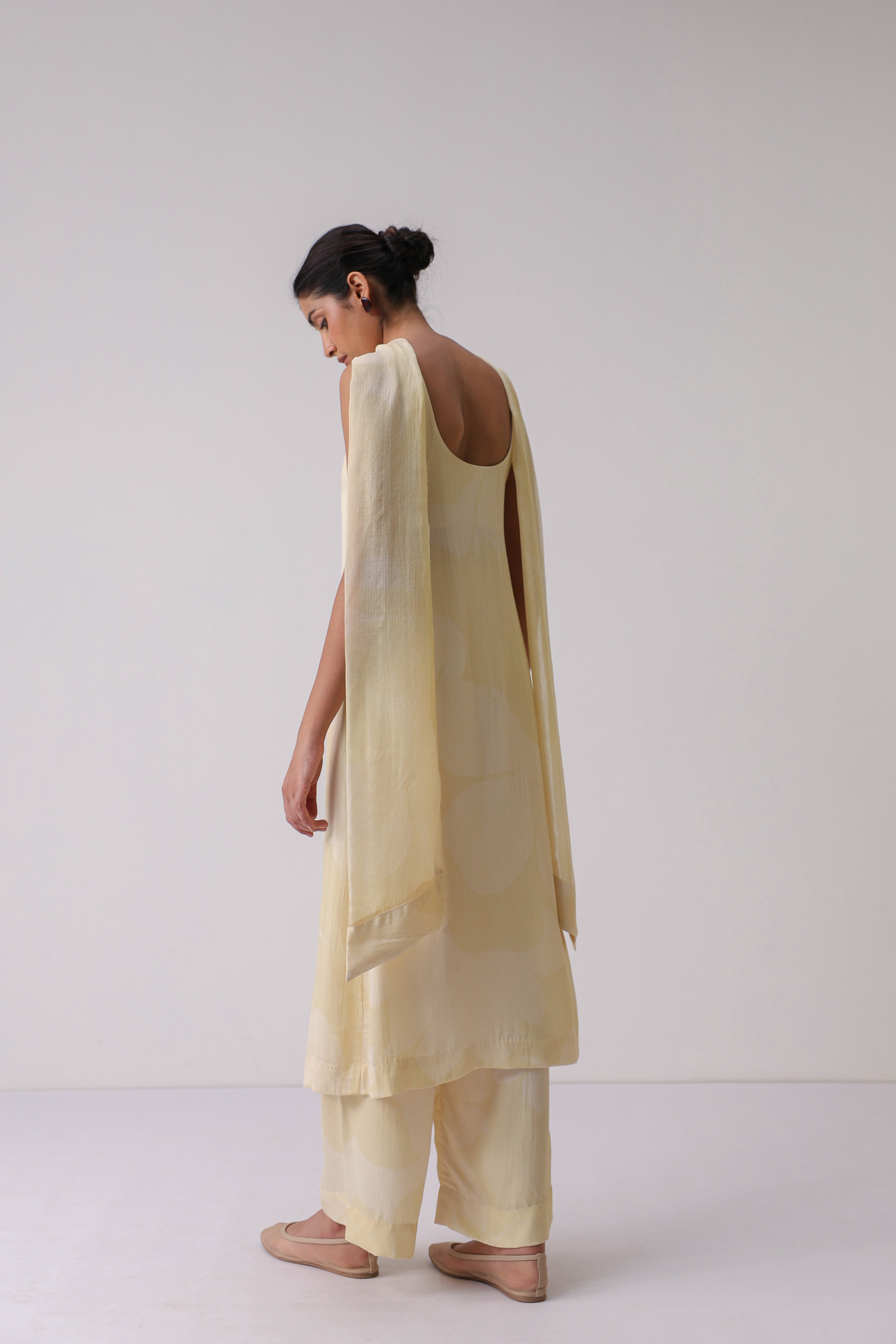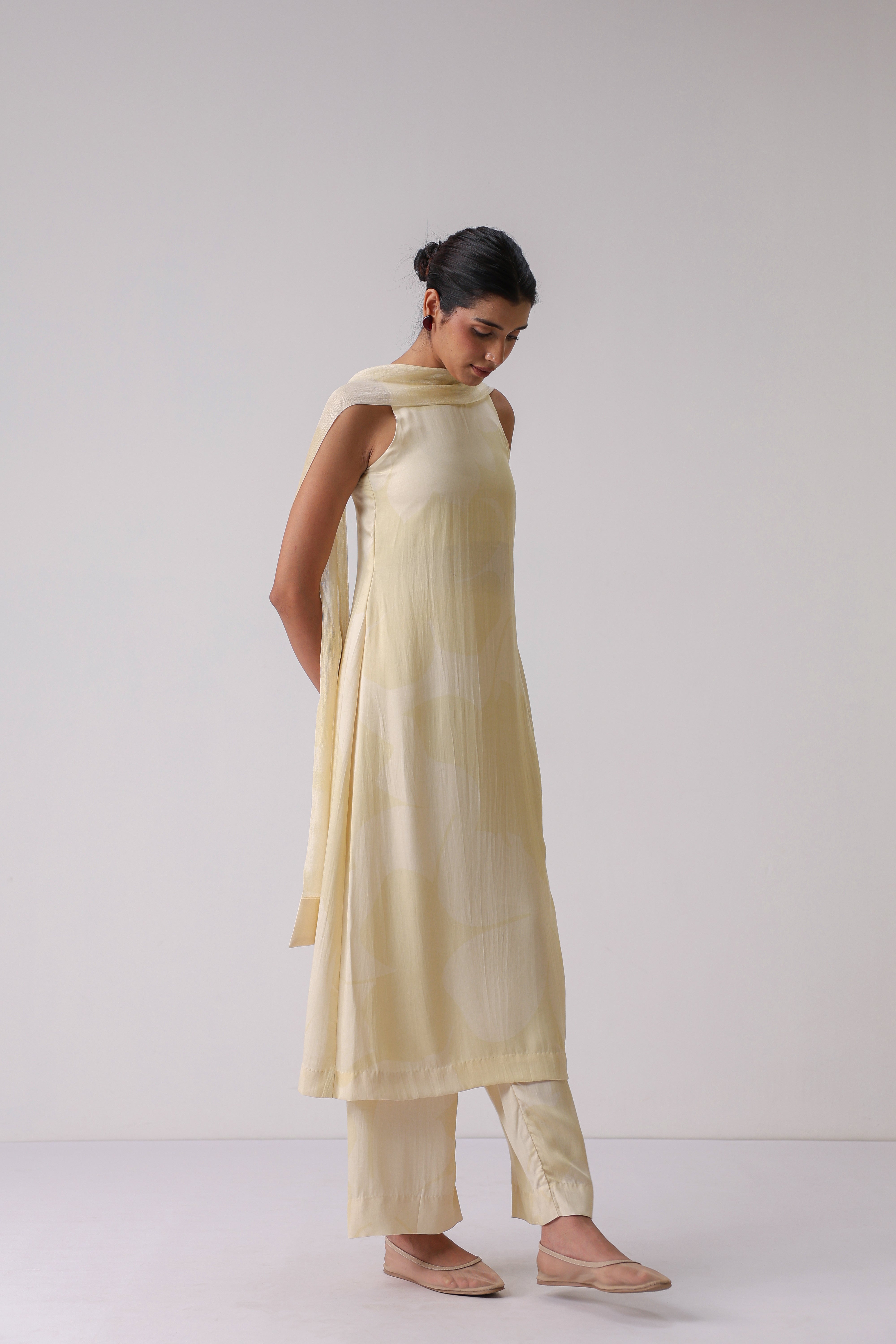 - Sleeveless Kurta with close round neckline in front and deep round neckline in back. This Kurta comes with an attached Stole.