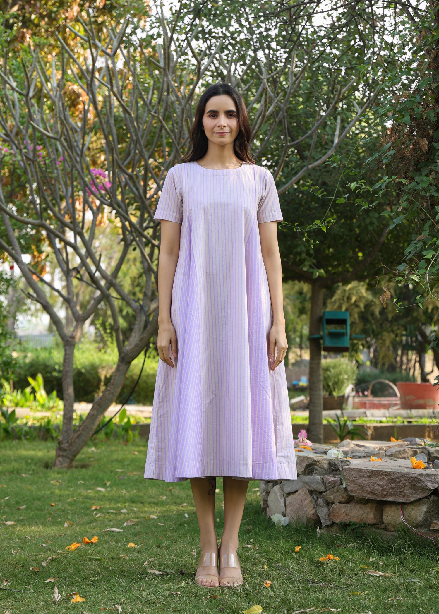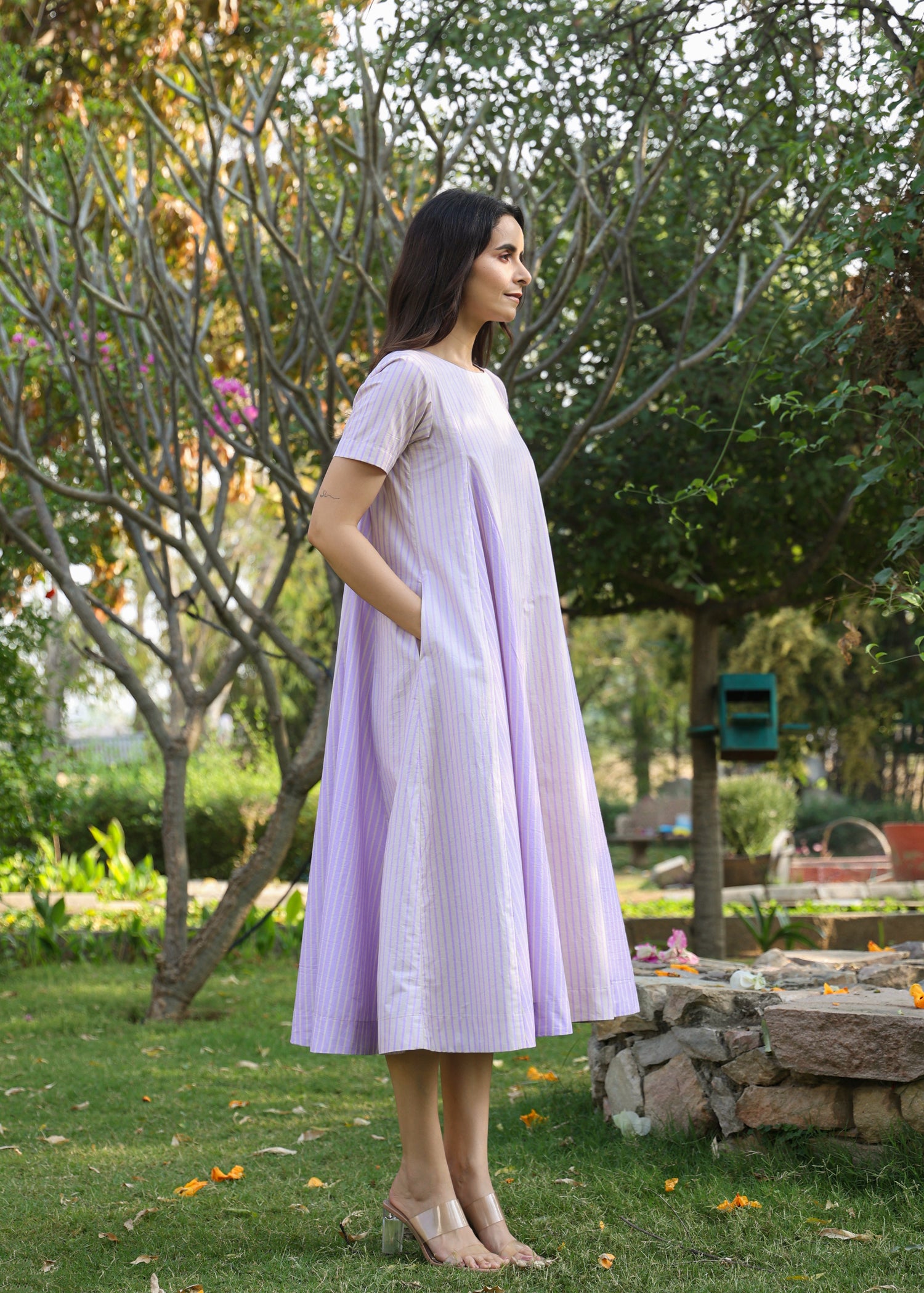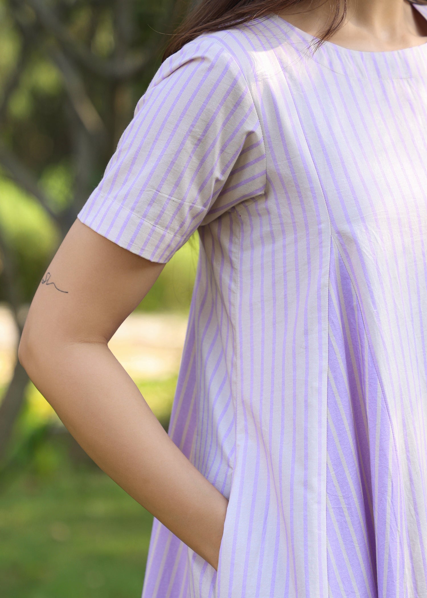 Striped Poplin A-line Dress with closed round neckline, short sleeves and pocket on both sides.