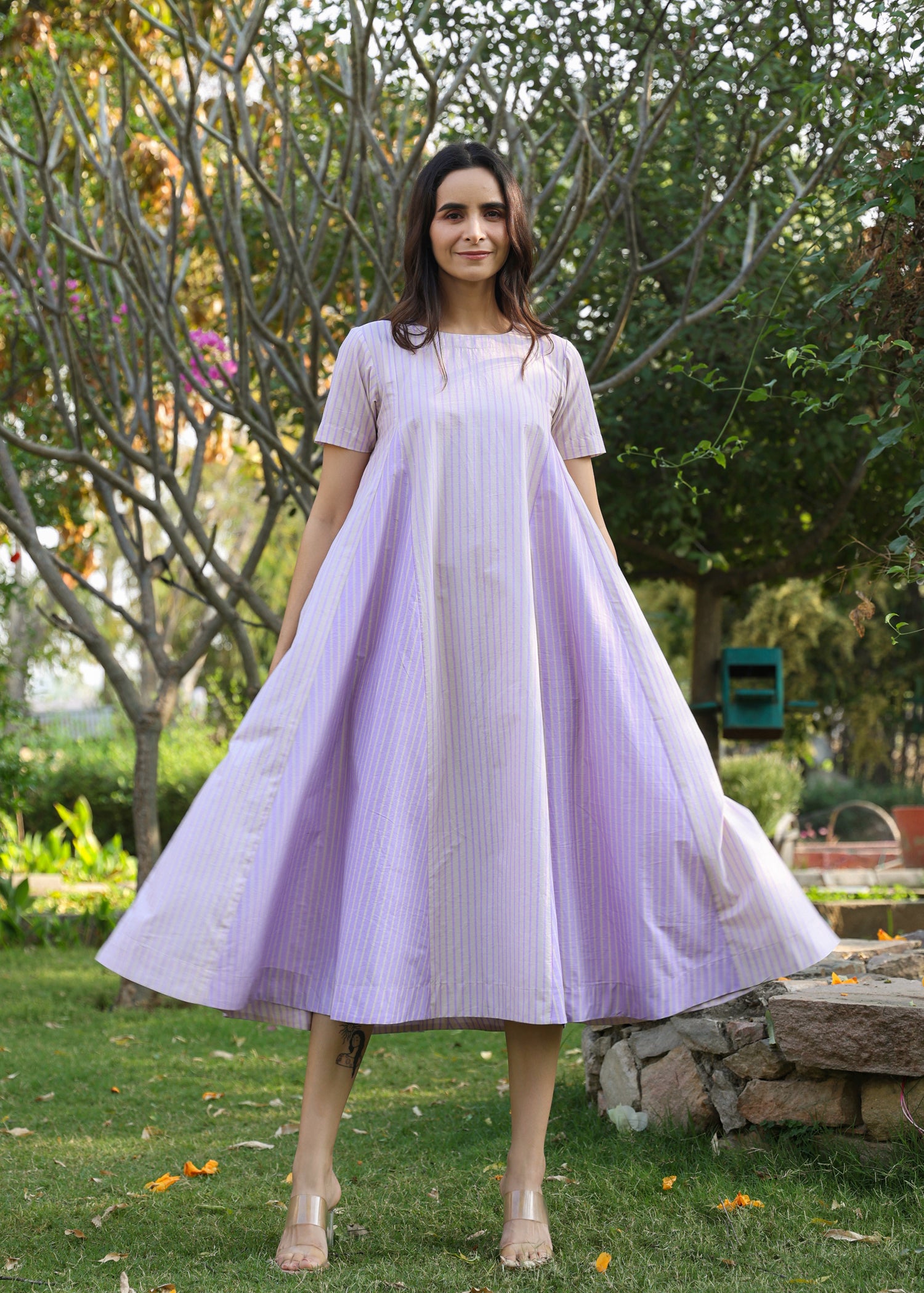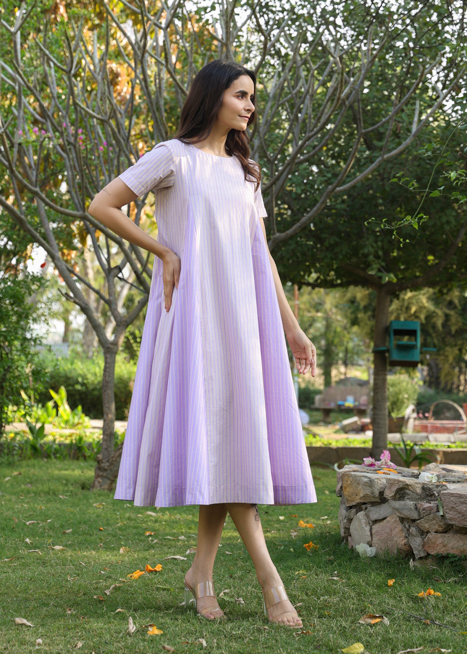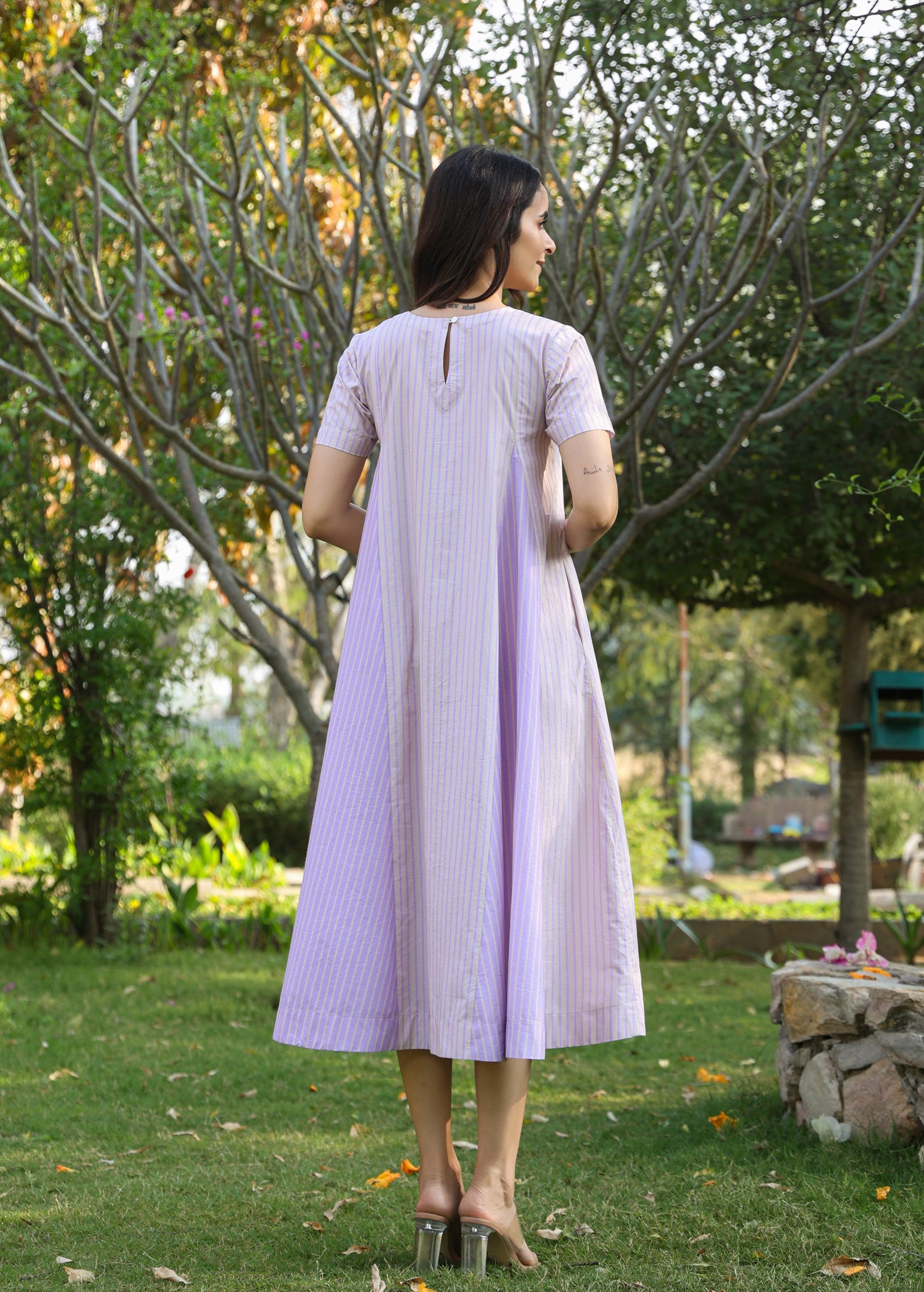 Striped Poplin A-line Dress with closed round neckline, short sleeves and pocket on both sides.