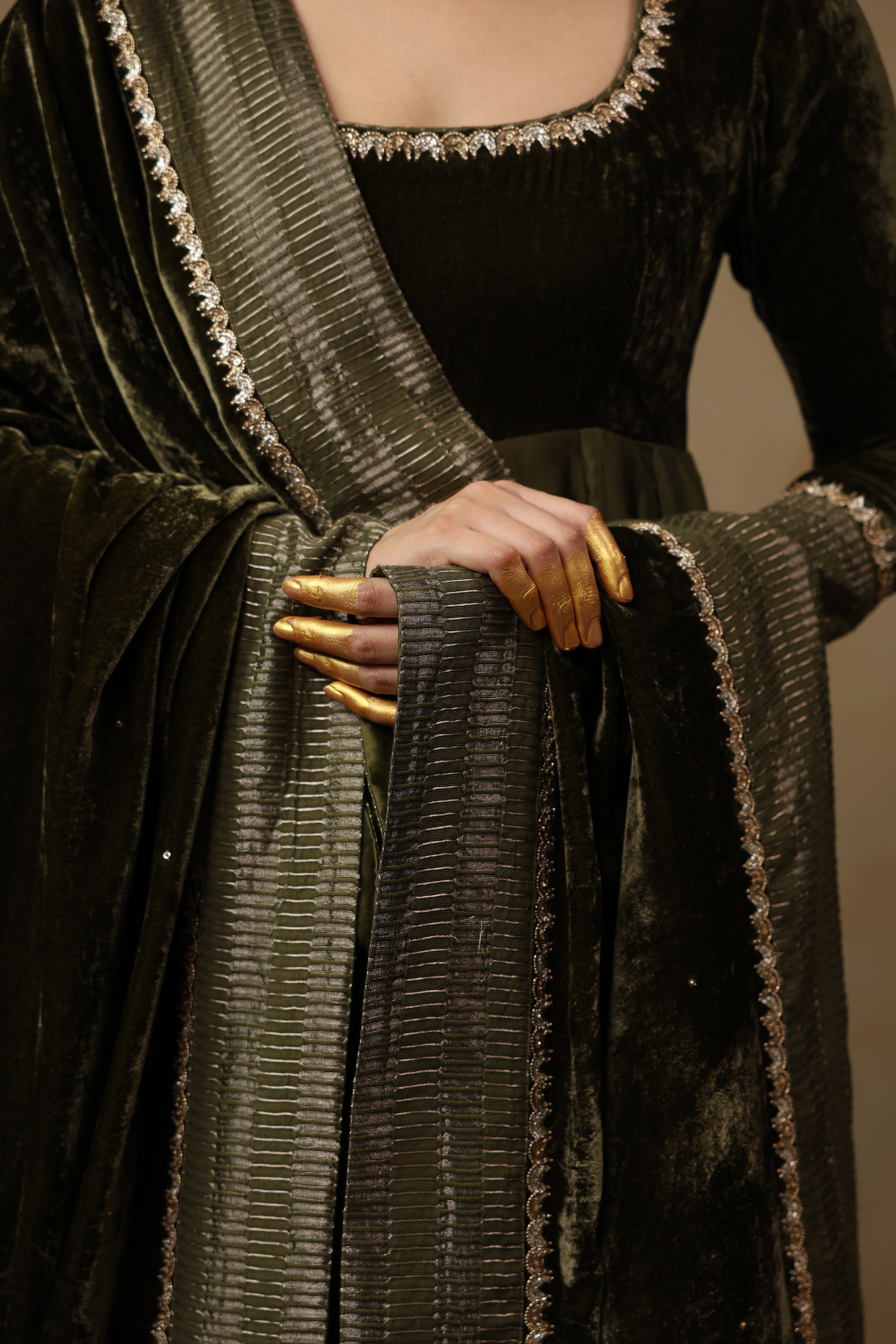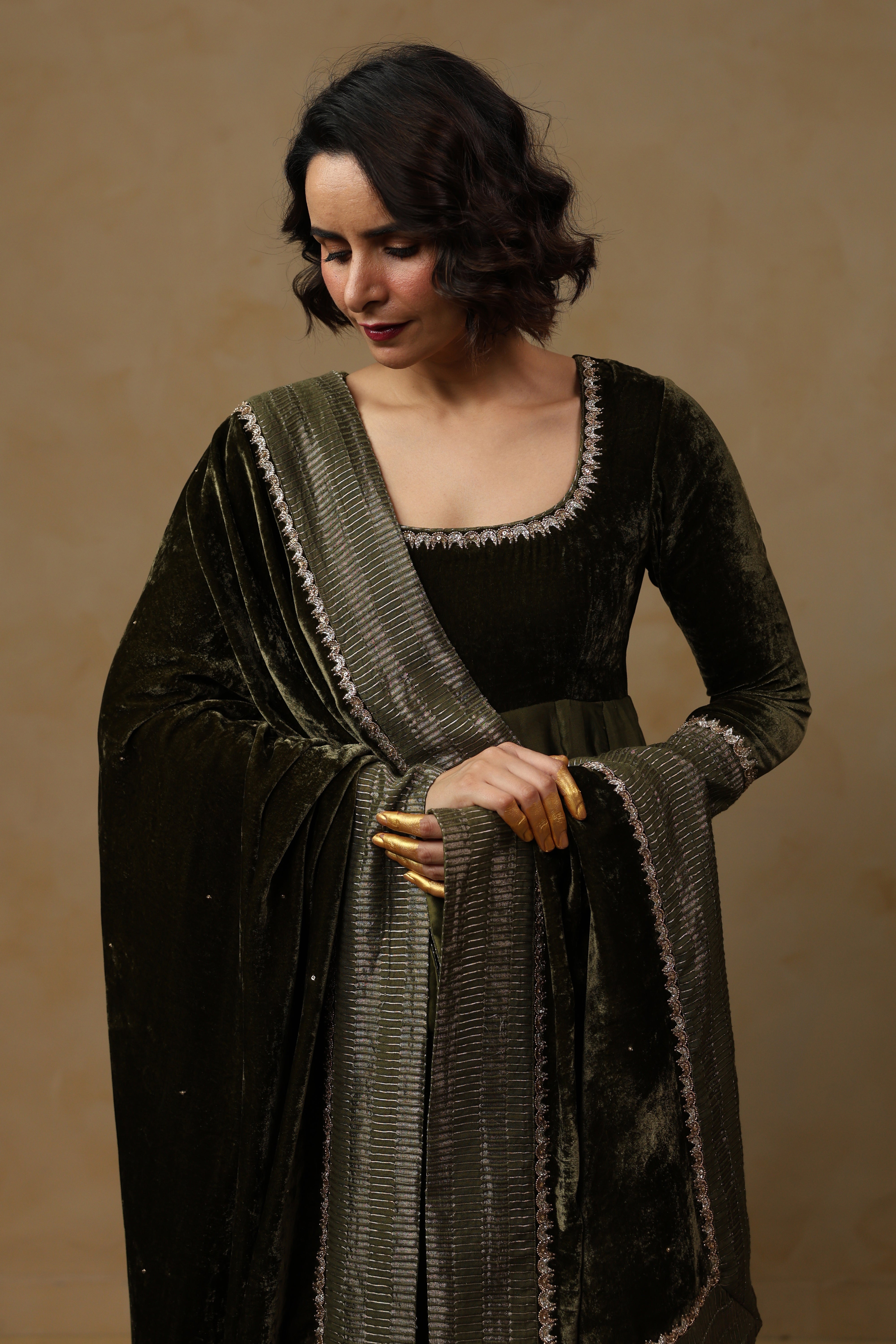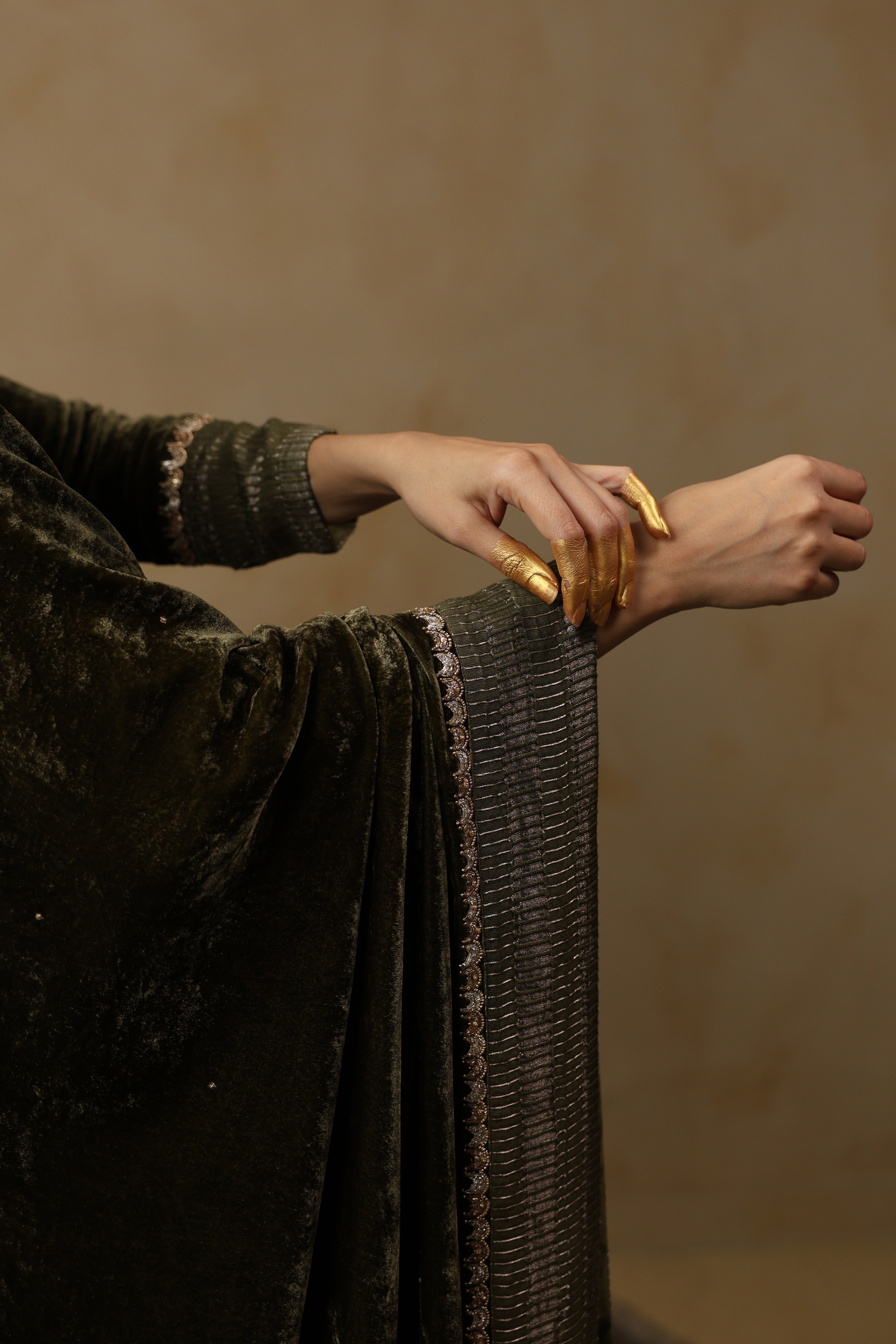 - Velvet Dupatta featuring intricate hand embellishment and finished with a tissue Chanderi facing along the border.