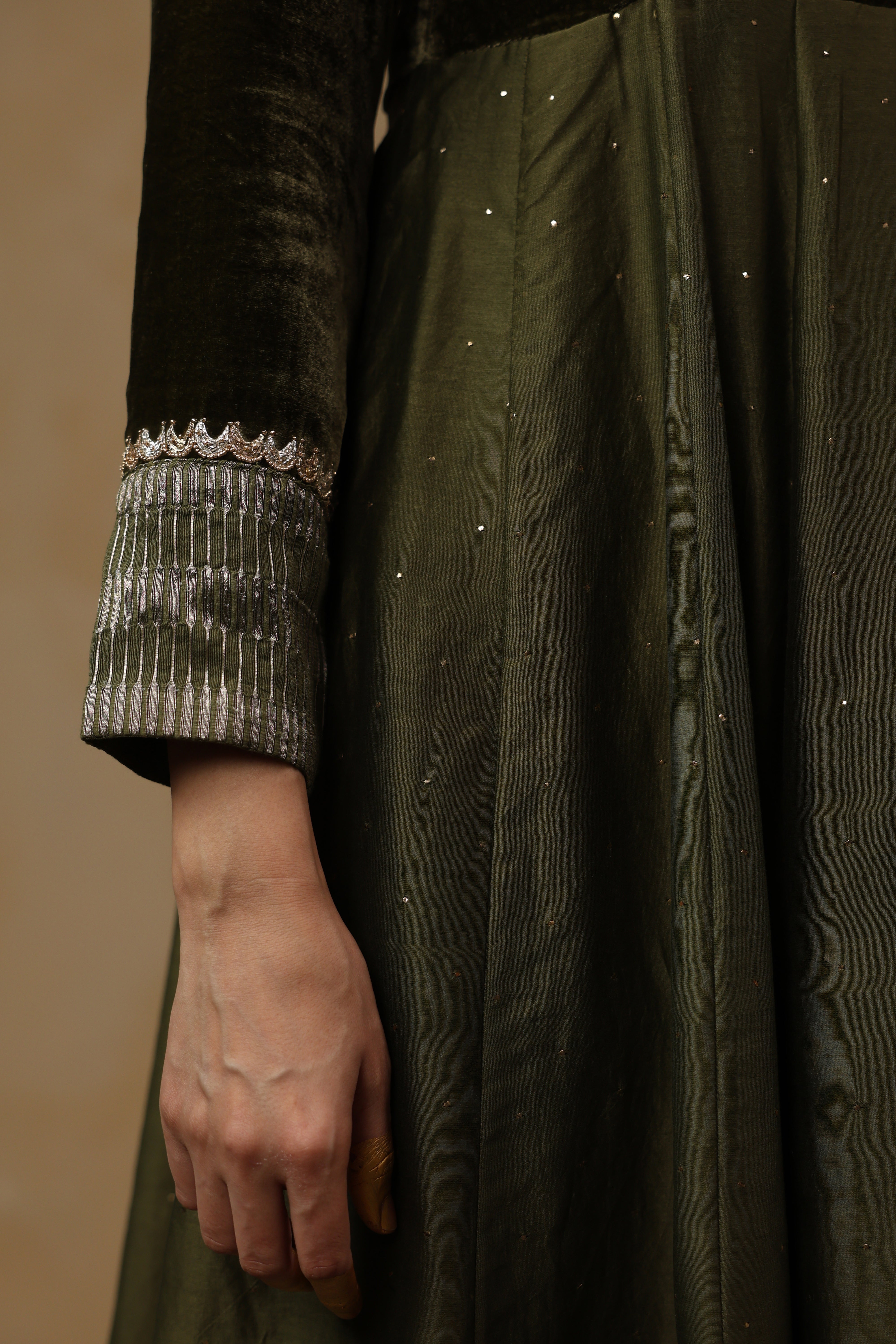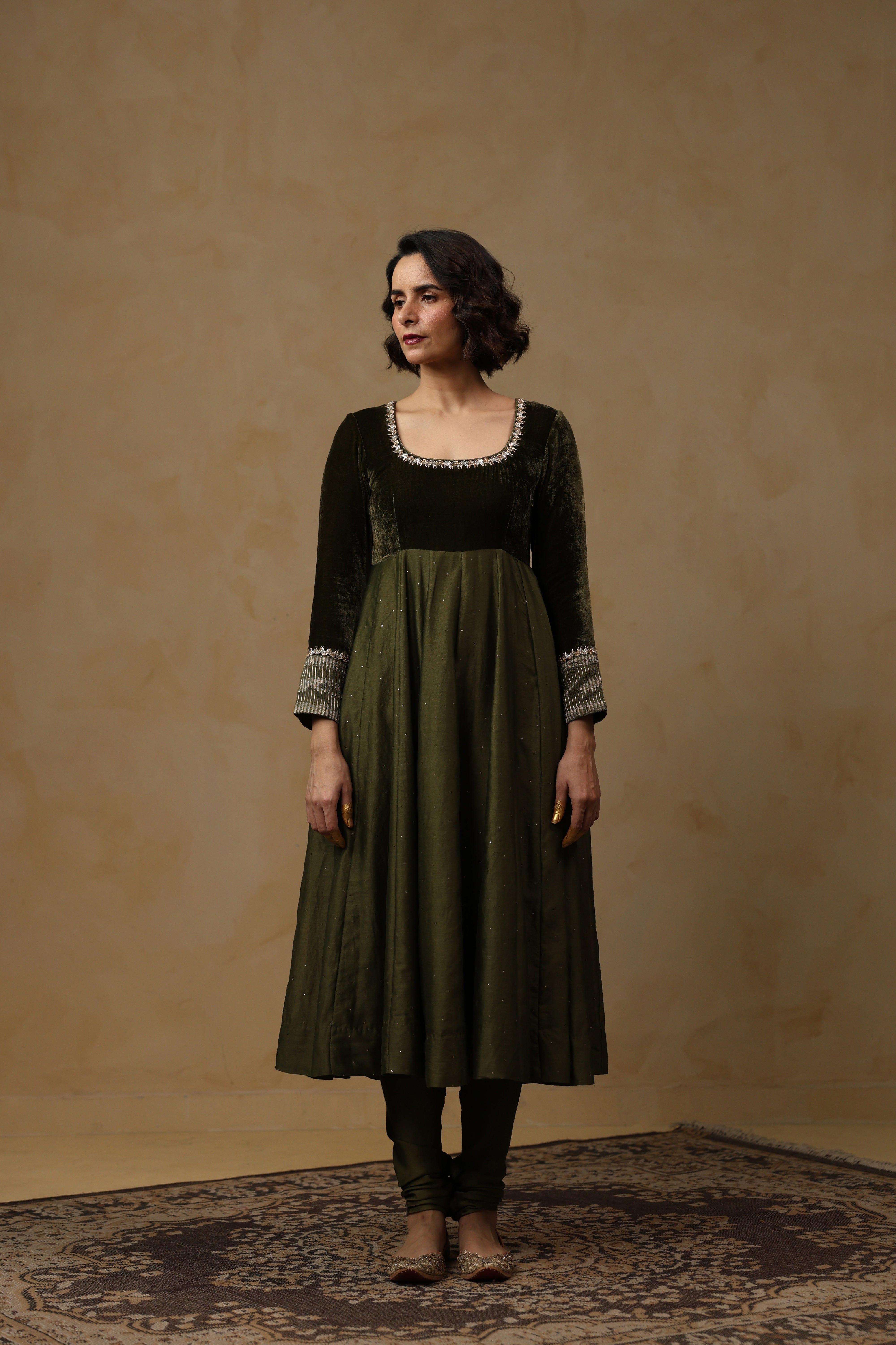 - Full Sleeves Anarkali Kurta with a deep round neckline, adorned with delicate hand embellishment on the neckline and sleeves, and a graceful flare highlighted with all-over mukaish.