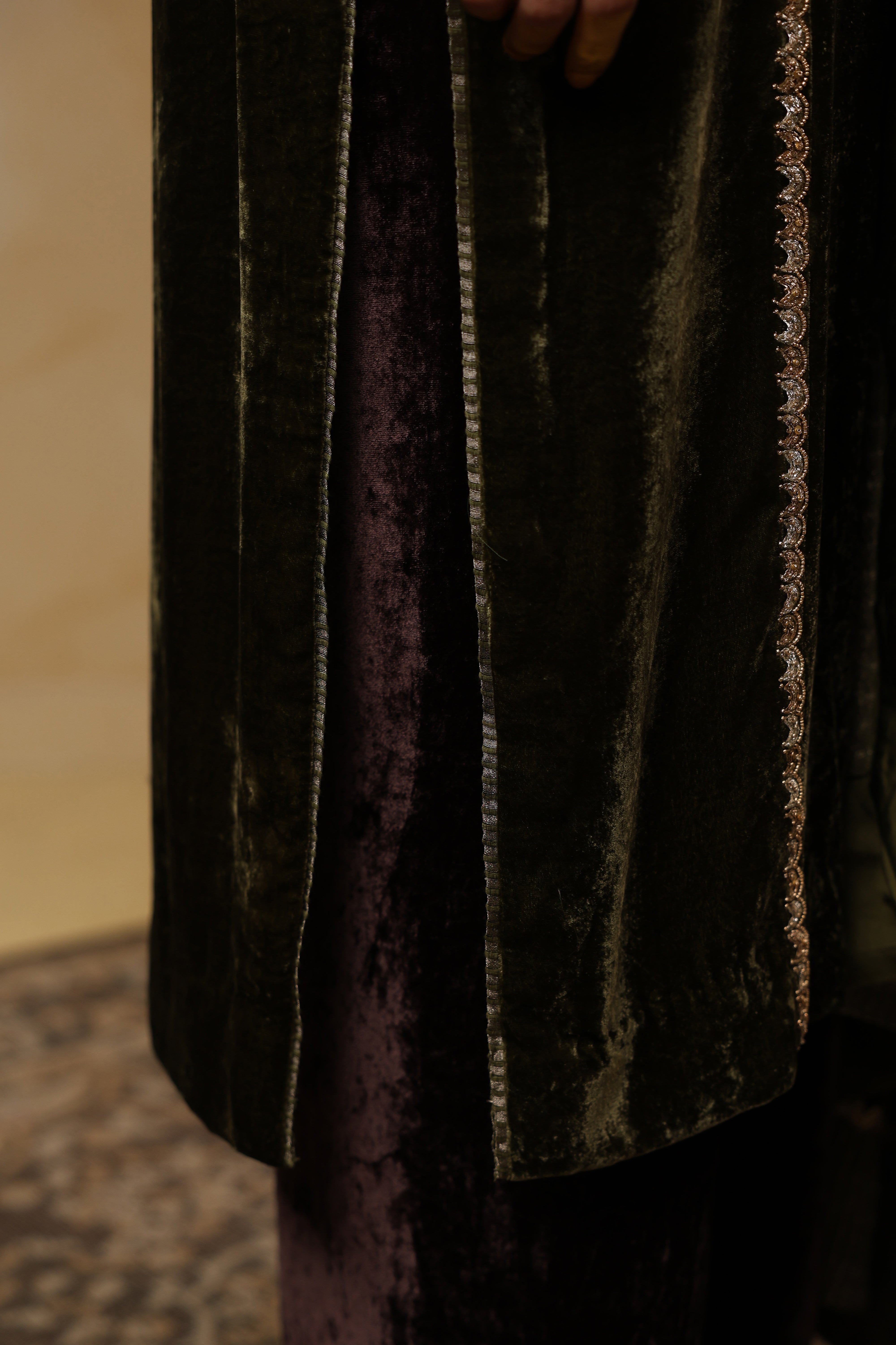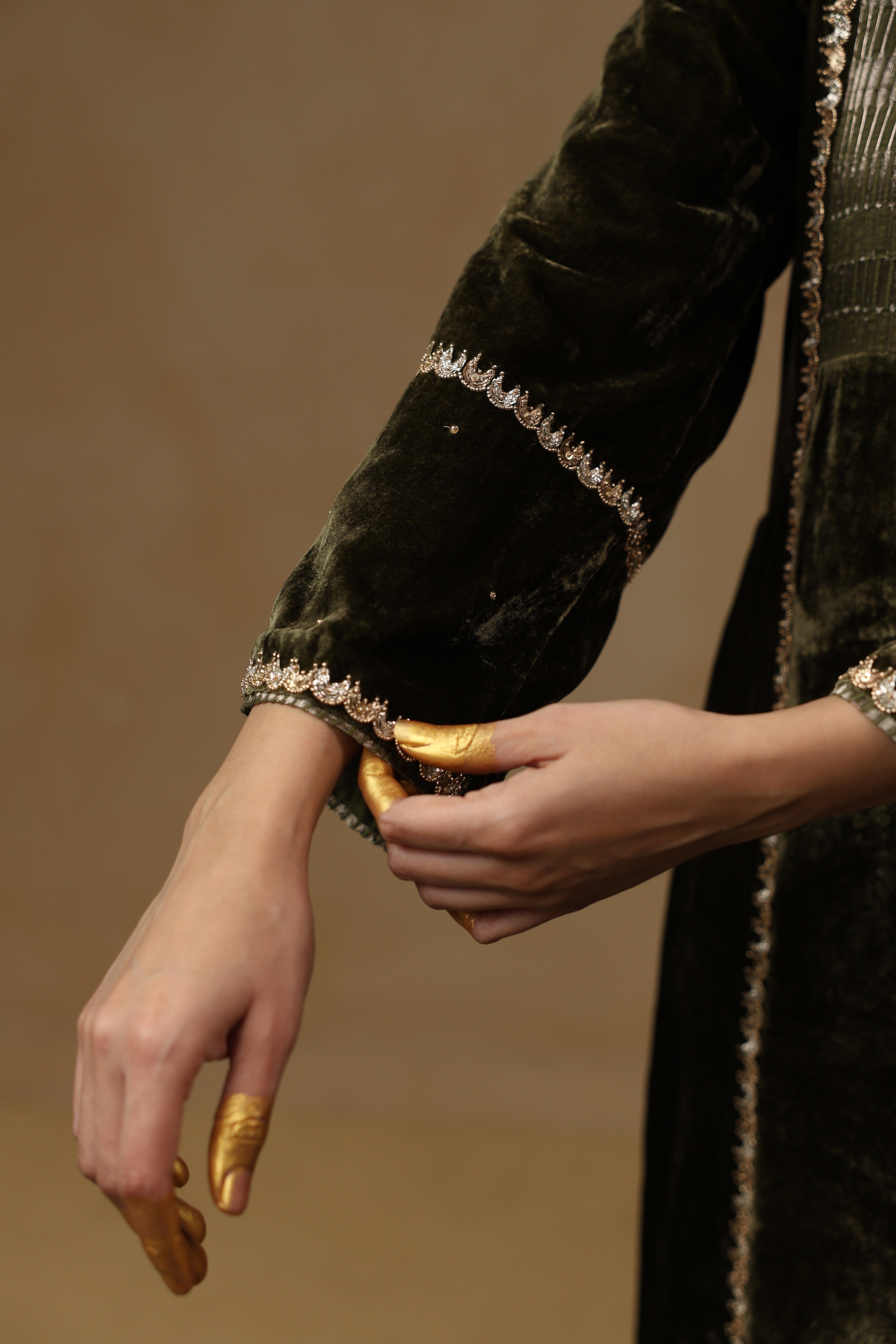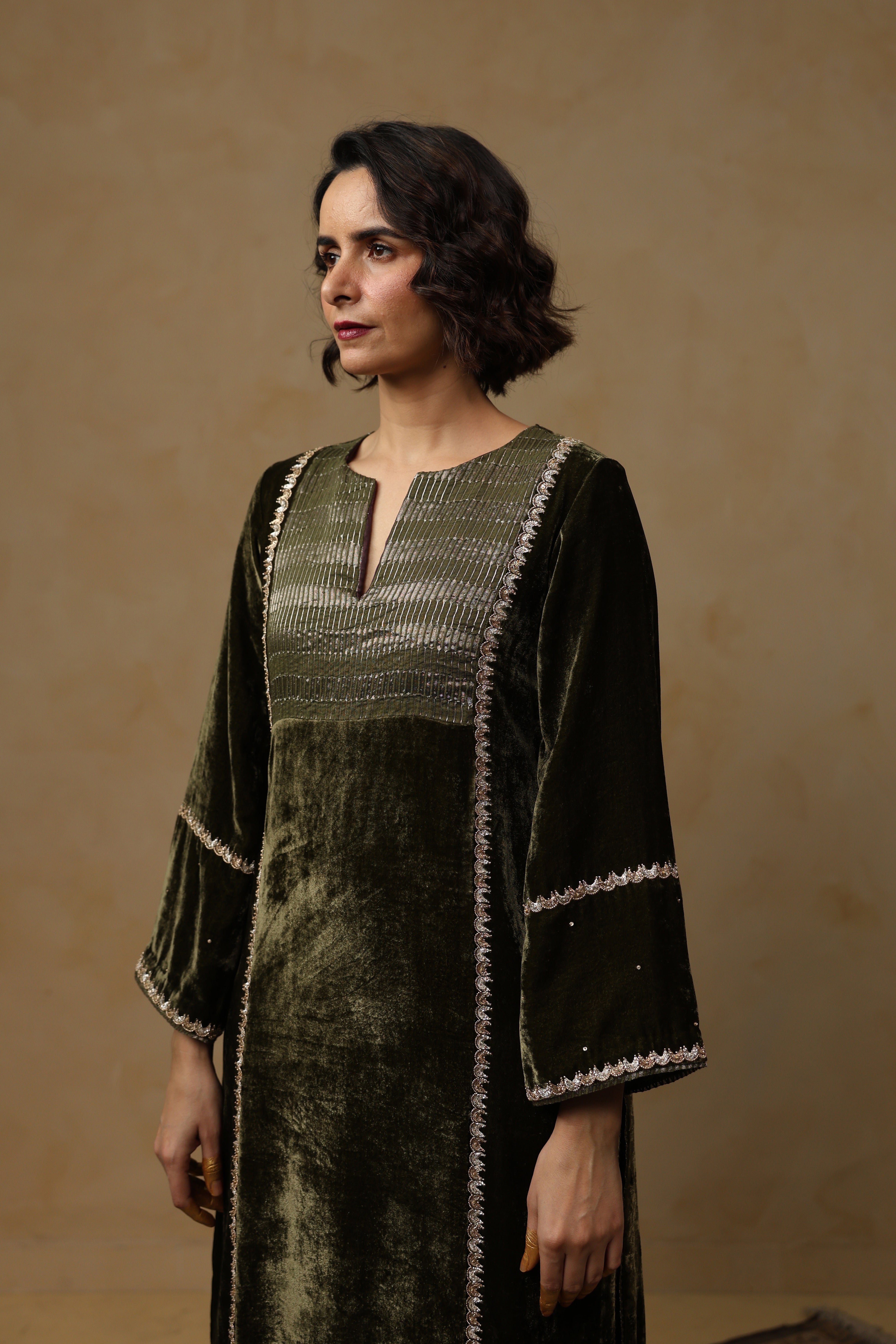 - Full Sleeves Straight Kurta featuring a tissue Chanderi patch on the front and a refined slash neckline, highlighted with delicate handwork along the front and sleeves.