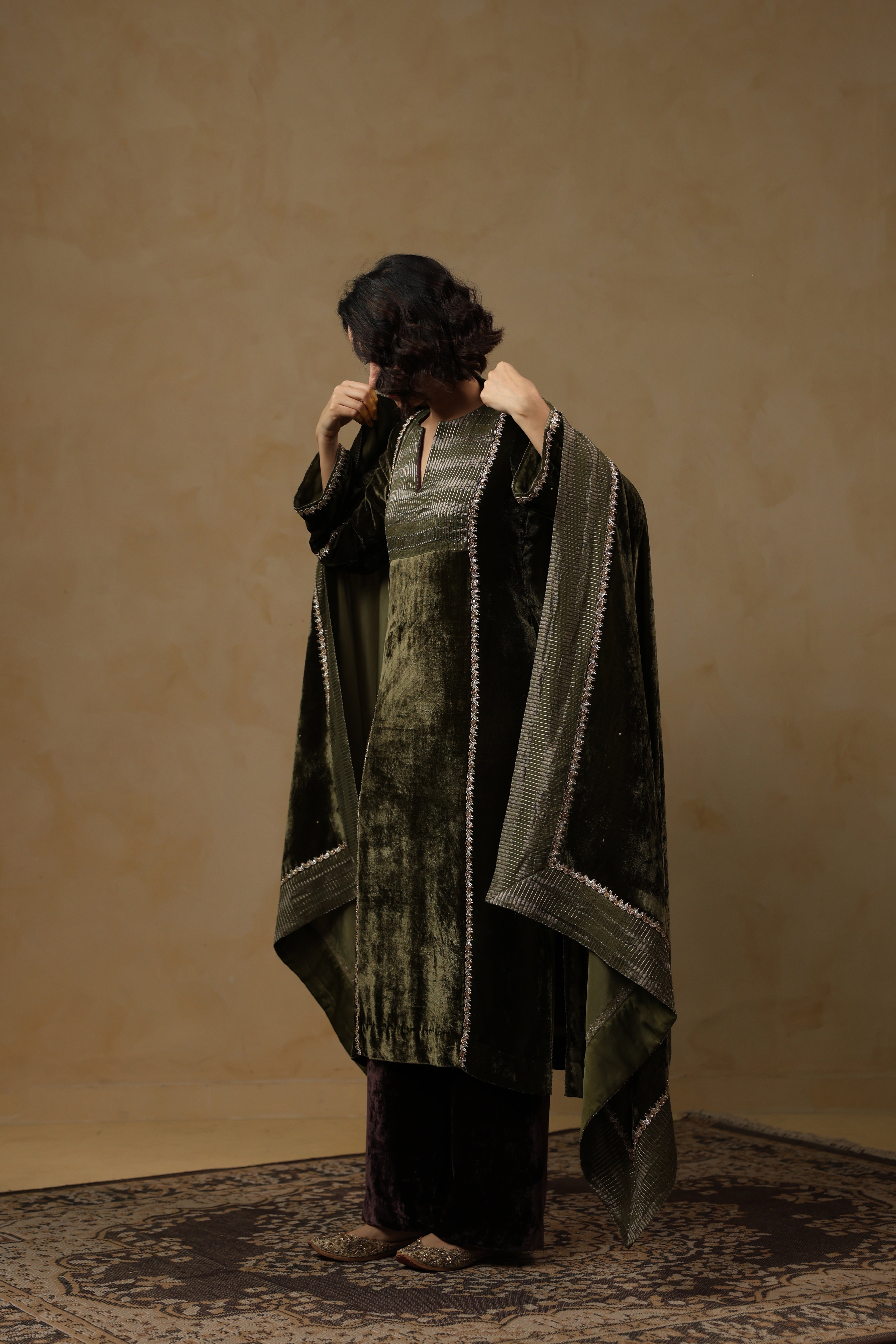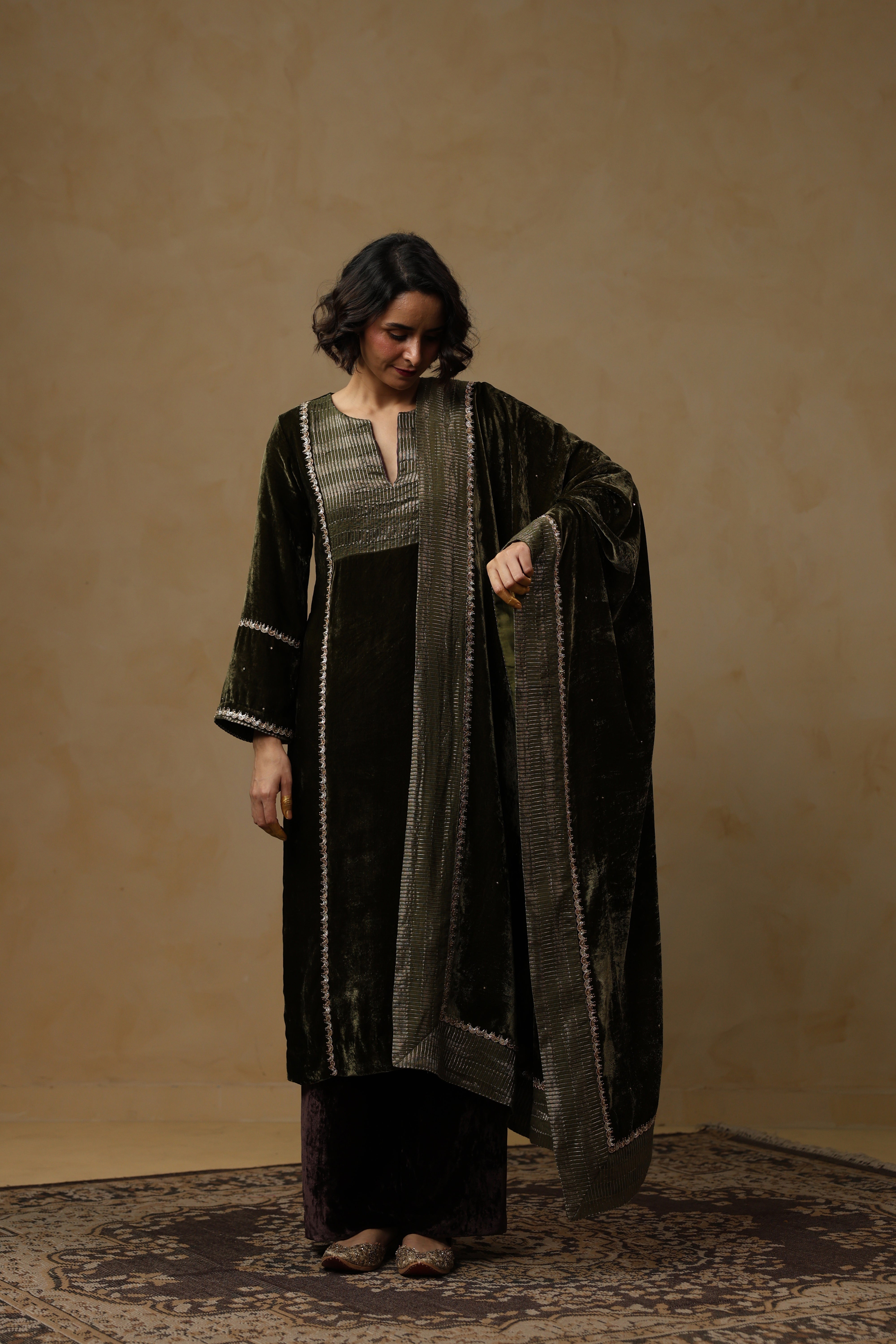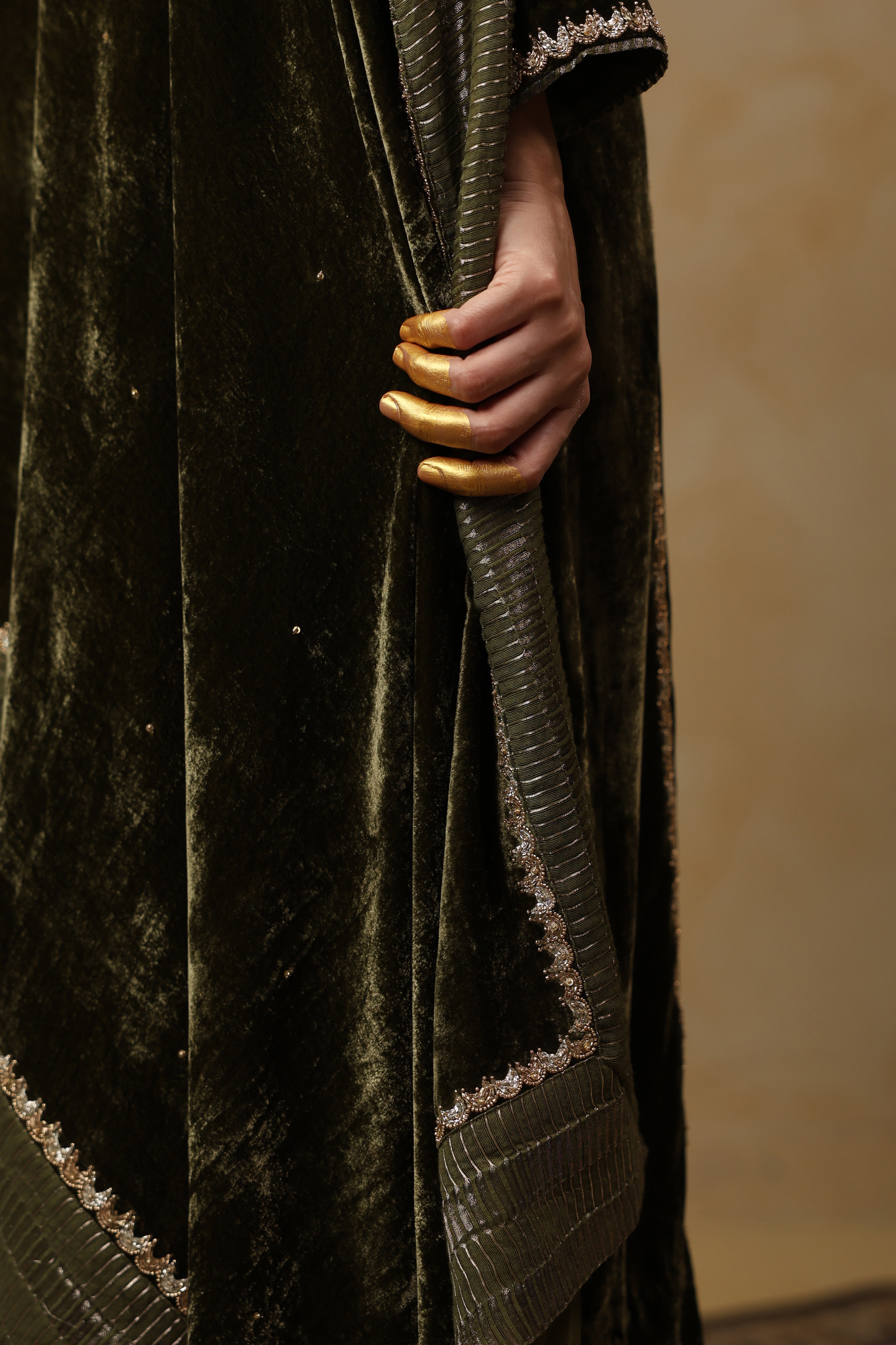 - Velvet Dupatta adorned with intricate handwork and finished with a refined tissue Chanderi facing along the border.