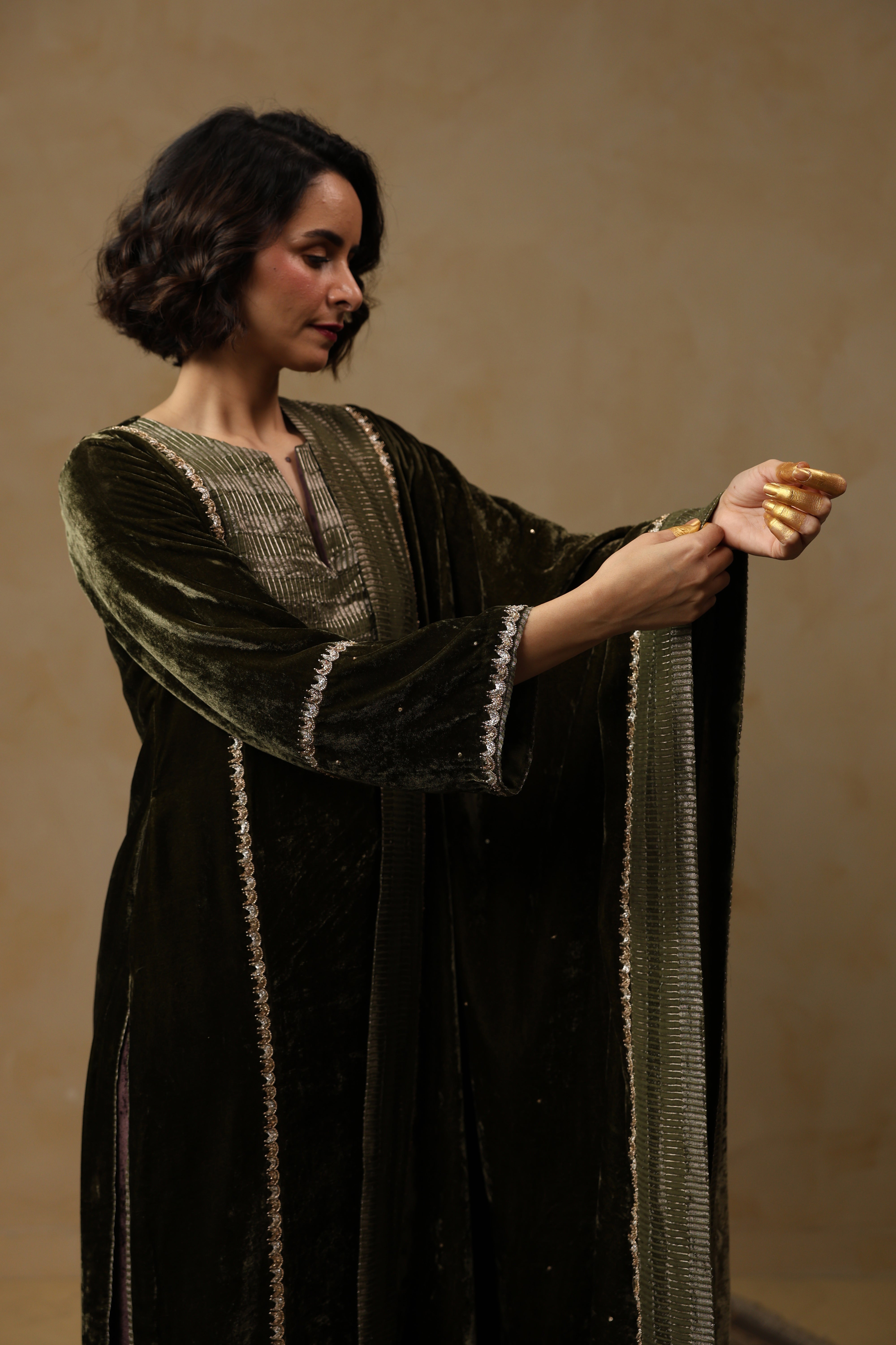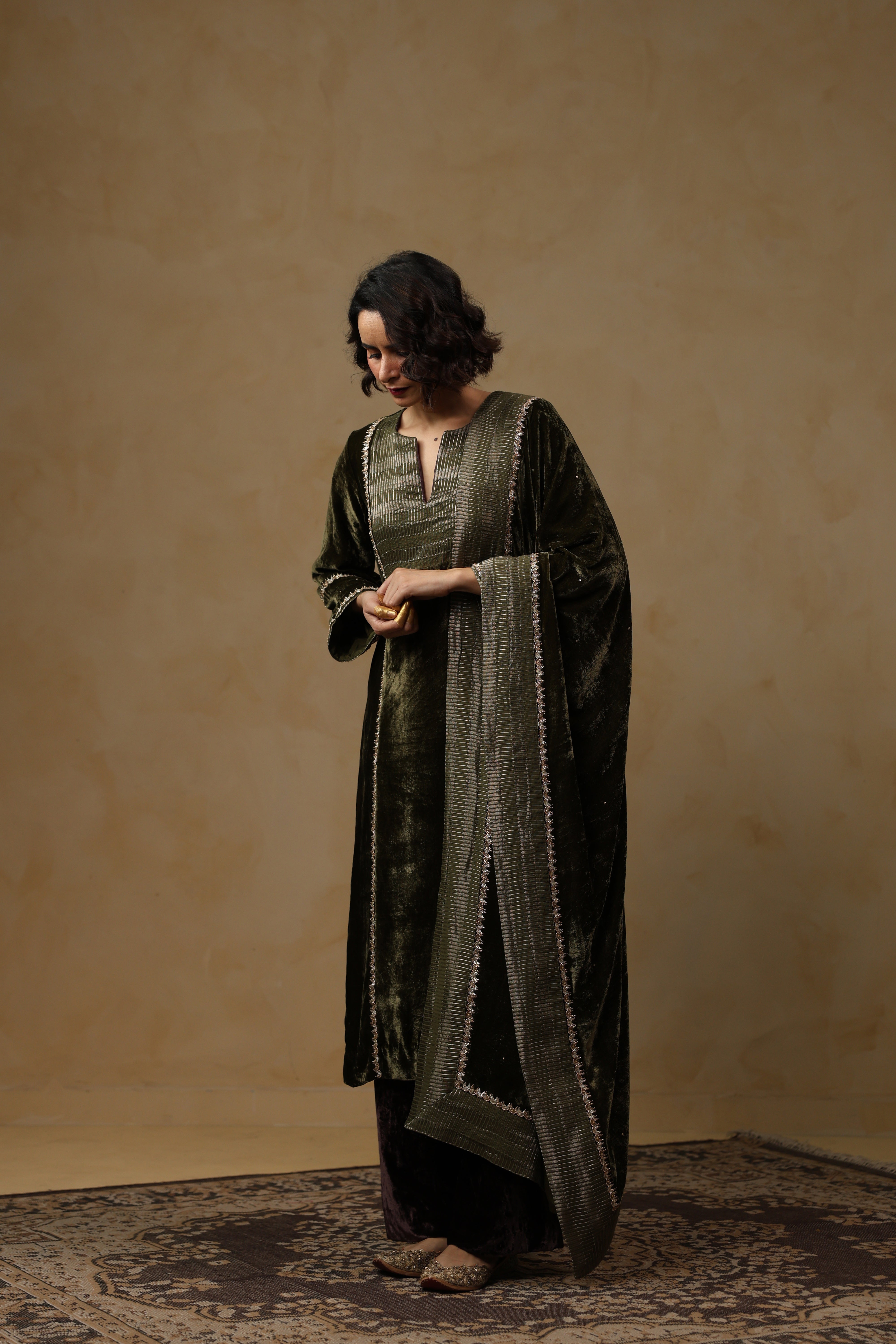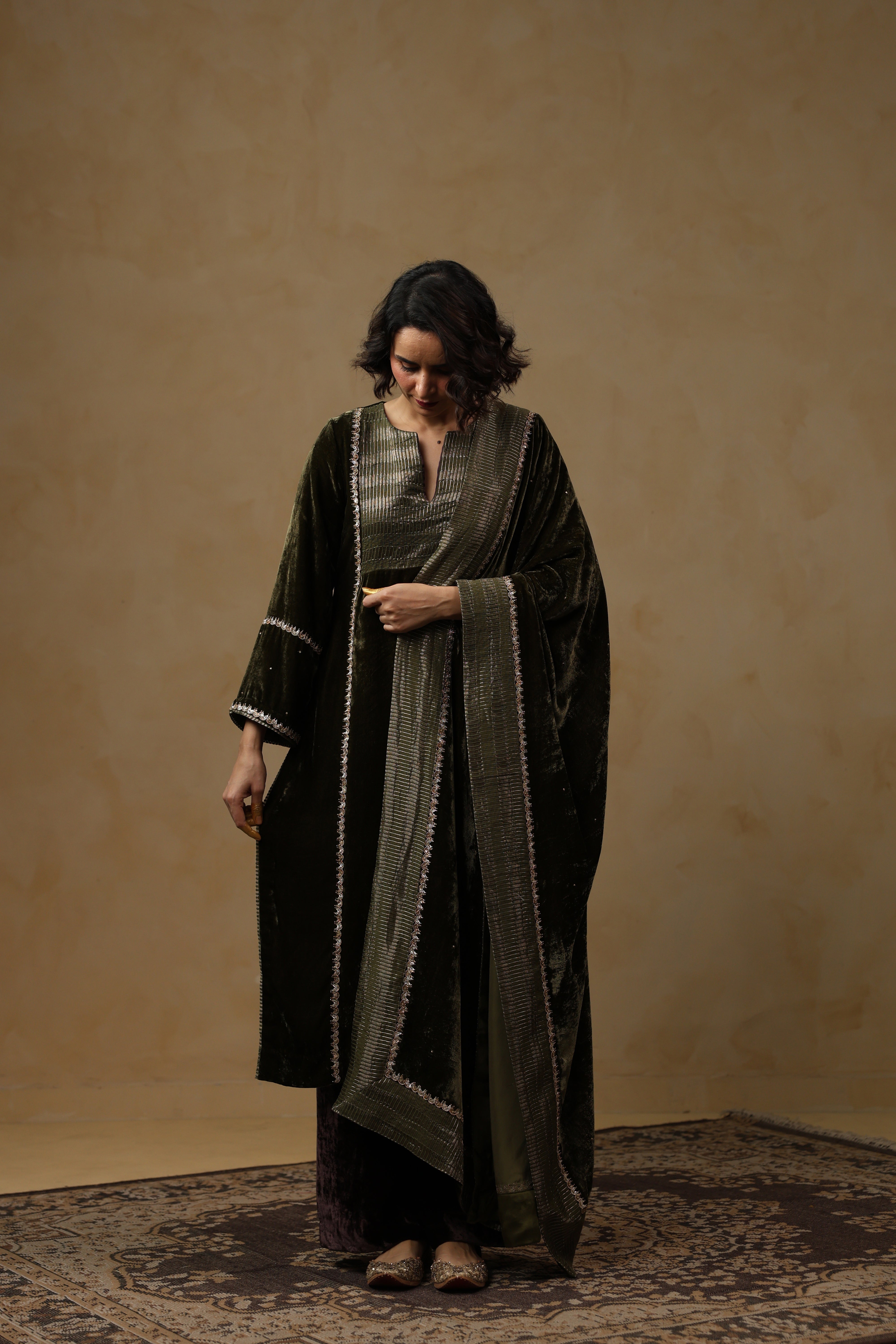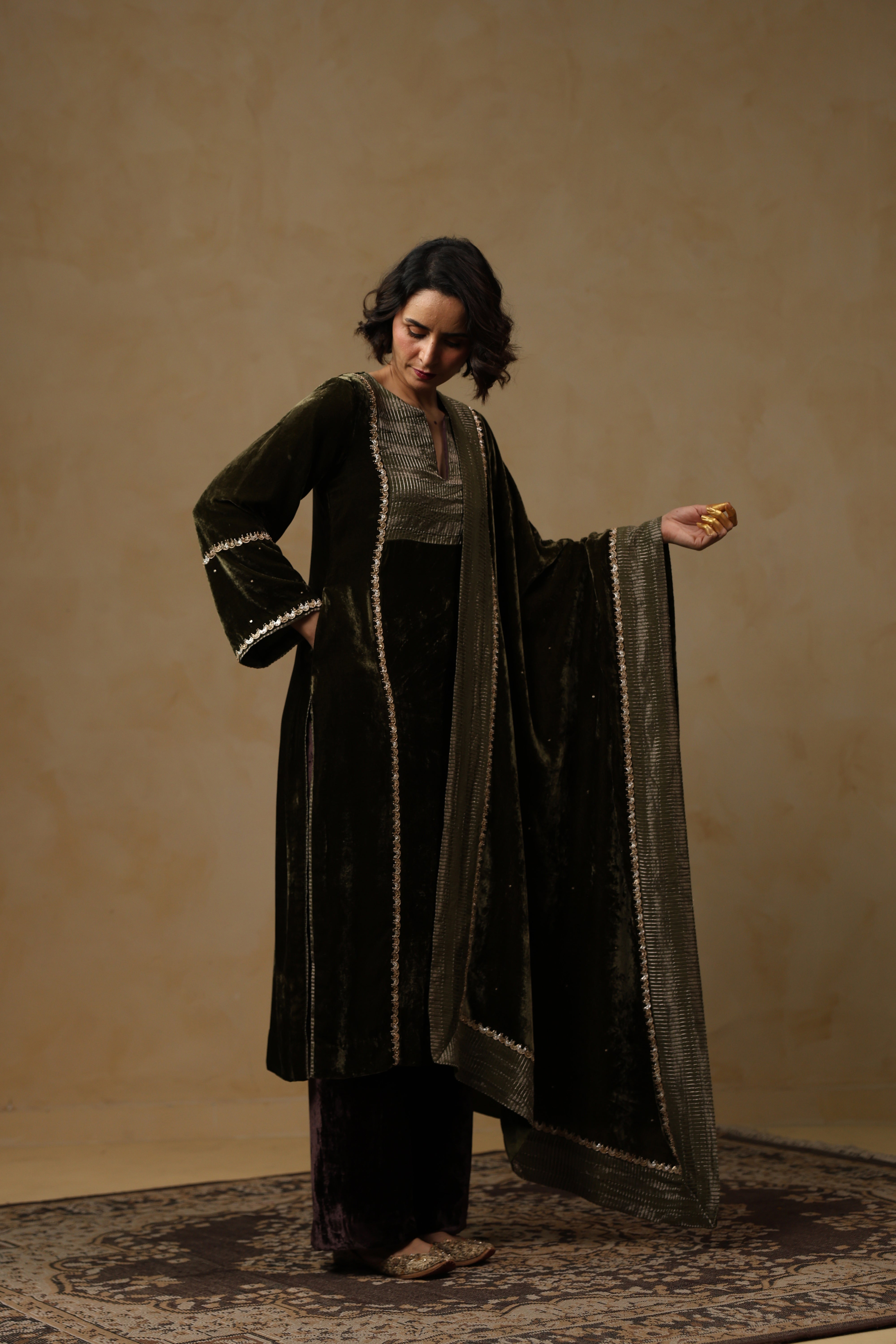 - Velvet Dupatta adorned with intricate handwork and finished with a refined tissue Chanderi facing along the border.