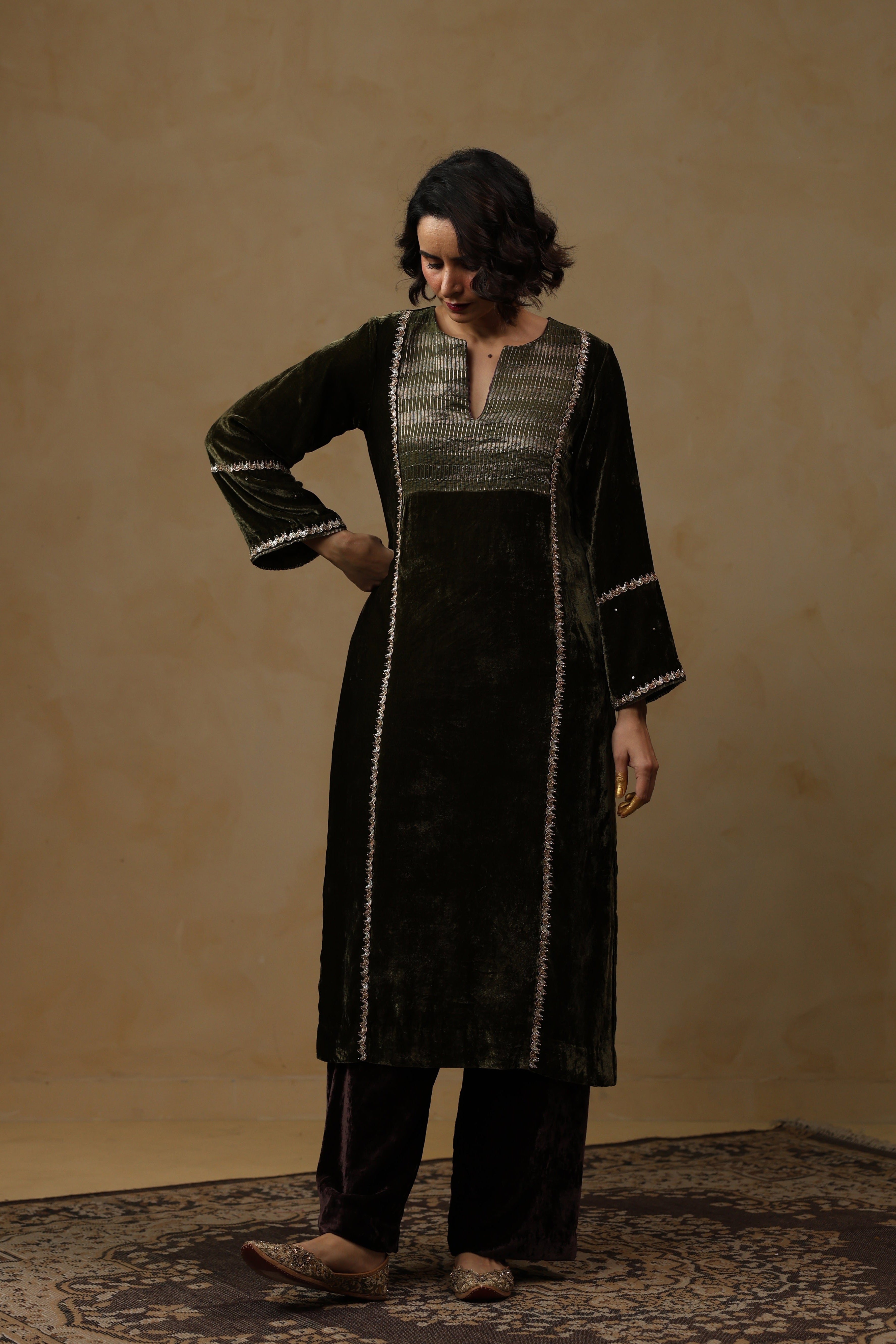 - Full Sleeves Straight Kurta featuring a tissue Chanderi patch on the front and a refined slash neckline, highlighted with delicate handwork along the front and sleeves.