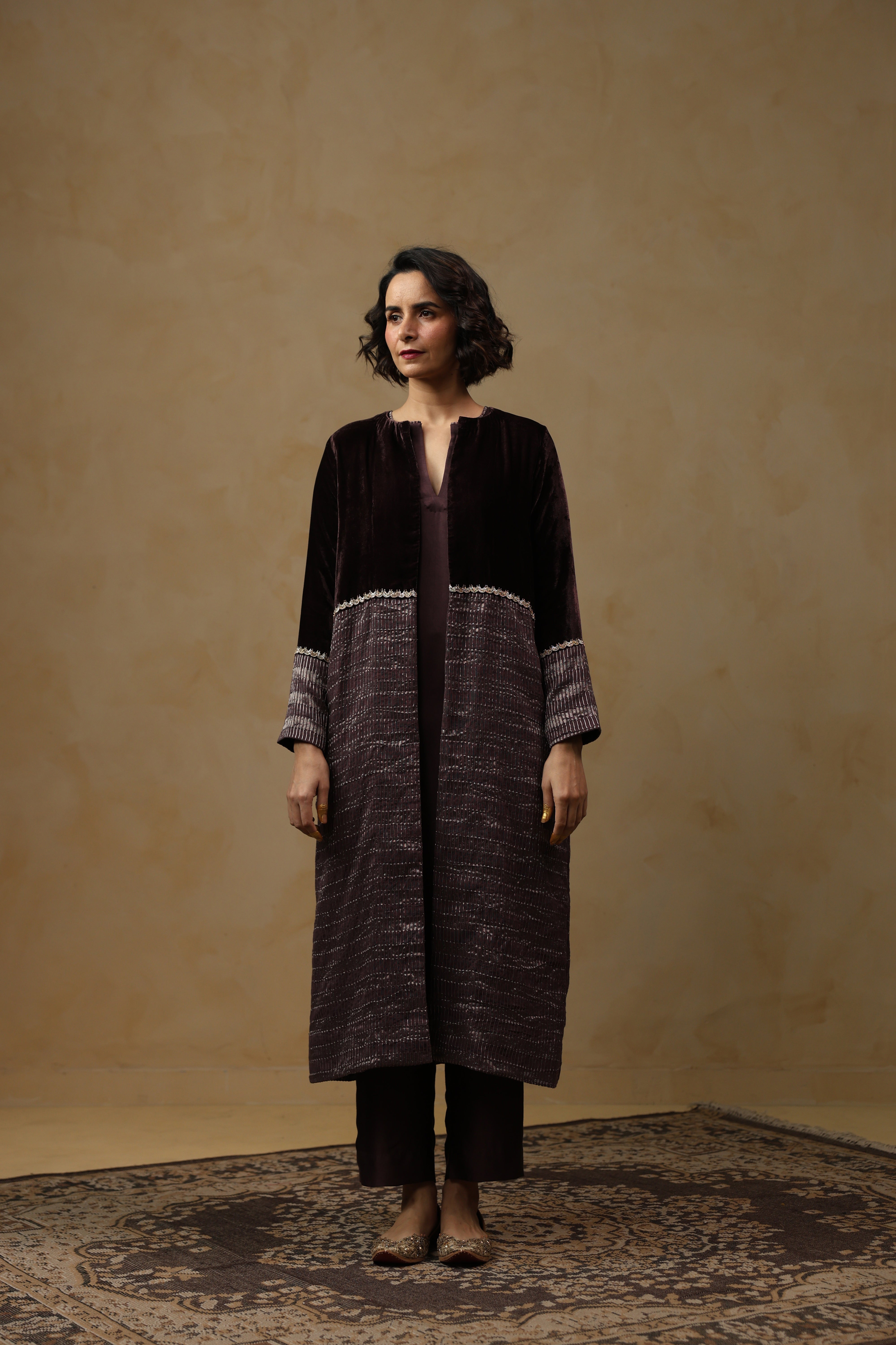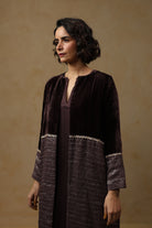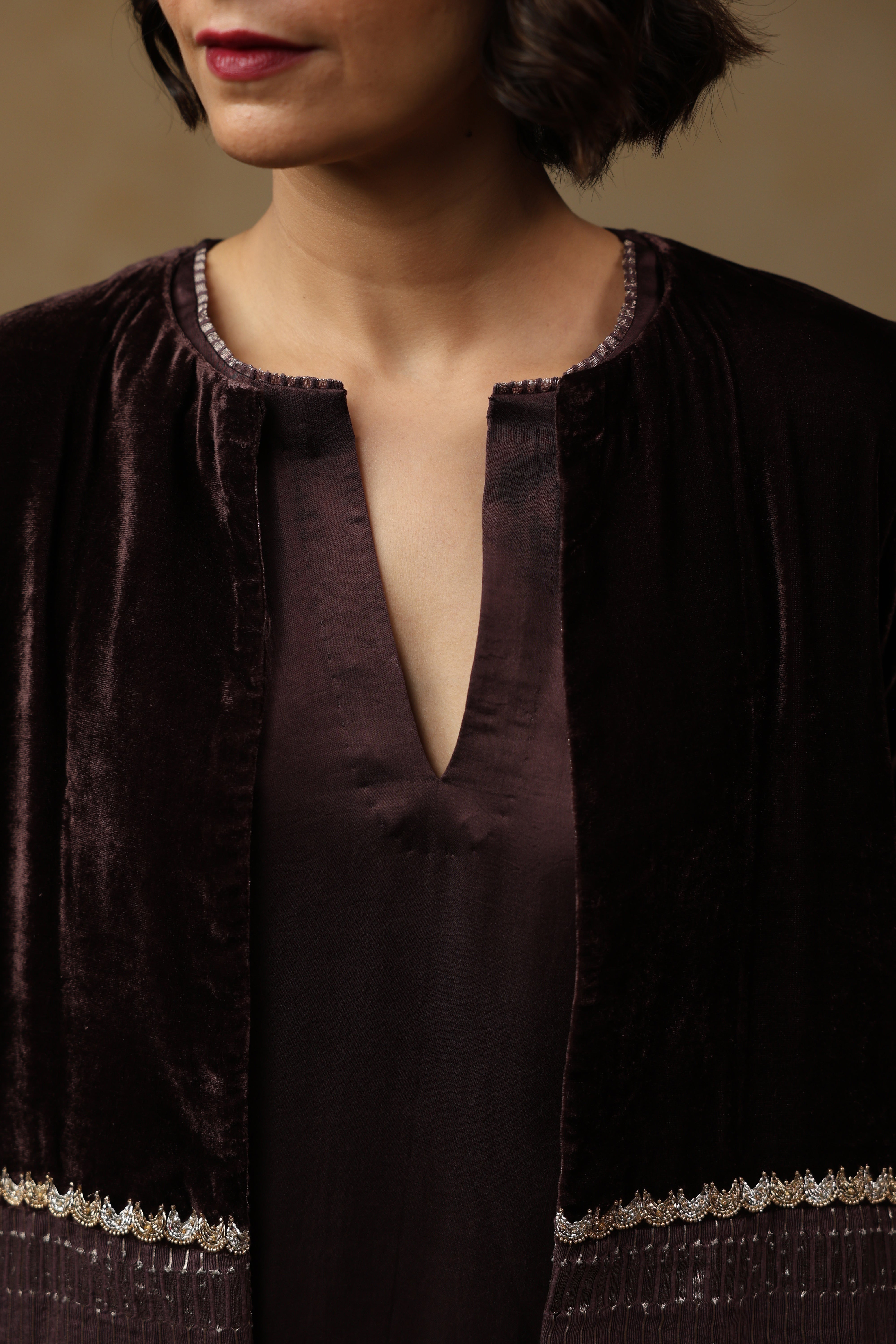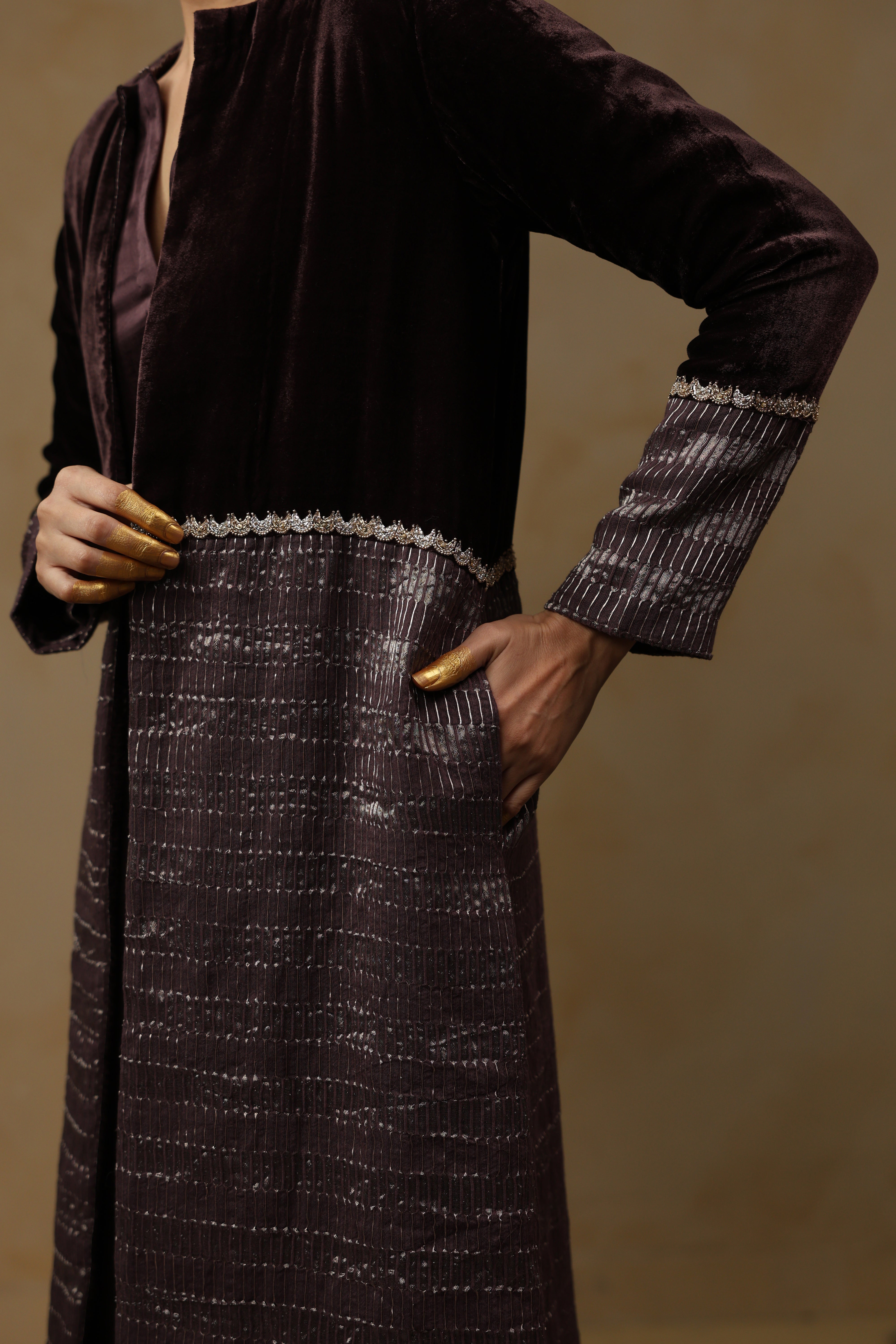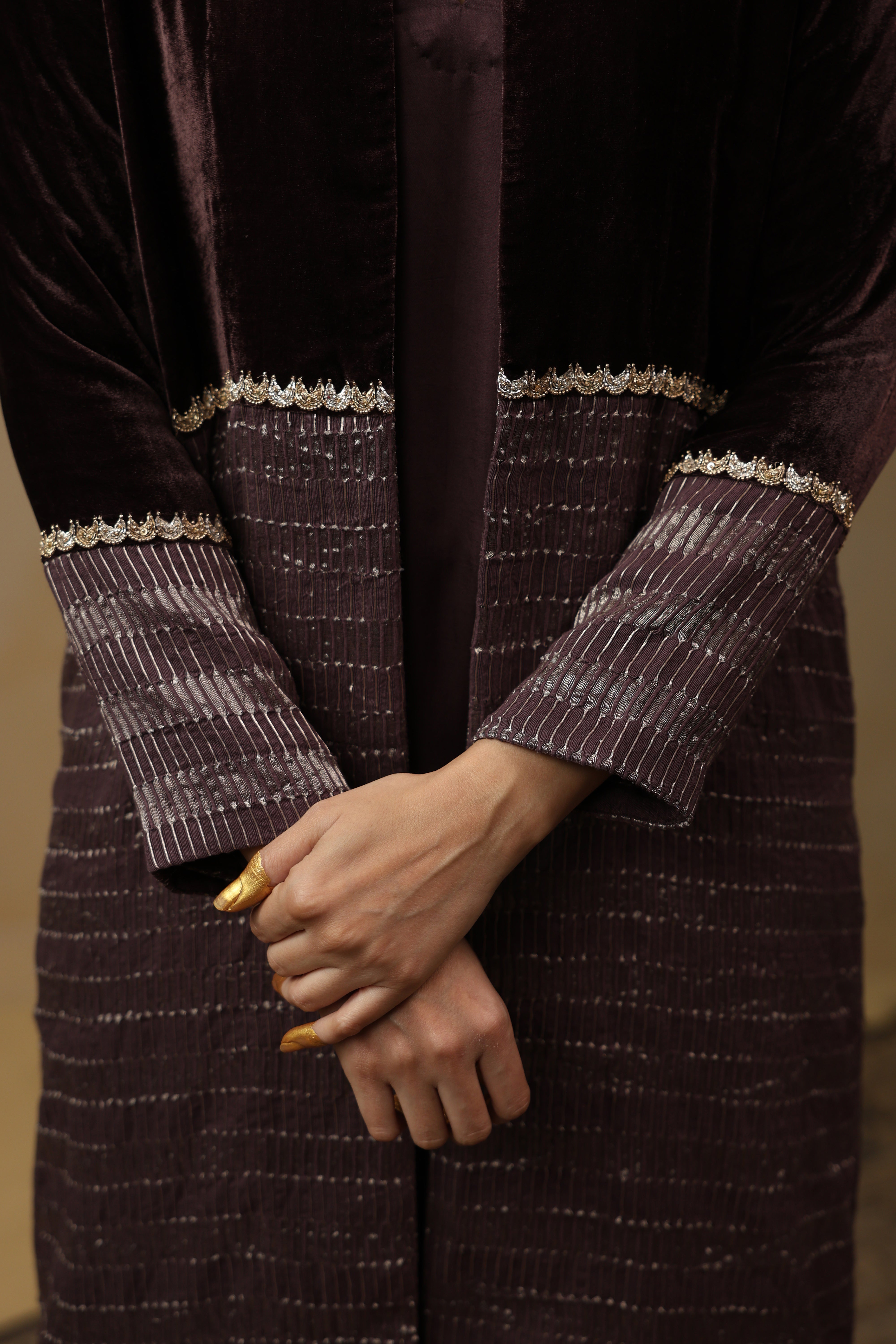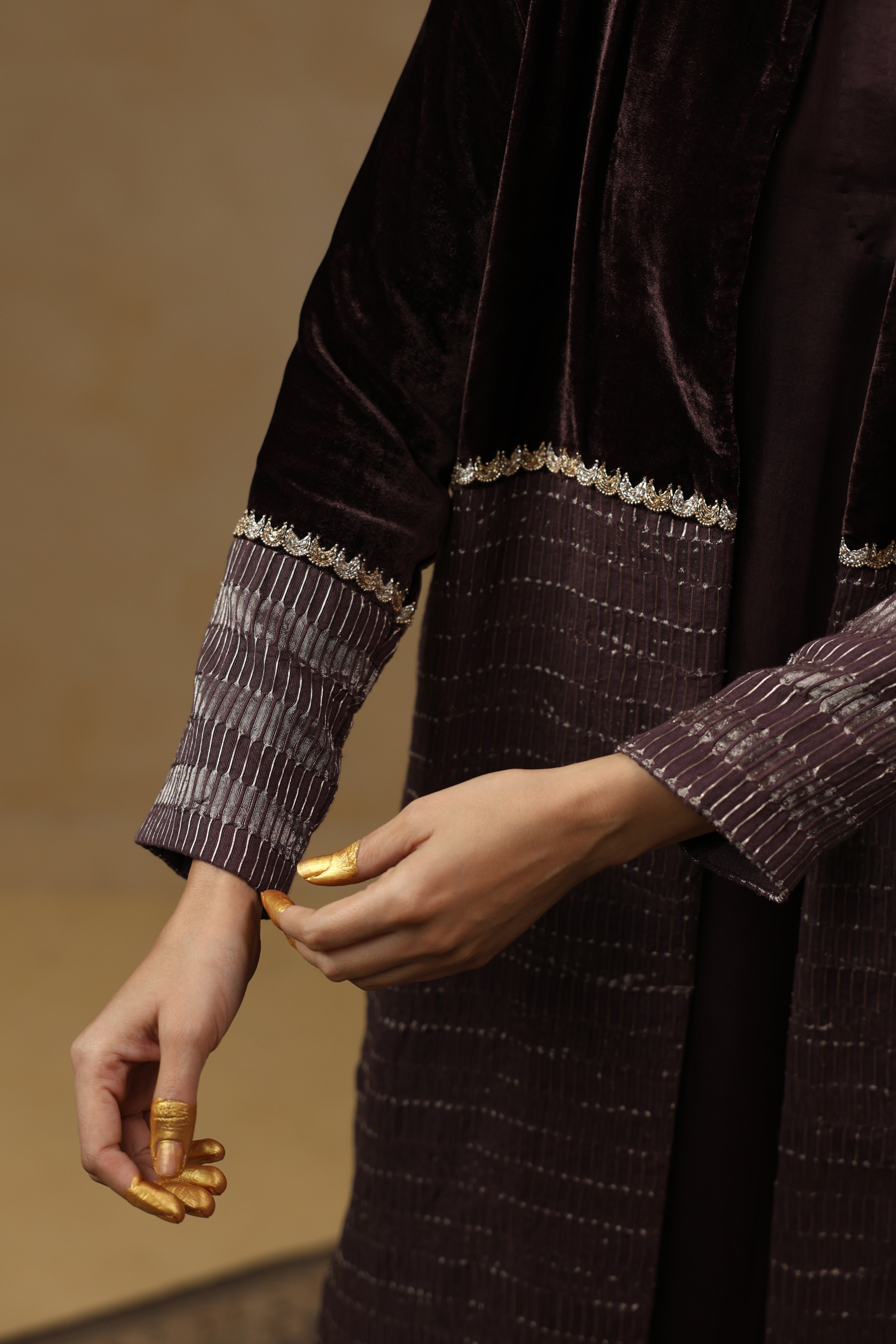 - Outer Coat crafted in velvet and tissue Chanderi, enriched with intricate handwork across the sleeves and body.